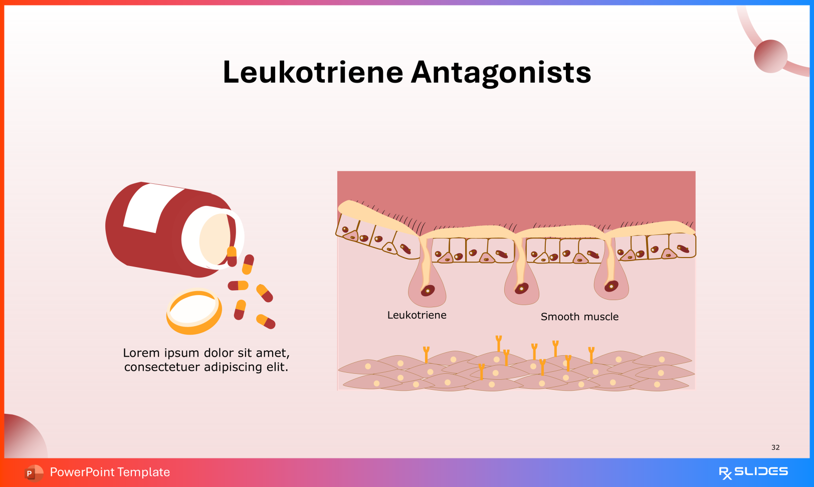 • Pharmacology: The template includes detailed diagrams for "Leukotriene Antagonists" and "Beta-2 Adrenergic Agonists." You can present specific mechanisms, such as how Montelukast binds to the cysteinyl leukotriene receptor to block specific inflammatory pathways, or how Salmeterol interacts with receptors.