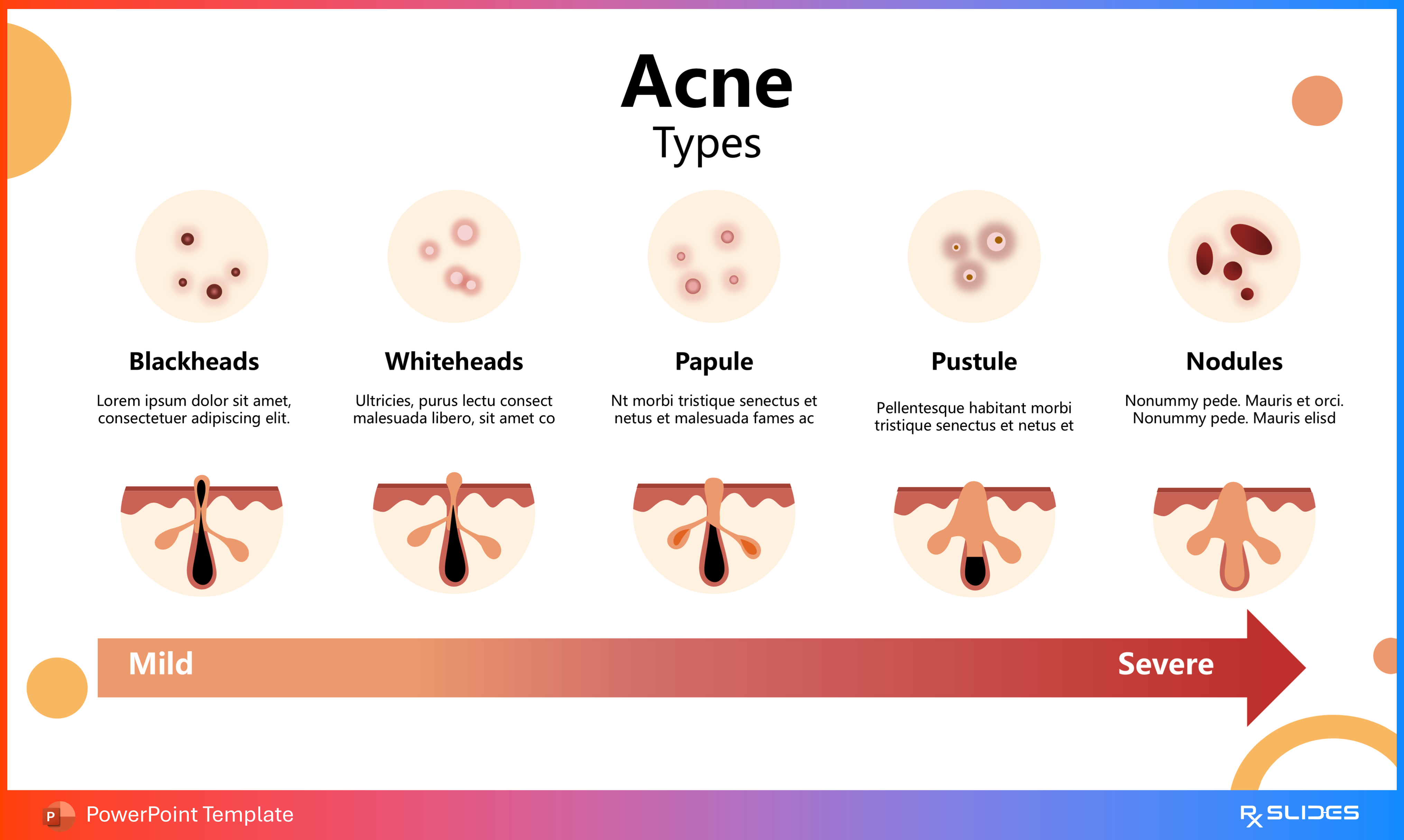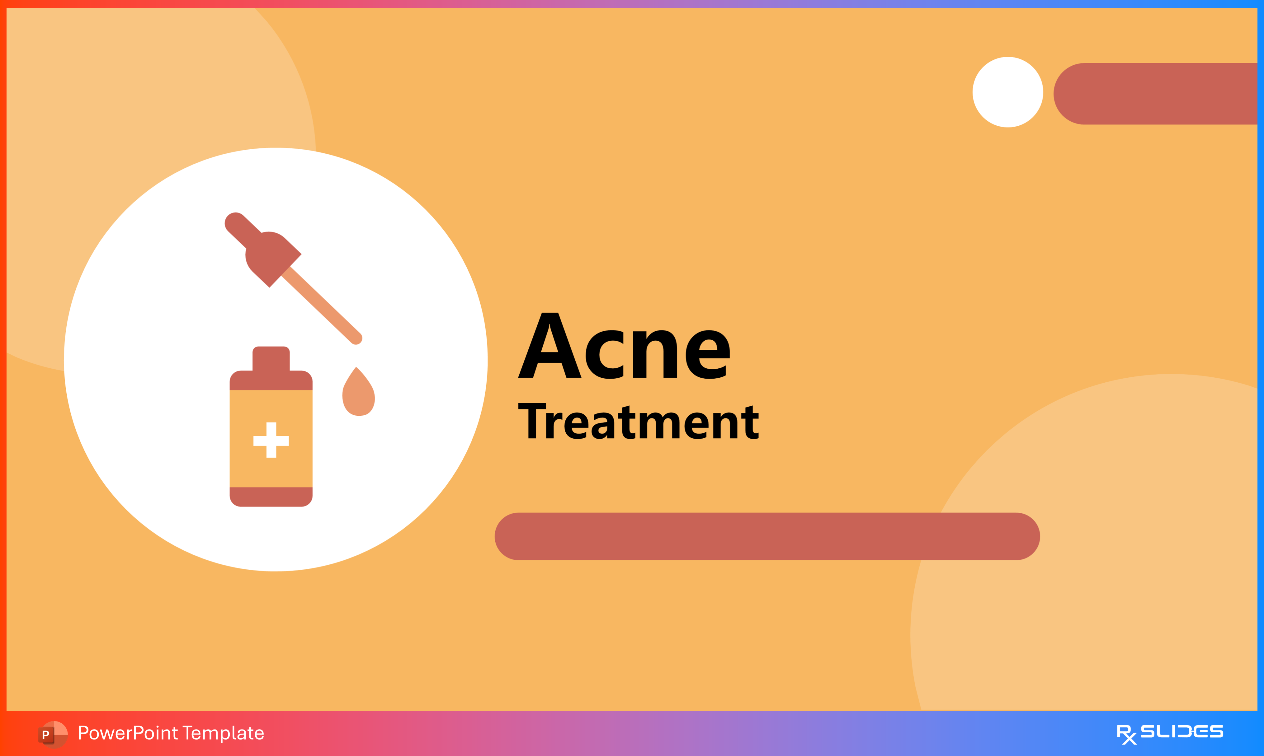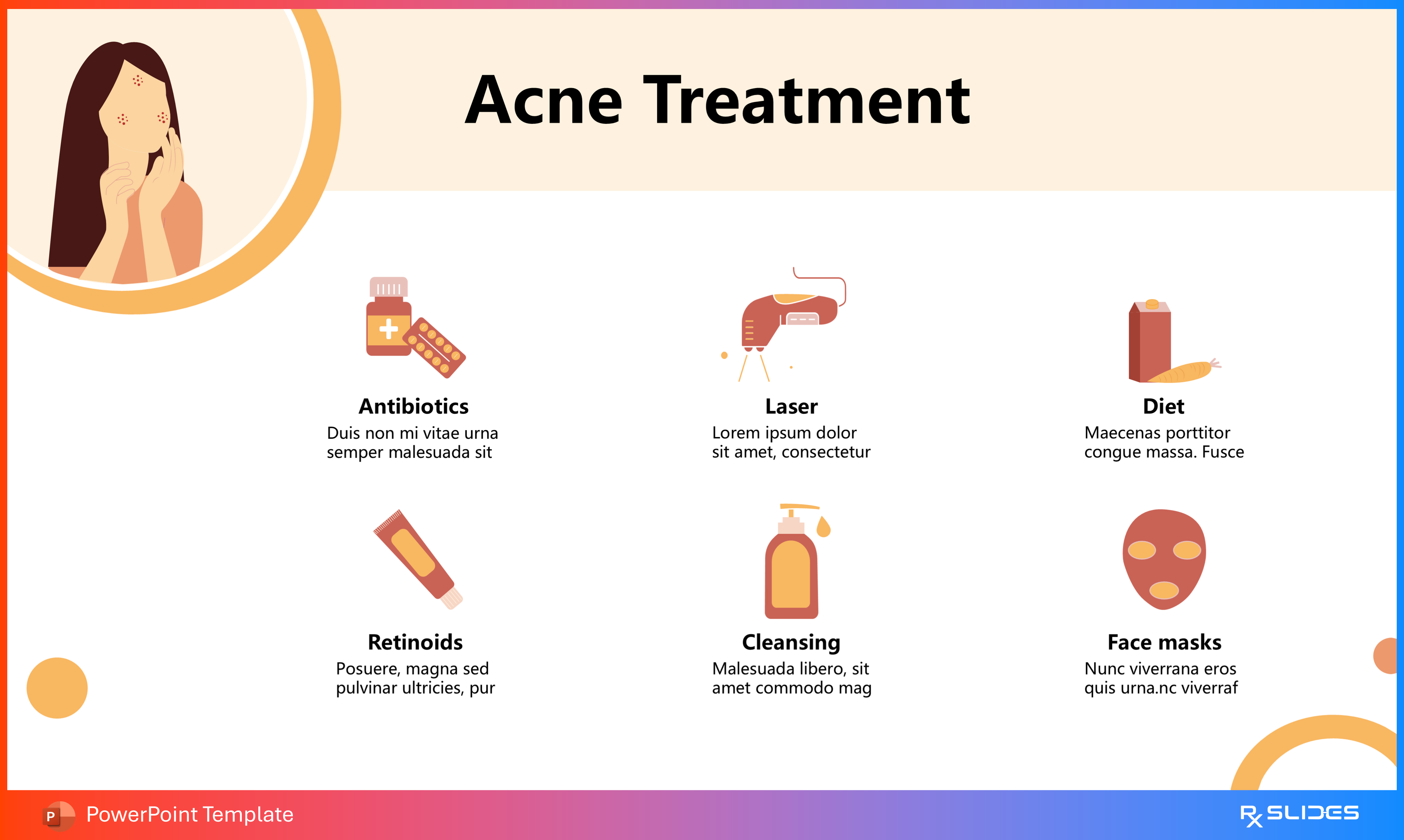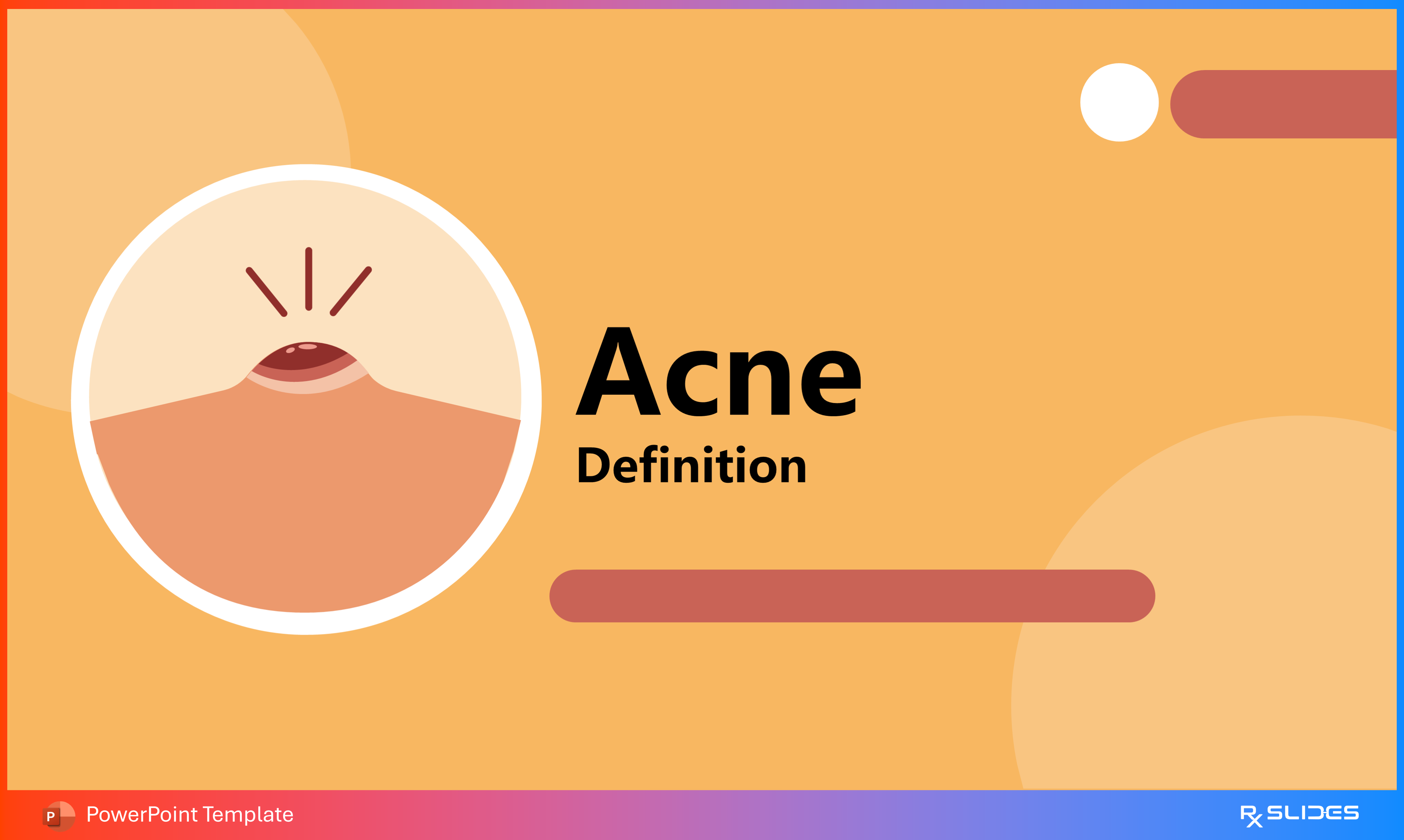 The Acne Vulgaris PPT template is a dynamic medical PowerPoint template designed by the RxSlides professional team to visualize different aspects of acne presentation and attract your audience.