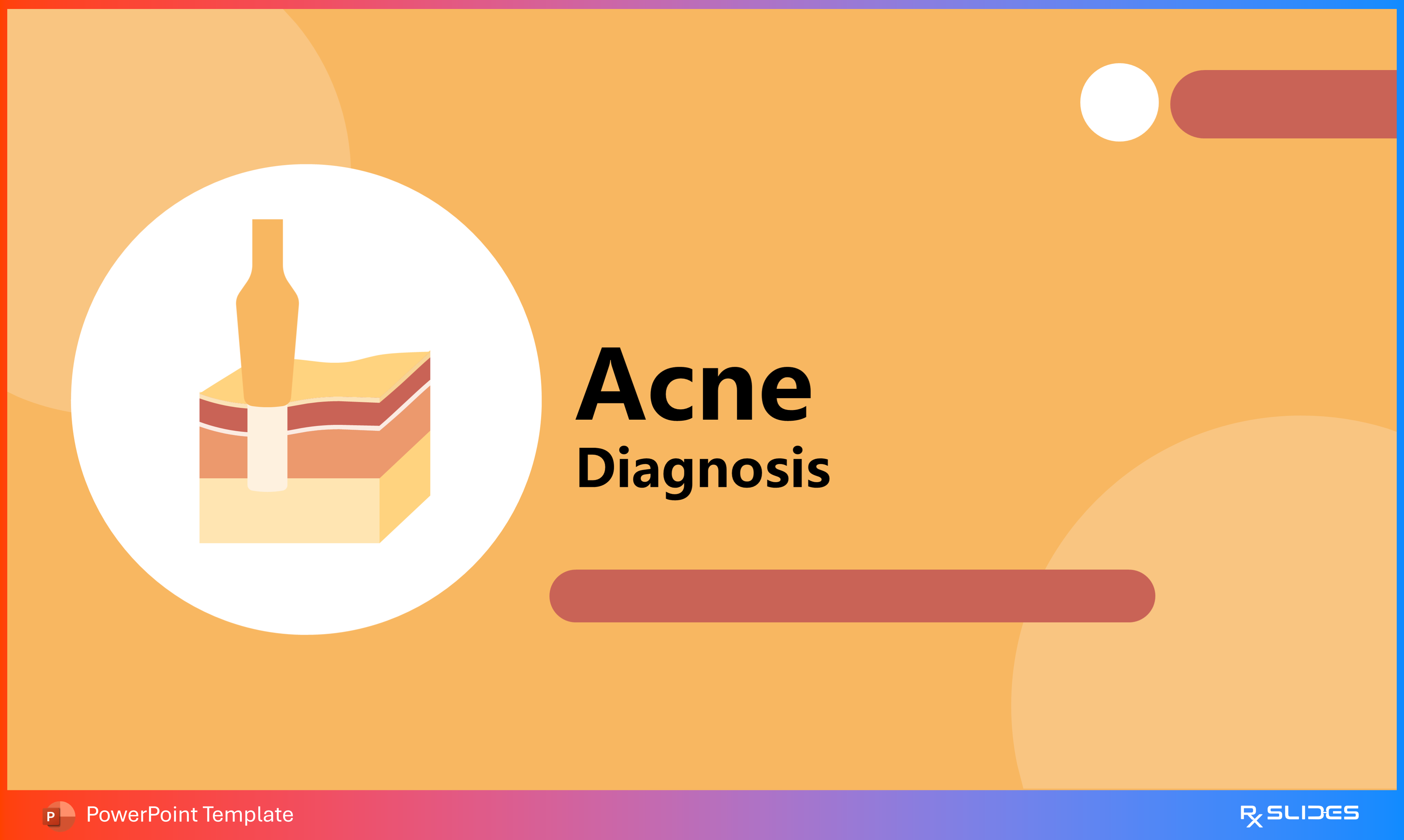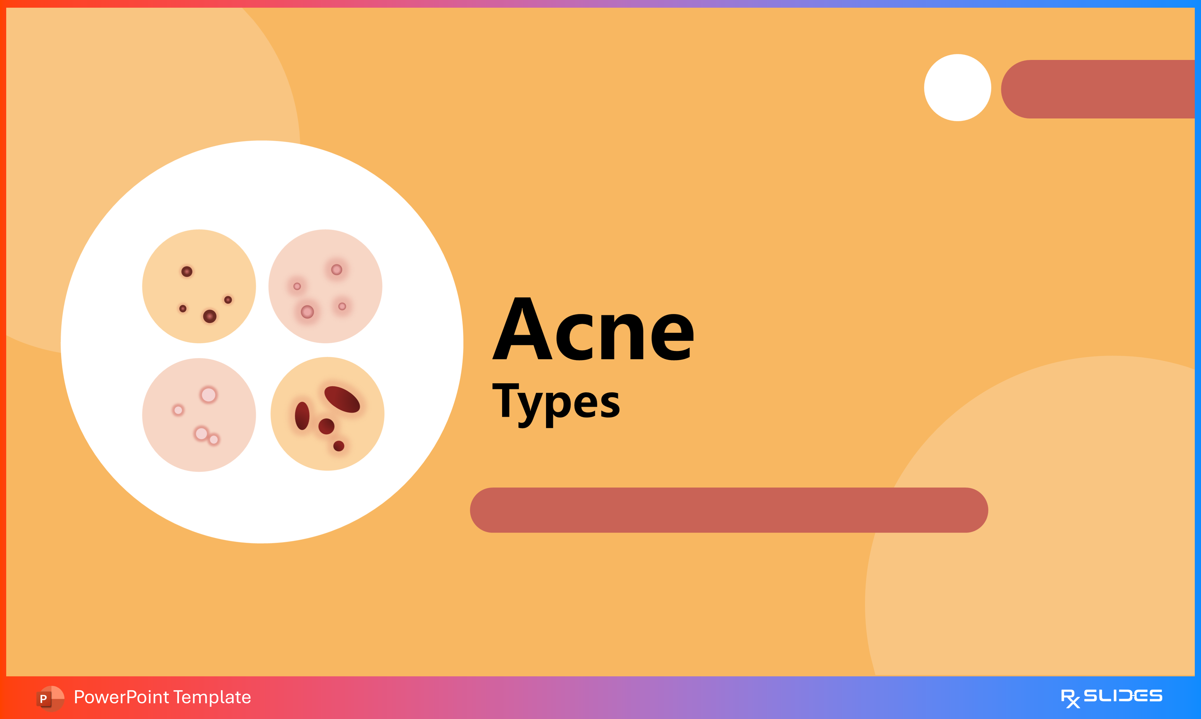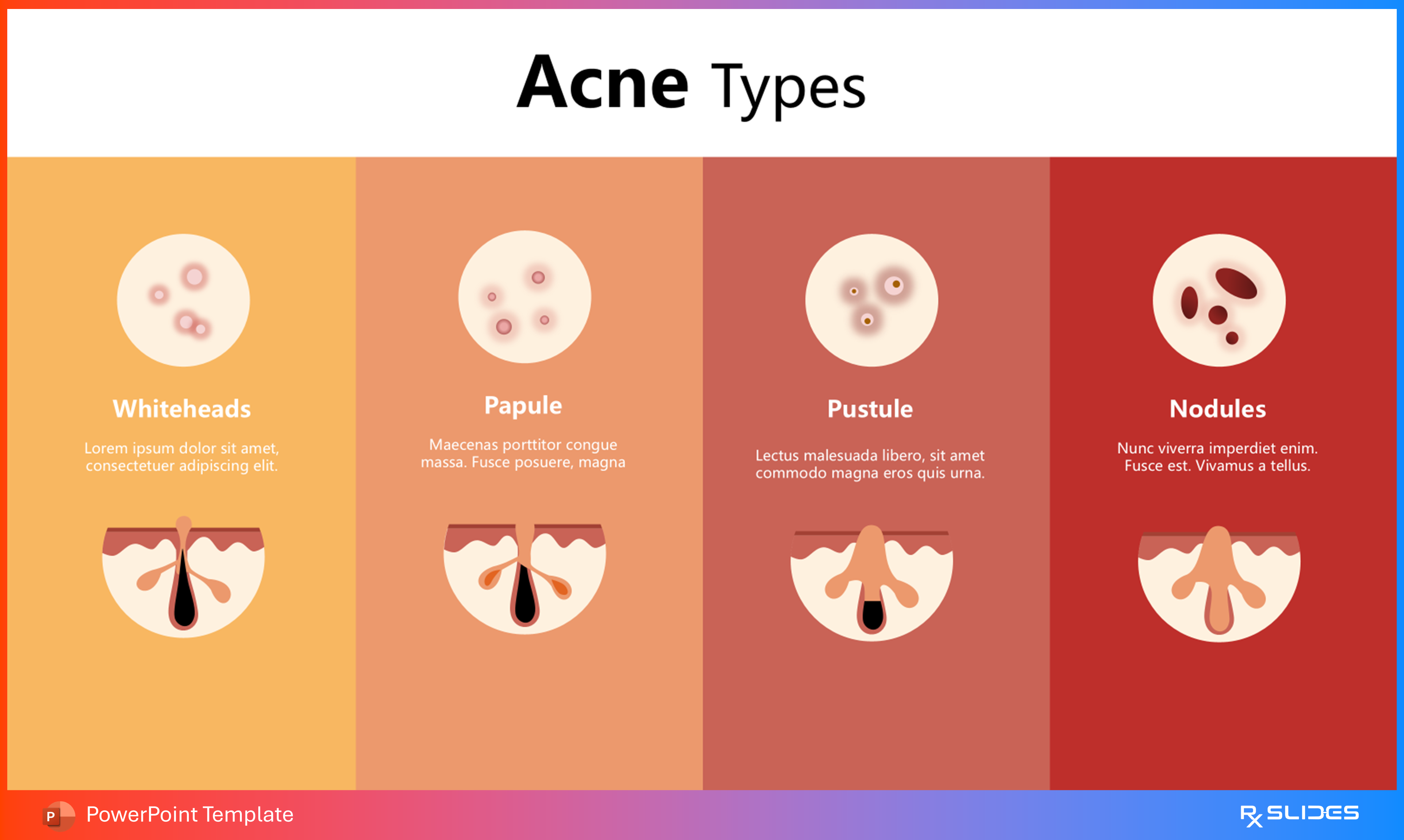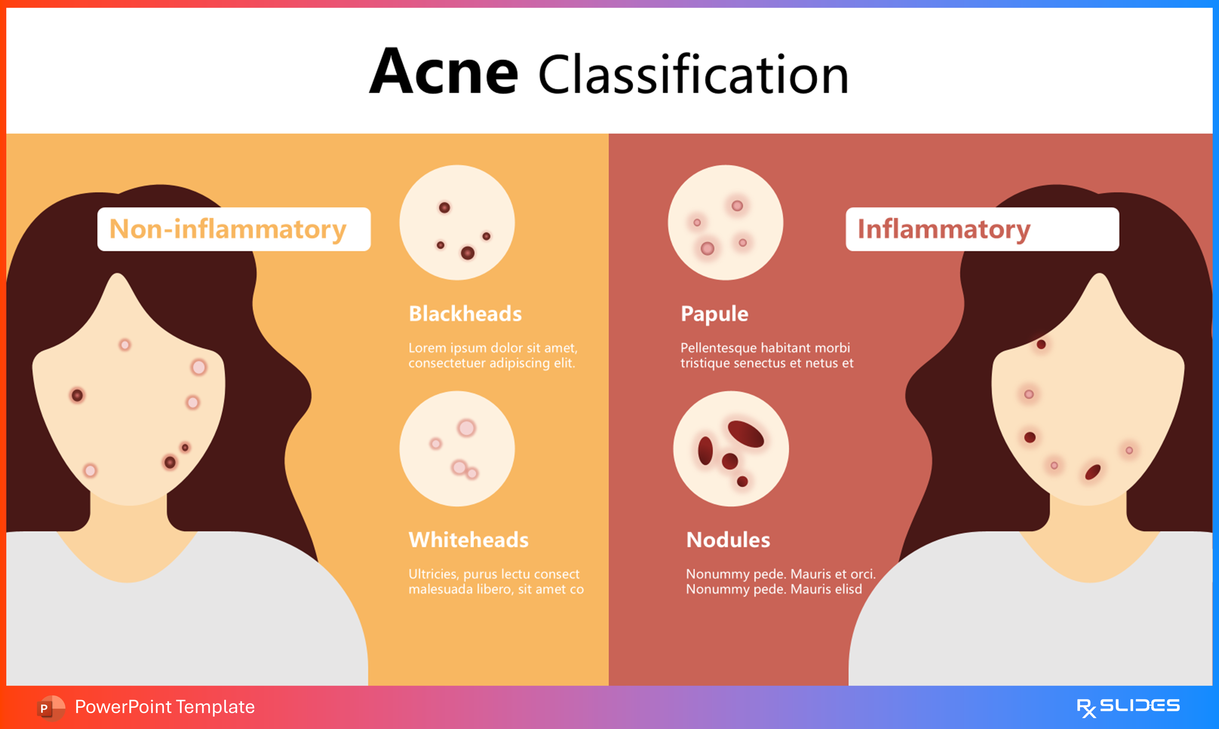 The Acne Vulgaris PPT template is a dynamic medical PowerPoint template designed by the RxSlides professional team to visualize different aspects of acne presentation and attract your audience.