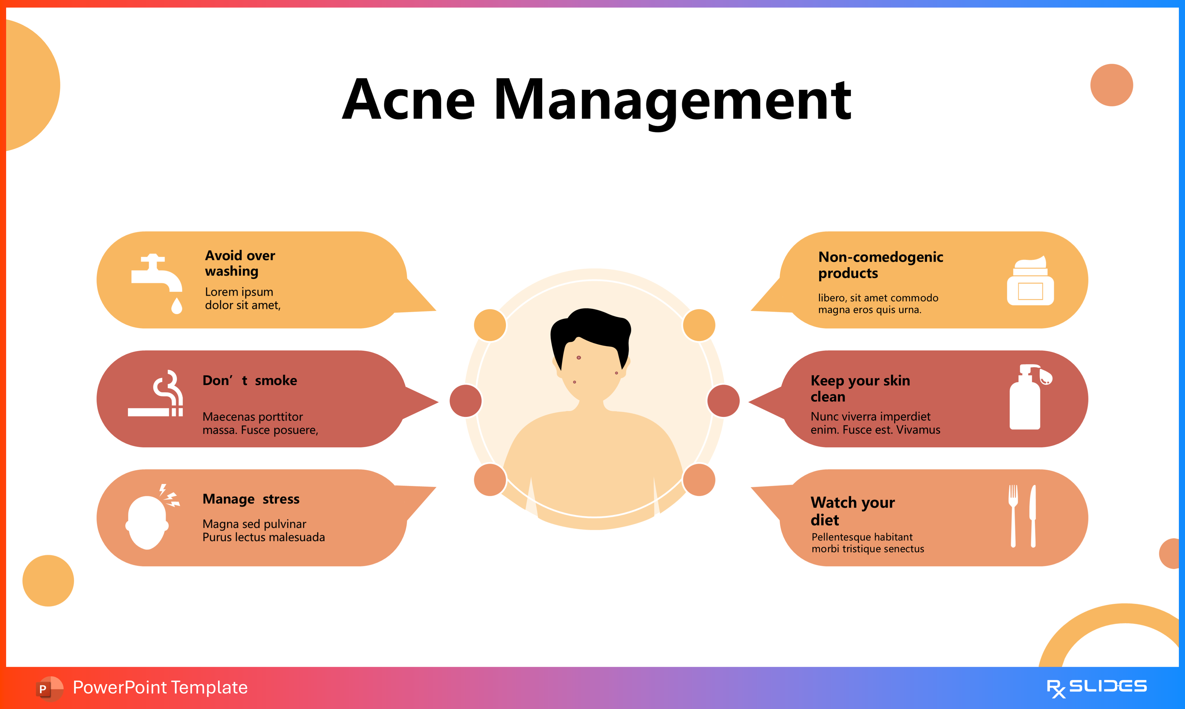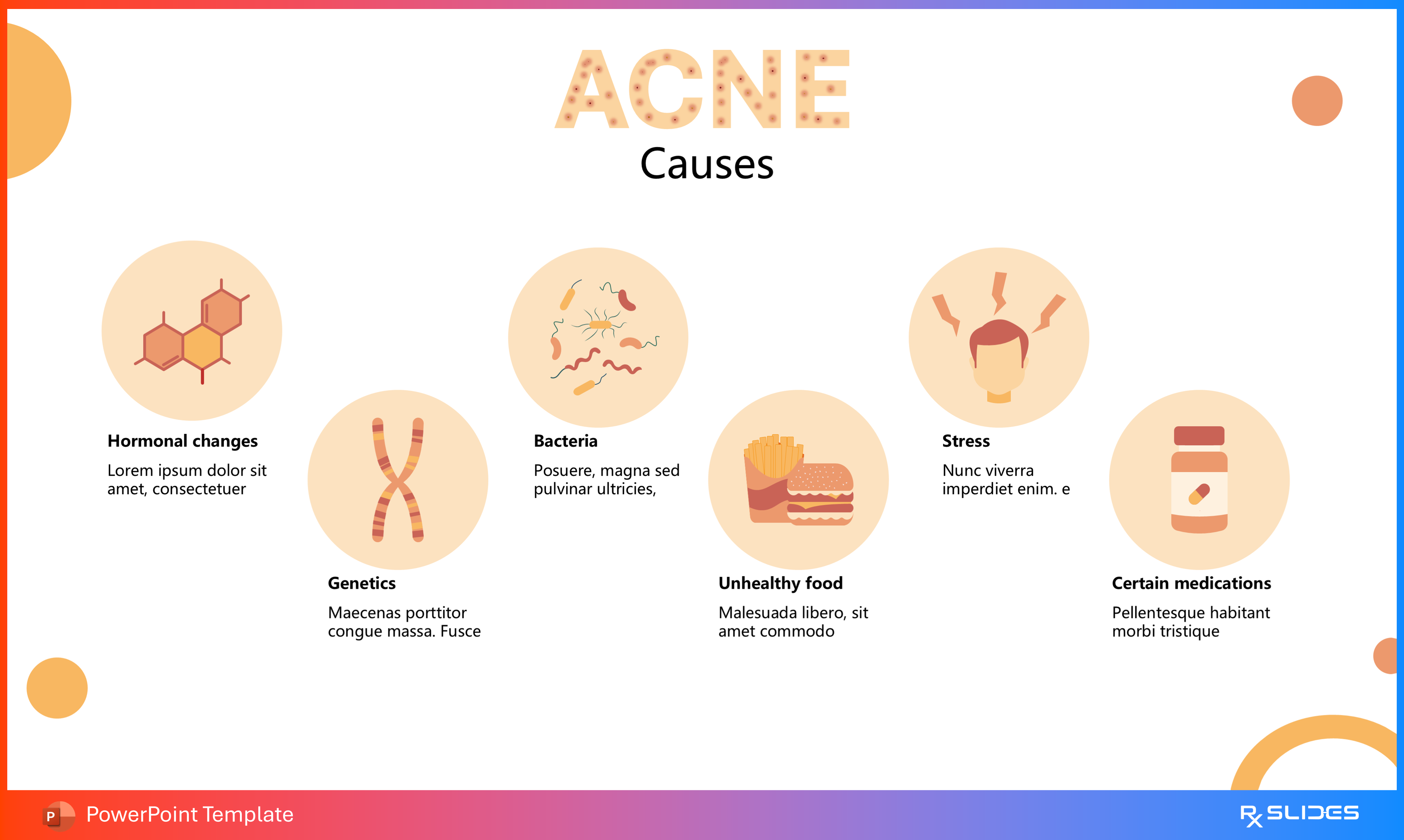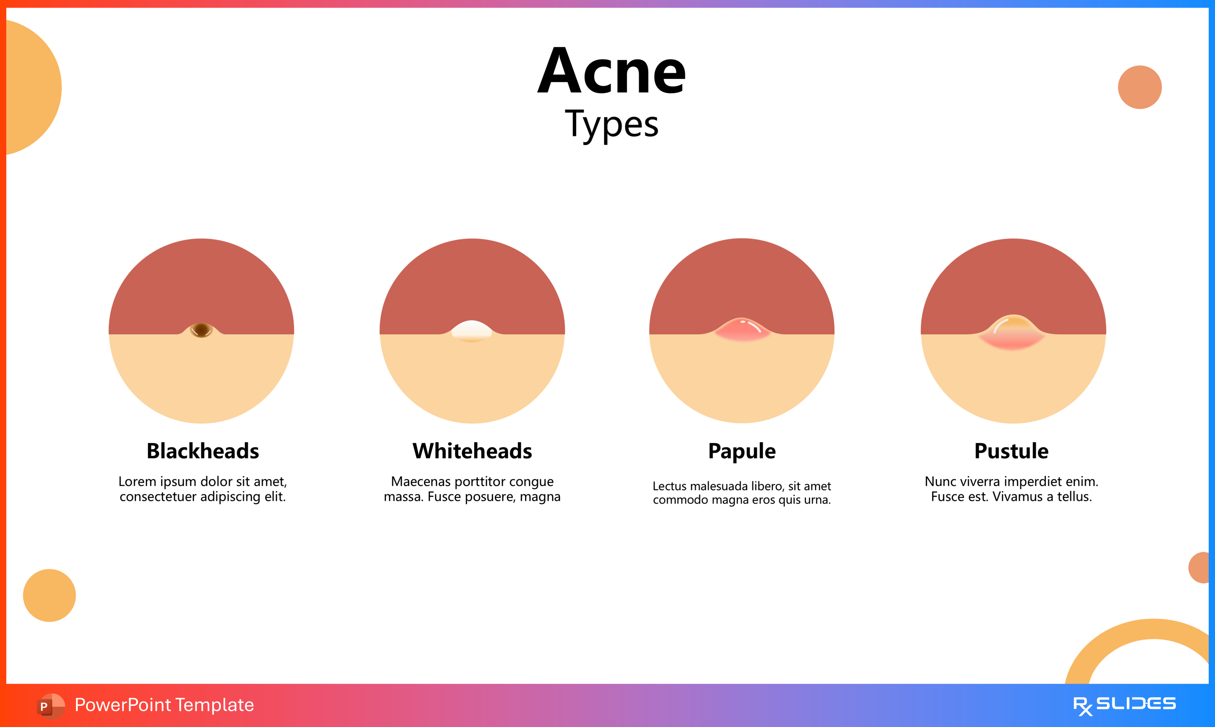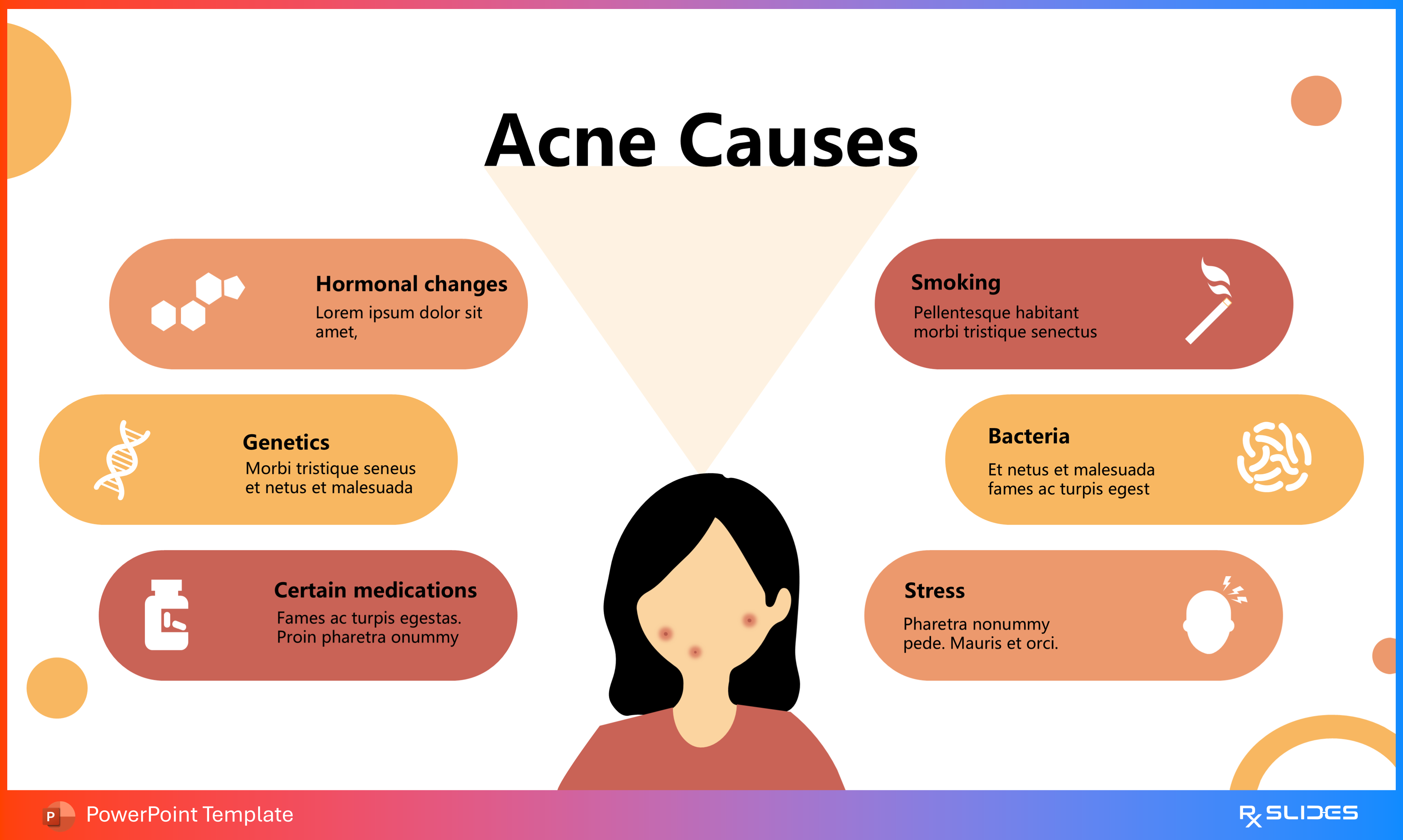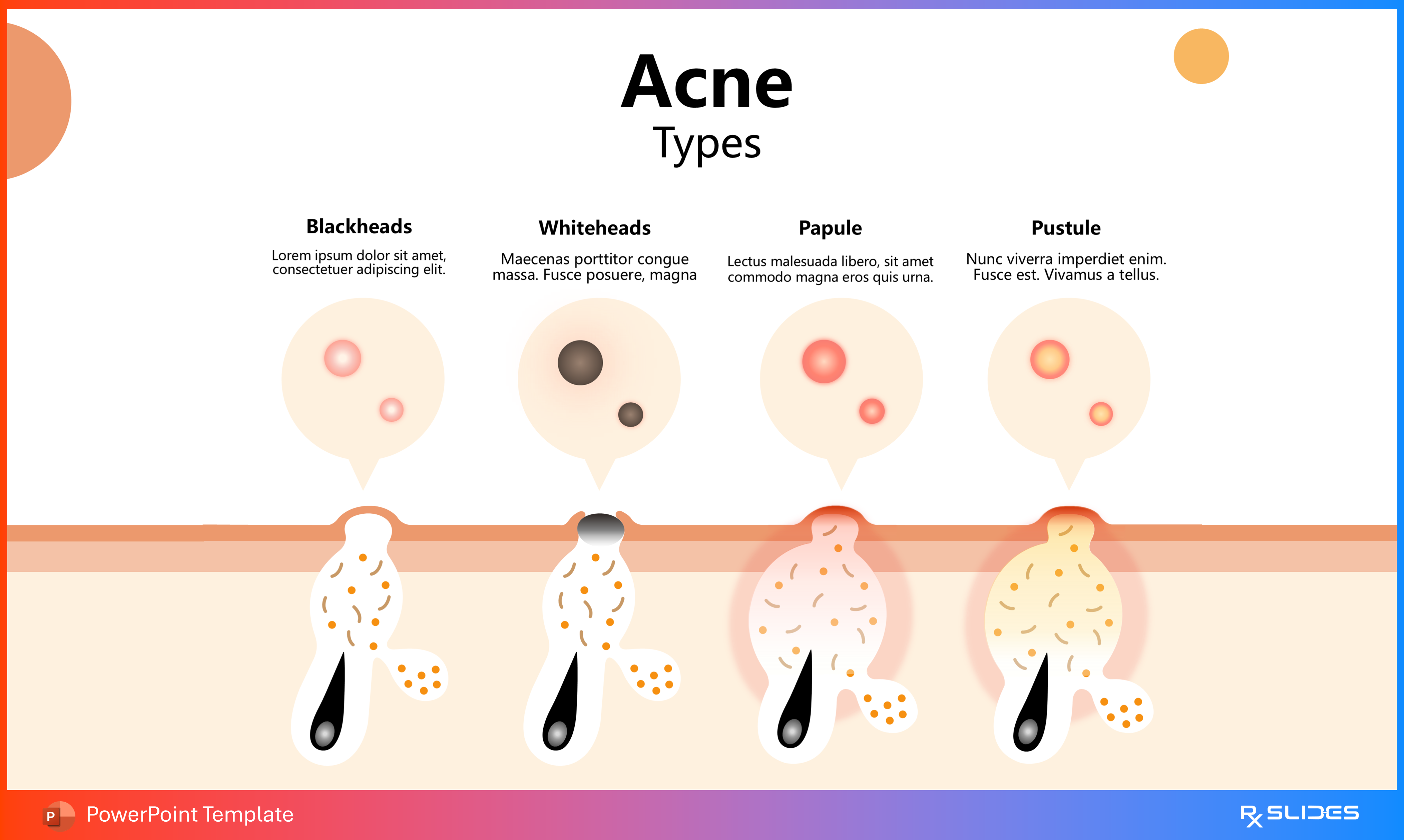 The Acne Vulgaris PPT template is a dynamic medical PowerPoint template designed by the RxSlides professional team to visualize different aspects of acne presentation and attract your audience.
