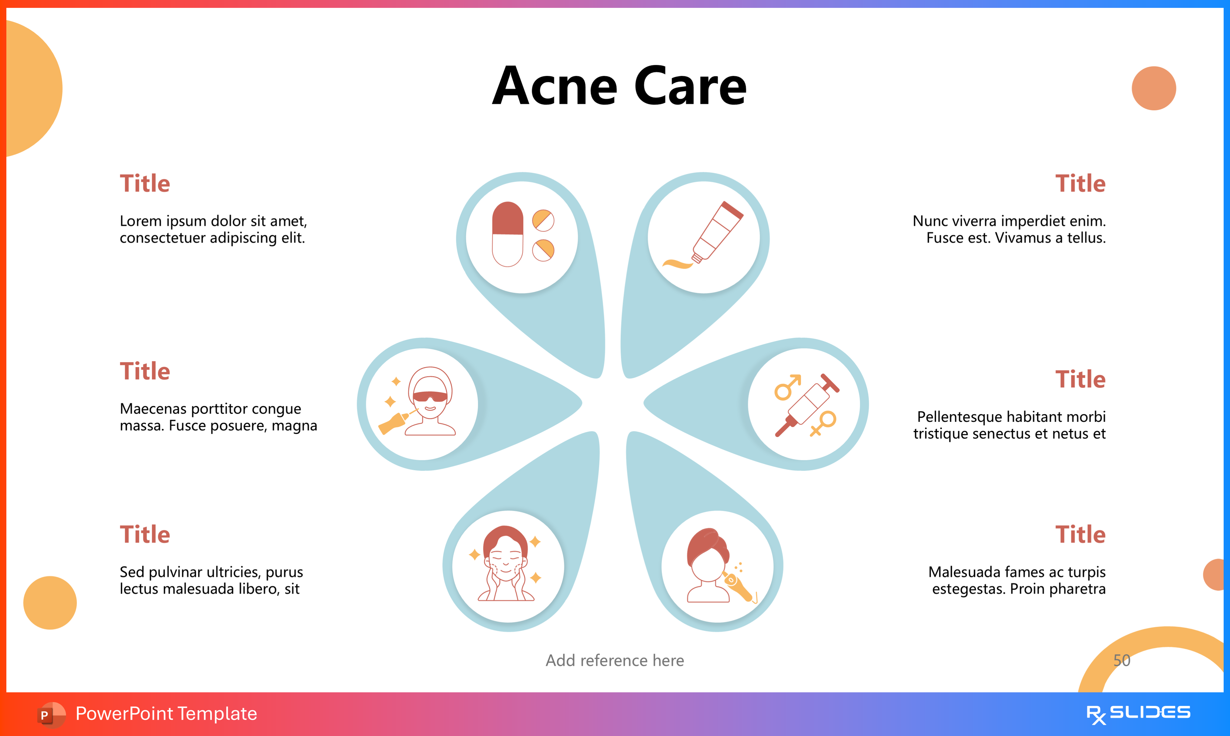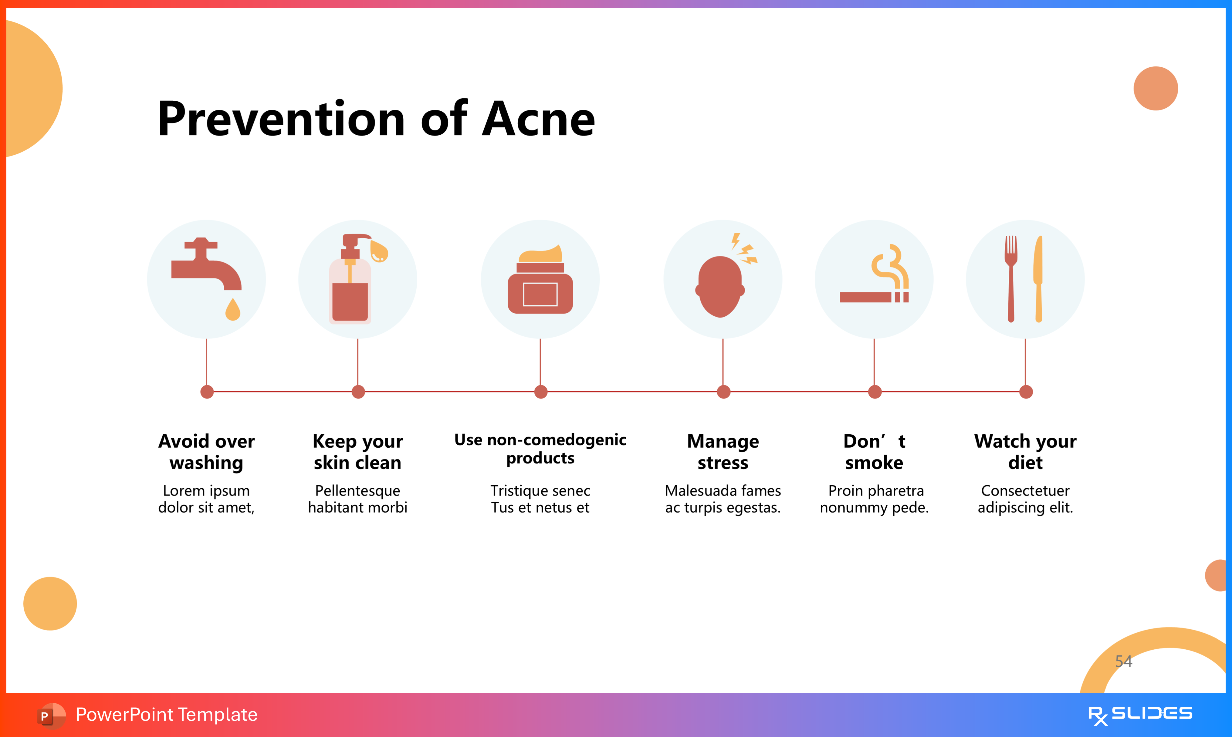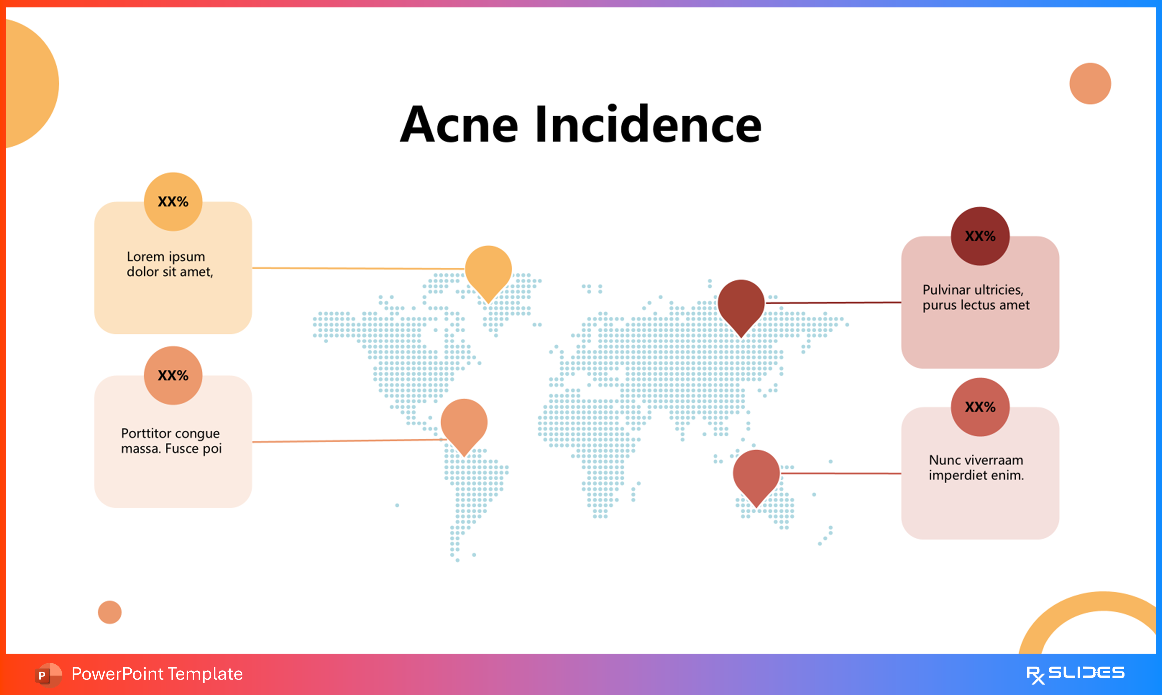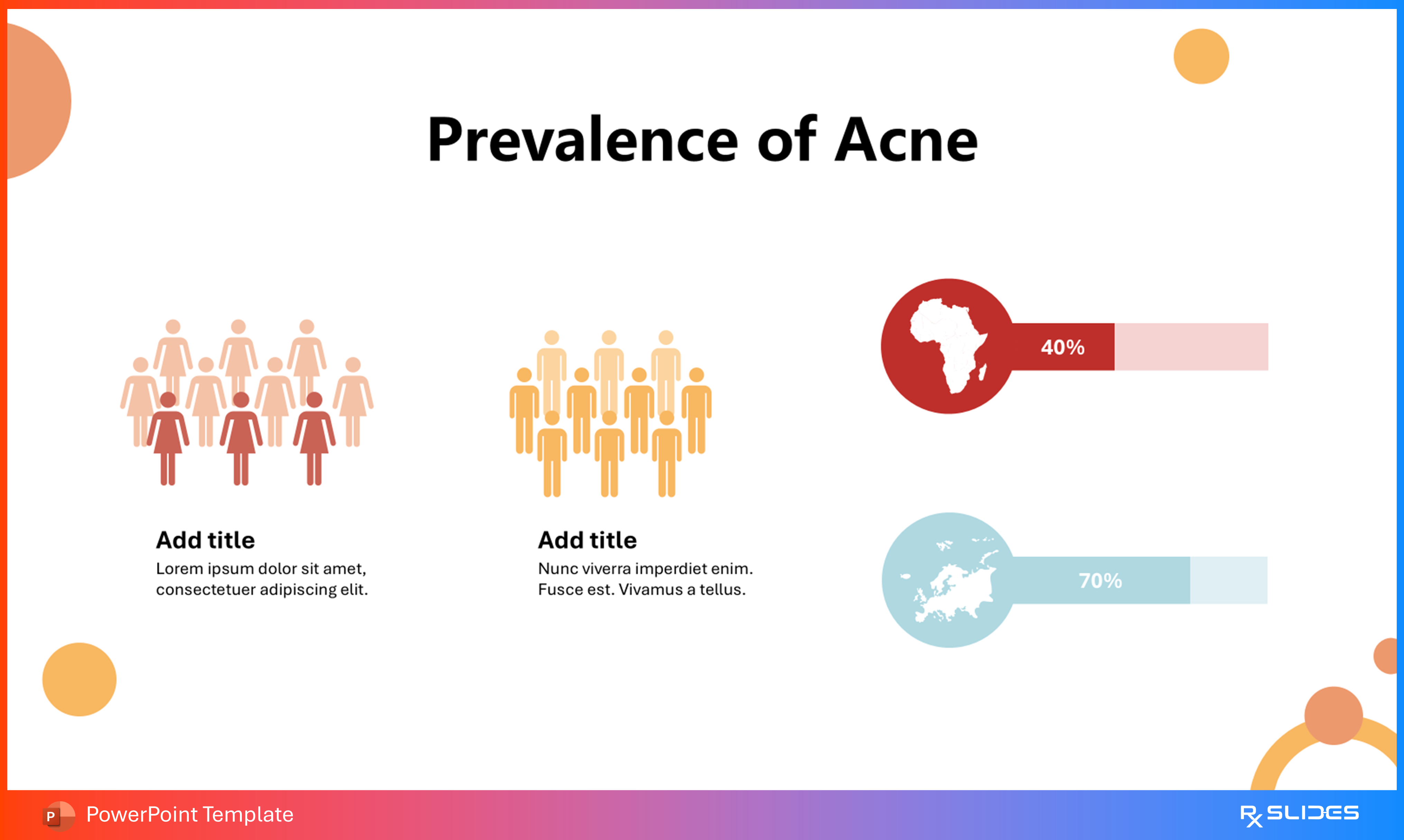 The Acne Vulgaris PPT template is a dynamic medical PowerPoint template designed by the RxSlides professional team to visualize different aspects of acne presentation and attract your audience.