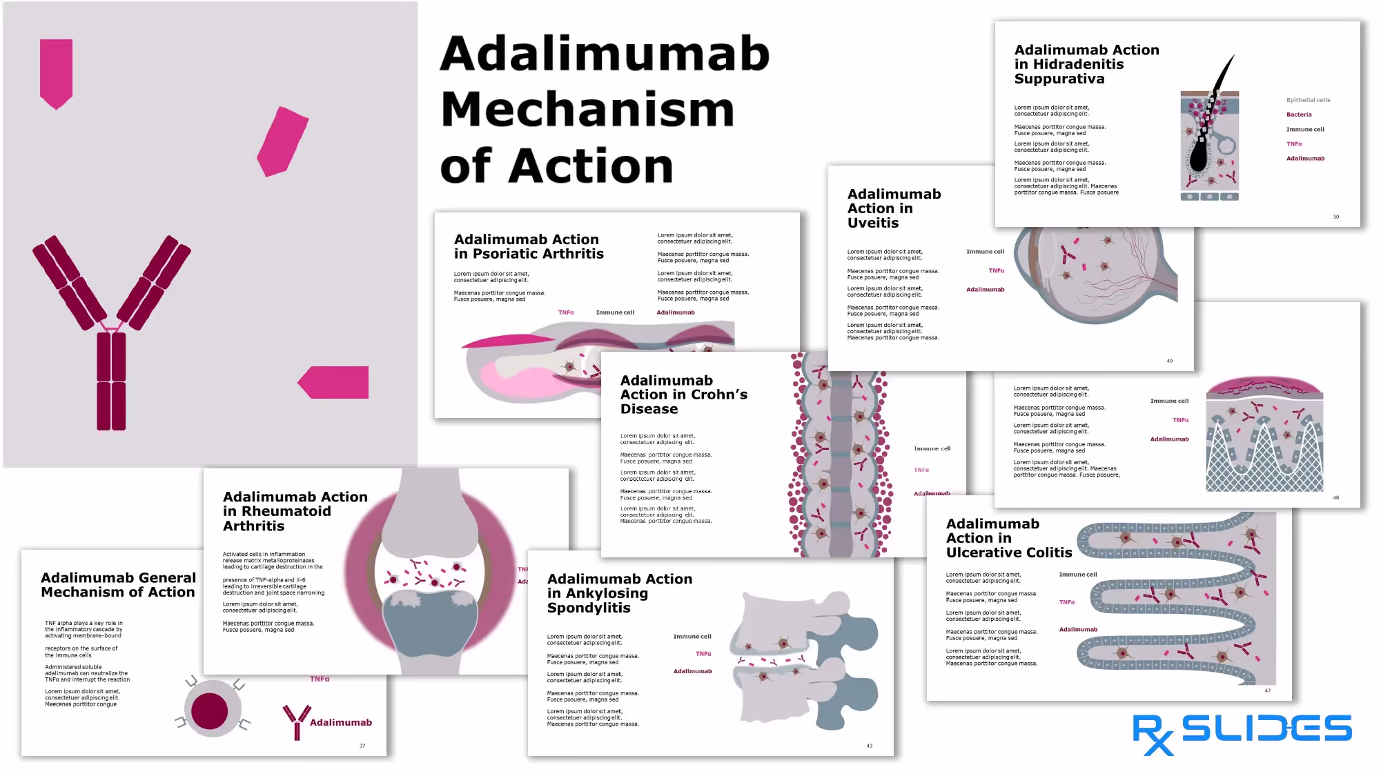 RxSlides template includes medical animations and infographics to attract your audience and give them a dynamic and appealing Adalimumab presentation.