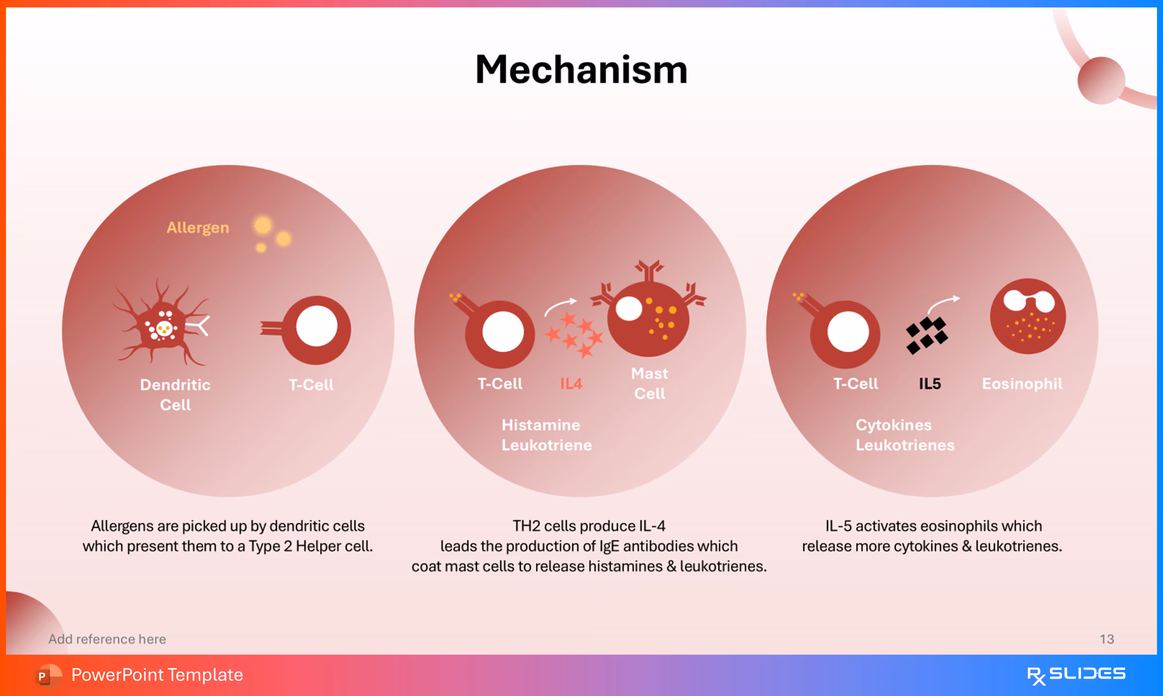 The design uses three distinct, large circular diagrams to clearly illustrate the sequence, starting with an allergen and ending with the release of inflammatory chemicals.