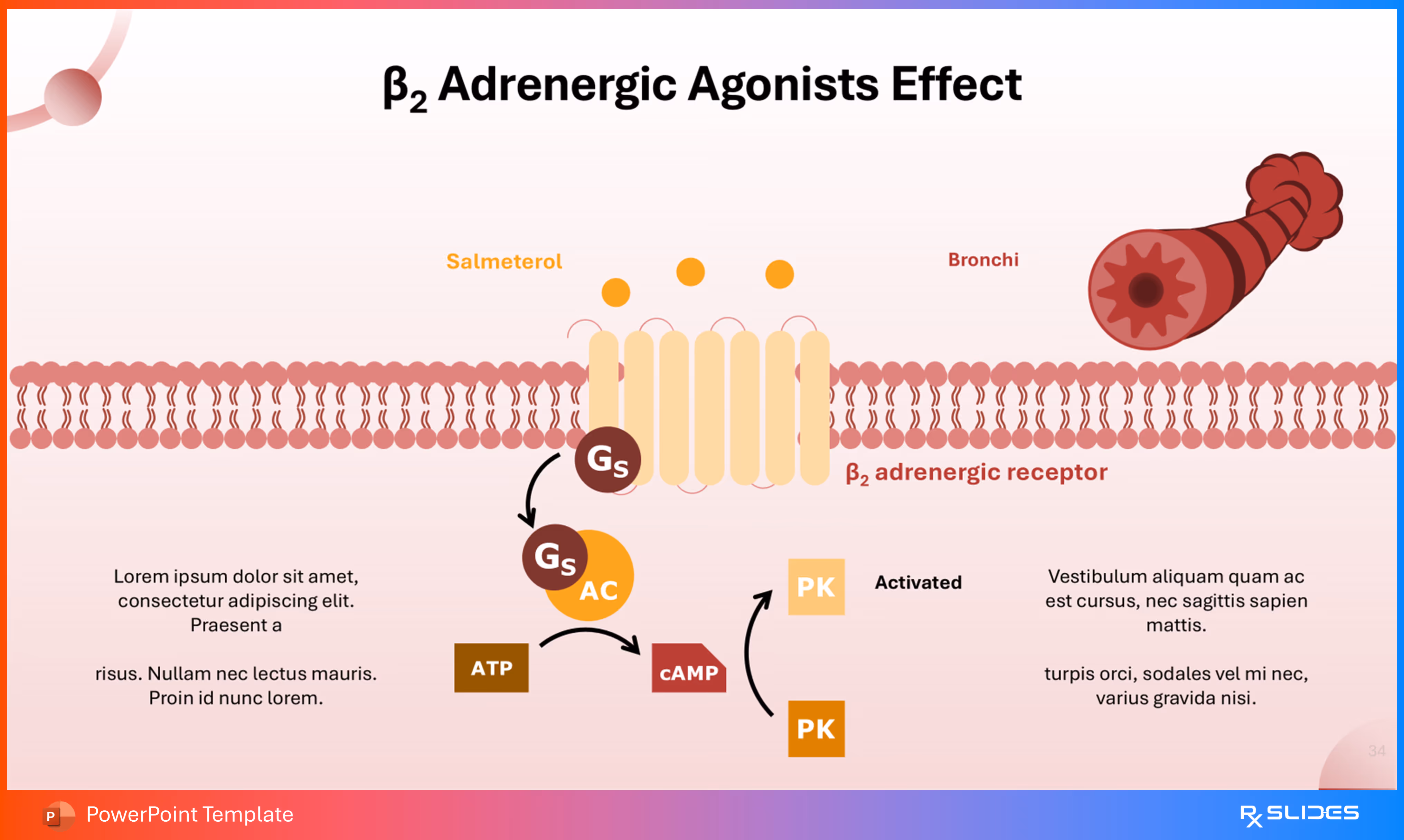 The design uses a diagram to illustrate the entire chain reaction, starting with the drug (Salmeterol) activating a receptor to ultimately produce a therapeutic effect.