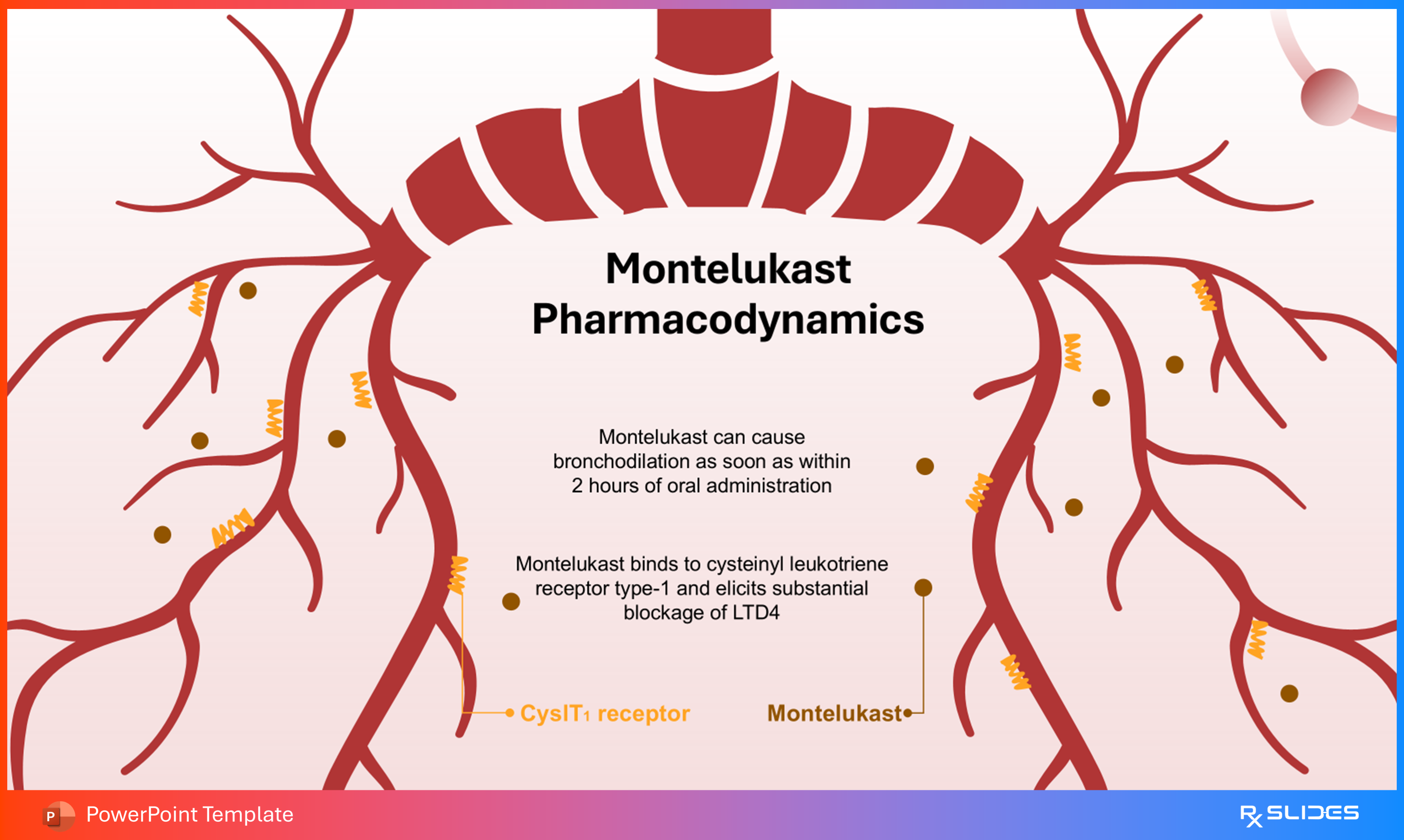 Explains the detailed action of the drug Montelukast directly on the airways of the lungs.