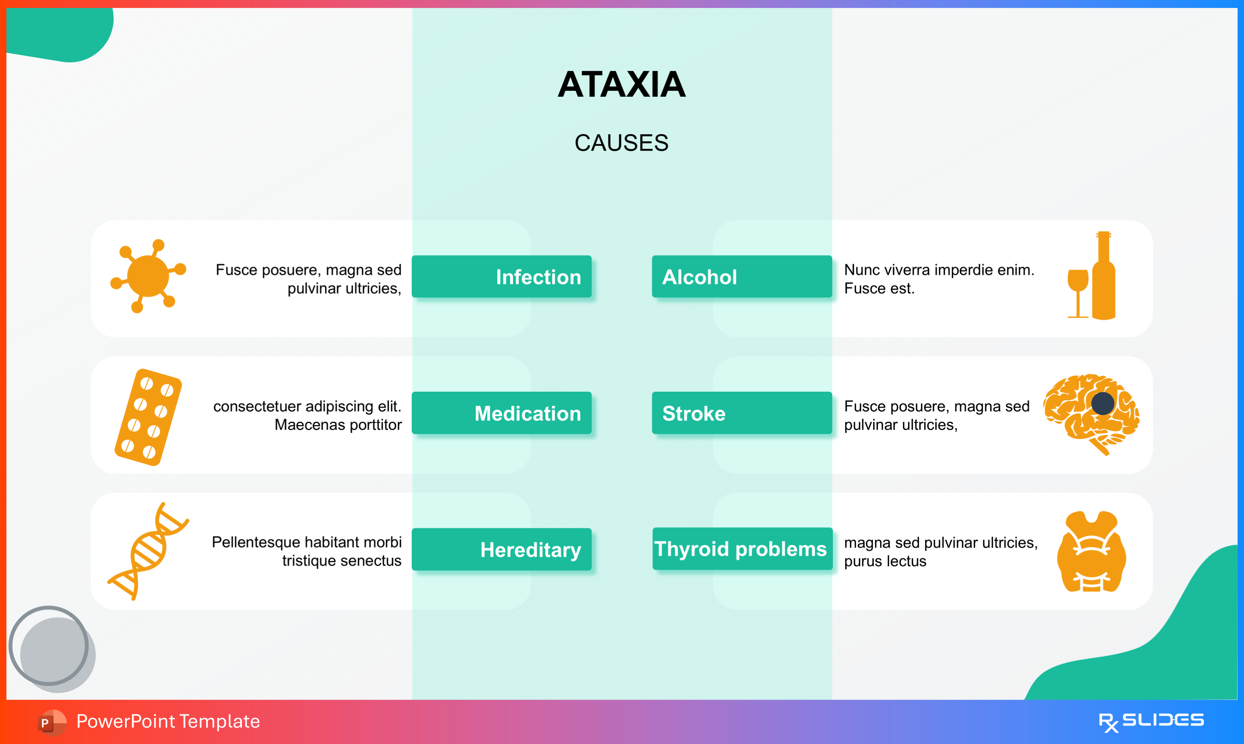 You can rely on our demonstrated infographics to provide a dynamic and appealing Ataxia presentation to your audience.