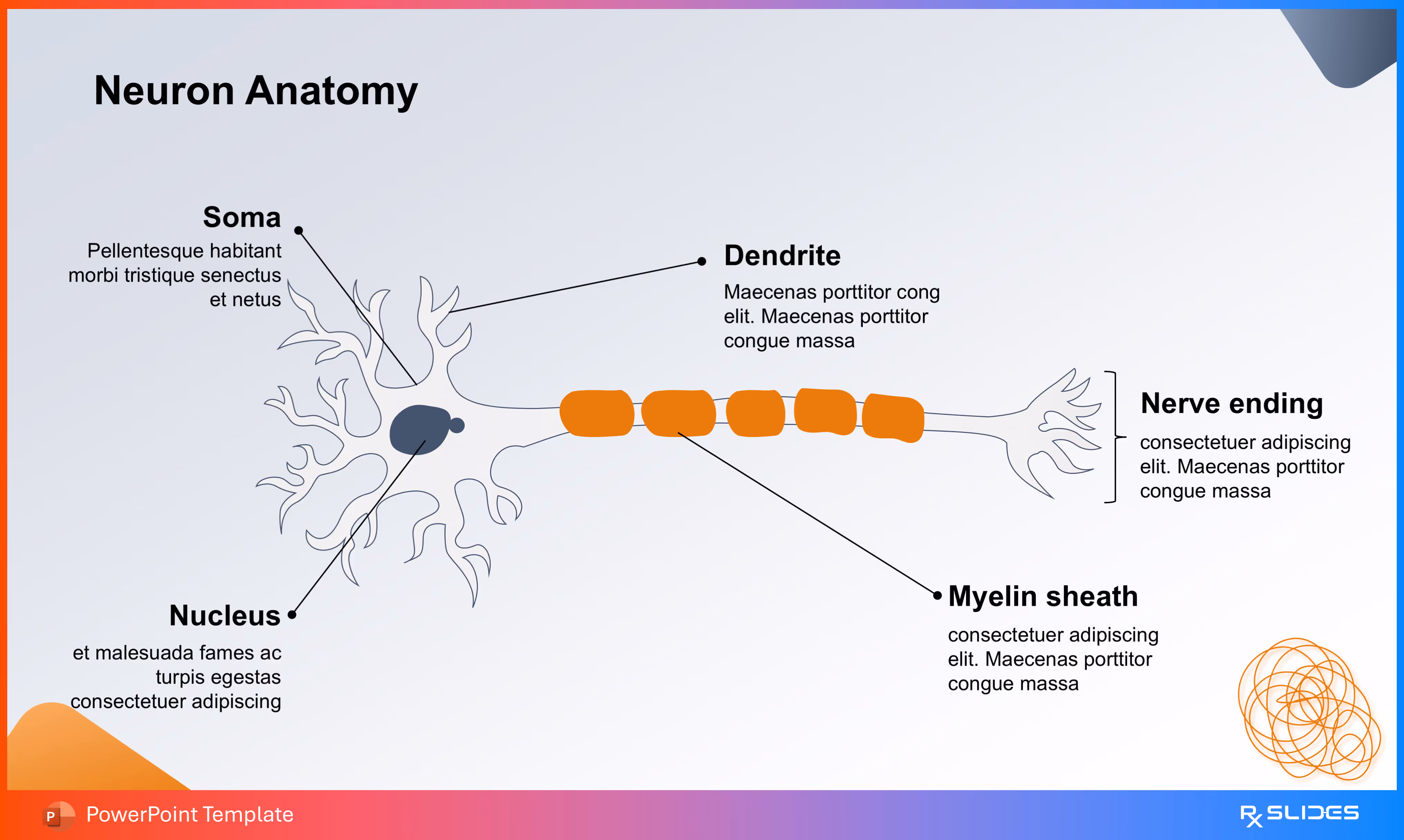 The clean layout clearly labels all five main parts—Soma, Dendrite, Nucleus, Myelin Sheath, and Nerve Ending—ensuring your audience grasps the fundamental components immediately.