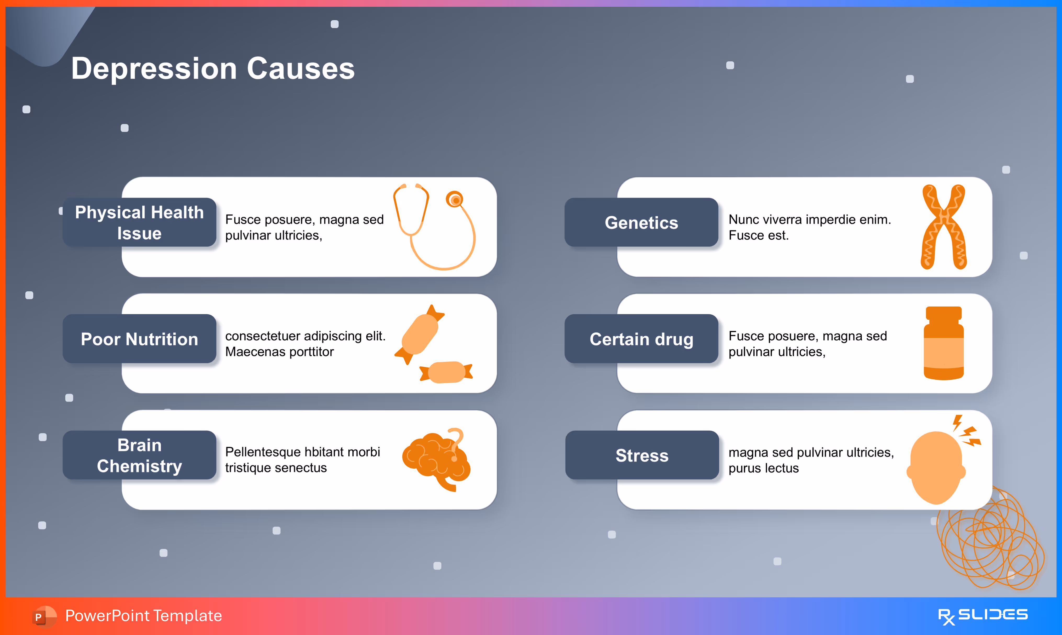 The design uses icons like the Brain chemistry graphic and the Genetics chromosome to make complex causes immediately recognizable and easy for your audience to track.