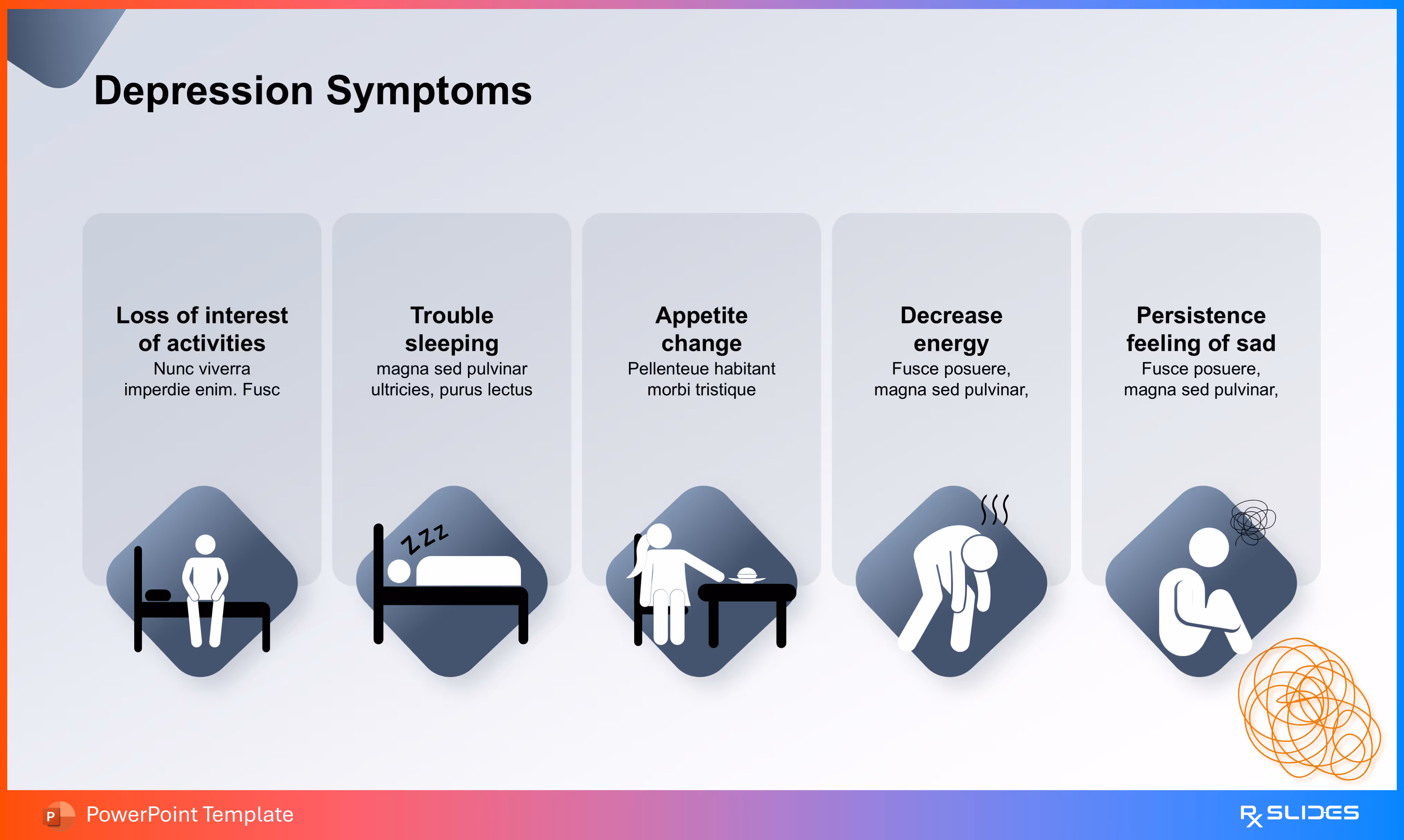 The design uses six striking icons including figures for Trouble sleeping and Persistence feeling of sad arranged along a central timeline to ensure professional and engaging presentation.