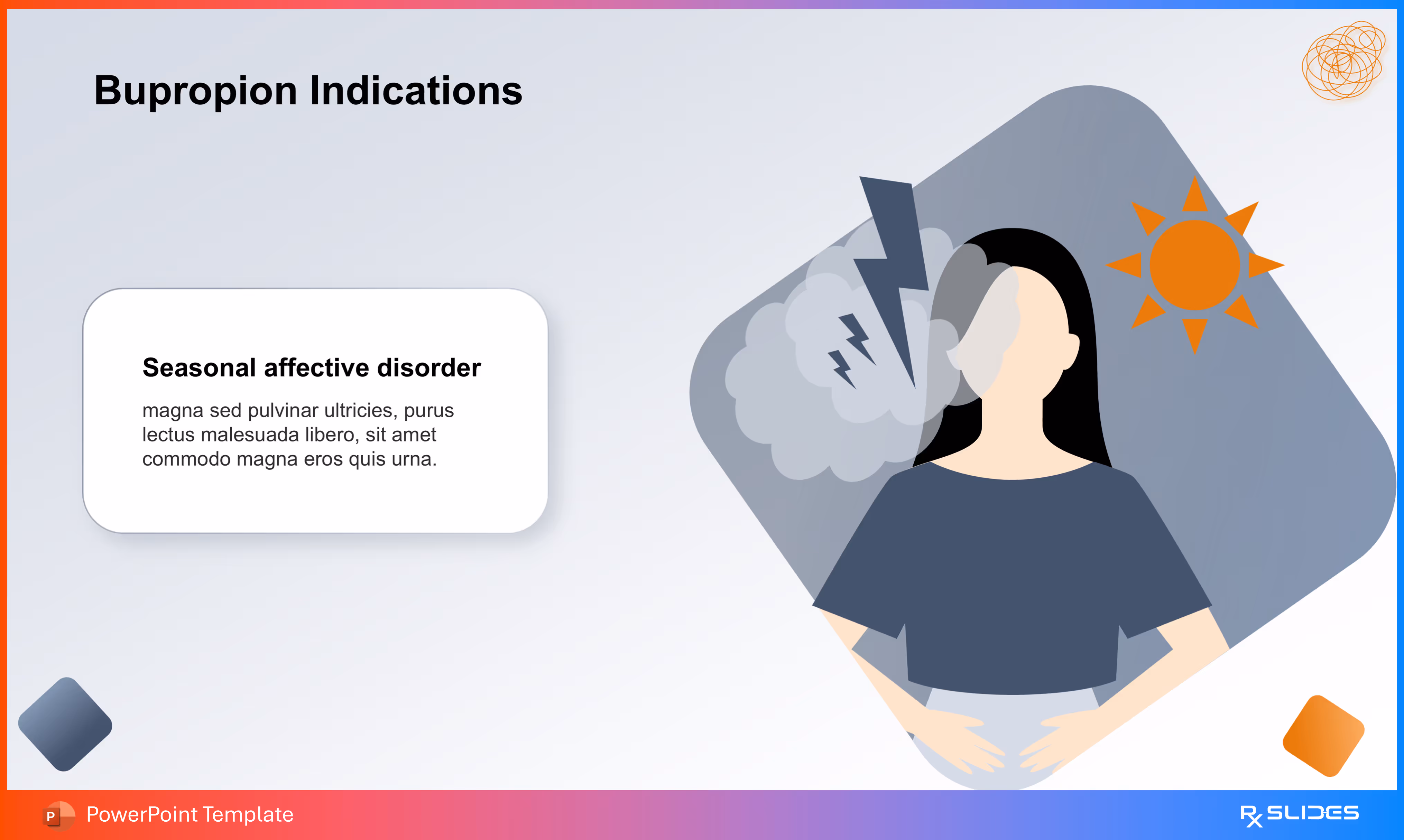 Explains Bupropion's role in treating Seasonal Affective Disorder, providing crucial clinical information with a strong visual element.