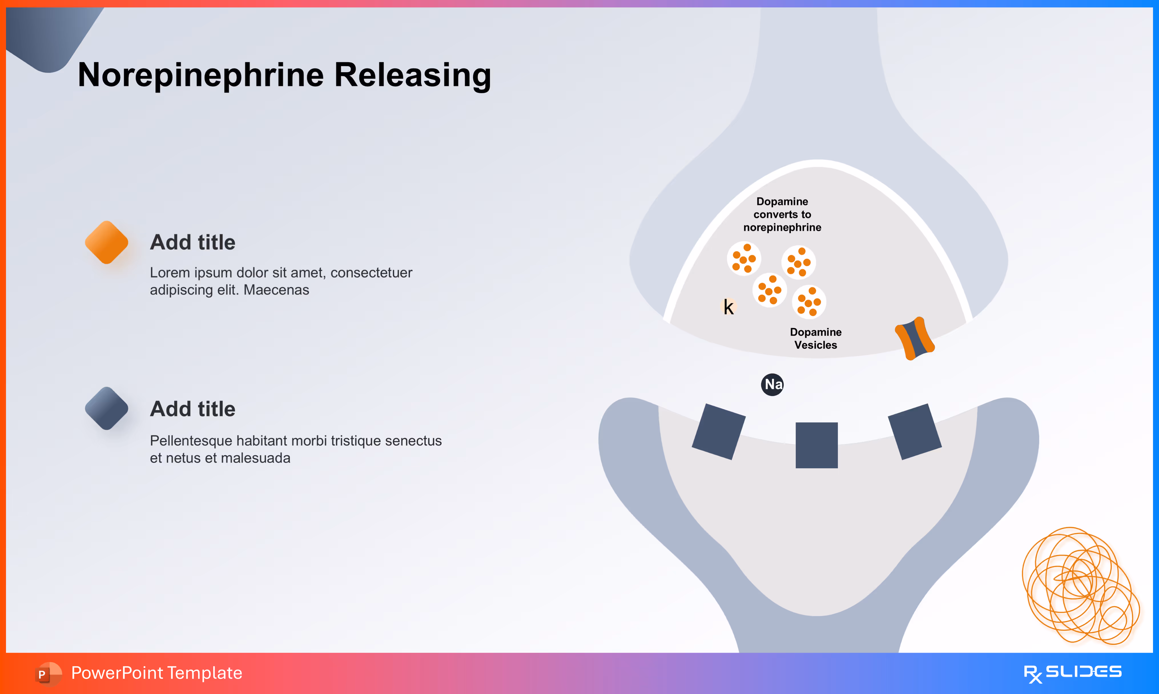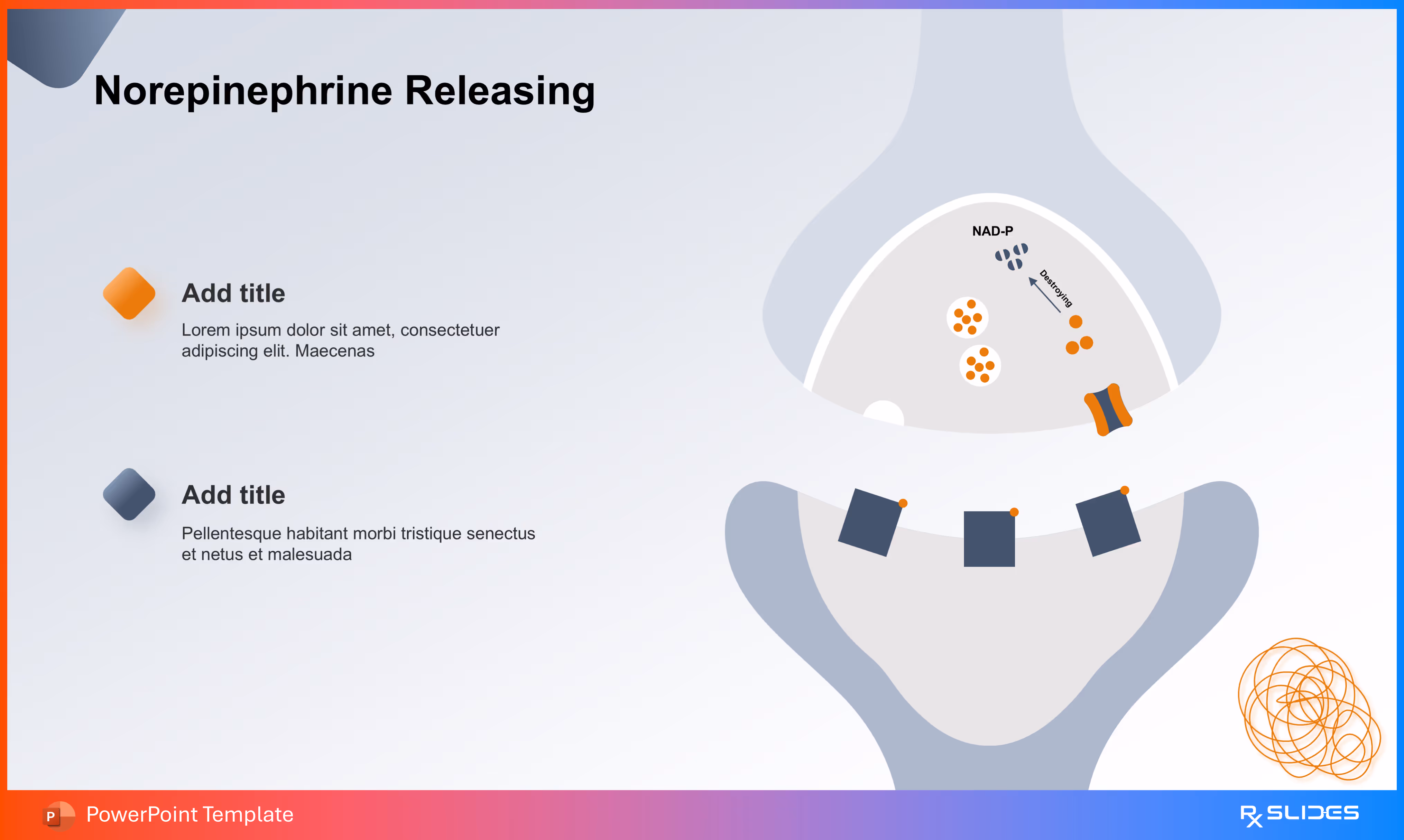 The slide features a large, clear illustration of a neuronal synapse that shows the release of the orange Norepinephrine vesicles into the synaptic cleft.