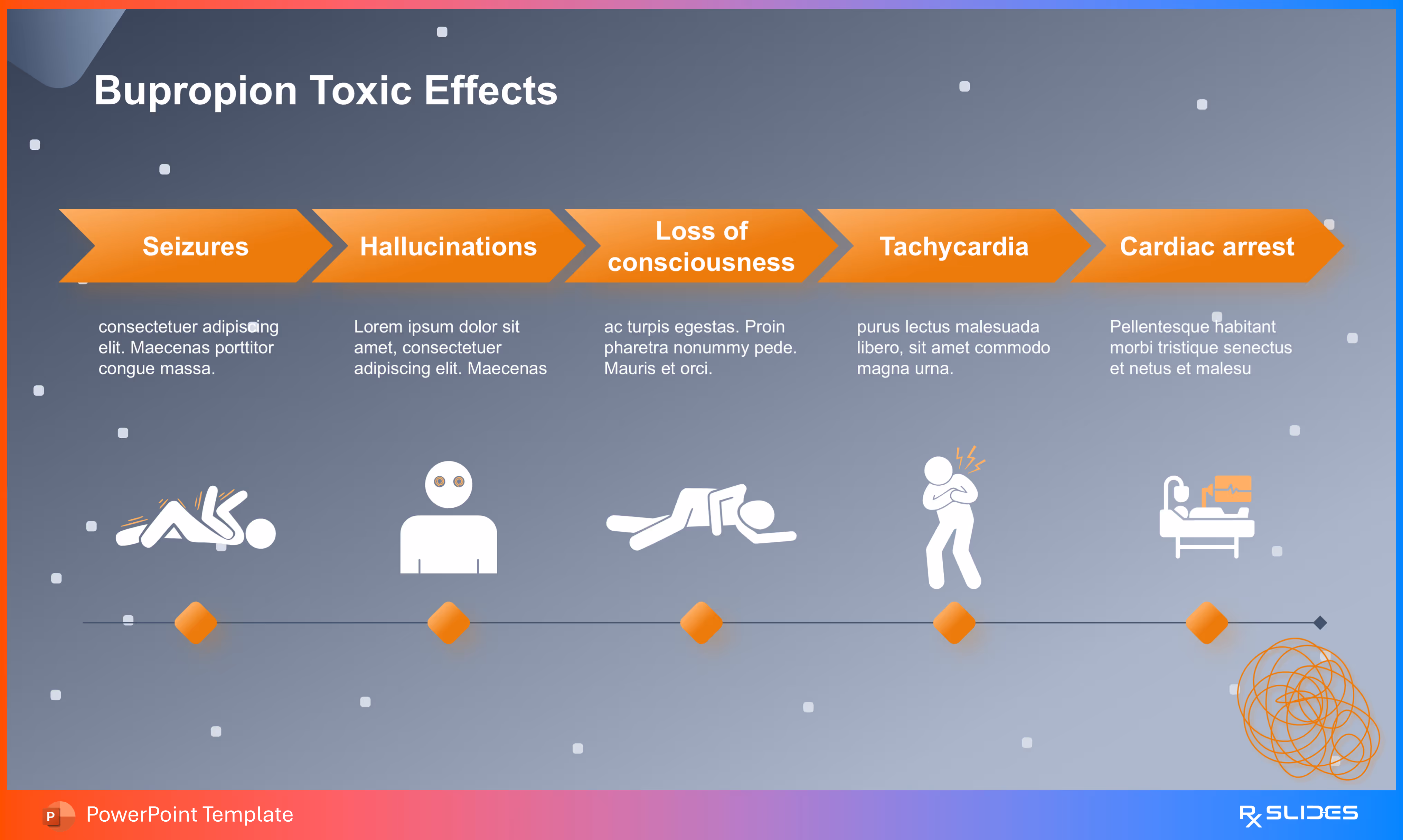 Reinforces the progression of Bupropion toxicity, ensuring your audience memorizes the sequence of severe effects like Seizures, Hallucinations, and Cardiac arrest.