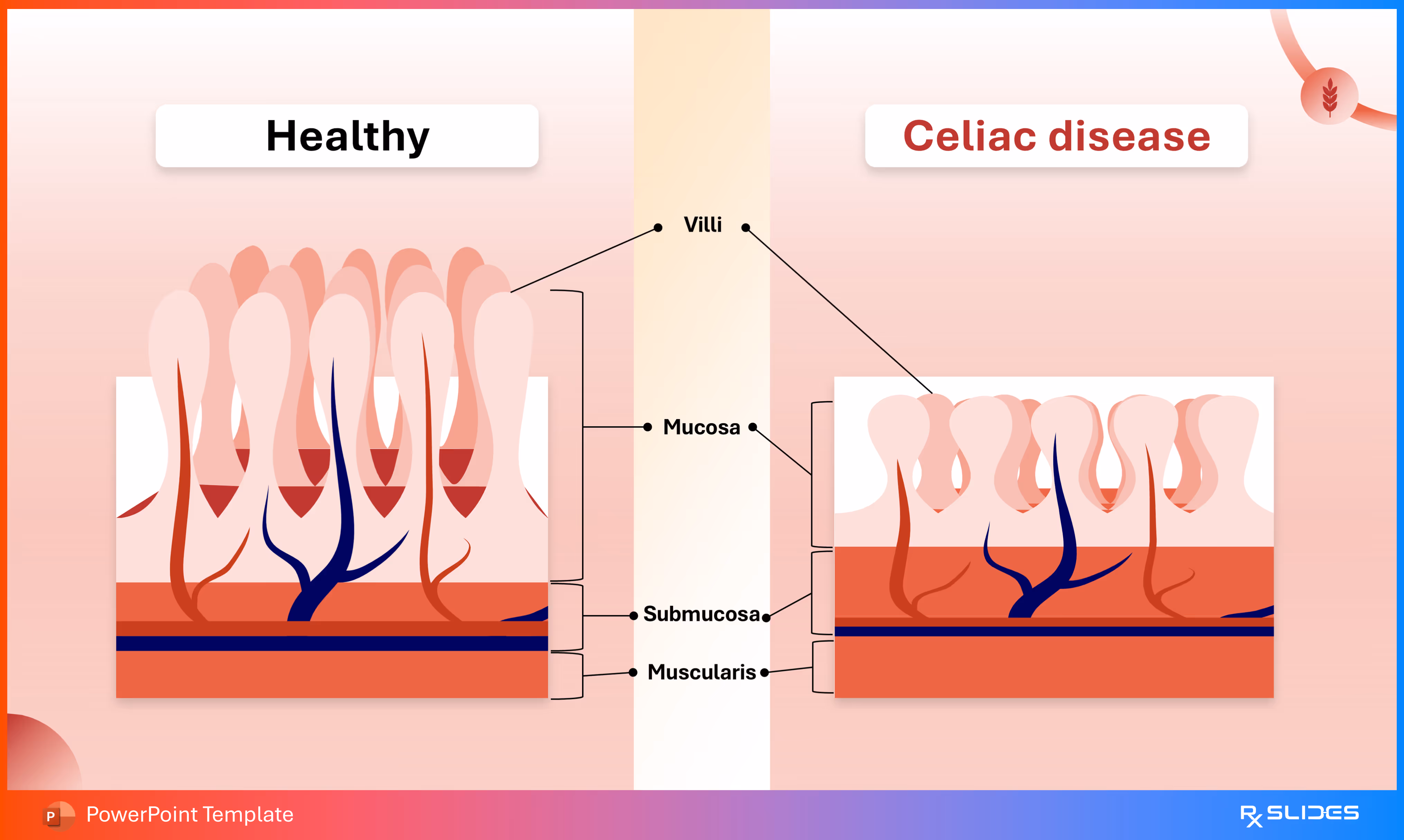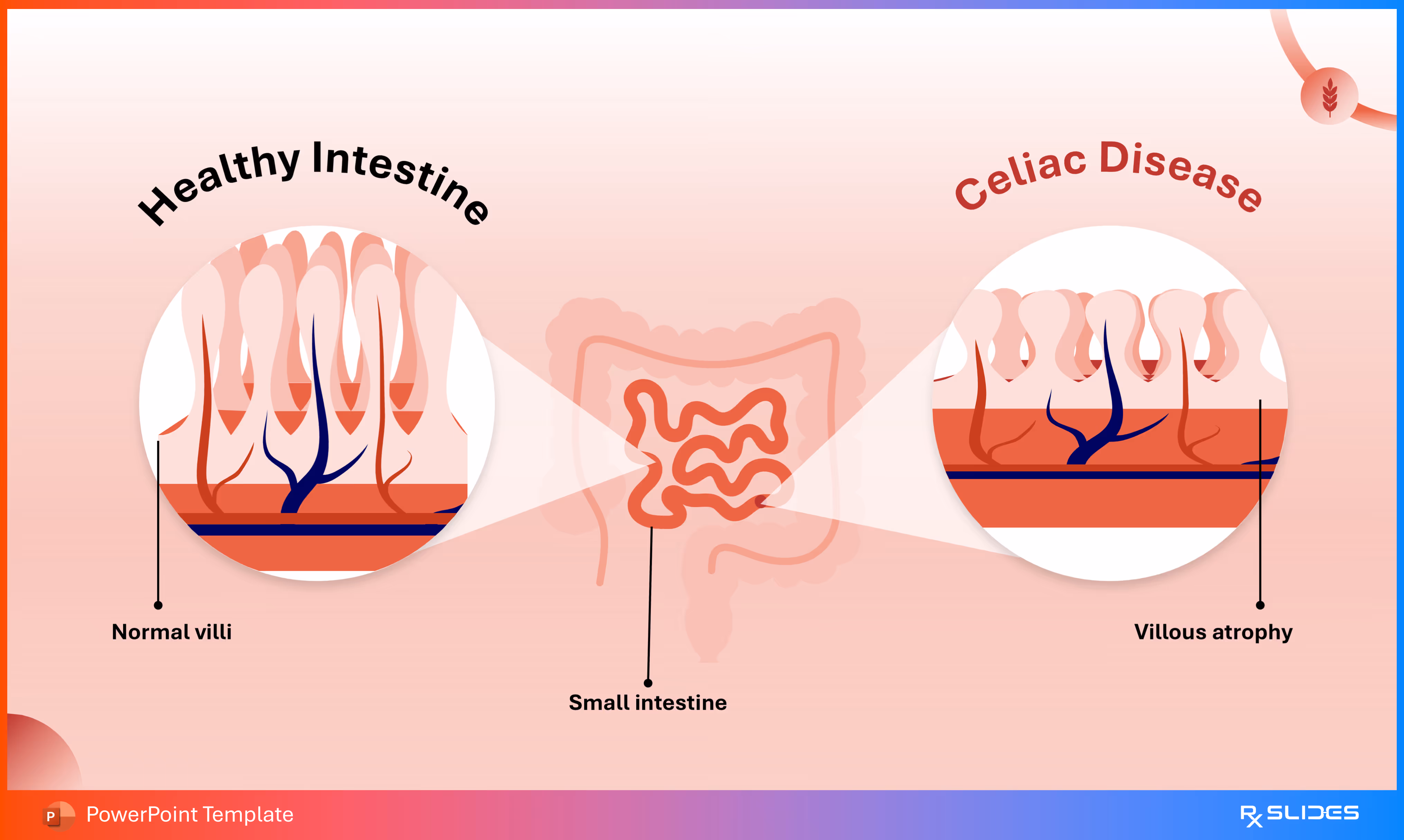The slide features a side-by-side illustration contrasting a "Healthy" intestinal wall, showing normal villi, with an area affected by "Celiac disease," showing damaged, atrophied villi.