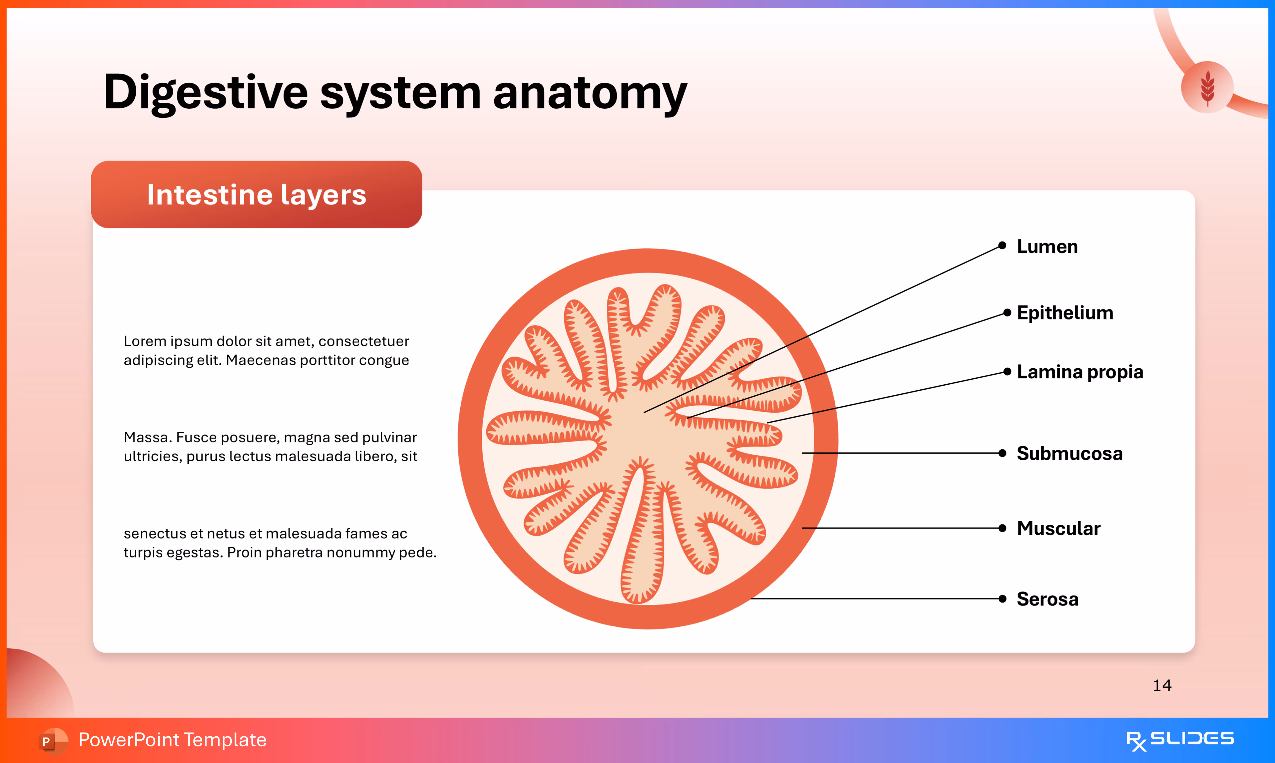 The design features a large, cross-sectional diagram of the intestine, expertly labeling all six layers, from the Lumen to the Serosa.