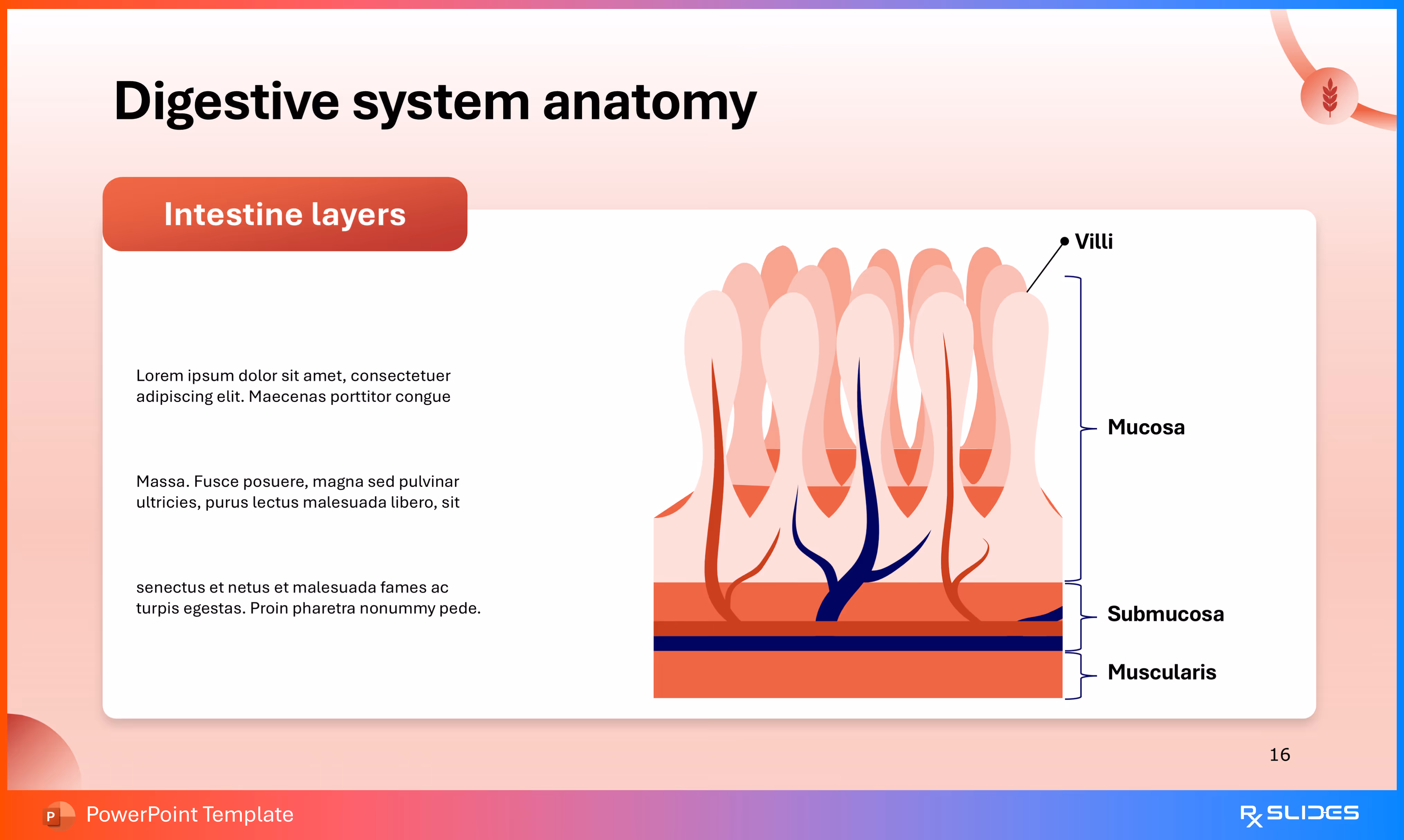The design features a sequential list alongside a large, central illustration that magnifies the Intestinal Villi.