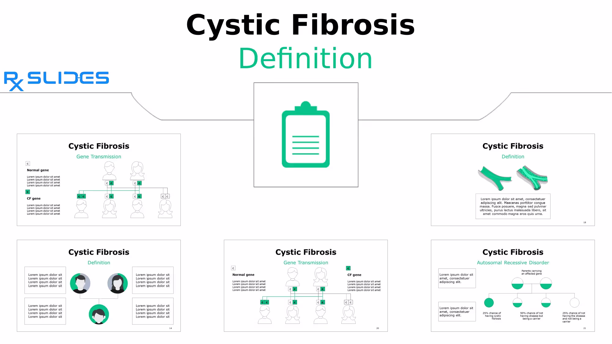 Impressive animations are designed by RxSlides professionals to explain the pathogenic mechanisms of cystic fibrosis and its effect on the lungs, sweat and pancreas.
