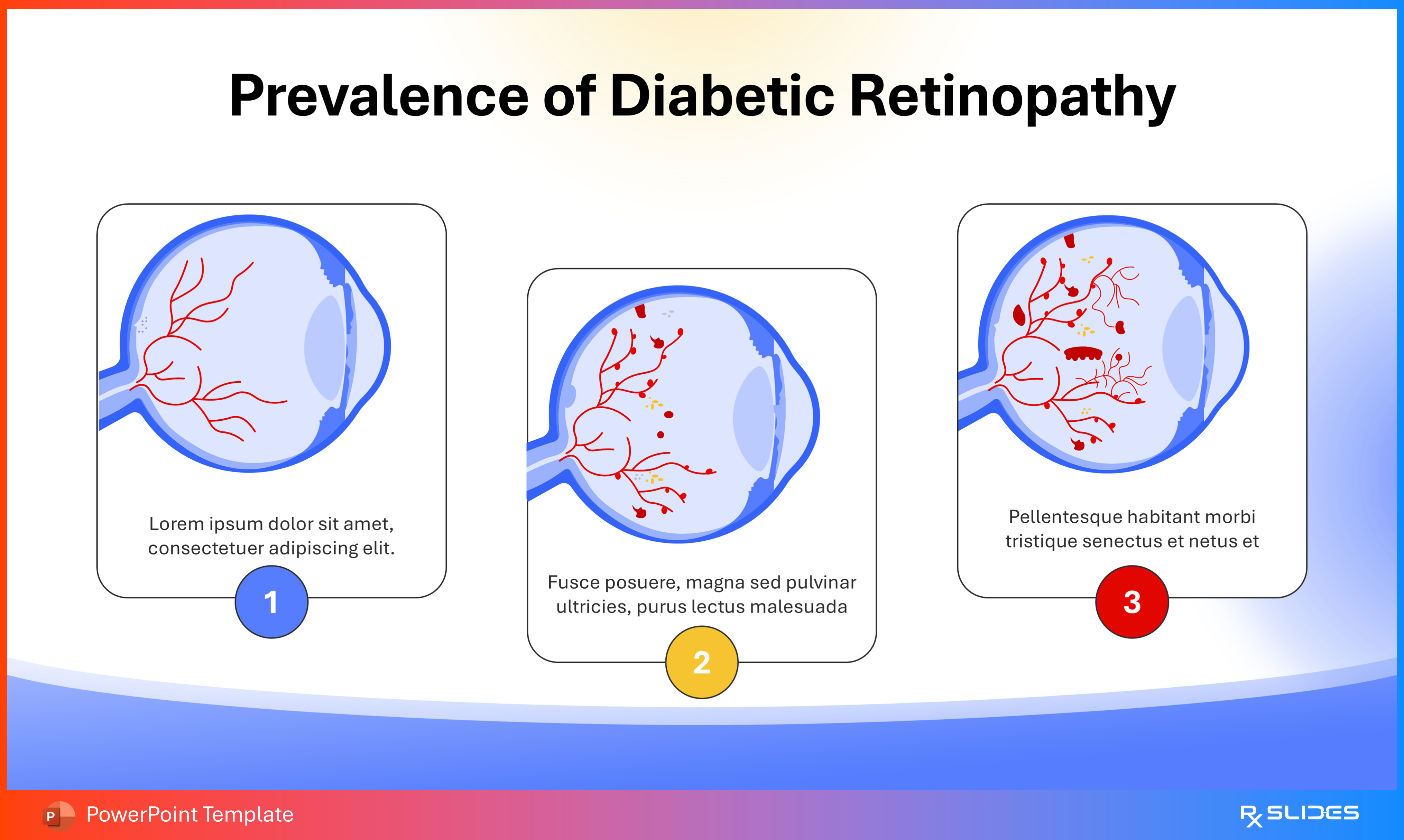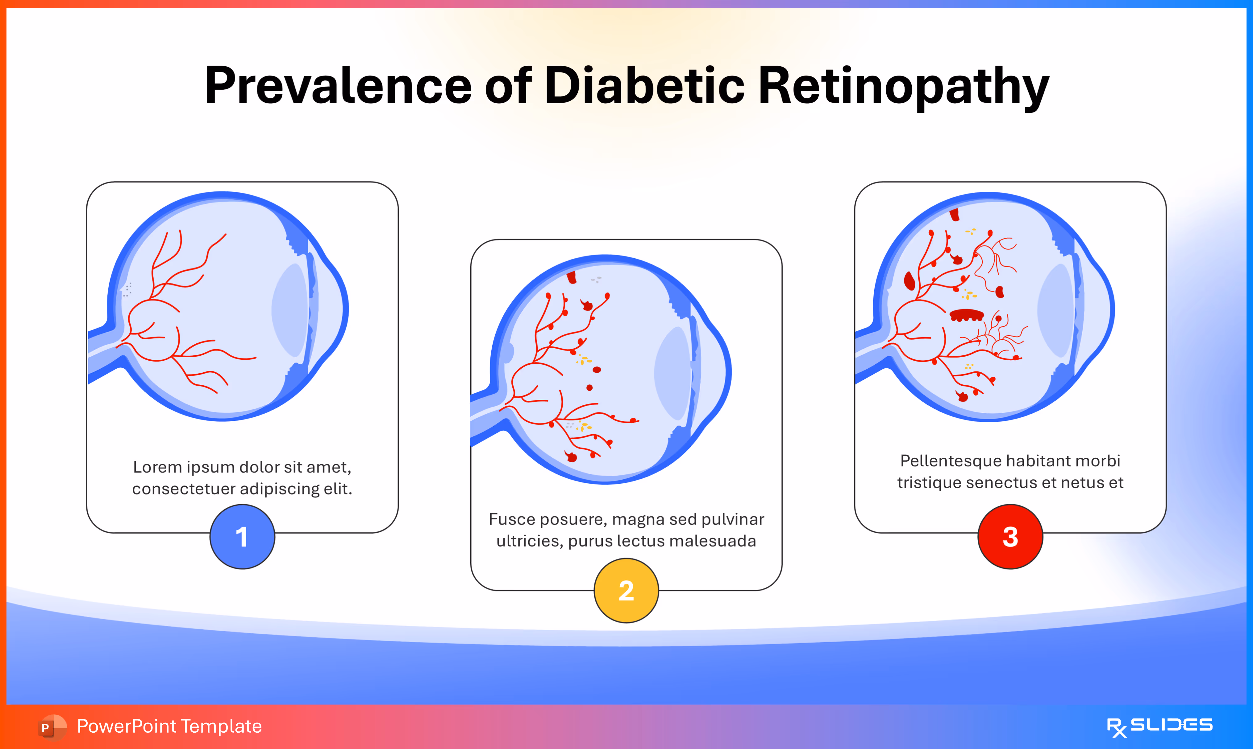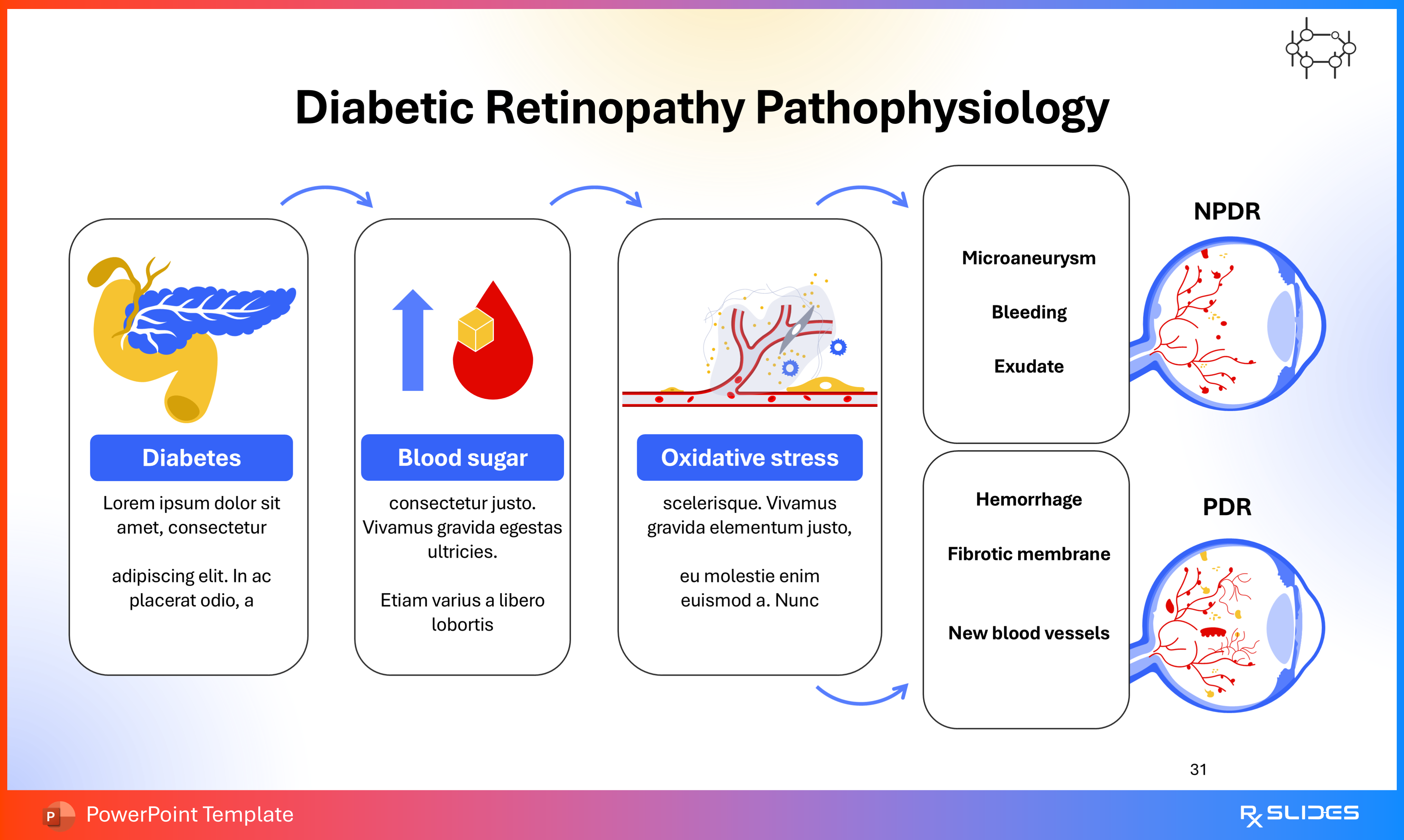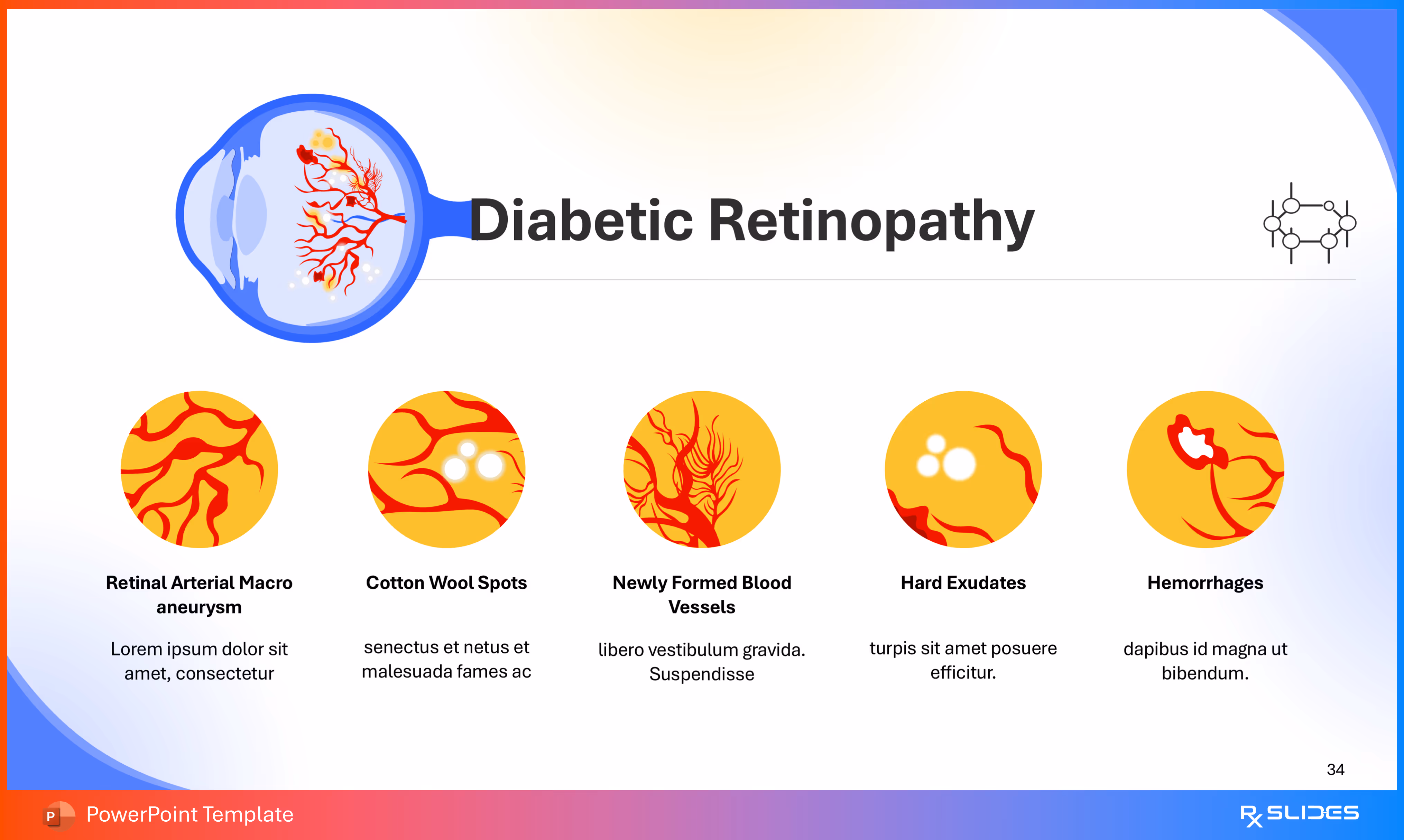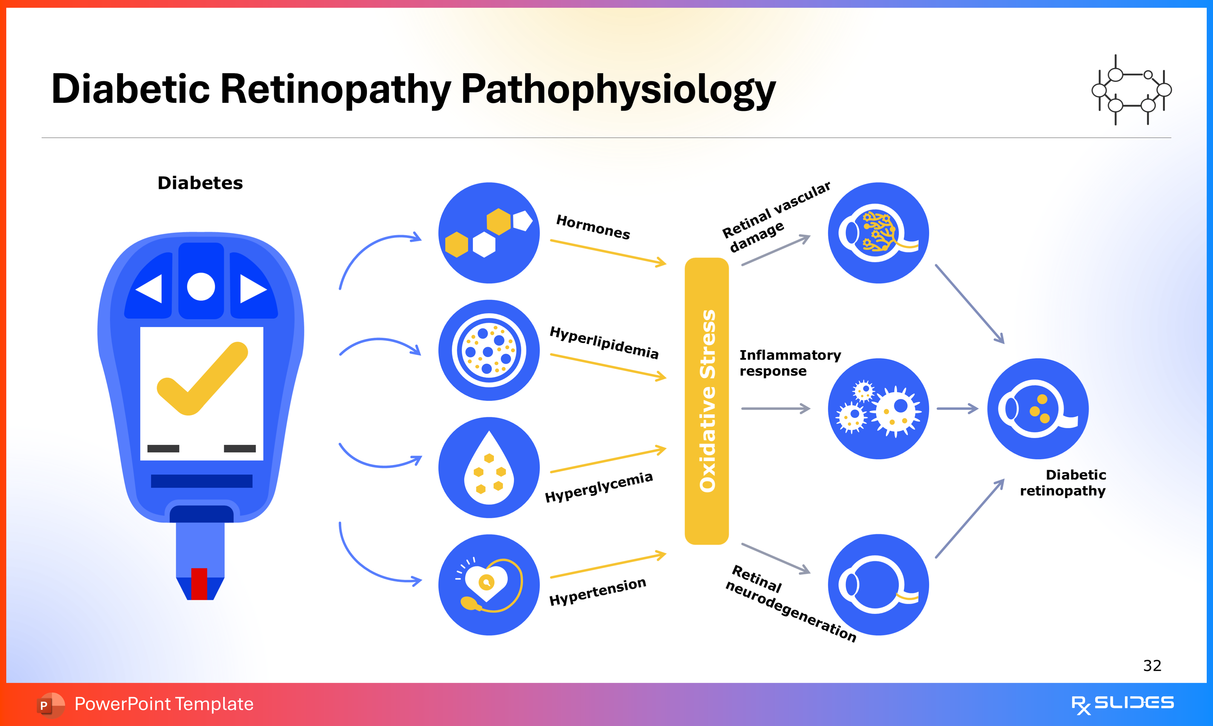 RxSlides presents a Diabetic Retinopathy PPT template to uncover the complexity of this topic in a straightforward, visually appealing way with the help of engaging animations.
