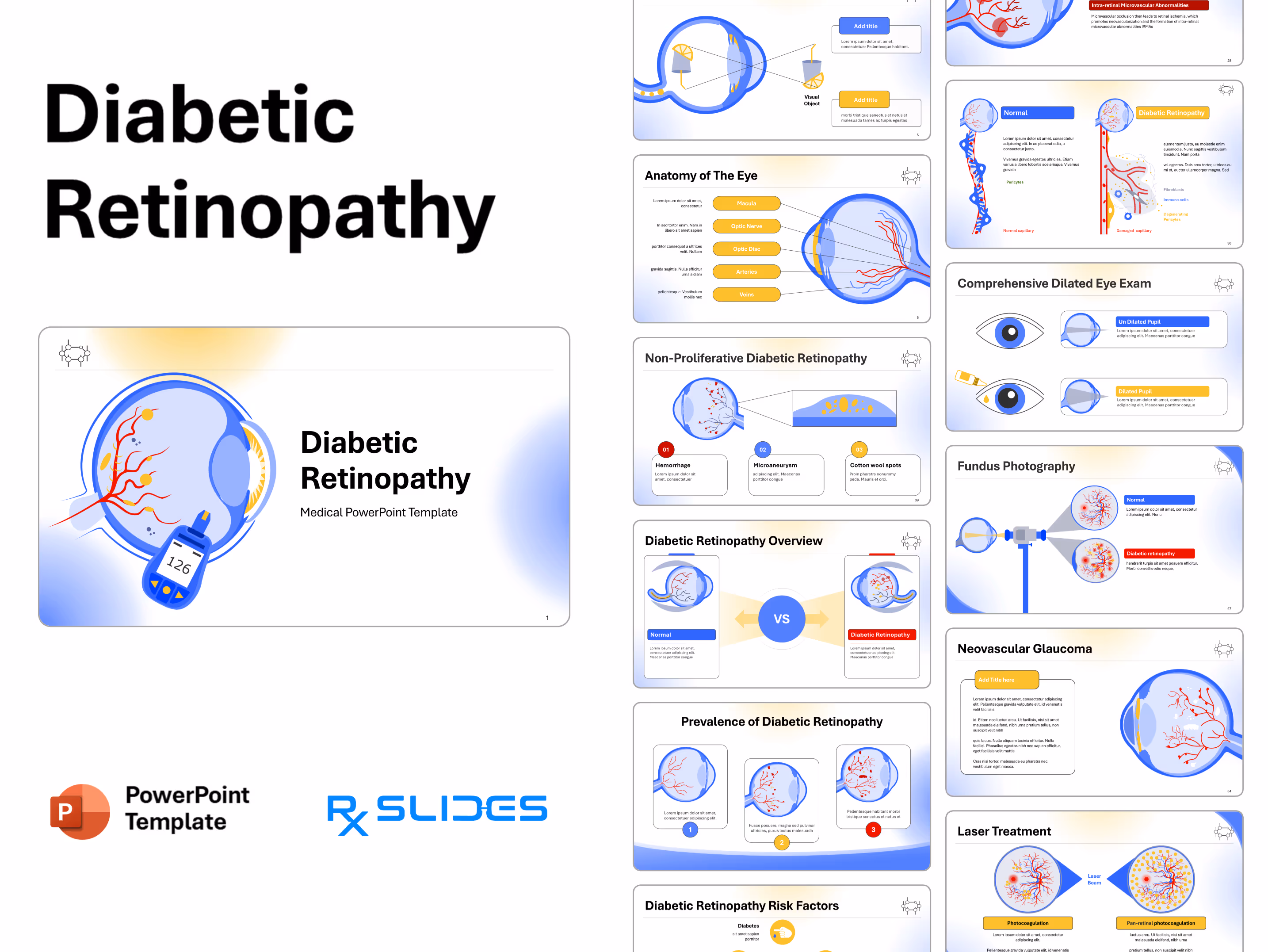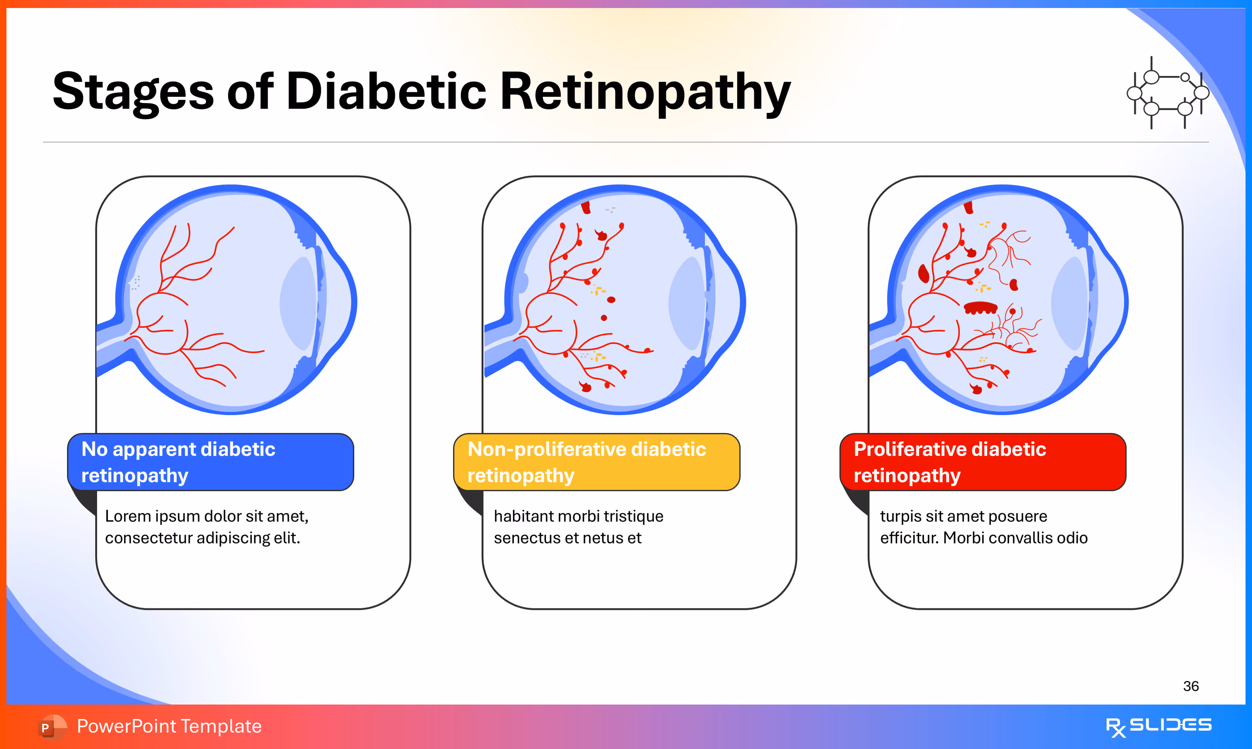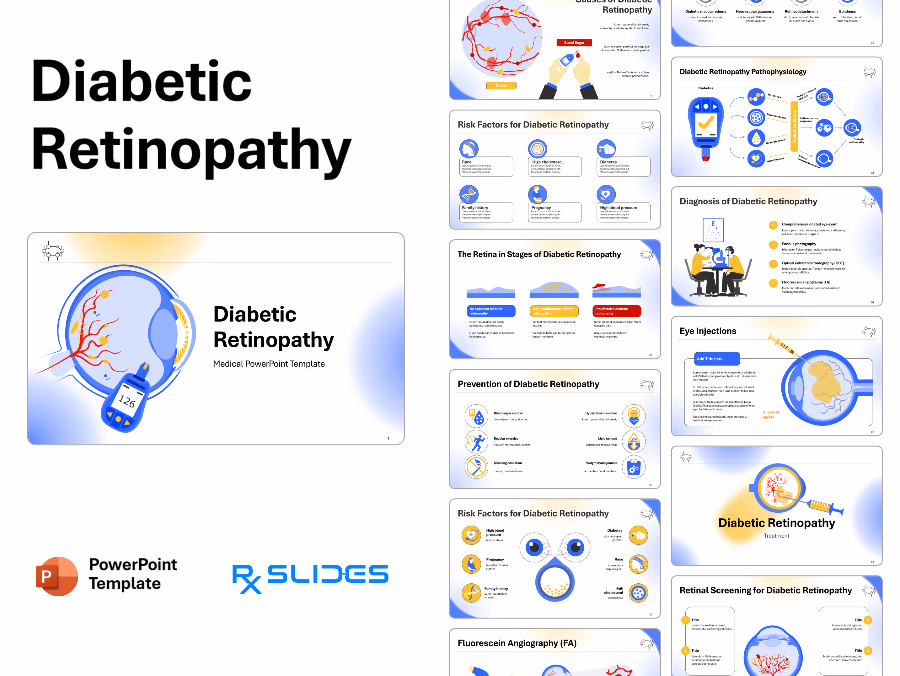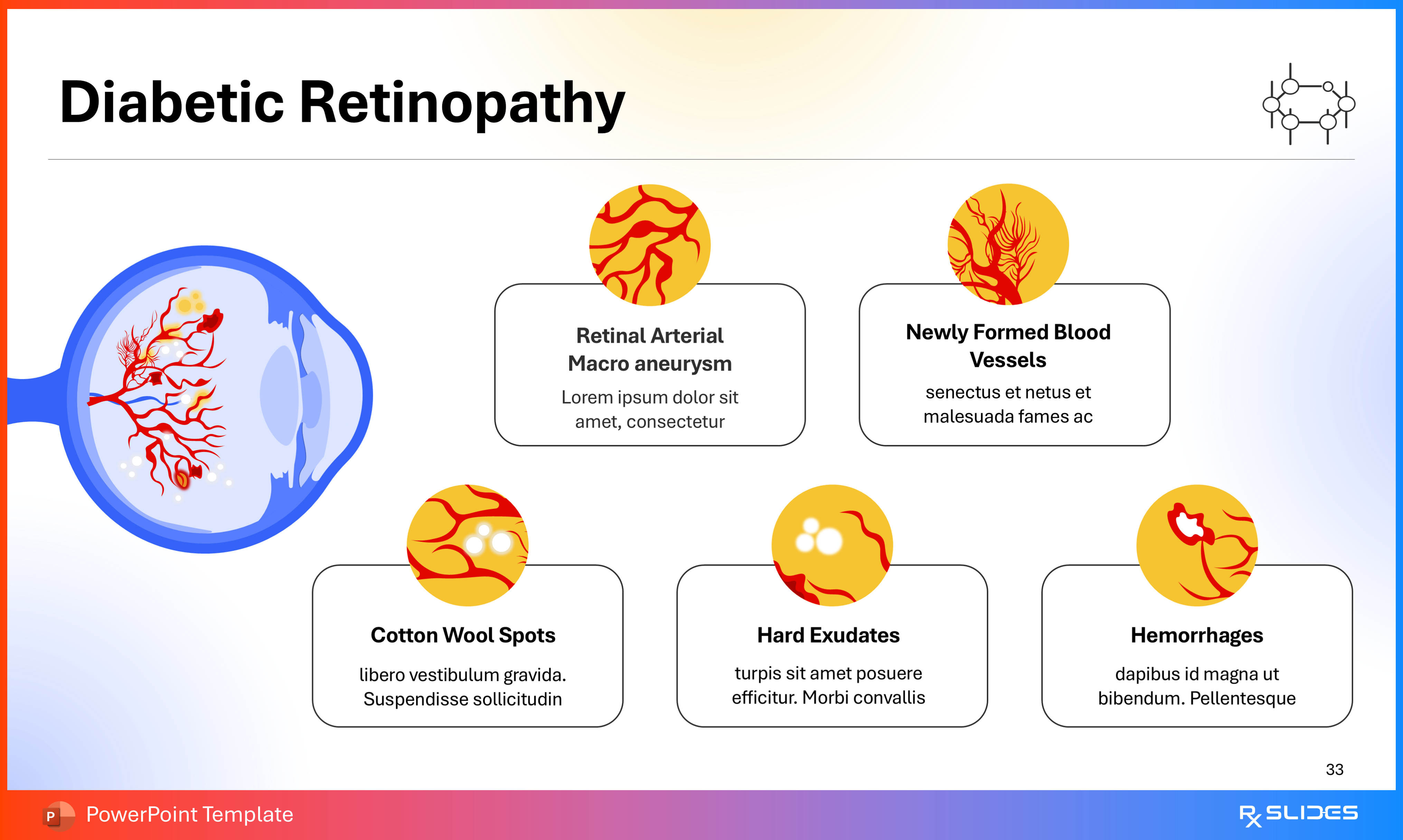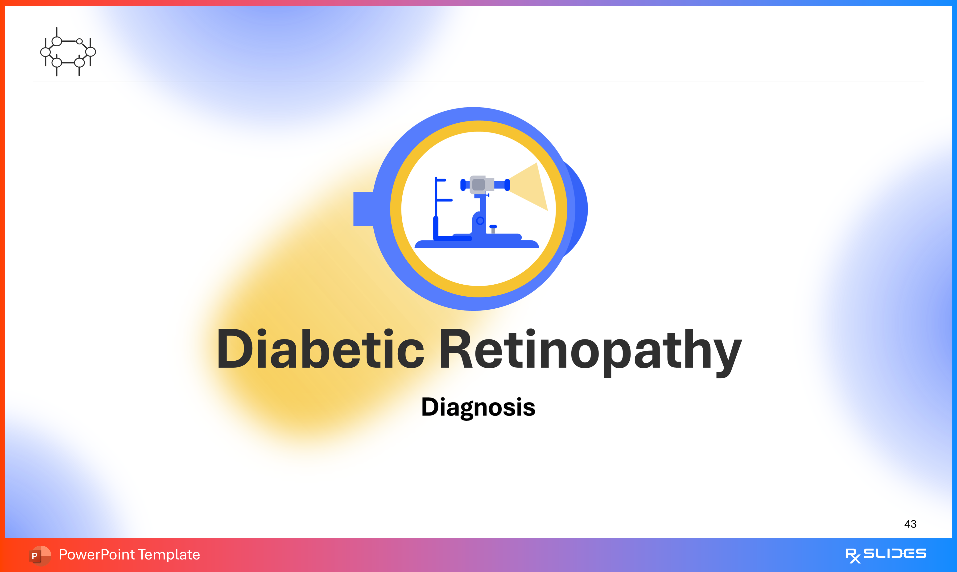 RxSlides presents a Diabetic Retinopathy PPT template to uncover the complexity of this topic in a straightforward, visually appealing way with the help of engaging animations.