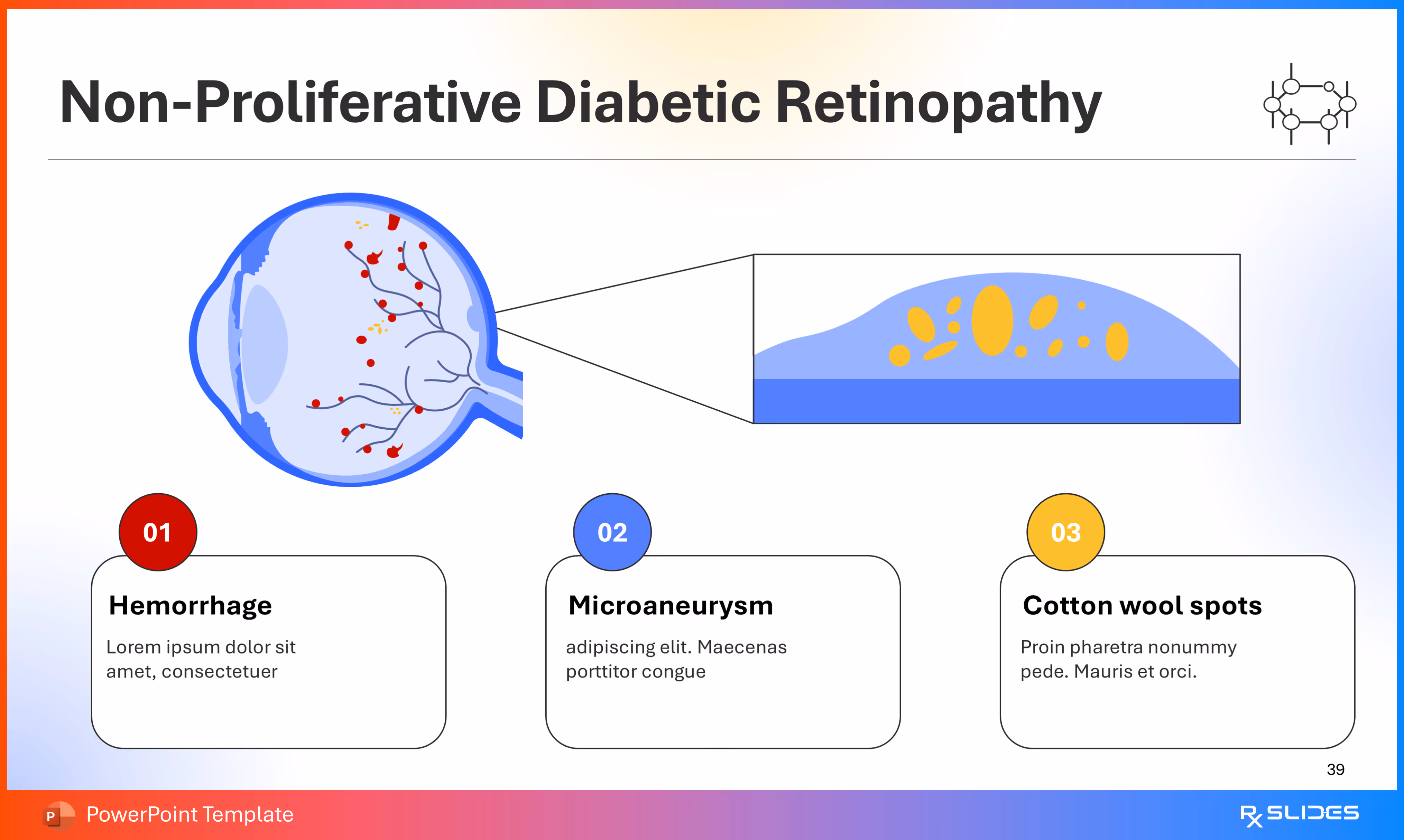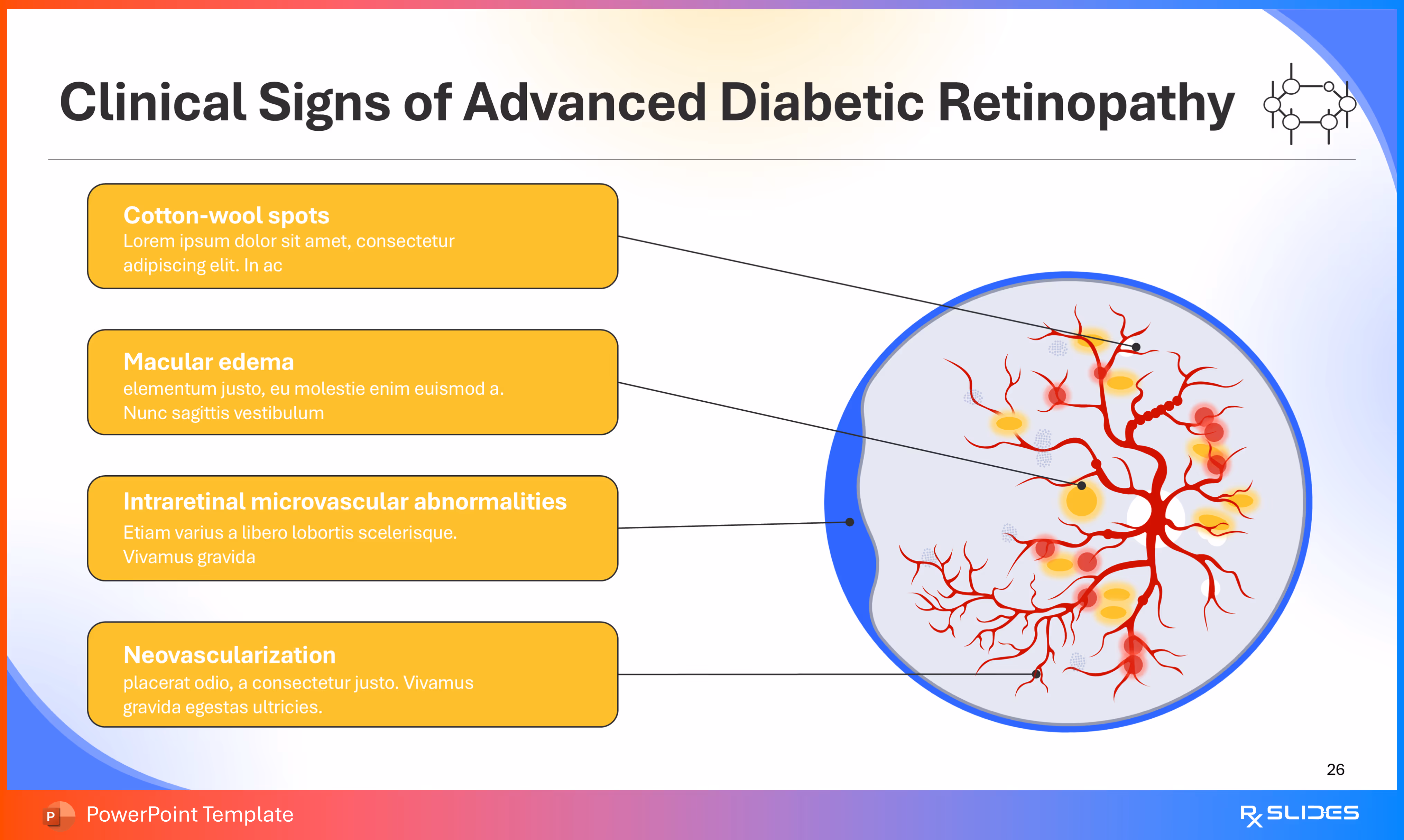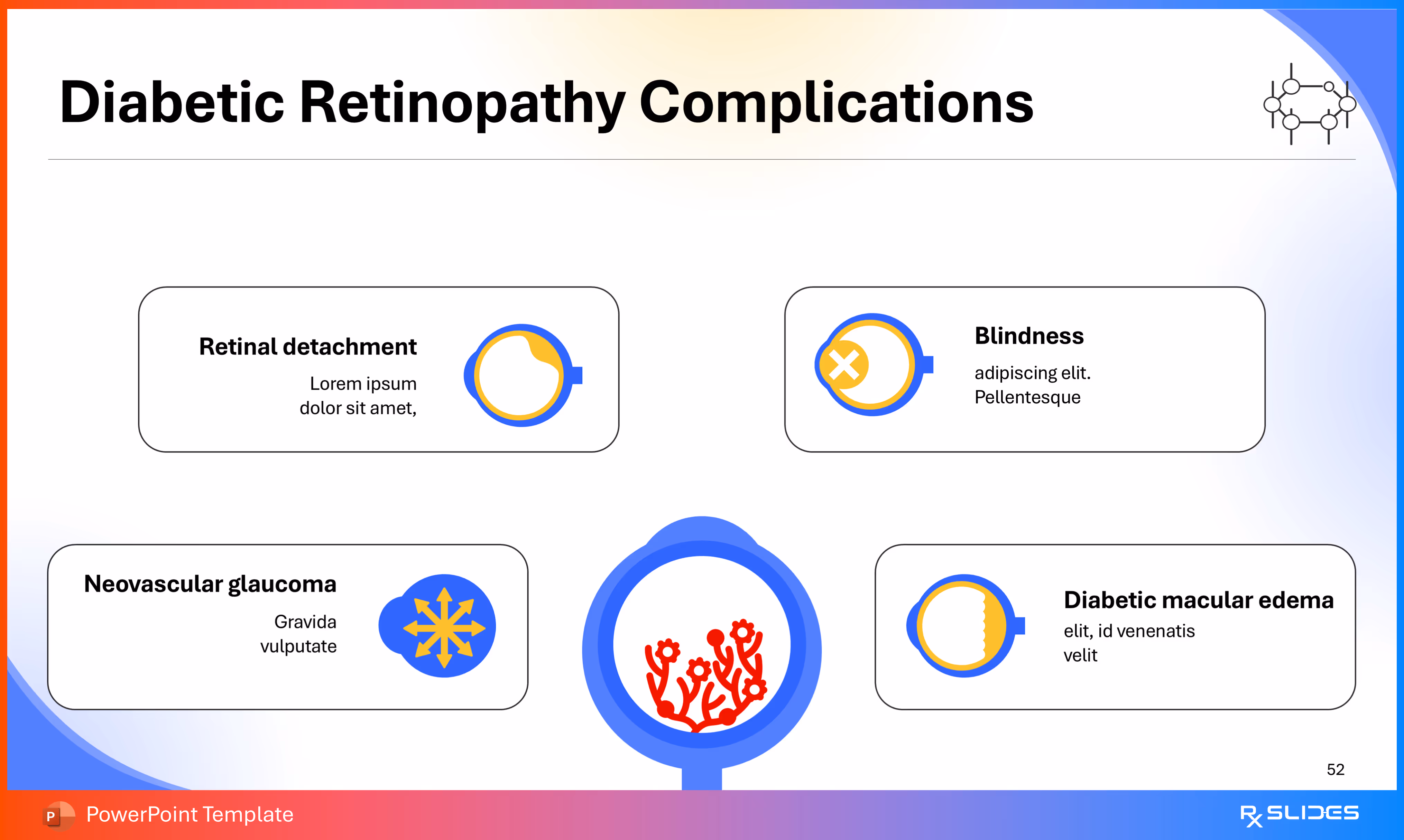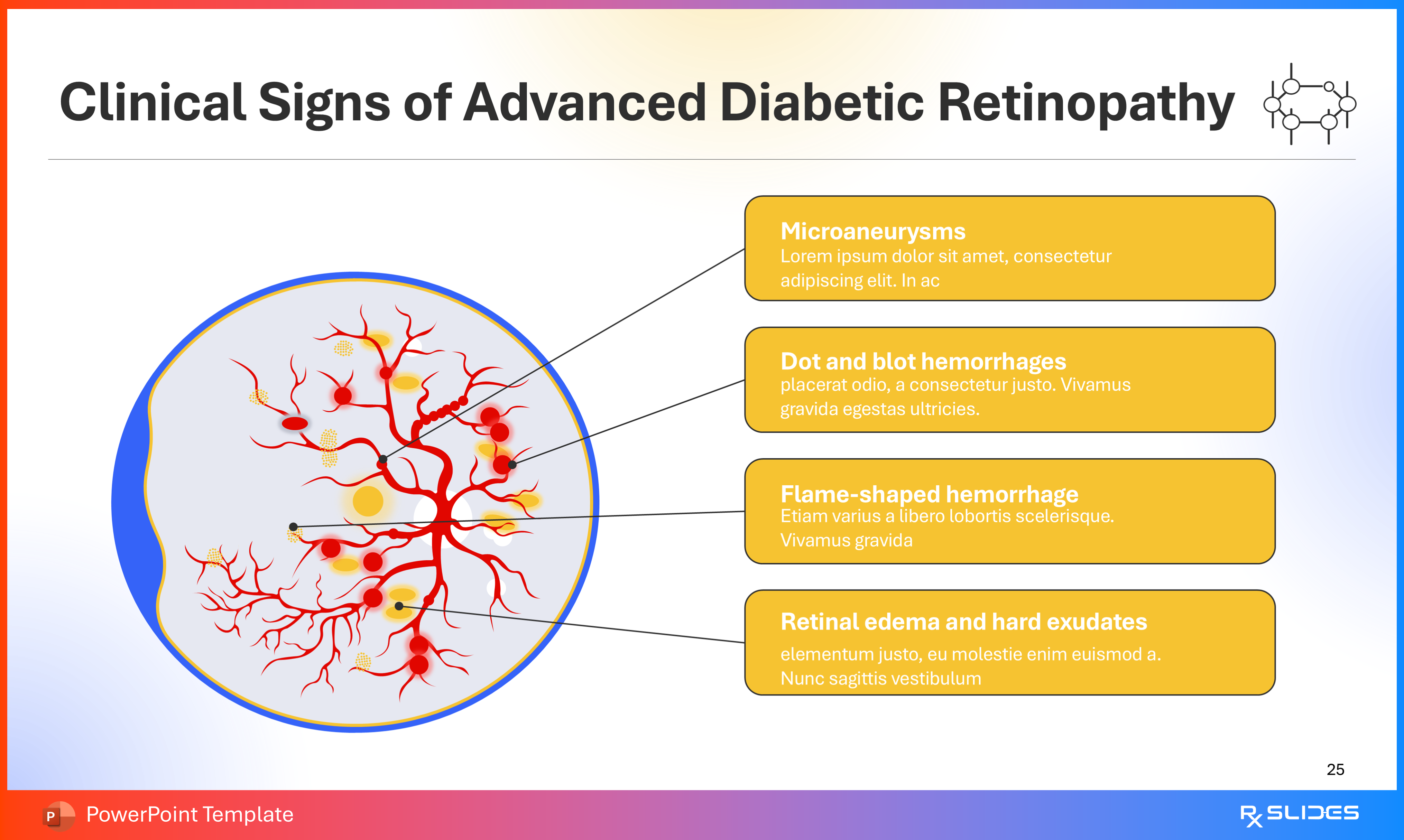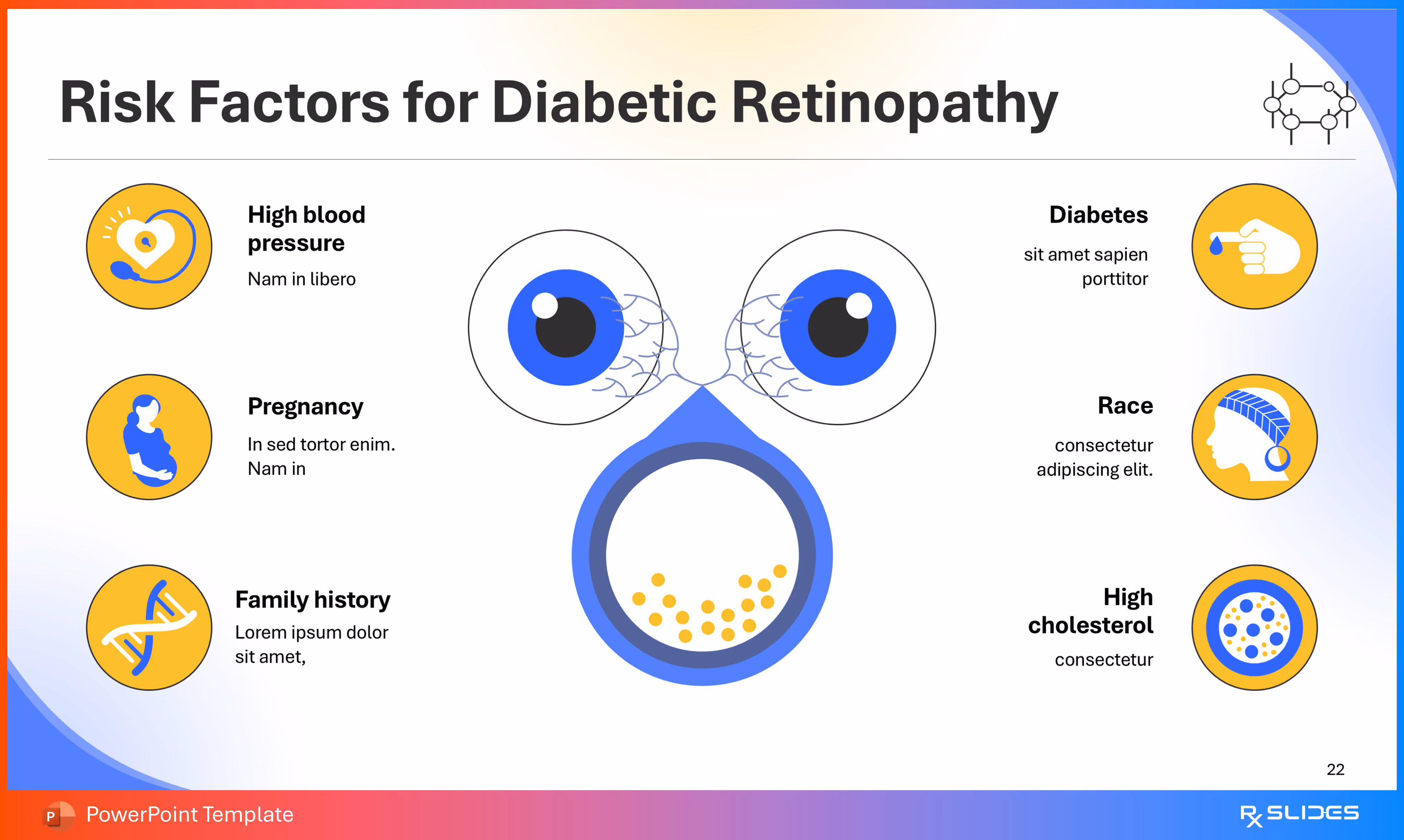 RxSlides presents a Diabetic Retinopathy PPT template to uncover the complexity of this topic in a straightforward, visually appealing way with the help of engaging animations.