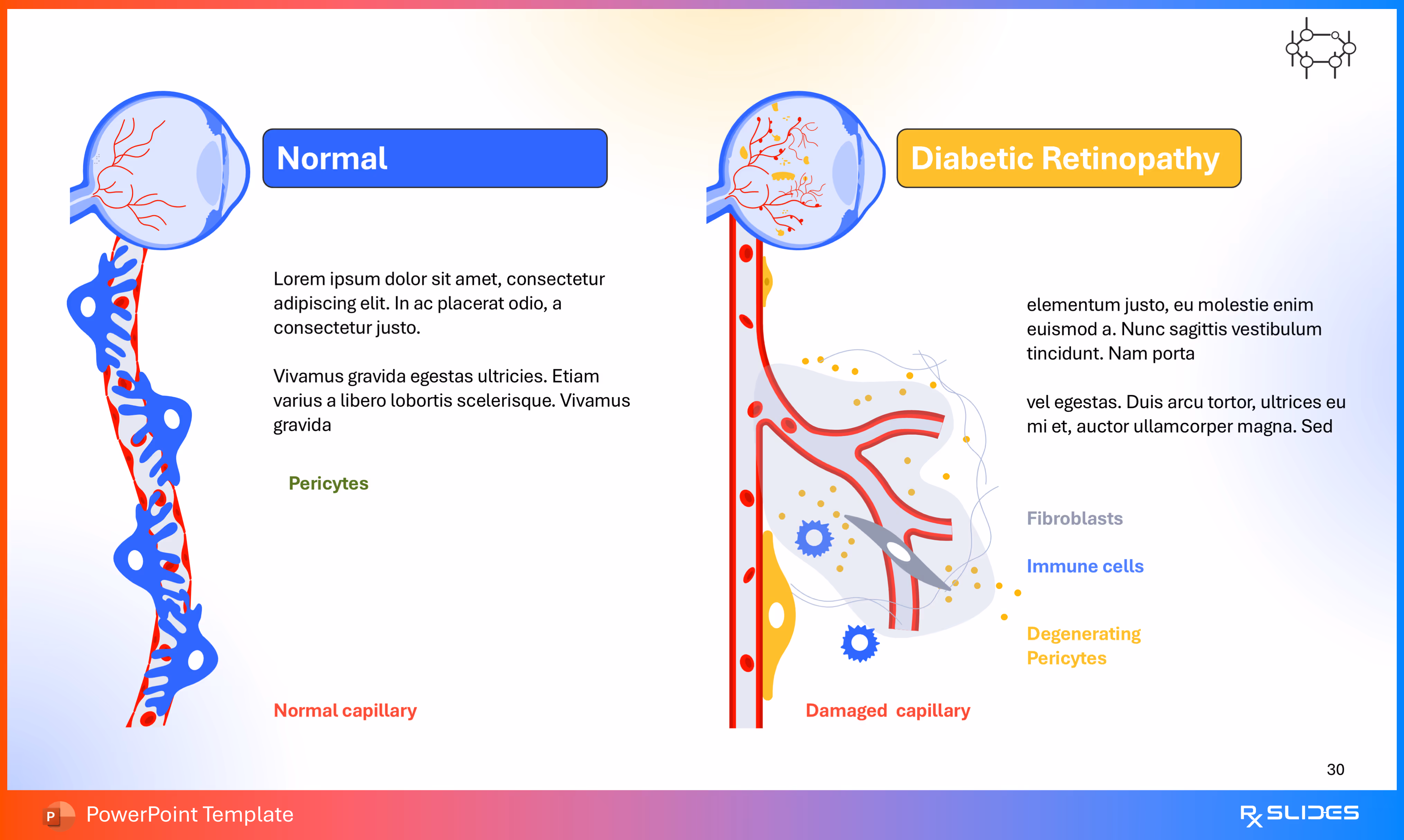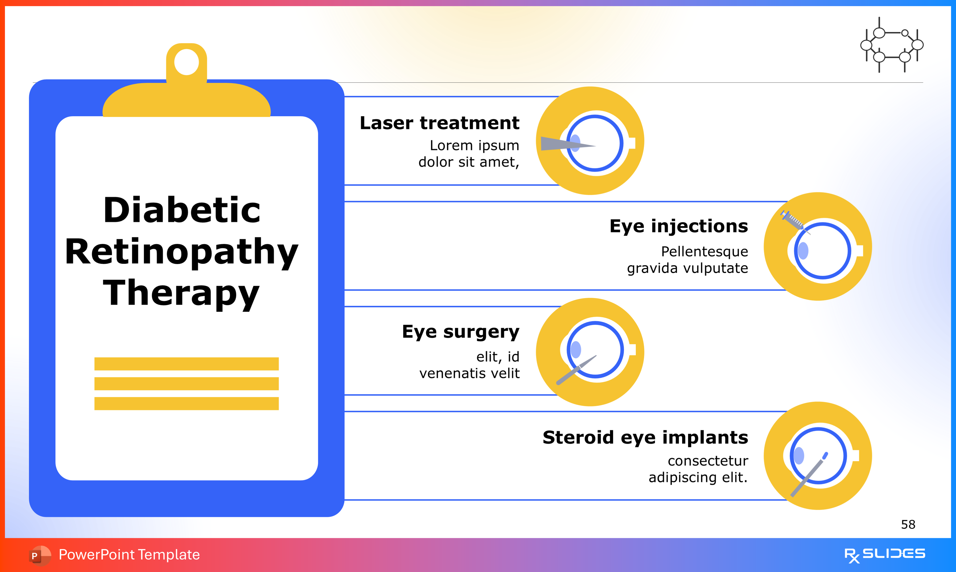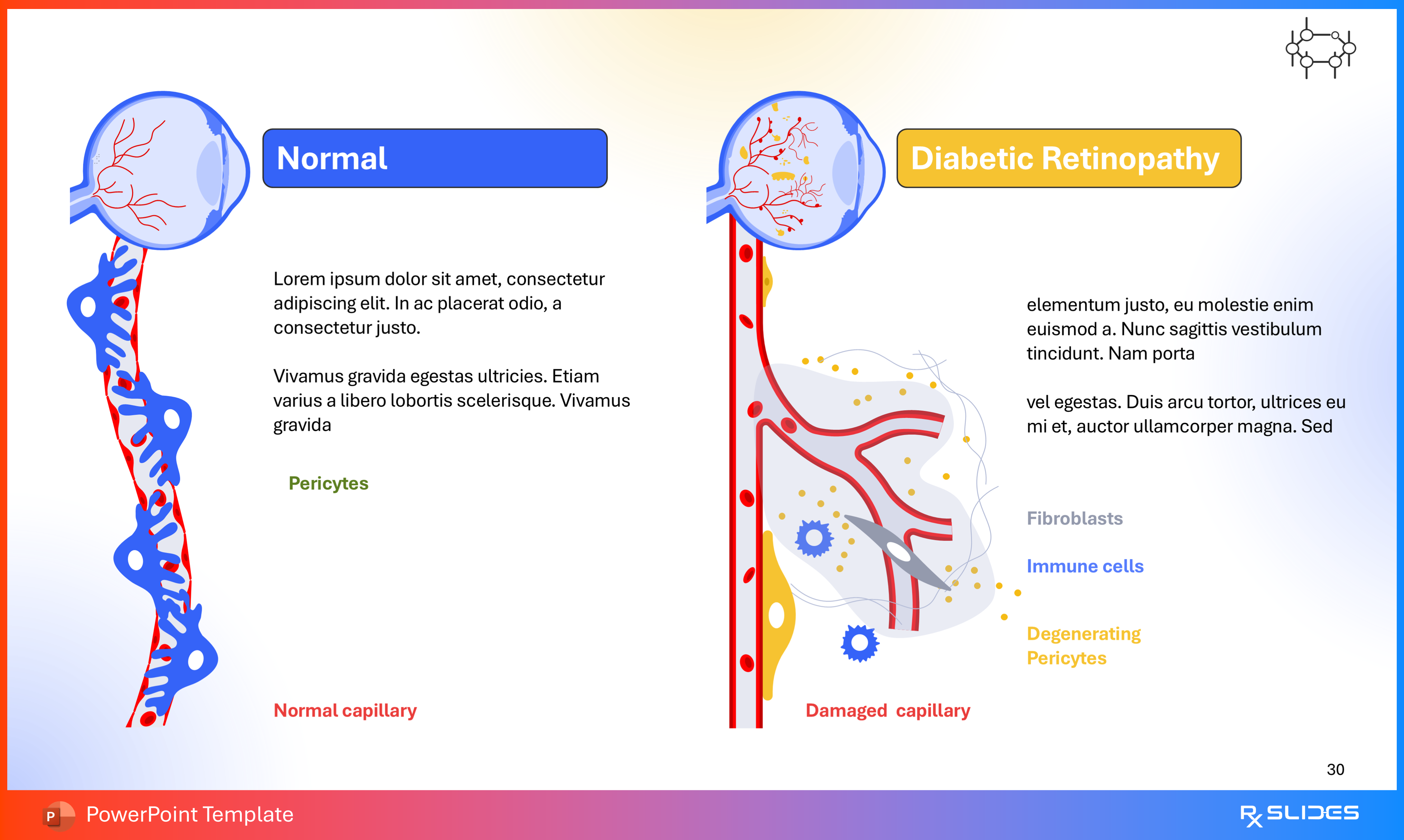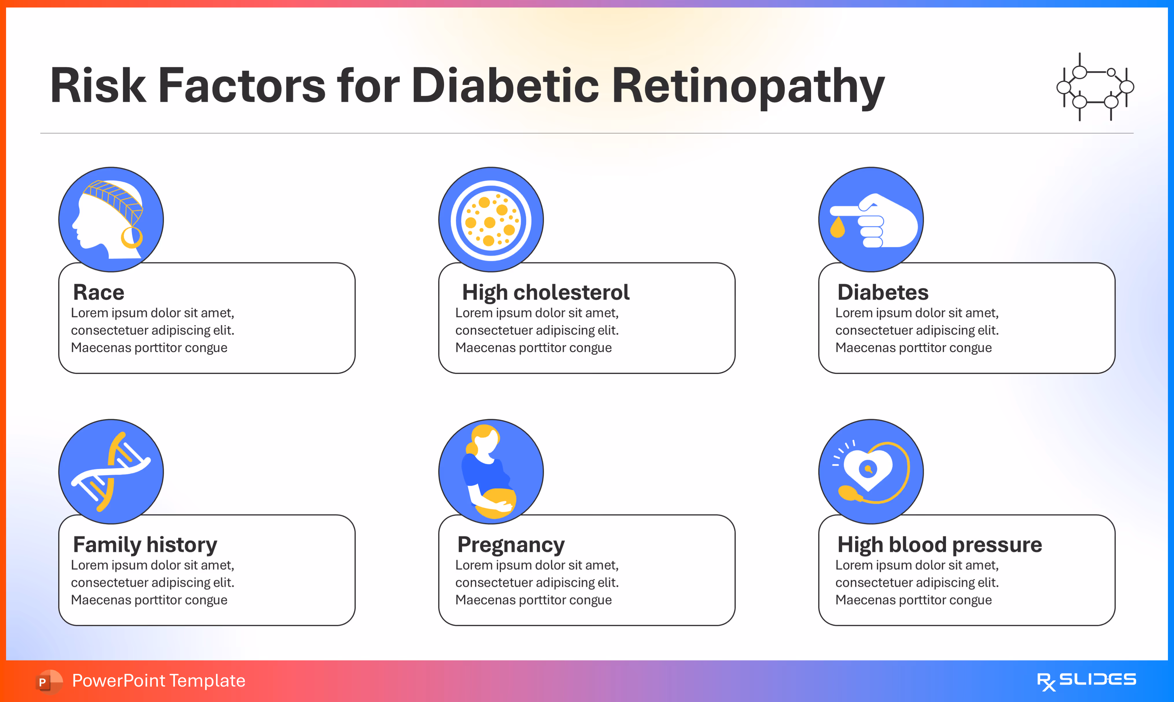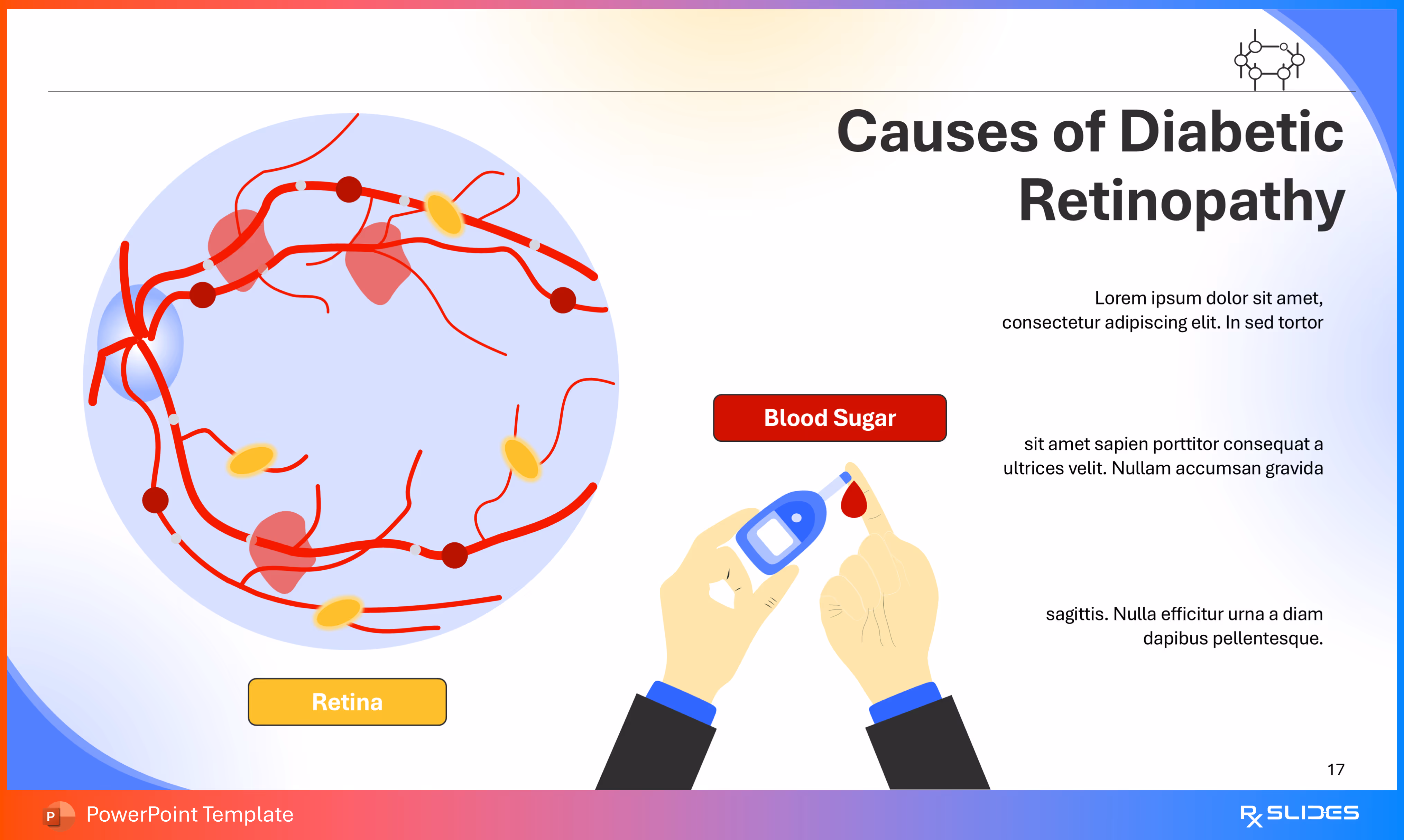 RxSlides presents a Diabetic Retinopathy PPT template to uncover the complexity of this topic in a straightforward, visually appealing way with the help of engaging animations.