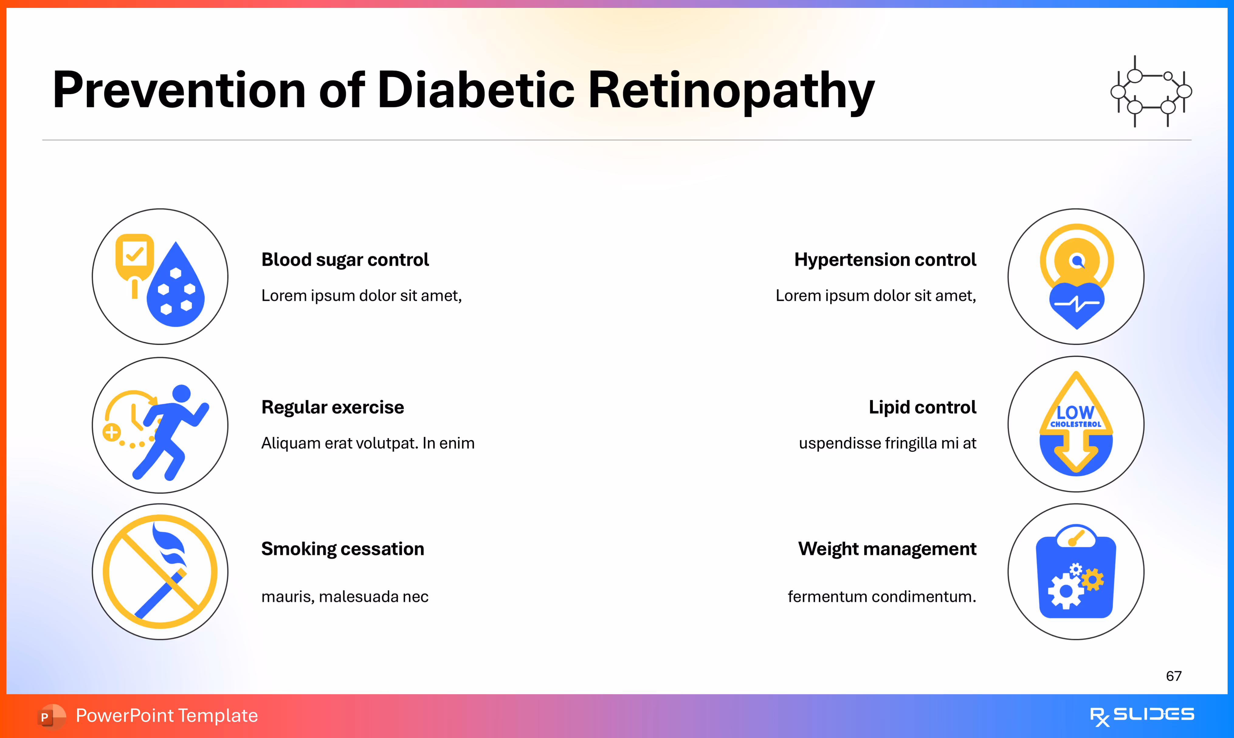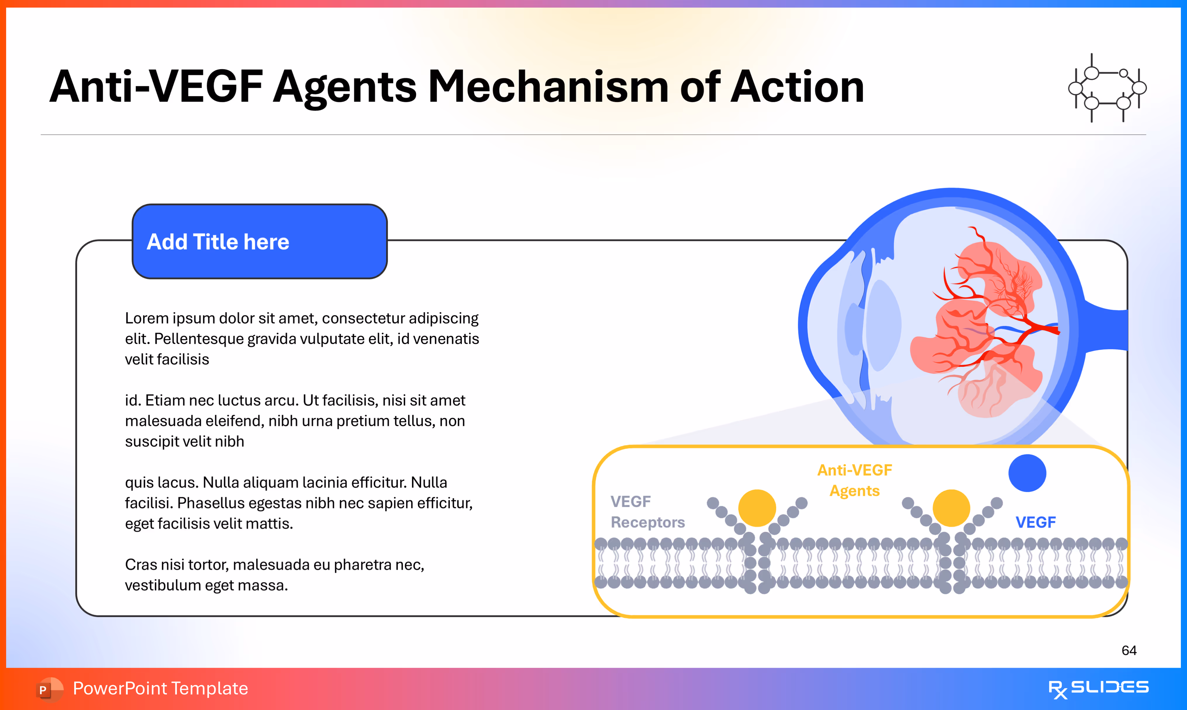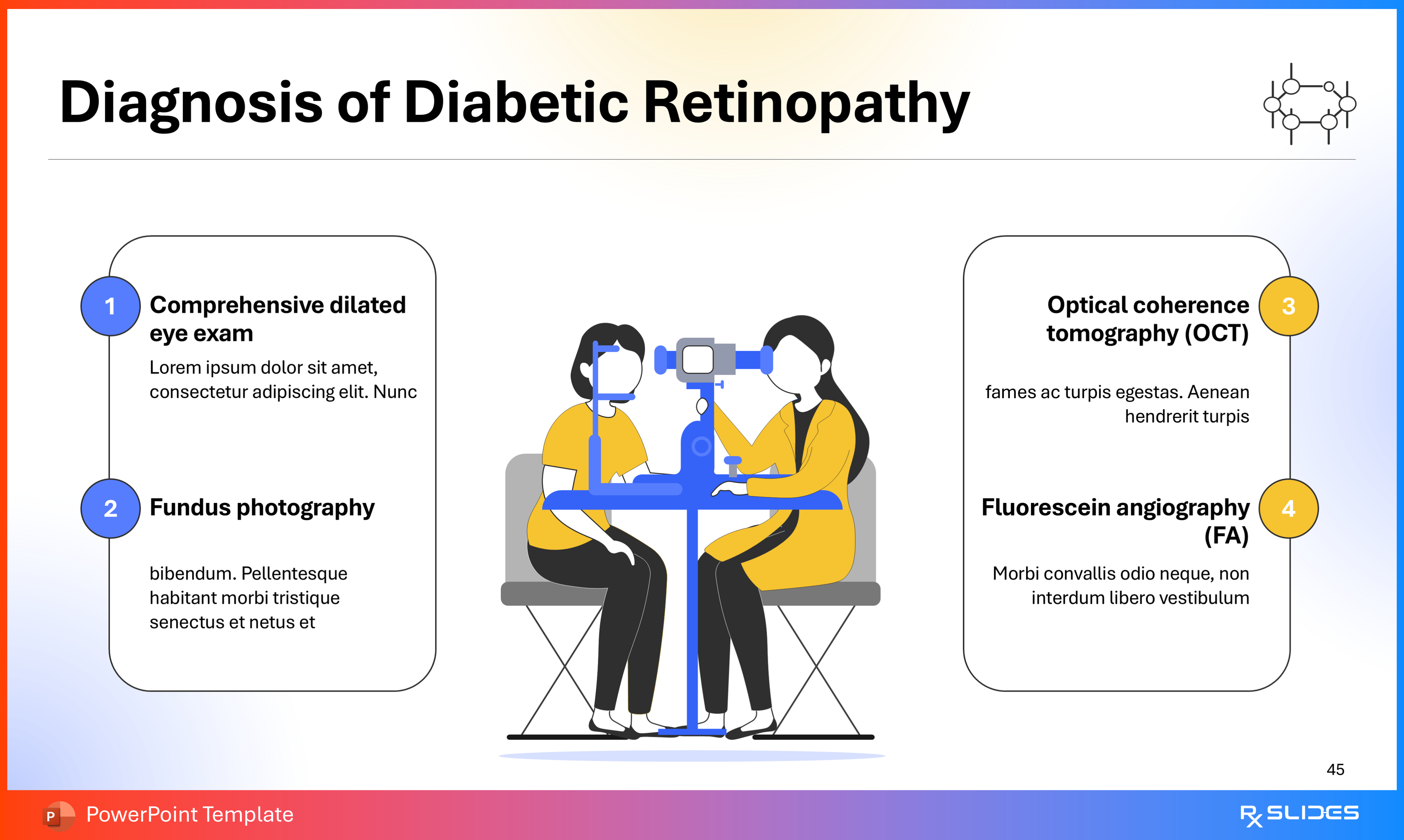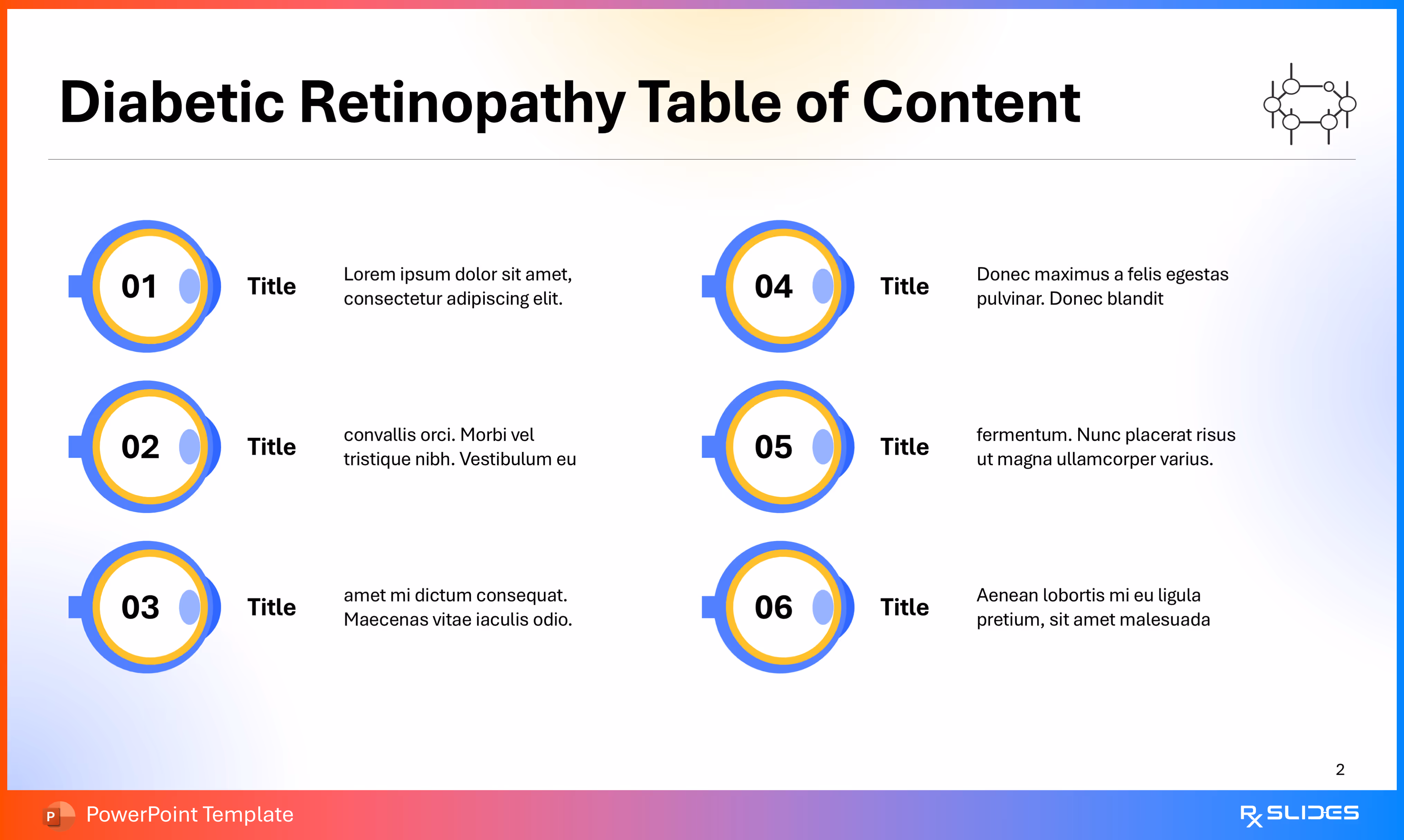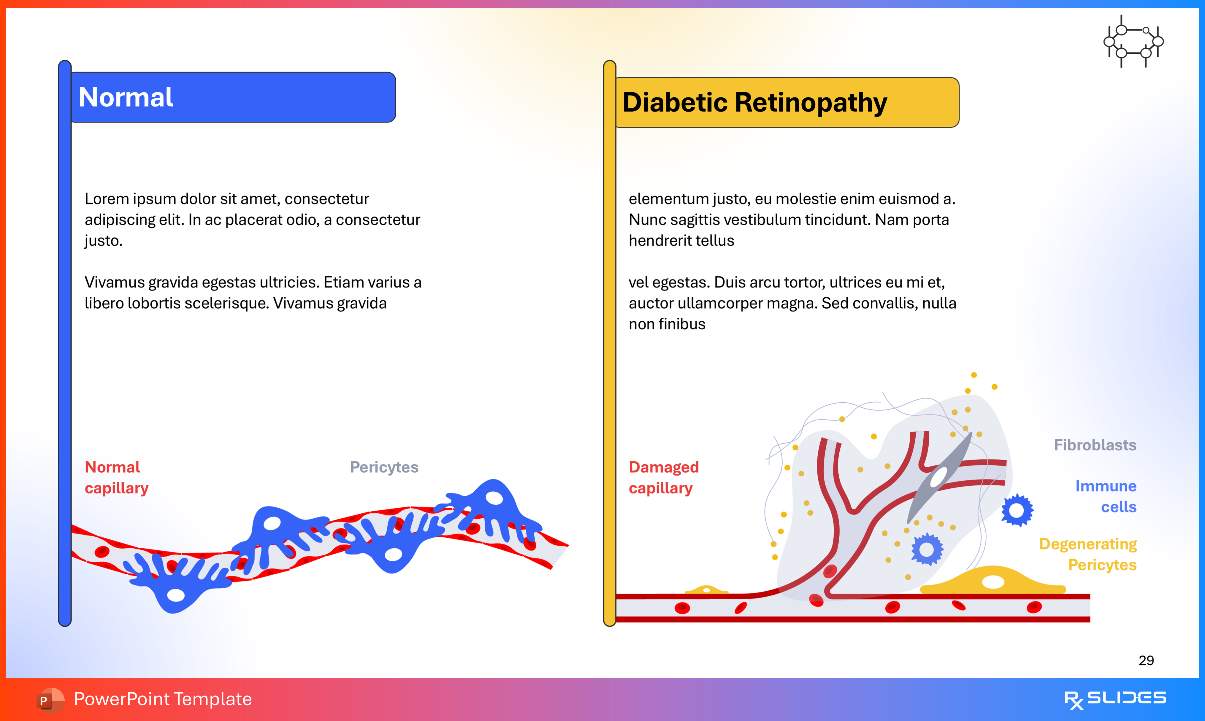 RxSlides presents a Diabetic Retinopathy PPT template to uncover the complexity of this topic in a straightforward, visually appealing way with the help of engaging animations.