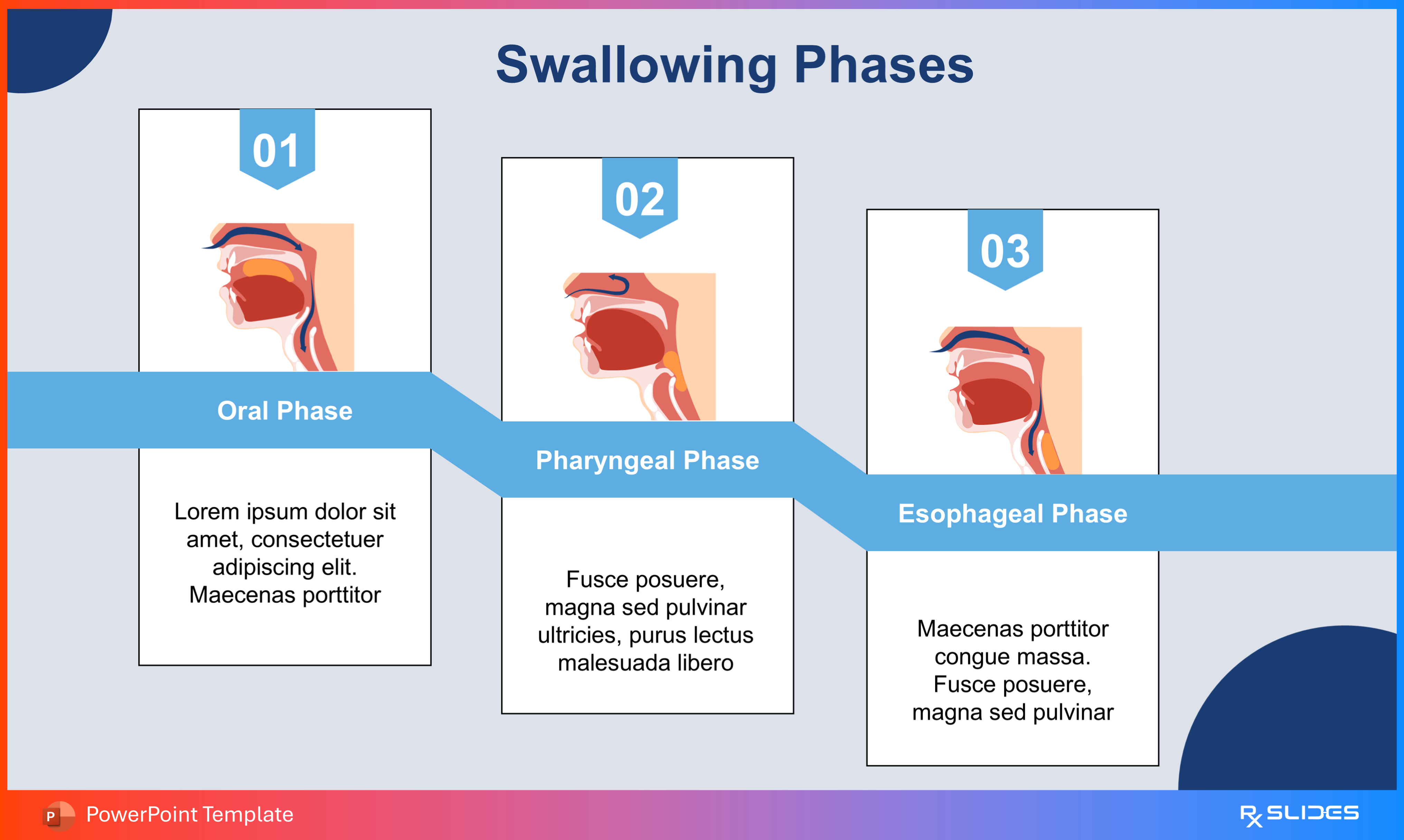 This slide shows sequential timeline to clearly explain the three distinct Swallowing Phases: Oral, Pharyngeal, and Esophageal.