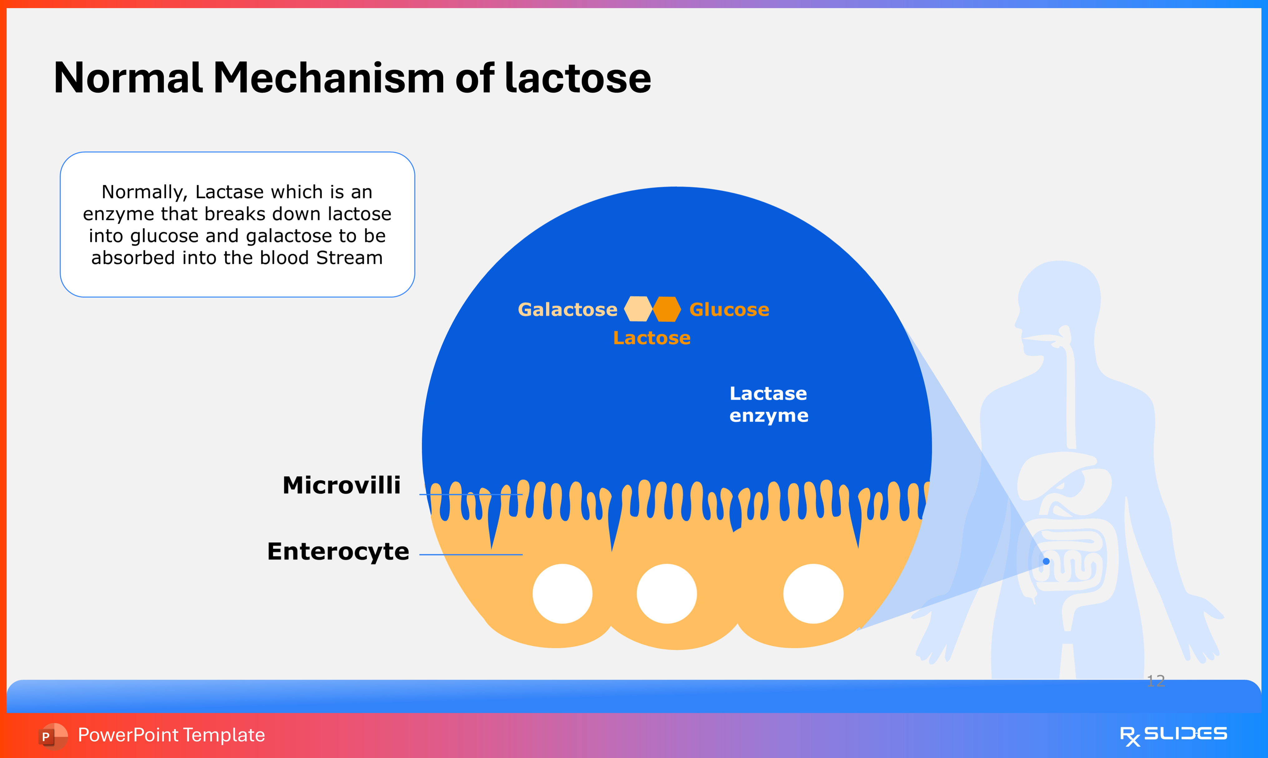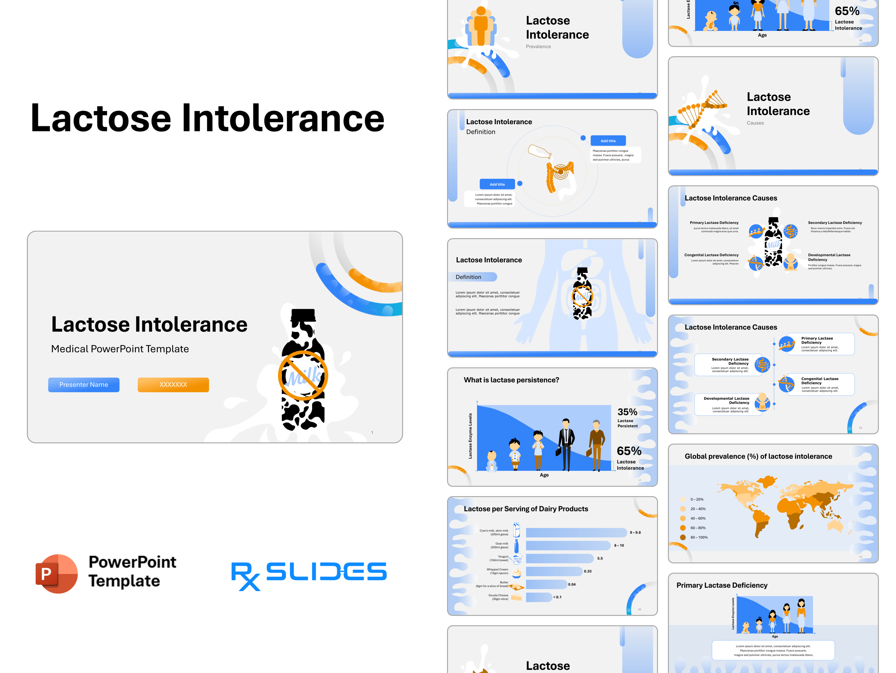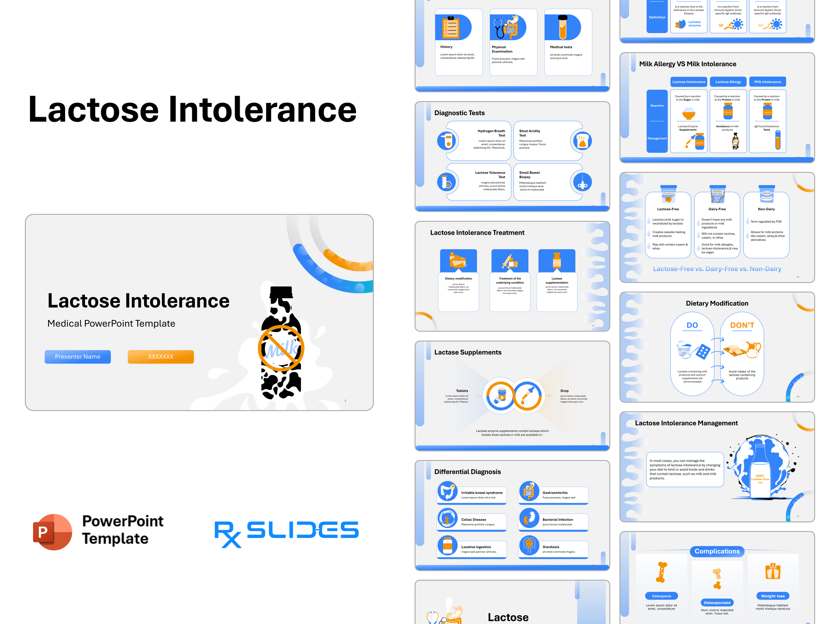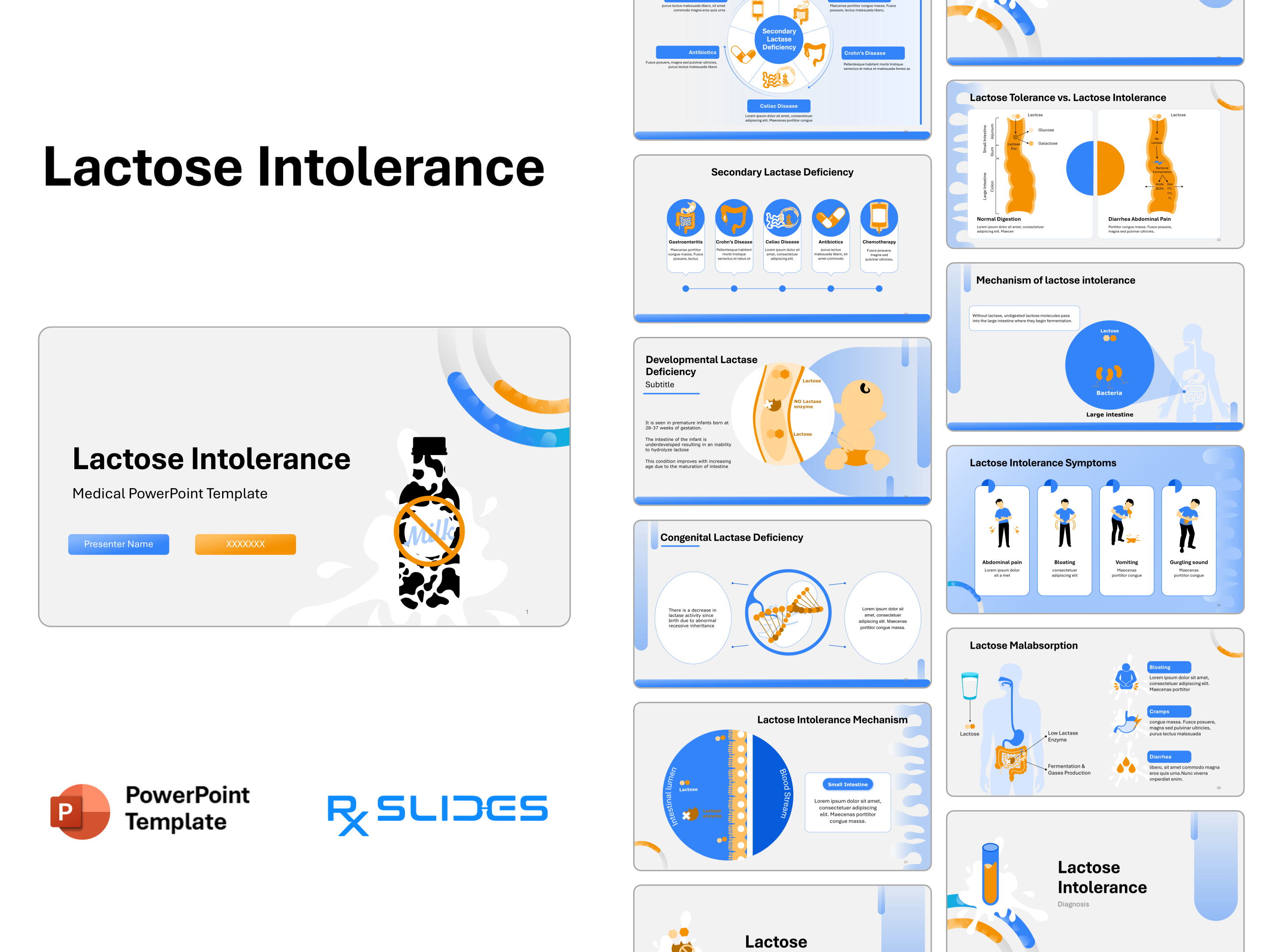 Master the explanation of digestive health with this comprehensive, 53-slide PowerPoint template on lactose intolerance Designed for gastroenterologists, nutritionists, and health educators, this deck bridges the gap between complex biochemistry and practical patient care. It offers a complete narrative arc—starting from the molecular structure of lactose and the physiology of the lactase enzyme, moving through pathophysiology and global prevalence, and concluding with diagnosis and dietary management. Featuring clear metabolic pathways, anatomical cross-sections, and intuitive iconography, this template is the ultimate tool for clinical reviews and patient education.