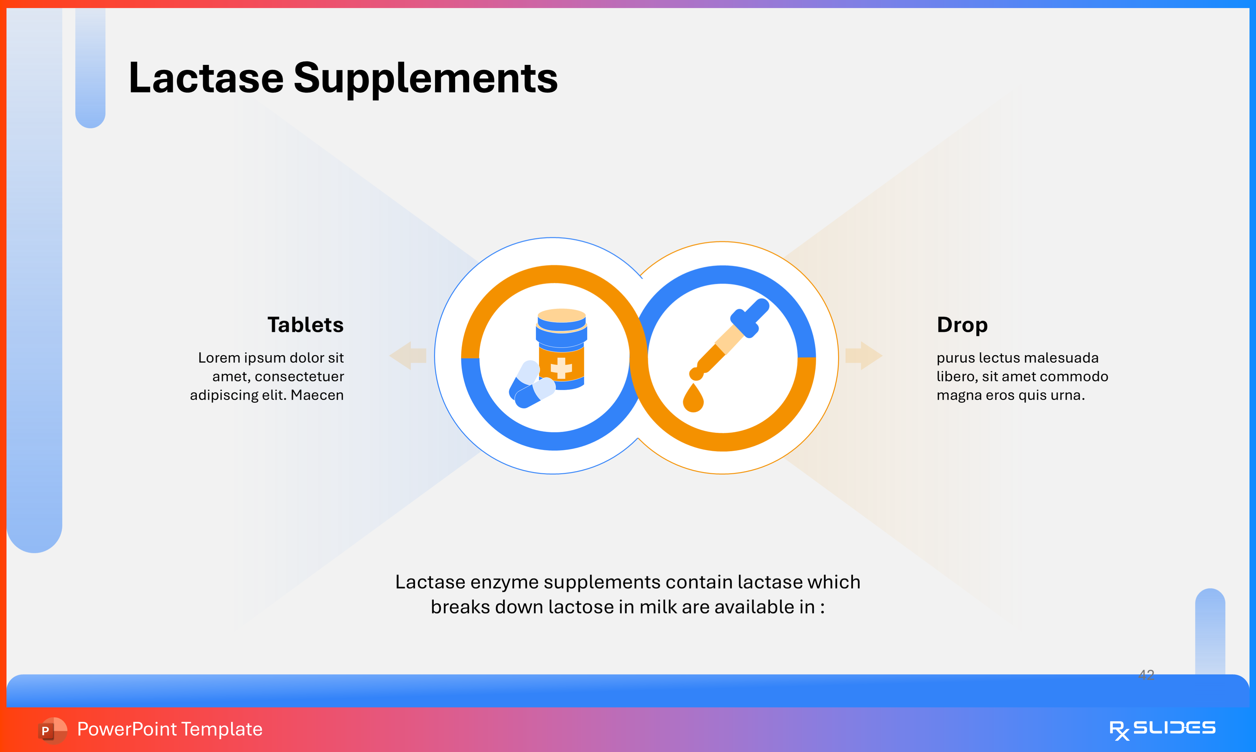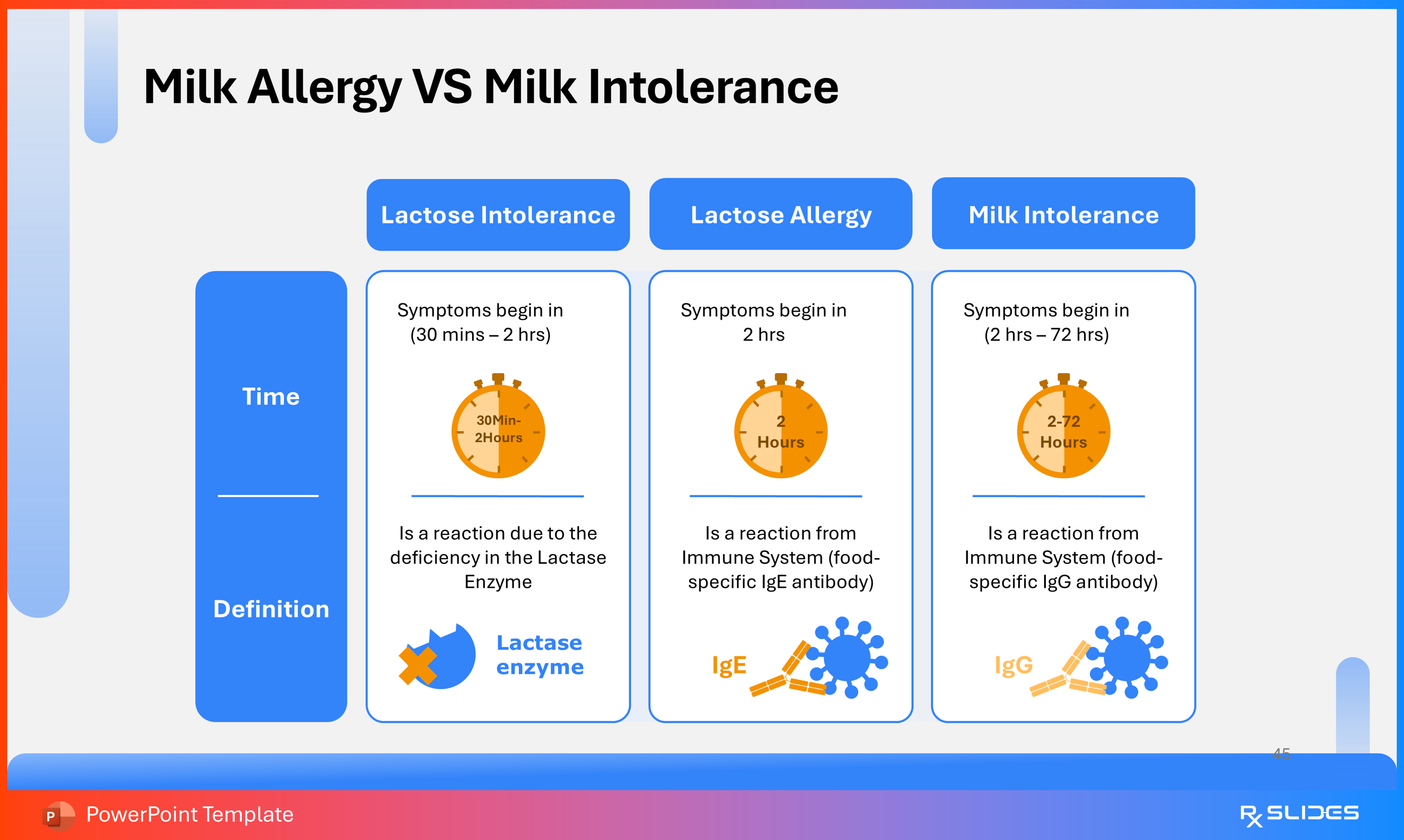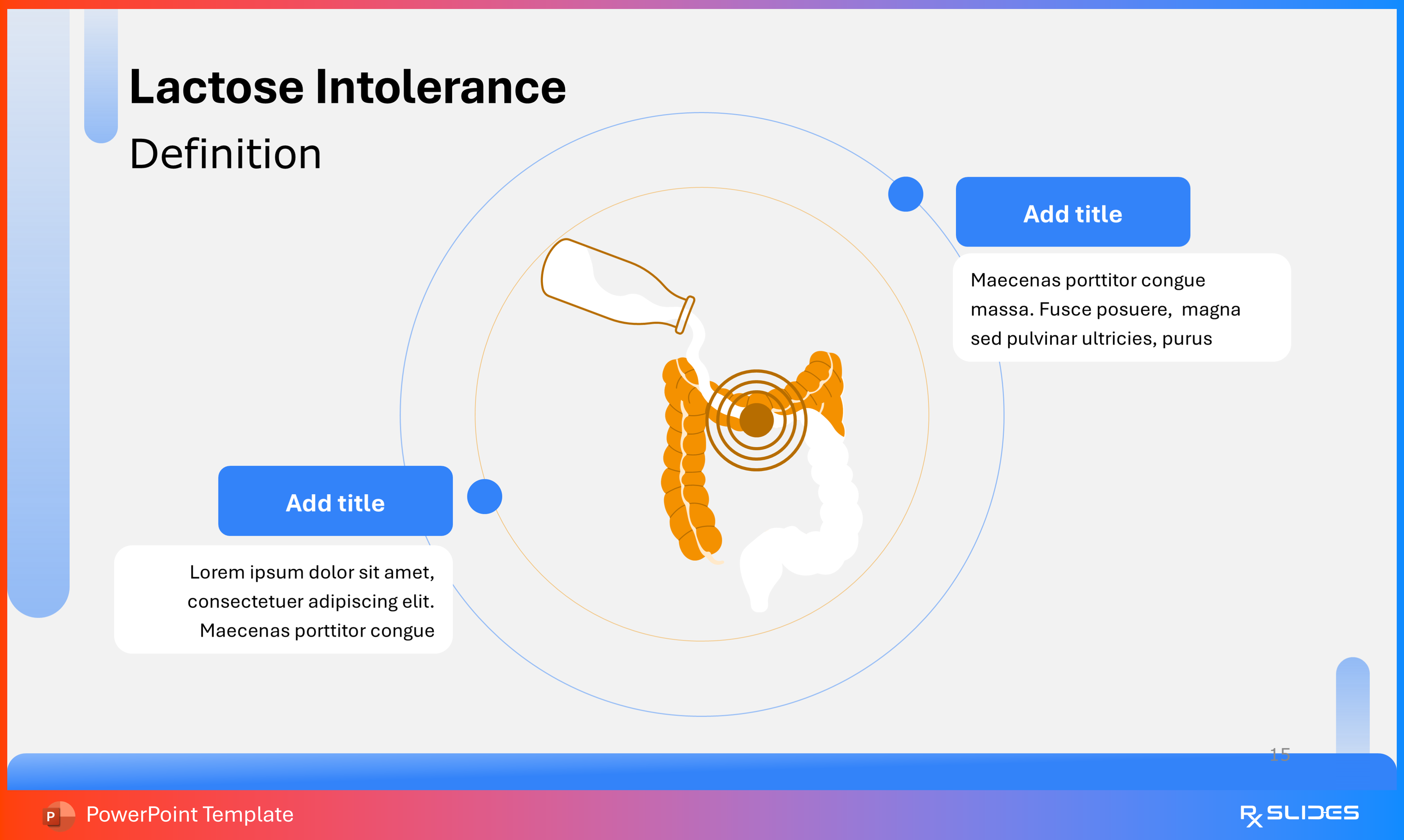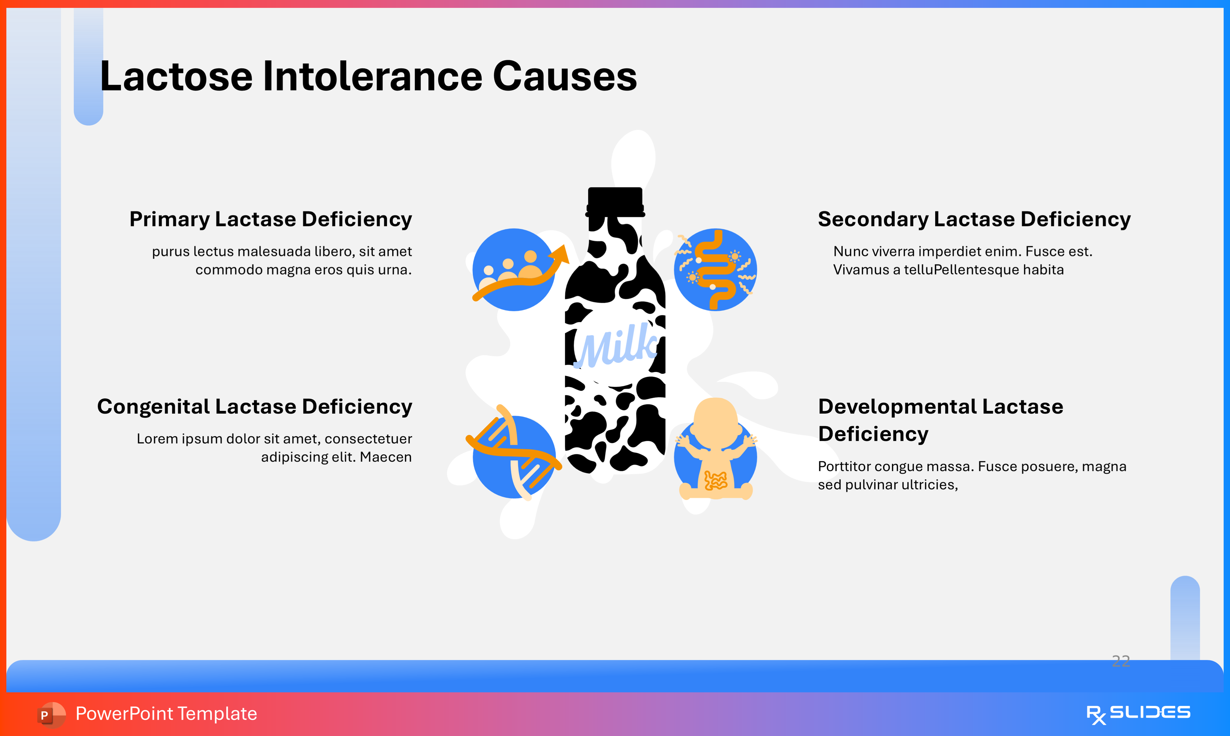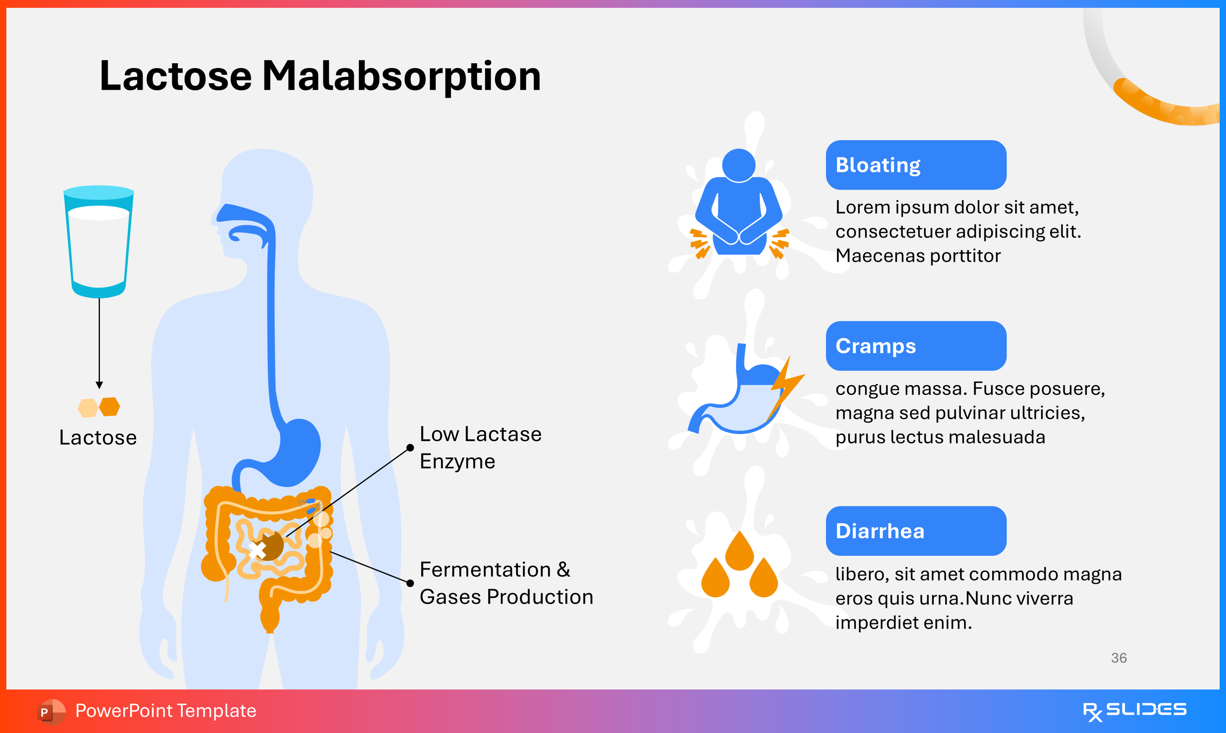 Master the explanation of digestive health with this comprehensive, 53-slide PowerPoint template on lactose intolerance Designed for gastroenterologists, nutritionists, and health educators, this deck bridges the gap between complex biochemistry and practical patient care. It offers a complete narrative arc—starting from the molecular structure of lactose and the physiology of the lactase enzyme, moving through pathophysiology and global prevalence, and concluding with diagnosis and dietary management. Featuring clear metabolic pathways, anatomical cross-sections, and intuitive iconography, this template is the ultimate tool for clinical reviews and patient education.