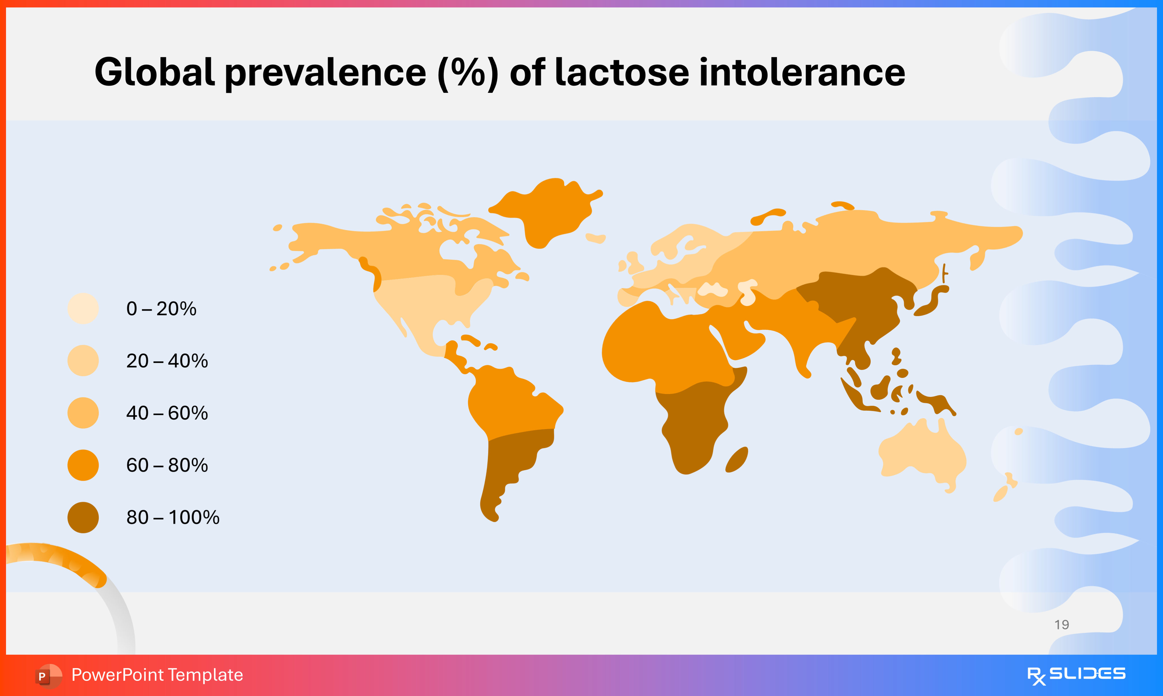 A high-value data visualization showing the percentage of lactose intolerance across continents. The color-coded legend allows the audience to instantly compare low-prevalence regions with high-risk populations (80–100%).