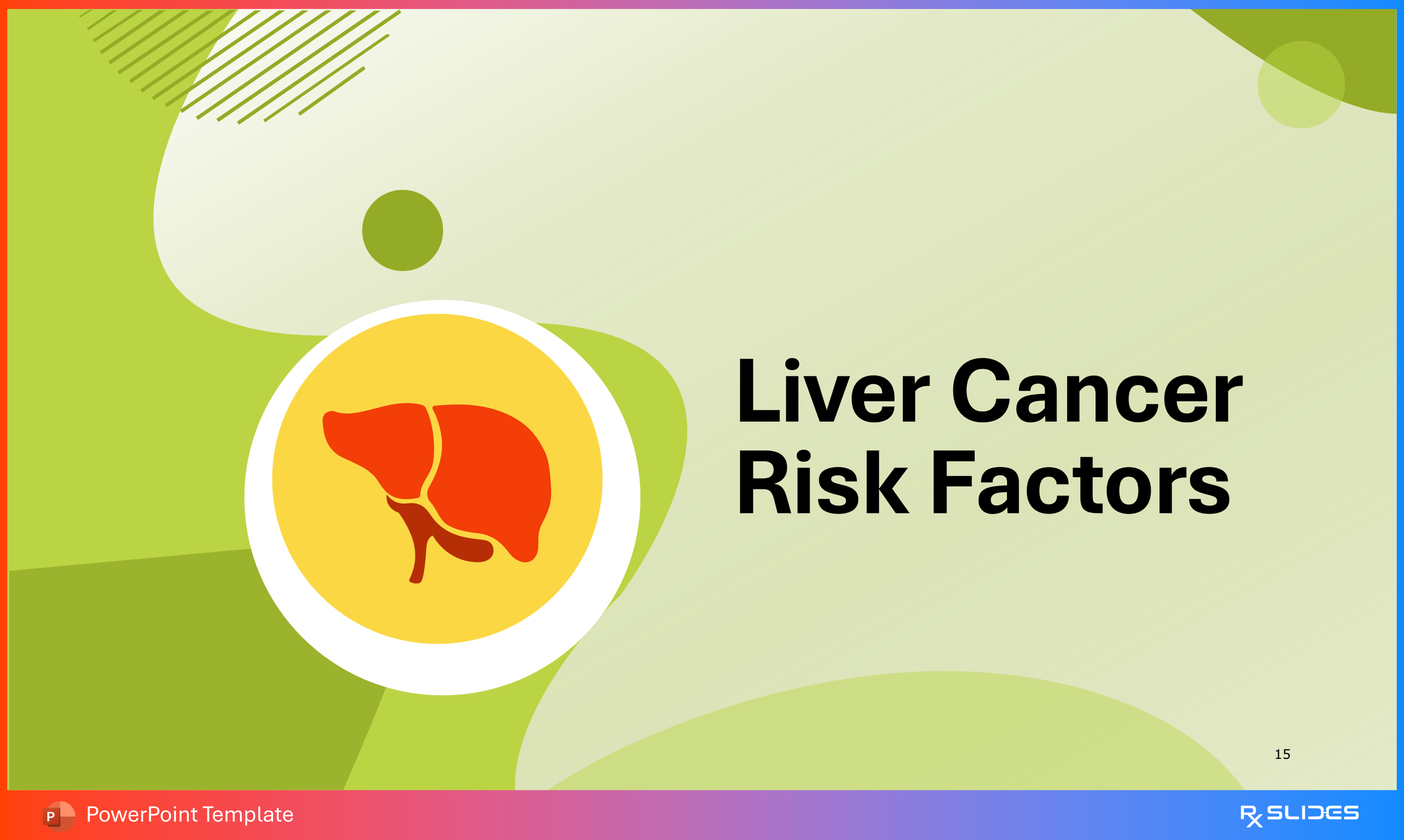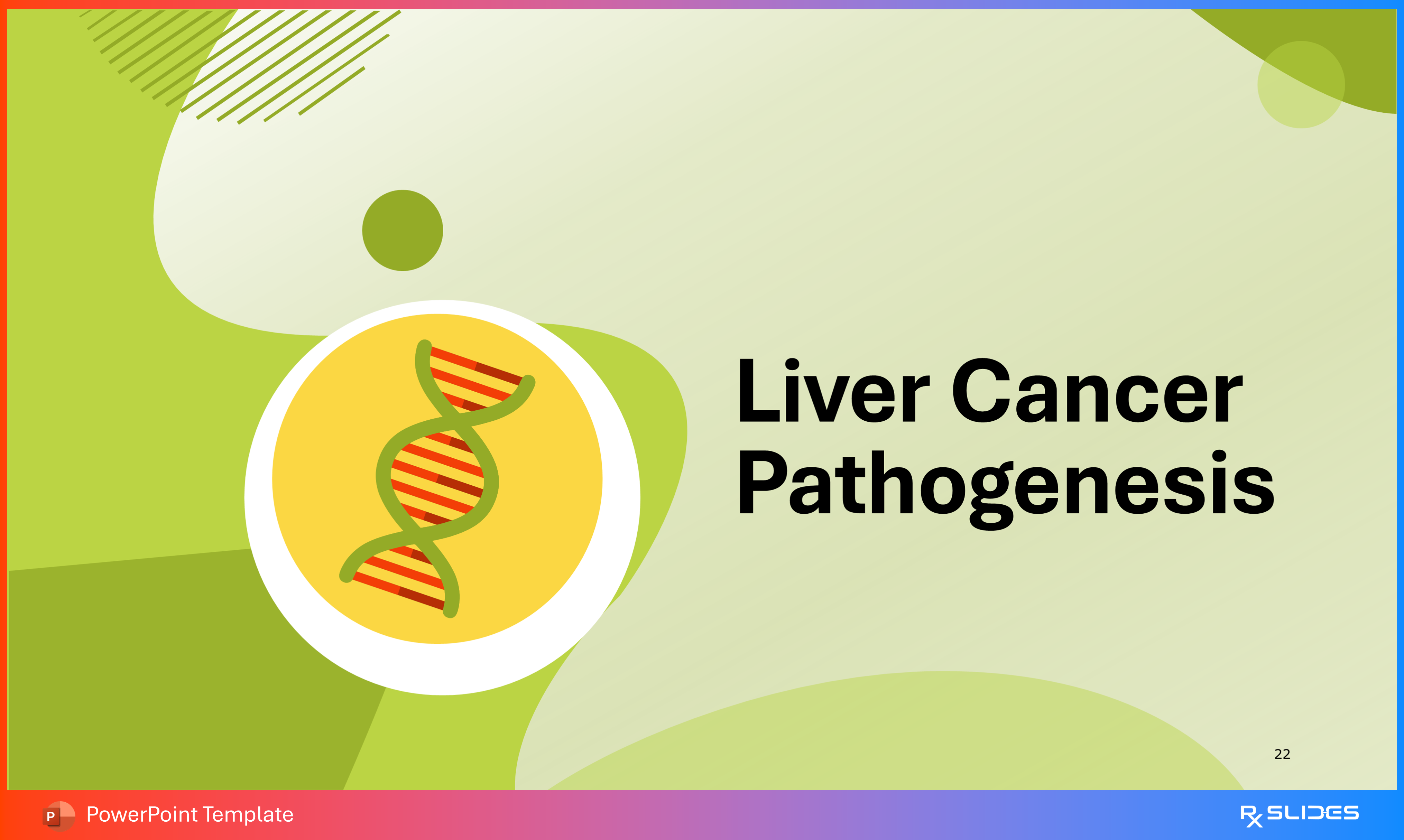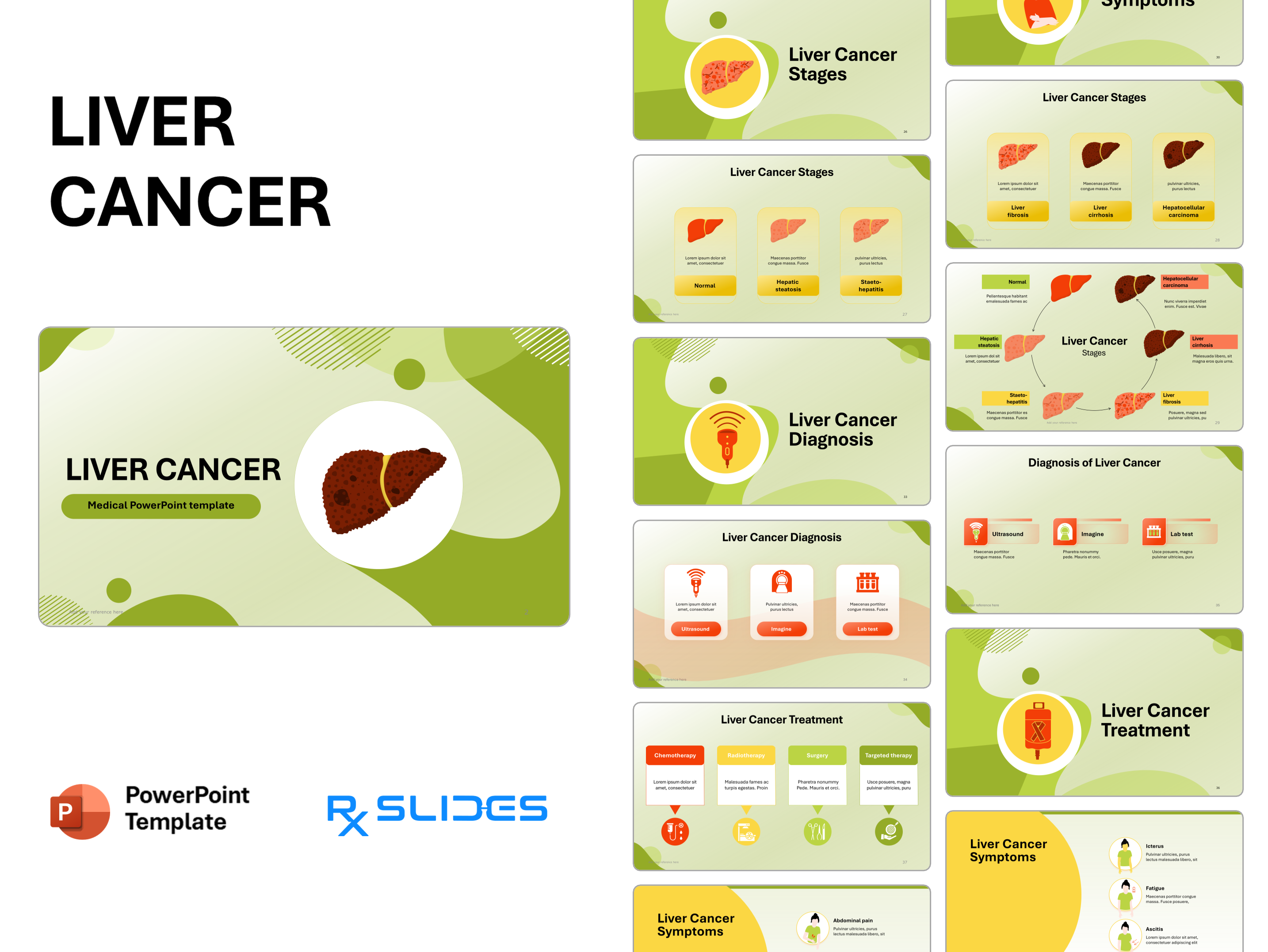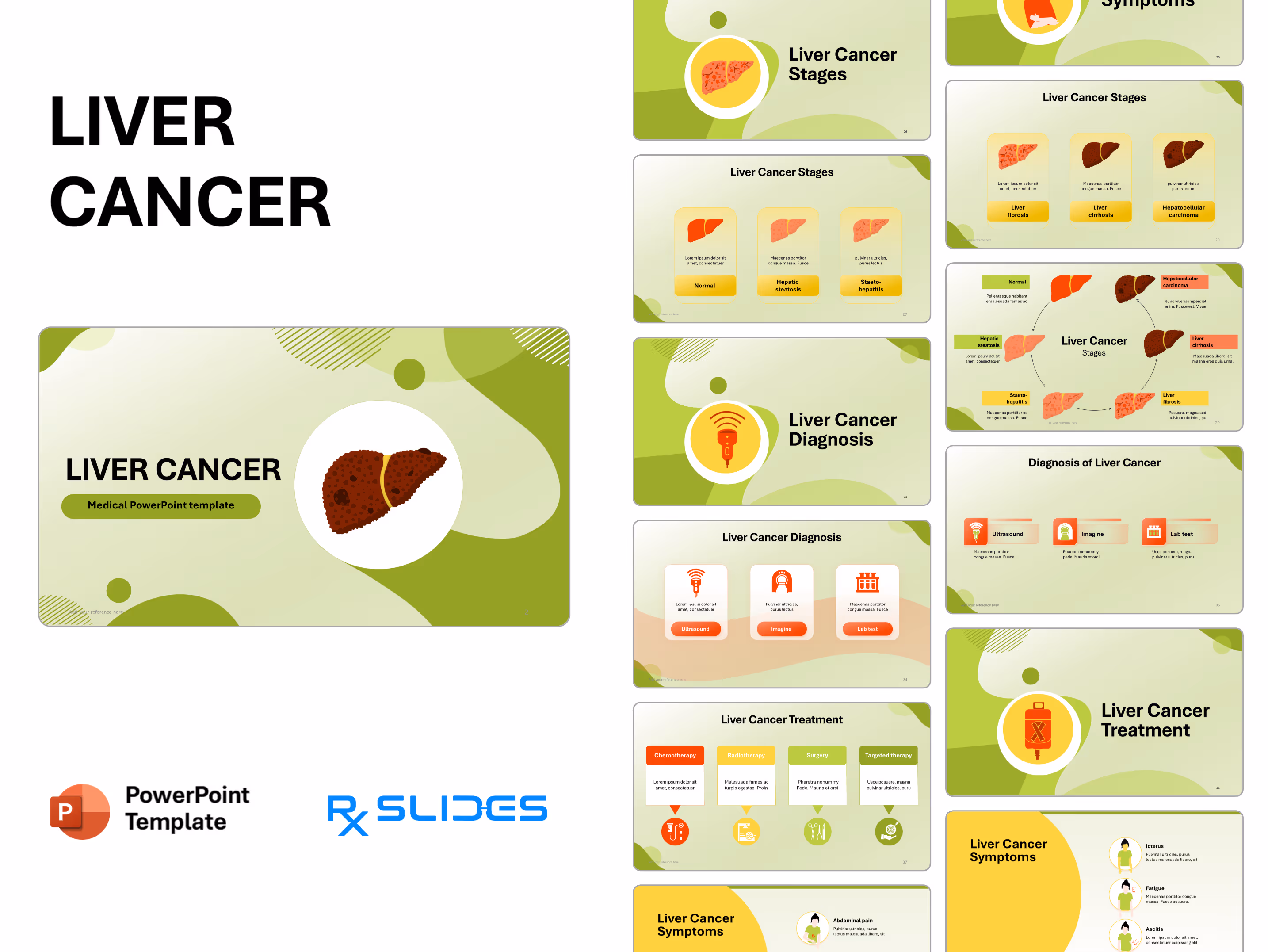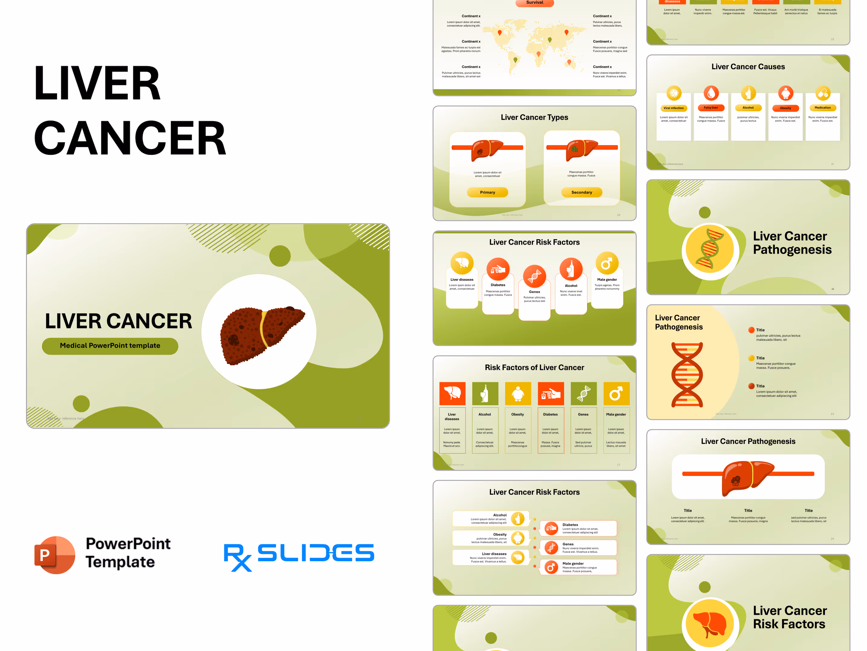 Liver Cancer PowerPoint Template This liver cancer PowerPoint template is a professional, fully editable medical presentation designed for oncologists, hepatologists, and medical educators. This Hepatic Cancer PPT Template has organized slides that explain the anatomy, causes, diagnosis, and treatment, blending accurate science with clear visuals. Ideal for academic lectures, research conferences, or clinical teaching. Key Features Covers the full spectrum: liver anatomy, physiology, epidemiology, pathogenesis, staging, diagnosis, treatment, and follow-up. Professional visuals, including labeled diagrams, infographics, and data charts that enhance audience engagement. The layouts are both editable and adaptable. Works seamlessly with both PowerPoint and Google Slides. Liver Cancer PowerPoint Presentation Template Content Slide 1 - Title Slide Title Slide Clean, medical-themed opening slide with space for presentation title, presenter name, institution, and references. Sets a professional tone for academic or conference sessions. Slide 2 - First Presenter Layout First Presenter Layout Secondary title format allowing alternate logo placement or subtitle lines. Ideal for co-authors or departmental adaptations. Slide 3 - Title Variation Animated Slide Title Variation Animated Slide Third cover option for research seminars or multi-session modules, maintaining consistent brand identity across lectures. Slide 4 - Agenda Agenda Lists main presentation sections—Anatomy, Physiology, Definition, Epidemiology, Risk Factors, Pathogenesis, Diagnosis, Treatment, and Follow-up—to guide audience expectations. Slide 5 - Agenda using liver as bullets Agenda using liver as bullets Uses stylized liver vectors for bullet points, making this layout suitable for adaptation in other hepatic cancer PowerPoint presentations or any liver disease. Slide 6 - Liver Anatomy Section Divider Liver Anatomy Section Divider Transition slide introducing the Anatomy segment with a clean background and strong title emphasis to mark the new section. Slide 7 - Liver Anatomy (Animated Detailed Layout) Liver Anatomy (Animated Detailed Layout) Illustrated diagram labeling key hepatic structures: portal vein, hepatic artery, bile ducts, falciform ligament, diaphragm, and hepatic veins. Supports anatomical orientation before pathology discussion. Slide 8 - Liver Anatomy (Labeled Diagram with Notes) Liver Anatomy (Labeled Diagram with Notes) Expanded visual with editable labels and text boxes for structural annotation—ideal for explaining vascular or biliary pathways. Slide 9 - Liver Physiology Liver Physiology Infographic layout summarizing liver functions: metabolism, detoxification, synthesis, and bile secretion. Editable fields and directional arrows enhance conceptual flow. Slide 10 - Liver Cancer Definition – Section Divider Liver Cancer Definition – Section Divider Marks the start of the Definition and Disease Overview section, maintaining visual continuity and guiding the audience into clinical content. Slide 11 - Liver Cancer Definition Liver Cancer Definition Allows differentiation between primary hepatic malignancies and secondary metastatic lesions. Clean typography and structured text areas enable easy customization to WHO or institutional standards. Slide 12 - Liver Cancer Definition (Animated View) Liver Cancer Definition (Animated View) Animated variant for progressive content reveal. Enhances engagement during lectures explaining disease classification or histologic criteria. Slide 13 - Liver Cancer Epidemiology (Section Divider) Liver Cancer Epidemiology (Section Divider) A visual divider introducing the Epidemiology section, preparing the audience for incidence, prevalence, and survival data. Slide 14 - Liver Cancer Epidemiology & Survival Liver Cancer Epidemiology & Survival Data-driven slide summarizing global and regional incidence, prevalence, and survival rates. Includes editable maps for easy customization. Slide 15 - Liver Cancer Risk Factors (Section Divider) Liver Cancer Risk Factors (Section Divider) Streamlined transitional slide introducing the Risk Factors Part from epidemiologic data to general-level determinants. Slide 16 - Liver Cancer Risk Factors Liver Cancer Risk Factors Introduces the main risk categories contributing to liver cancer, designed for concise overviews in clinical or academic settings. Slide 17 - Risk Factors of Liver Cancer Risk Factors of Liver Cancer Details specific etiologic contributors such as liver diseases, obesity, alcohol use, genetic predisposition, and gender. The clear layout supports quick visual recognition of modifiable vs. non-modifiable risks. Slide 18 - Liver Cancer Risk Factors (Alternate Layout) Liver Cancer Risk Factors (Alternate Layout) Infographic version for hepatic cancer, which you can use in any liver disease presentation. Slide 19 - Risk Factors of Liver Cancer (Alternate Design) Risk Factors of Liver Cancer (Alternate Design) Flexible summary layout for consolidating regional or demographic data before moving to causative mechanisms. Includes editable placeholders for institutional notes. Slide 20 - Liver Cancer Causes (Section Divider) Liver Cancer Causes (Section Divider) A professional divider introduces the Causes and Etiology segment, marking the transition from population-level risks to mechanistic insights. Slide 21 - Liver Cancer Causes Liver Cancer Causes Infographic summarizing principal causes such as viral infections, fatty liver, alcohol, obesity, and medications. Fully editable and visually balanced. Slide 22 – Liver Cancer Pathogenesis (Section Divider) Liver Cancer Pathogenesis (Section Divider) Clean divider marking the transition to the Pathogenesis segment. Features a bold, stylized DNA helix icon set against a modern gradient background. Slide 23 - Liver Cancer Pathogenesis (Cellular/Histologic View) Liver Cancer Pathogenesis (Cellular/Histologic View) Animated visual illustrating cellular transformation and neoplastic 