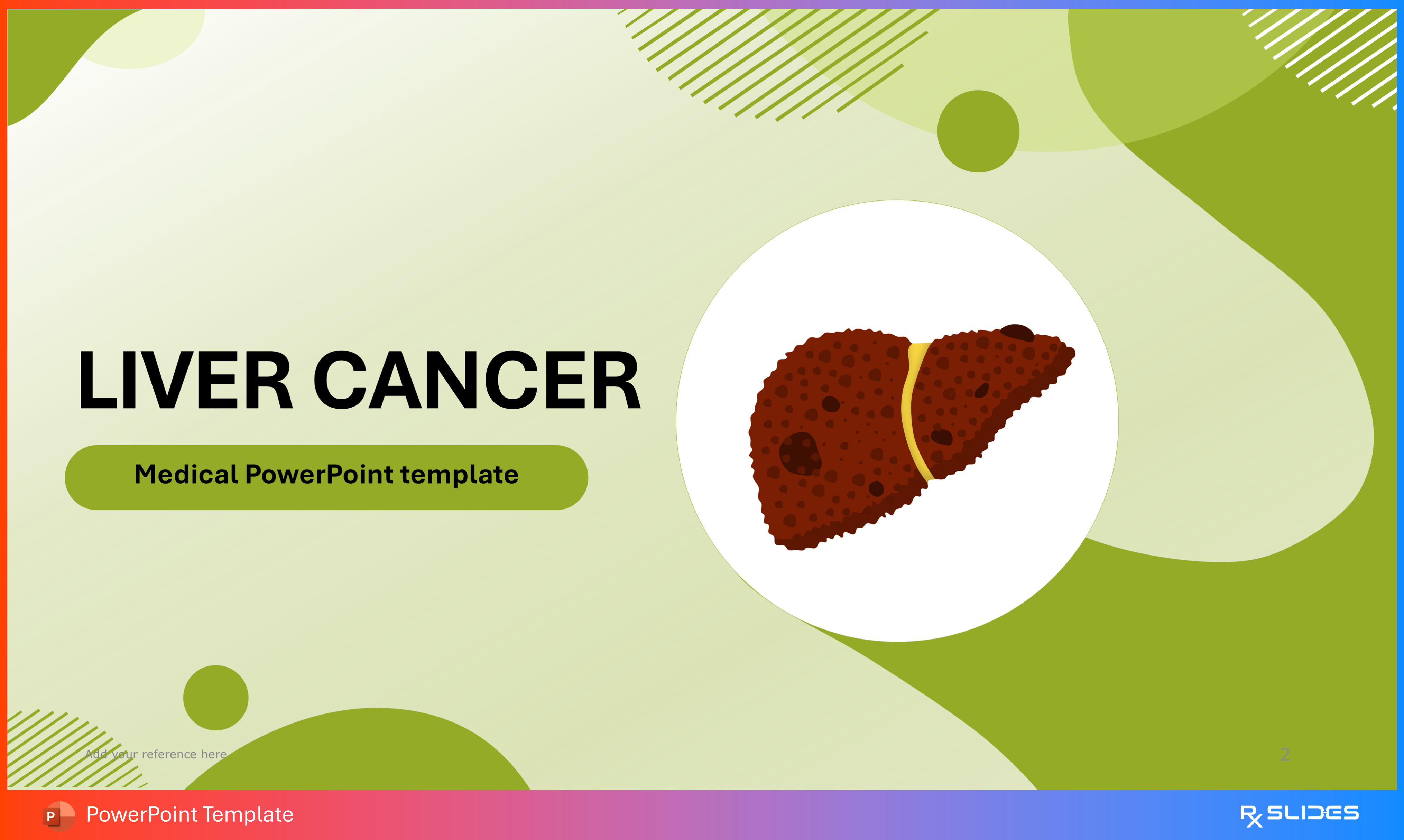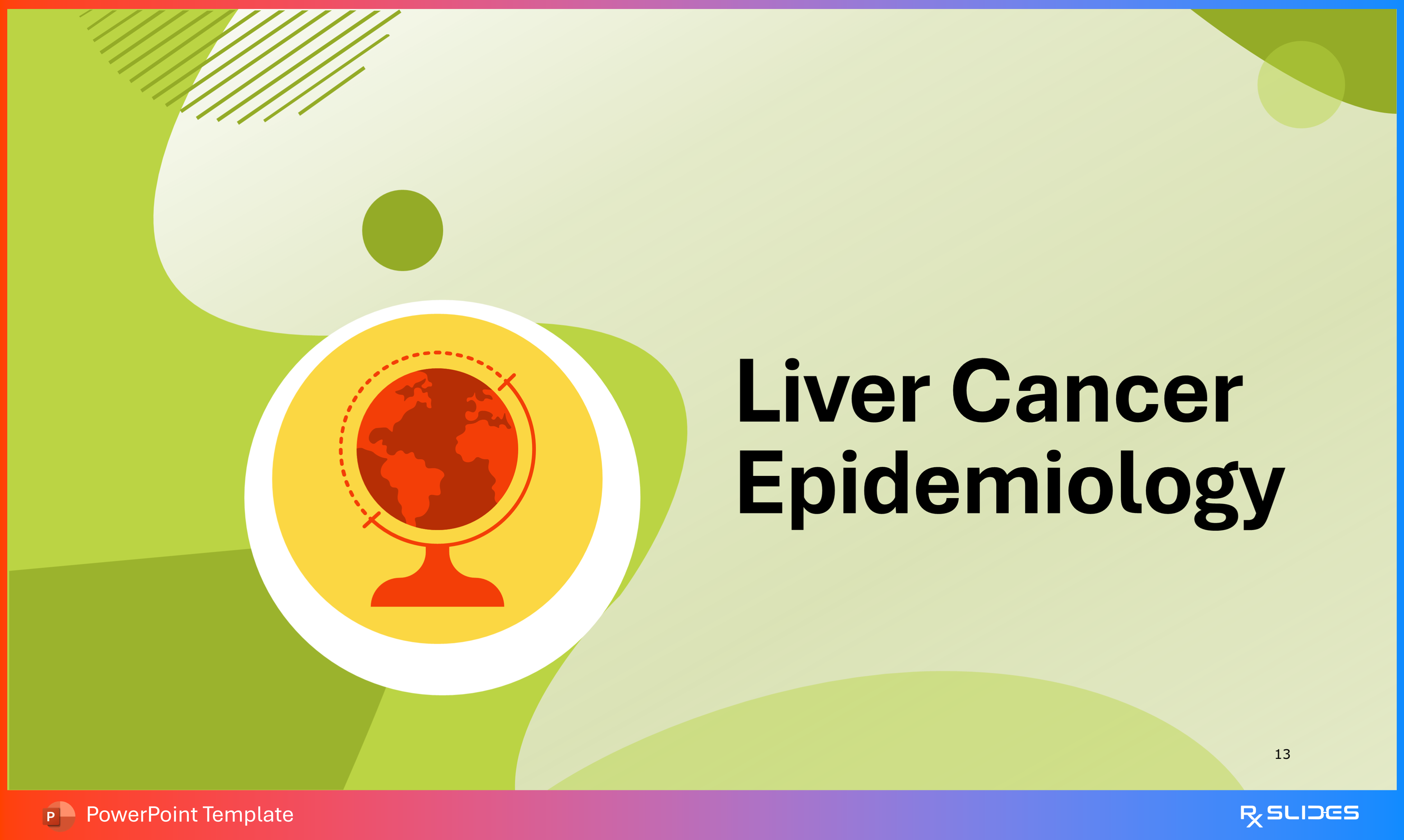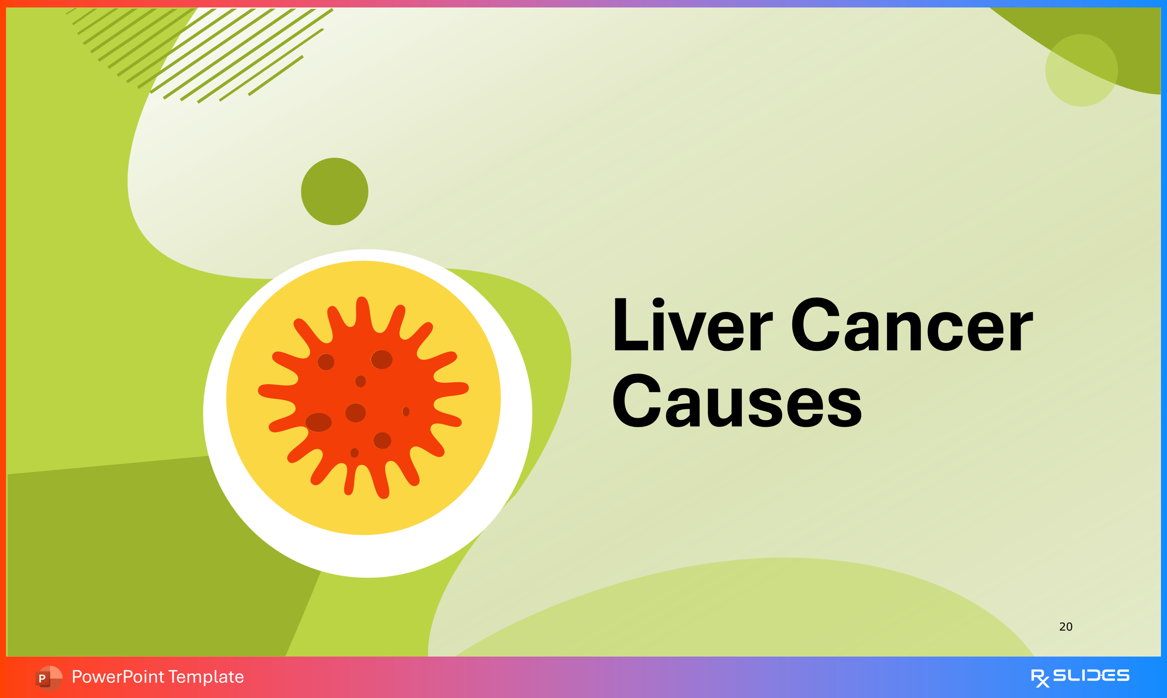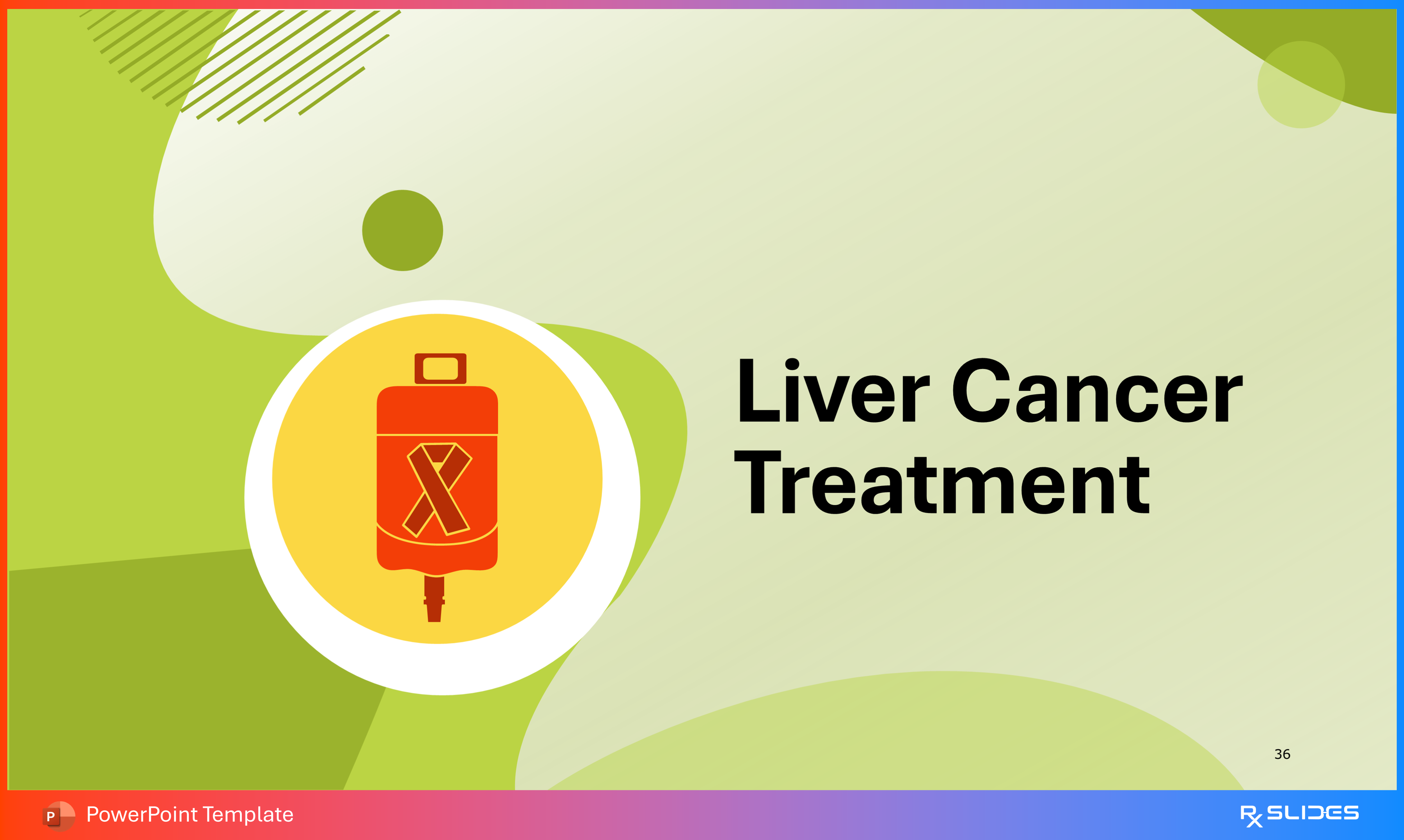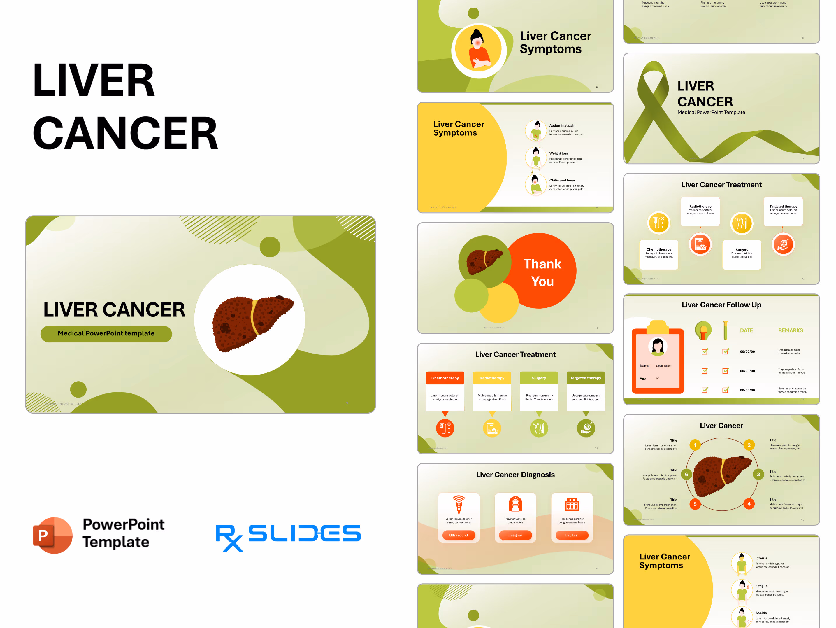 Liver Cancer PowerPoint Template This liver cancer PowerPoint template is a professional, fully editable medical presentation designed for oncologists, hepatologists, and medical educators. This Hepatic Cancer PPT Template has organized slides that explain the anatomy, causes, diagnosis, and treatment, blending accurate science with clear visuals. Ideal for academic lectures, research conferences, or clinical teaching. Key Features Covers the full spectrum: liver anatomy, physiology, epidemiology, pathogenesis, staging, diagnosis, treatment, and follow-up. Professional visuals, including labeled diagrams, infographics, and data charts that enhance audience engagement. The layouts are both editable and adaptable. Works seamlessly with both PowerPoint and Google Slides. Liver Cancer PowerPoint Presentation Template Content Slide 1 - Title Slide Title Slide Clean, medical-themed opening slide with space for presentation title, presenter name, institution, and references. Sets a professional tone for academic or conference sessions. Slide 2 - First Presenter Layout First Presenter Layout Secondary title format allowing alternate logo placement or subtitle lines. Ideal for co-authors or departmental adaptations. Slide 3 - Title Variation Animated Slide Title Variation Animated Slide Third cover option for research seminars or multi-session modules, maintaining consistent brand identity across lectures. Slide 4 - Agenda Agenda Lists main presentation sections—Anatomy, Physiology, Definition, Epidemiology, Risk Factors, Pathogenesis, Diagnosis, Treatment, and Follow-up—to guide audience expectations. Slide 5 - Agenda using liver as bullets Agenda using liver as bullets Uses stylized liver vectors for bullet points, making this layout suitable for adaptation in other hepatic cancer PowerPoint presentations or any liver disease. Slide 6 - Liver Anatomy Section Divider Liver Anatomy Section Divider Transition slide introducing the Anatomy segment with a clean background and strong title emphasis to mark the new section. Slide 7 - Liver Anatomy (Animated Detailed Layout) Liver Anatomy (Animated Detailed Layout) Illustrated diagram labeling key hepatic structures: portal vein, hepatic artery, bile ducts, falciform ligament, diaphragm, and hepatic veins. Supports anatomical orientation before pathology discussion. Slide 8 - Liver Anatomy (Labeled Diagram with Notes) Liver Anatomy (Labeled Diagram with Notes) Expanded visual with editable labels and text boxes for structural annotation—ideal for explaining vascular or biliary pathways. Slide 9 - Liver Physiology Liver Physiology Infographic layout summarizing liver functions: metabolism, detoxification, synthesis, and bile secretion. Editable fields and directional arrows enhance conceptual flow. Slide 10 - Liver Cancer Definition – Section Divider Liver Cancer Definition – Section Divider Marks the start of the Definition and Disease Overview section, maintaining visual continuity and guiding the audience into clinical content. Slide 11 - Liver Cancer Definition Liver Cancer Definition Allows differentiation between primary hepatic malignancies and secondary metastatic lesions. Clean typography and structured text areas enable easy customization to WHO or institutional standards. Slide 12 - Liver Cancer Definition (Animated View) Liver Cancer Definition (Animated View) Animated variant for progressive content reveal. Enhances engagement during lectures explaining disease classification or histologic criteria. Slide 13 - Liver Cancer Epidemiology (Section Divider) Liver Cancer Epidemiology (Section Divider) A visual divider introducing the Epidemiology section, preparing the audience for incidence, prevalence, and survival data. Slide 14 - Liver Cancer Epidemiology & Survival Liver Cancer Epidemiology & Survival Data-driven slide summarizing global and regional incidence, prevalence, and survival rates. Includes editable maps for easy customization. Slide 15 - Liver Cancer Risk Factors (Section Divider) Liver Cancer Risk Factors (Section Divider) Streamlined transitional slide introducing the Risk Factors Part from epidemiologic data to general-level determinants. Slide 16 - Liver Cancer Risk Factors Liver Cancer Risk Factors Introduces the main risk categories contributing to liver cancer, designed for concise overviews in clinical or academic settings. Slide 17 - Risk Factors of Liver Cancer Risk Factors of Liver Cancer Details specific etiologic contributors such as liver diseases, obesity, alcohol use, genetic predisposition, and gender. The clear layout supports quick visual recognition of modifiable vs. non-modifiable risks. Slide 18 - Liver Cancer Risk Factors (Alternate Layout) Liver Cancer Risk Factors (Alternate Layout) Infographic version for hepatic cancer, which you can use in any liver disease presentation. Slide 19 - Risk Factors of Liver Cancer (Alternate Design) Risk Factors of Liver Cancer (Alternate Design) Flexible summary layout for consolidating regional or demographic data before moving to causative mechanisms. Includes editable placeholders for institutional notes. Slide 20 - Liver Cancer Causes (Section Divider) Liver Cancer Causes (Section Divider) A professional divider introduces the Causes and Etiology segment, marking the transition from population-level risks to mechanistic insights. Slide 21 - Liver Cancer Causes Liver Cancer Causes Infographic summarizing principal causes such as viral infections, fatty liver, alcohol, obesity, and medications. Fully editable and visually balanced. Slide 22 – Liver Cancer Pathogenesis (Section Divider) Liver Cancer Pathogenesis (Section Divider) Clean divider marking the transition to the Pathogenesis segment. Features a bold, stylized DNA helix icon set against a modern gradient background. Slide 23 - Liver Cancer Pathogenesis (Cellular/Histologic View) Liver Cancer Pathogenesis (Cellular/Histologic View) Animated visual illustrating cellular transformation and neoplastic 