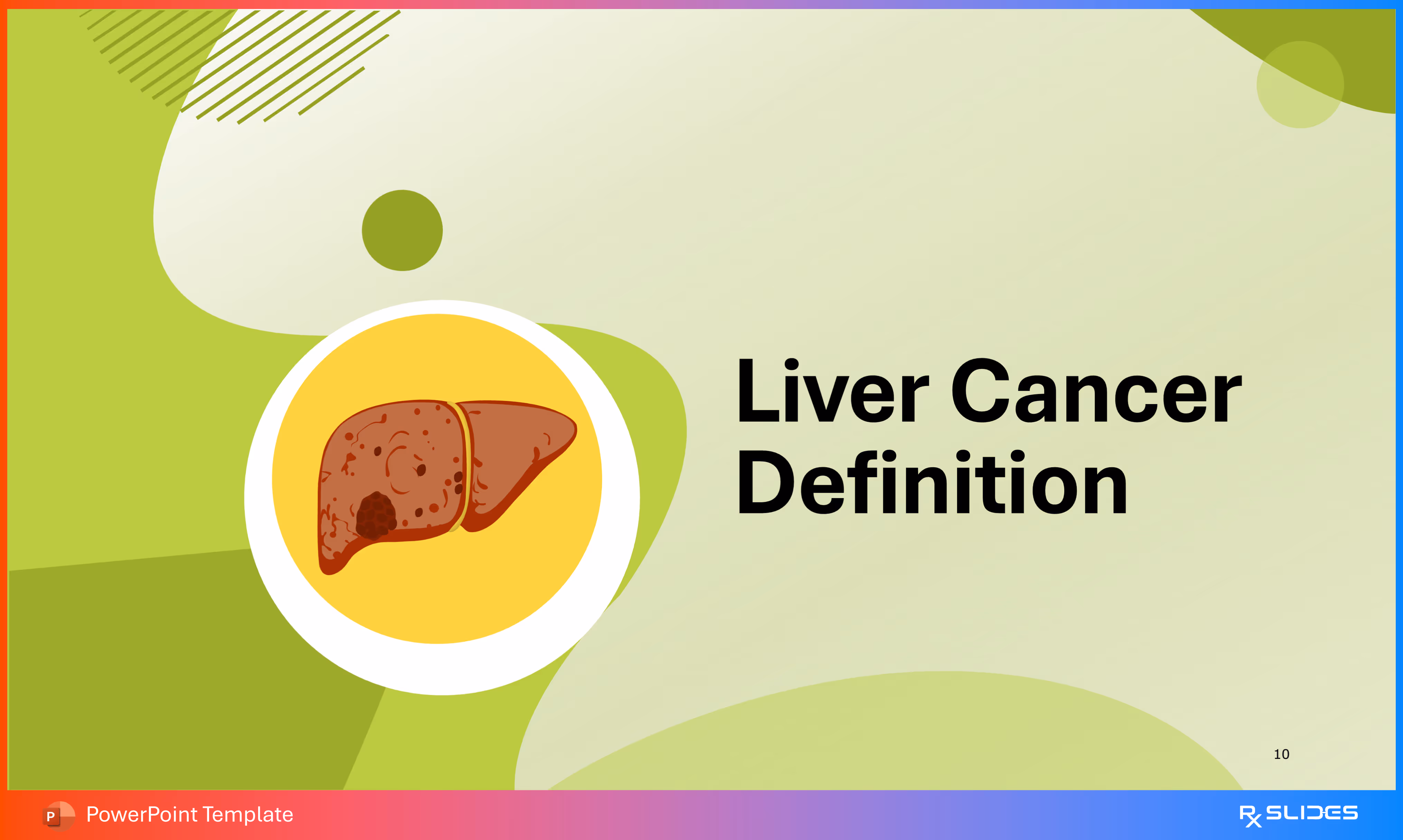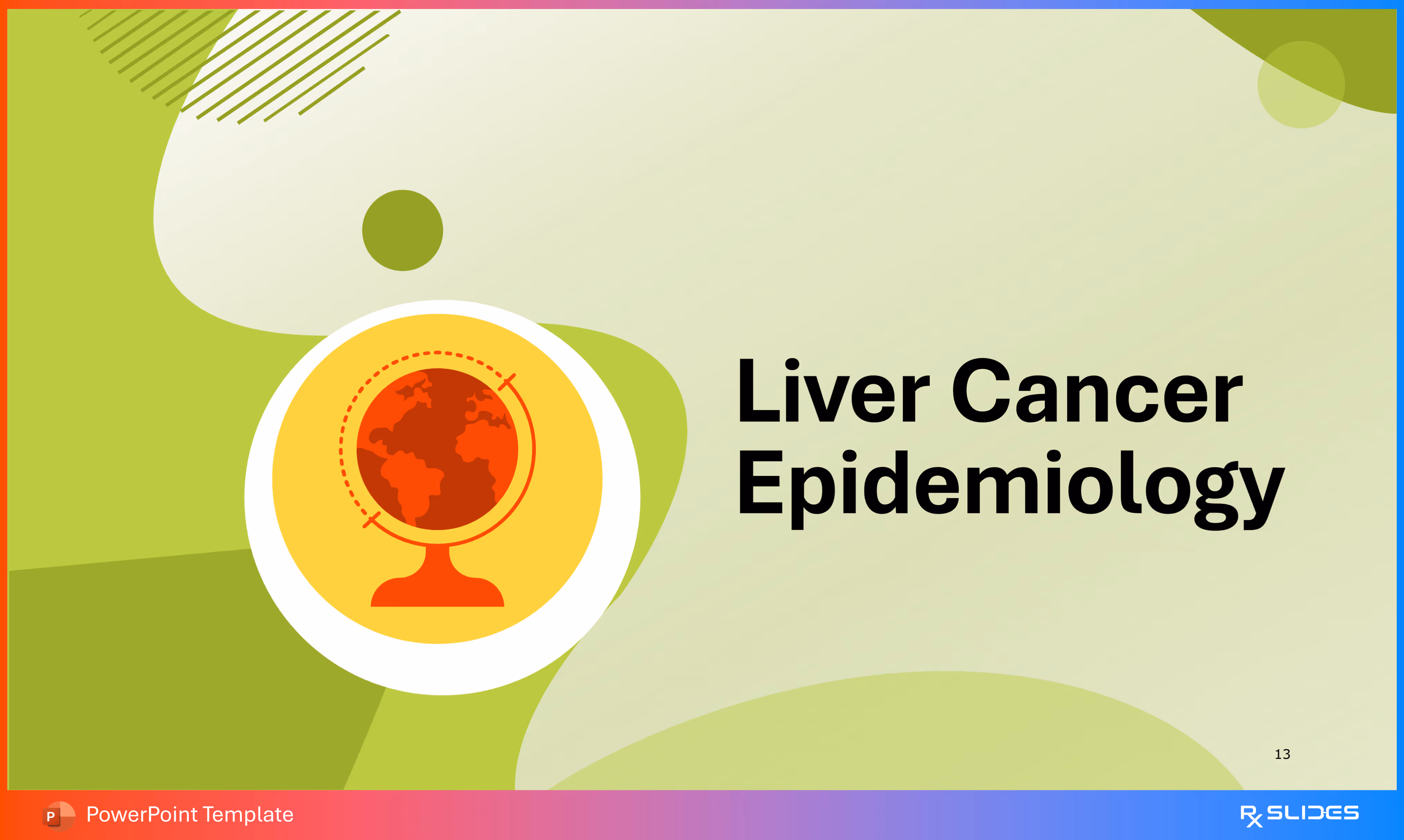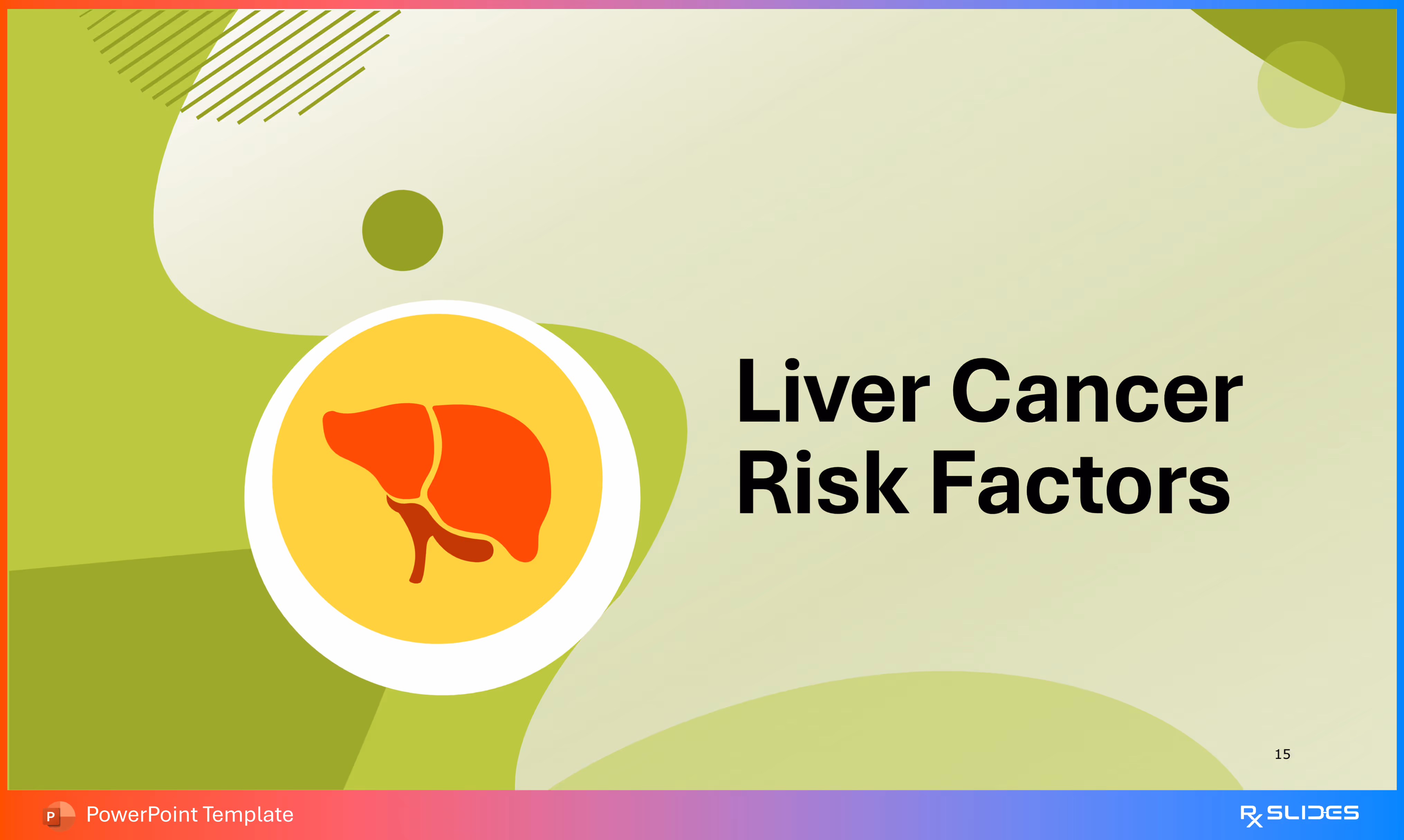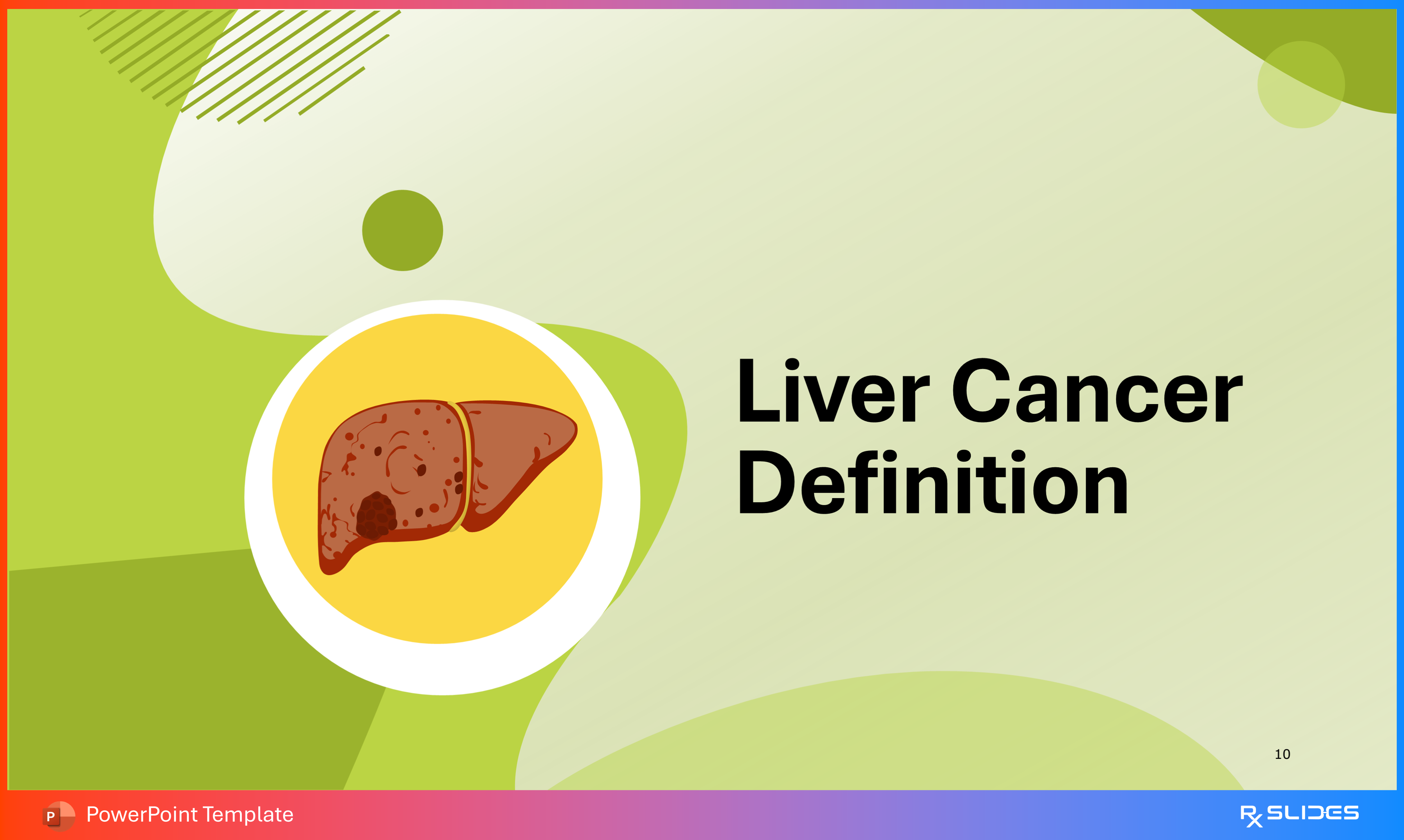 Liver Cancer PowerPoint Template This liver cancer PowerPoint template is a professional, fully editable medical presentation designed for oncologists, hepatologists, and medical educators. This Hepatic Cancer PPT Template has organized slides that explain the anatomy, causes, diagnosis, and treatment, blending accurate science with clear visuals. Ideal for academic lectures, research conferences, or clinical teaching. Key Features Covers the full spectrum: liver anatomy, physiology, epidemiology, pathogenesis, staging, diagnosis, treatment, and follow-up. Professional visuals, including labeled diagrams, infographics, and data charts that enhance audience engagement. The layouts are both editable and adaptable. Works seamlessly with both PowerPoint and Google Slides. Liver Cancer PowerPoint Presentation Template Content Slide 1 - Title Slide Title Slide Clean, medical-themed opening slide with space for presentation title, presenter name, institution, and references. Sets a professional tone for academic or conference sessions. Slide 2 - First Presenter Layout First Presenter Layout Secondary title format allowing alternate logo placement or subtitle lines. Ideal for co-authors or departmental adaptations. Slide 3 - Title Variation Animated Slide Title Variation Animated Slide Third cover option for research seminars or multi-session modules, maintaining consistent brand identity across lectures. Slide 4 - Agenda Agenda Lists main presentation sections—Anatomy, Physiology, Definition, Epidemiology, Risk Factors, Pathogenesis, Diagnosis, Treatment, and Follow-up—to guide audience expectations. Slide 5 - Agenda using liver as bullets Agenda using liver as bullets Uses stylized liver vectors for bullet points, making this layout suitable for adaptation in other hepatic cancer PowerPoint presentations or any liver disease. Slide 6 - Liver Anatomy Section Divider Liver Anatomy Section Divider Transition slide introducing the Anatomy segment with a clean background and strong title emphasis to mark the new section. Slide 7 - Liver Anatomy (Animated Detailed Layout) Liver Anatomy (Animated Detailed Layout) Illustrated diagram labeling key hepatic structures: portal vein, hepatic artery, bile ducts, falciform ligament, diaphragm, and hepatic veins. Supports anatomical orientation before pathology discussion. Slide 8 - Liver Anatomy (Labeled Diagram with Notes) Liver Anatomy (Labeled Diagram with Notes) Expanded visual with editable labels and text boxes for structural annotation—ideal for explaining vascular or biliary pathways. Slide 9 - Liver Physiology Liver Physiology Infographic layout summarizing liver functions: metabolism, detoxification, synthesis, and bile secretion. Editable fields and directional arrows enhance conceptual flow. Slide 10 - Liver Cancer Definition – Section Divider Liver Cancer Definition – Section Divider Marks the start of the Definition and Disease Overview section, maintaining visual continuity and guiding the audience into clinical content. Slide 11 - Liver Cancer Definition Liver Cancer Definition Allows differentiation between primary hepatic malignancies and secondary metastatic lesions. Clean typography and structured text areas enable easy customization to WHO or institutional standards. Slide 12 - Liver Cancer Definition (Animated View) Liver Cancer Definition (Animated View) Animated variant for progressive content reveal. Enhances engagement during lectures explaining disease classification or histologic criteria. Slide 13 - Liver Cancer Epidemiology (Section Divider) Liver Cancer Epidemiology (Section Divider) A visual divider introducing the Epidemiology section, preparing the audience for incidence, prevalence, and survival data. Slide 14 - Liver Cancer Epidemiology & Survival Liver Cancer Epidemiology & Survival Data-driven slide summarizing global and regional incidence, prevalence, and survival rates. Includes editable maps for easy customization. Slide 15 - Liver Cancer Risk Factors (Section Divider) Liver Cancer Risk Factors (Section Divider) Streamlined transitional slide introducing the Risk Factors Part from epidemiologic data to general-level determinants. Slide 16 - Liver Cancer Risk Factors Liver Cancer Risk Factors Introduces the main risk categories contributing to liver cancer, designed for concise overviews in clinical or academic settings. Slide 17 - Risk Factors of Liver Cancer Risk Factors of Liver Cancer Details specific etiologic contributors such as liver diseases, obesity, alcohol use, genetic predisposition, and gender. The clear layout supports quick visual recognition of modifiable vs. non-modifiable risks. Slide 18 - Liver Cancer Risk Factors (Alternate Layout) Liver Cancer Risk Factors (Alternate Layout) Infographic version for hepatic cancer, which you can use in any liver disease presentation. Slide 19 - Risk Factors of Liver Cancer (Alternate Design) Risk Factors of Liver Cancer (Alternate Design) Flexible summary layout for consolidating regional or demographic data before moving to causative mechanisms. Includes editable placeholders for institutional notes. Slide 20 - Liver Cancer Causes (Section Divider) Liver Cancer Causes (Section Divider) A professional divider introduces the Causes and Etiology segment, marking the transition from population-level risks to mechanistic insights. Slide 21 - Liver Cancer Causes Liver Cancer Causes Infographic summarizing principal causes such as viral infections, fatty liver, alcohol, obesity, and medications. Fully editable and visually balanced. Slide 22 – Liver Cancer Pathogenesis (Section Divider) Liver Cancer Pathogenesis (Section Divider) Clean divider marking the transition to the Pathogenesis segment. Features a bold, stylized DNA helix icon set against a modern gradient background. Slide 23 - Liver Cancer Pathogenesis (Cellular/Histologic View) Liver Cancer Pathogenesis (Cellular/Histologic View) Animated visual illustrating cellular transformation and neoplastic 