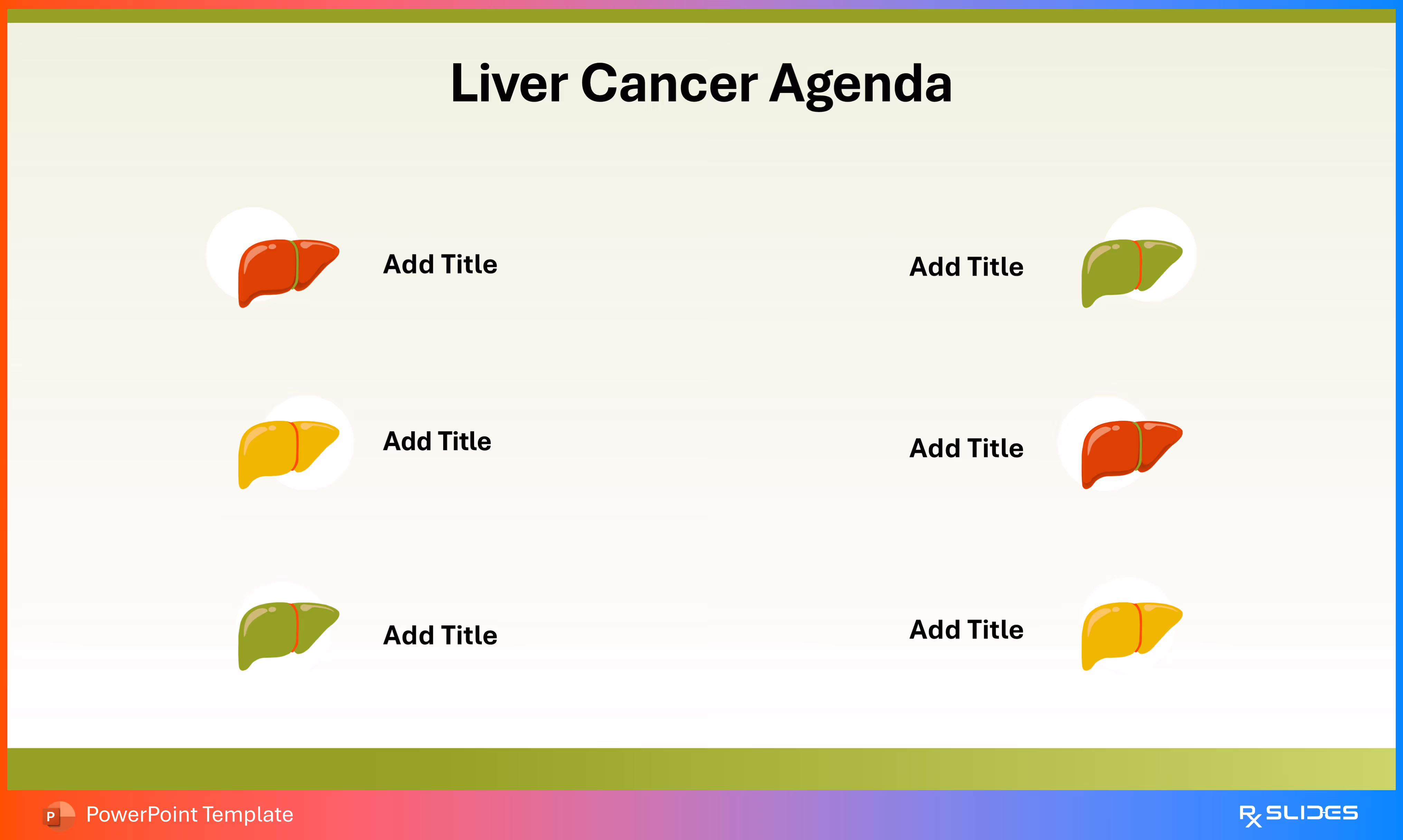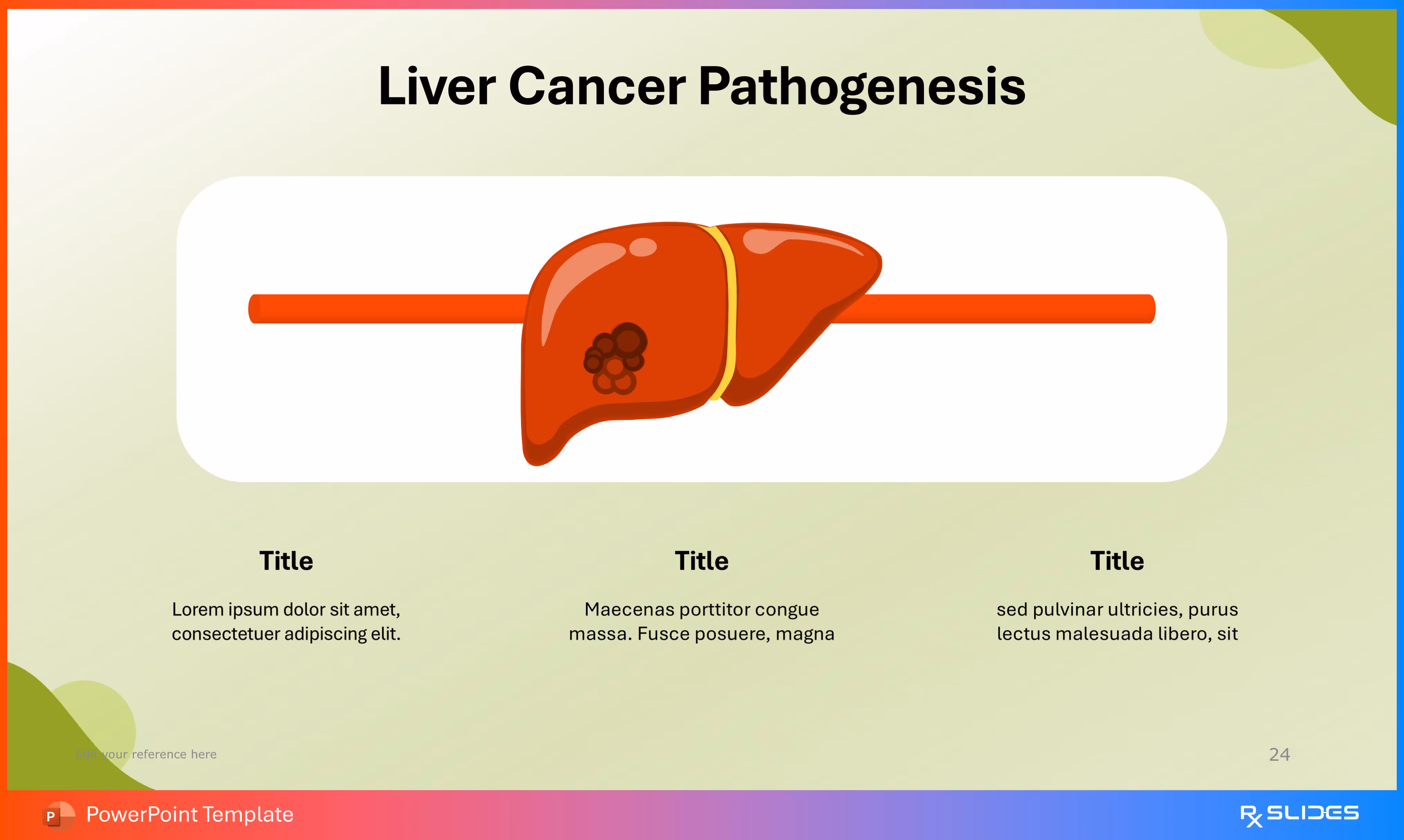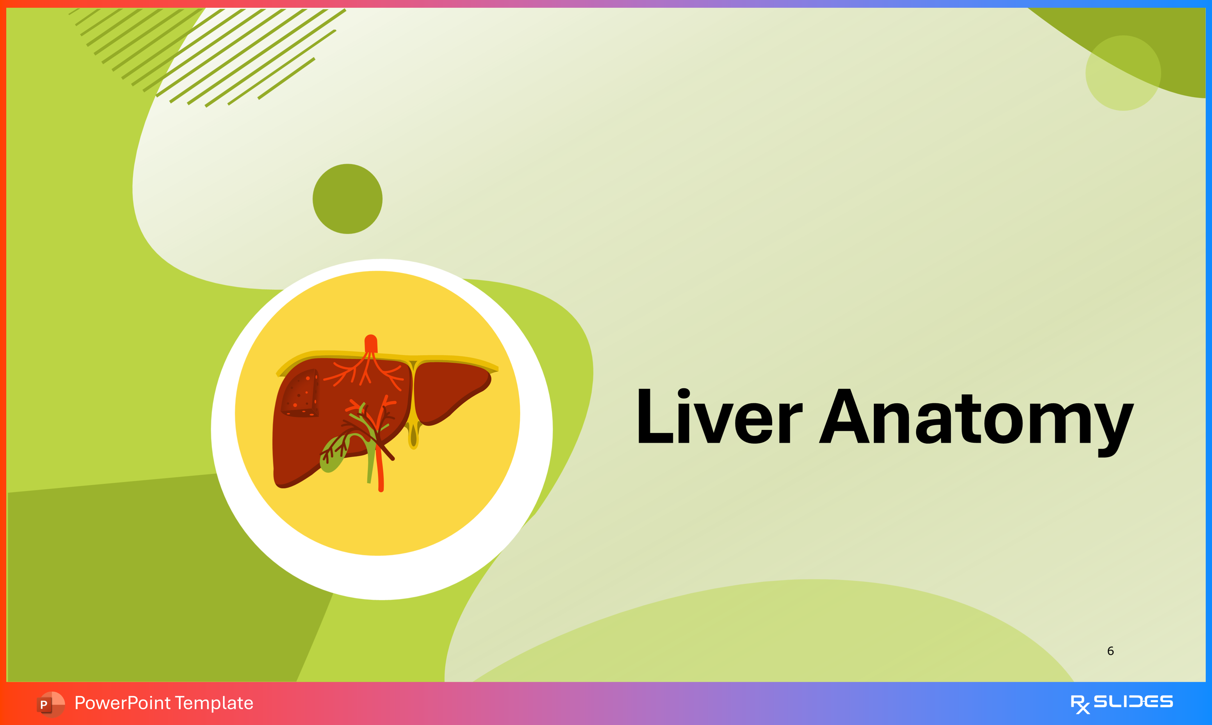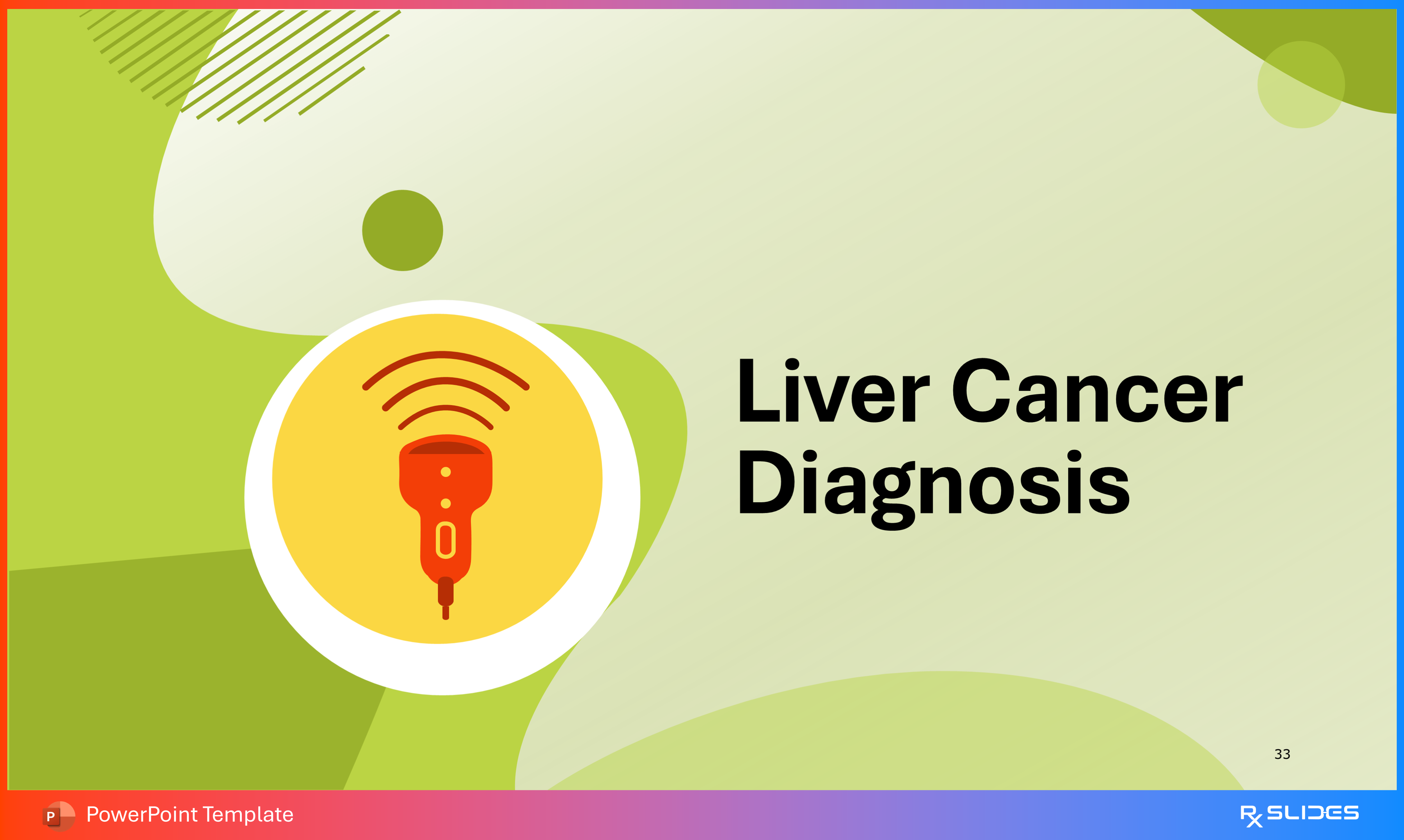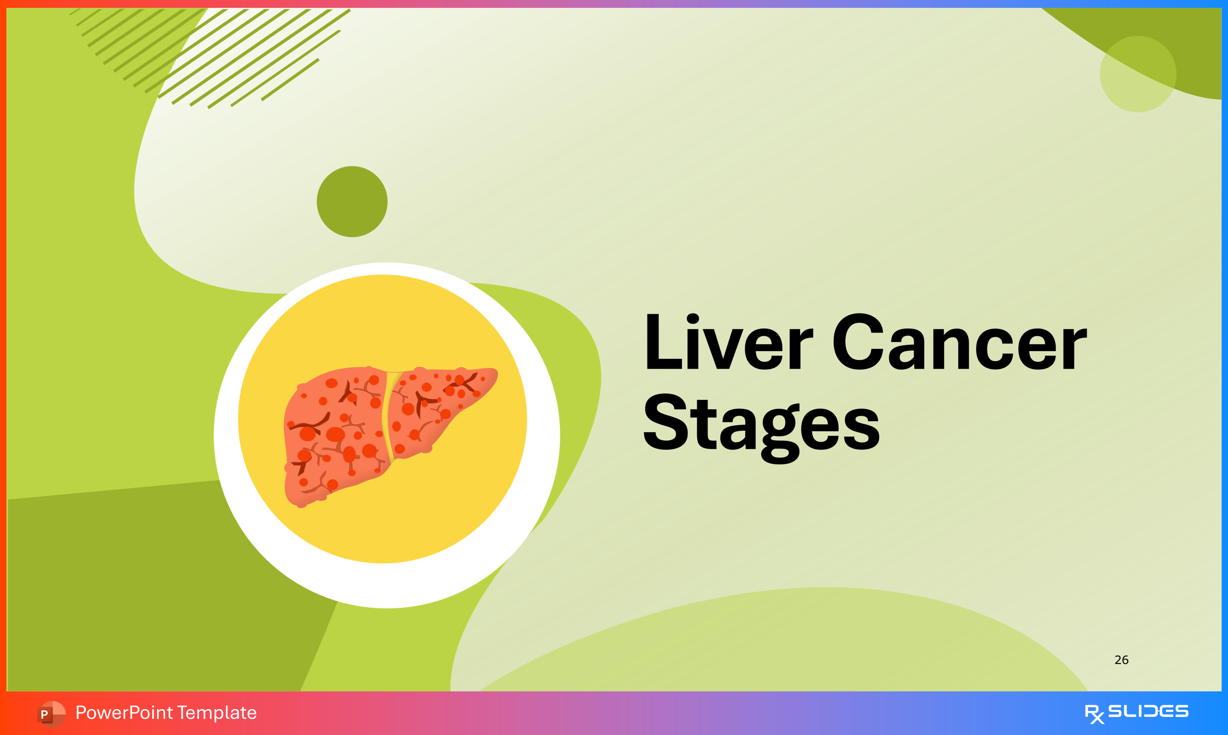 Liver Cancer PowerPoint Template This liver cancer PowerPoint template is a professional, fully editable medical presentation designed for oncologists, hepatologists, and medical educators. This Hepatic Cancer PPT Template has organized slides that explain the anatomy, causes, diagnosis, and treatment, blending accurate science with clear visuals. Ideal for academic lectures, research conferences, or clinical teaching. Key Features Covers the full spectrum: liver anatomy, physiology, epidemiology, pathogenesis, staging, diagnosis, treatment, and follow-up. Professional visuals, including labeled diagrams, infographics, and data charts that enhance audience engagement. The layouts are both editable and adaptable. Works seamlessly with both PowerPoint and Google Slides. Liver Cancer PowerPoint Presentation Template Content Slide 1 - Title Slide Title Slide Clean, medical-themed opening slide with space for presentation title, presenter name, institution, and references. Sets a professional tone for academic or conference sessions. Slide 2 - First Presenter Layout First Presenter Layout Secondary title format allowing alternate logo placement or subtitle lines. Ideal for co-authors or departmental adaptations. Slide 3 - Title Variation Animated Slide Title Variation Animated Slide Third cover option for research seminars or multi-session modules, maintaining consistent brand identity across lectures. Slide 4 - Agenda Agenda Lists main presentation sections—Anatomy, Physiology, Definition, Epidemiology, Risk Factors, Pathogenesis, Diagnosis, Treatment, and Follow-up—to guide audience expectations. Slide 5 - Agenda using liver as bullets Agenda using liver as bullets Uses stylized liver vectors for bullet points, making this layout suitable for adaptation in other hepatic cancer PowerPoint presentations or any liver disease. Slide 6 - Liver Anatomy Section Divider Liver Anatomy Section Divider Transition slide introducing the Anatomy segment with a clean background and strong title emphasis to mark the new section. Slide 7 - Liver Anatomy (Animated Detailed Layout) Liver Anatomy (Animated Detailed Layout) Illustrated diagram labeling key hepatic structures: portal vein, hepatic artery, bile ducts, falciform ligament, diaphragm, and hepatic veins. Supports anatomical orientation before pathology discussion. Slide 8 - Liver Anatomy (Labeled Diagram with Notes) Liver Anatomy (Labeled Diagram with Notes) Expanded visual with editable labels and text boxes for structural annotation—ideal for explaining vascular or biliary pathways. Slide 9 - Liver Physiology Liver Physiology Infographic layout summarizing liver functions: metabolism, detoxification, synthesis, and bile secretion. Editable fields and directional arrows enhance conceptual flow. Slide 10 - Liver Cancer Definition – Section Divider Liver Cancer Definition – Section Divider Marks the start of the Definition and Disease Overview section, maintaining visual continuity and guiding the audience into clinical content. Slide 11 - Liver Cancer Definition Liver Cancer Definition Allows differentiation between primary hepatic malignancies and secondary metastatic lesions. Clean typography and structured text areas enable easy customization to WHO or institutional standards. Slide 12 - Liver Cancer Definition (Animated View) Liver Cancer Definition (Animated View) Animated variant for progressive content reveal. Enhances engagement during lectures explaining disease classification or histologic criteria. Slide 13 - Liver Cancer Epidemiology (Section Divider) Liver Cancer Epidemiology (Section Divider) A visual divider introducing the Epidemiology section, preparing the audience for incidence, prevalence, and survival data. Slide 14 - Liver Cancer Epidemiology & Survival Liver Cancer Epidemiology & Survival Data-driven slide summarizing global and regional incidence, prevalence, and survival rates. Includes editable maps for easy customization. Slide 15 - Liver Cancer Risk Factors (Section Divider) Liver Cancer Risk Factors (Section Divider) Streamlined transitional slide introducing the Risk Factors Part from epidemiologic data to general-level determinants. Slide 16 - Liver Cancer Risk Factors Liver Cancer Risk Factors Introduces the main risk categories contributing to liver cancer, designed for concise overviews in clinical or academic settings. Slide 17 - Risk Factors of Liver Cancer Risk Factors of Liver Cancer Details specific etiologic contributors such as liver diseases, obesity, alcohol use, genetic predisposition, and gender. The clear layout supports quick visual recognition of modifiable vs. non-modifiable risks. Slide 18 - Liver Cancer Risk Factors (Alternate Layout) Liver Cancer Risk Factors (Alternate Layout) Infographic version for hepatic cancer, which you can use in any liver disease presentation. Slide 19 - Risk Factors of Liver Cancer (Alternate Design) Risk Factors of Liver Cancer (Alternate Design) Flexible summary layout for consolidating regional or demographic data before moving to causative mechanisms. Includes editable placeholders for institutional notes. Slide 20 - Liver Cancer Causes (Section Divider) Liver Cancer Causes (Section Divider) A professional divider introduces the Causes and Etiology segment, marking the transition from population-level risks to mechanistic insights. Slide 21 - Liver Cancer Causes Liver Cancer Causes Infographic summarizing principal causes such as viral infections, fatty liver, alcohol, obesity, and medications. Fully editable and visually balanced. Slide 22 – Liver Cancer Pathogenesis (Section Divider) Liver Cancer Pathogenesis (Section Divider) Clean divider marking the transition to the Pathogenesis segment. Features a bold, stylized DNA helix icon set against a modern gradient background. Slide 23 - Liver Cancer Pathogenesis (Cellular/Histologic View) Liver Cancer Pathogenesis (Cellular/Histologic View) Animated visual illustrating cellular transformation and neoplastic 