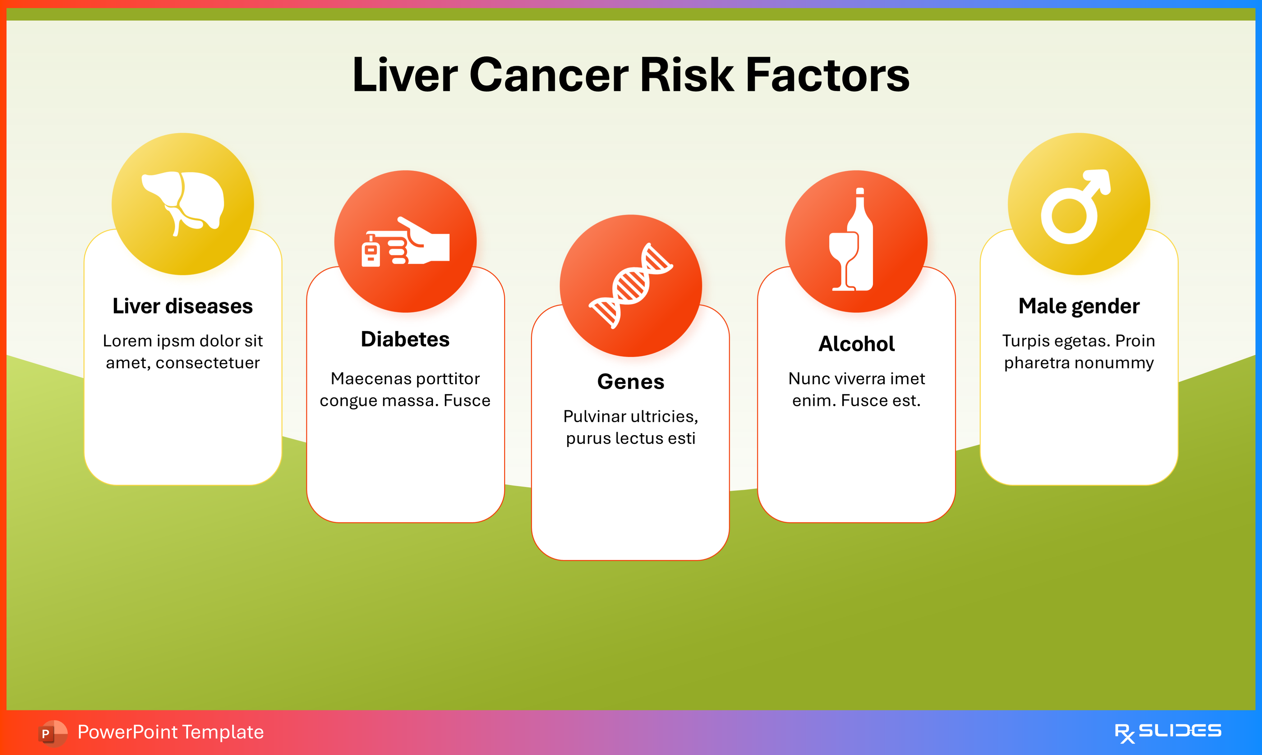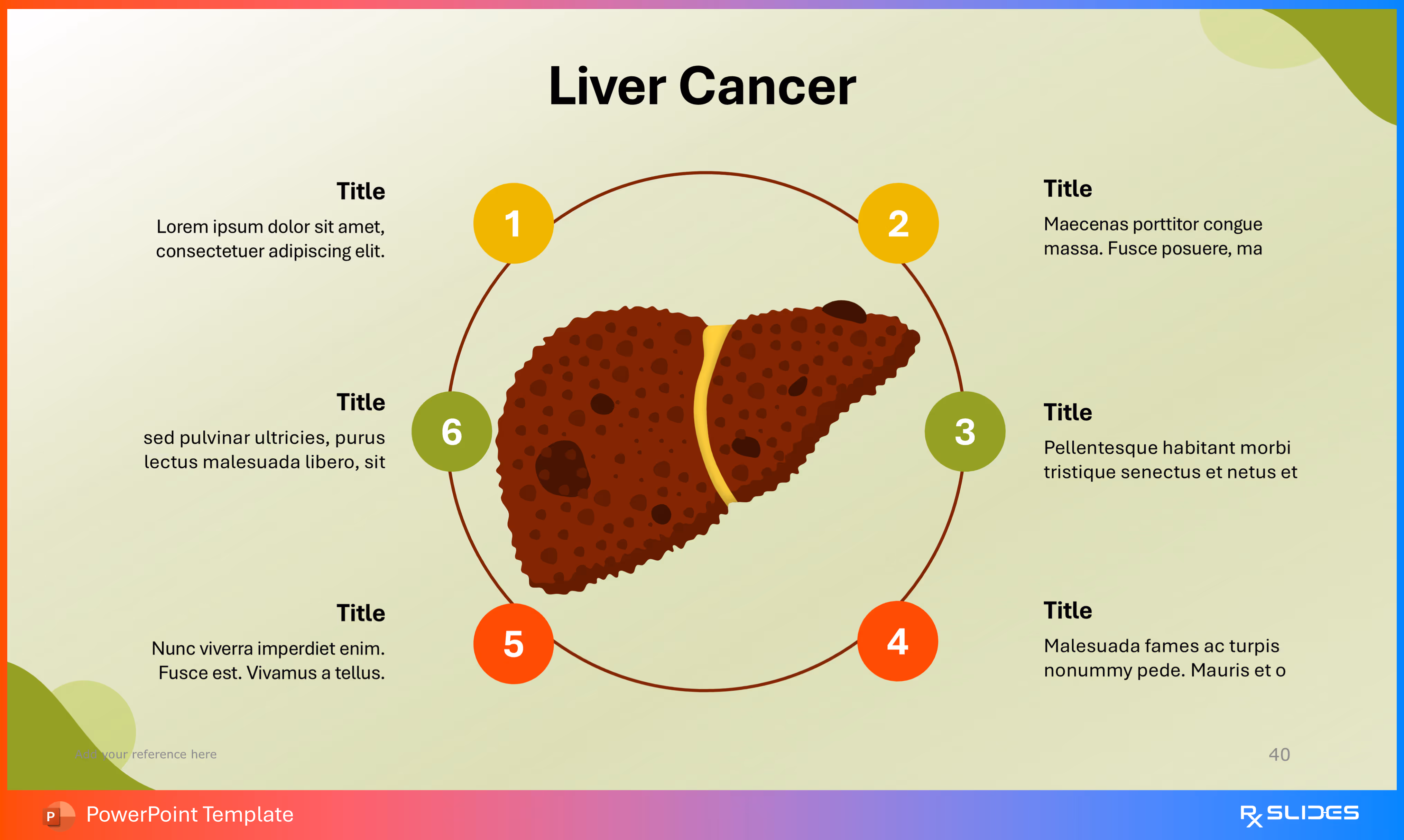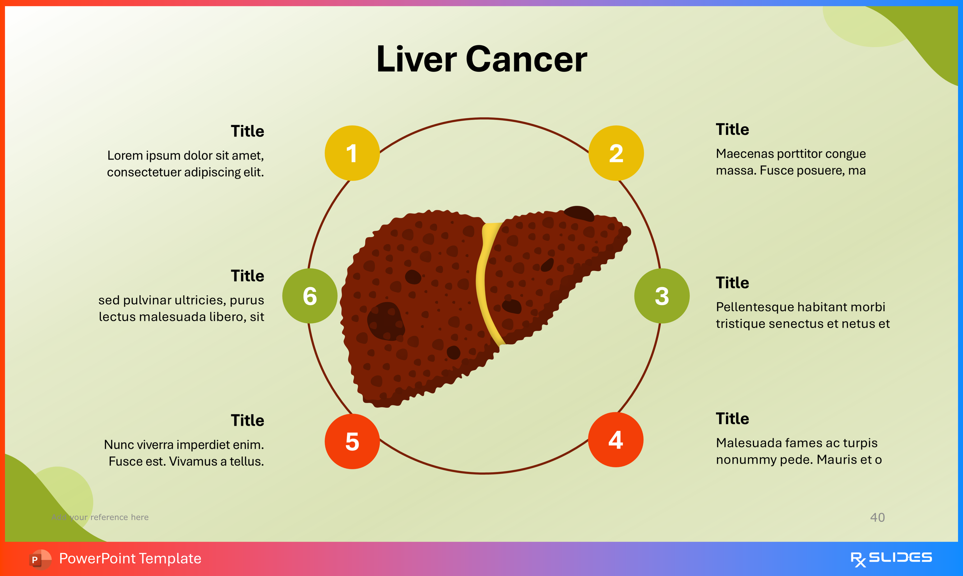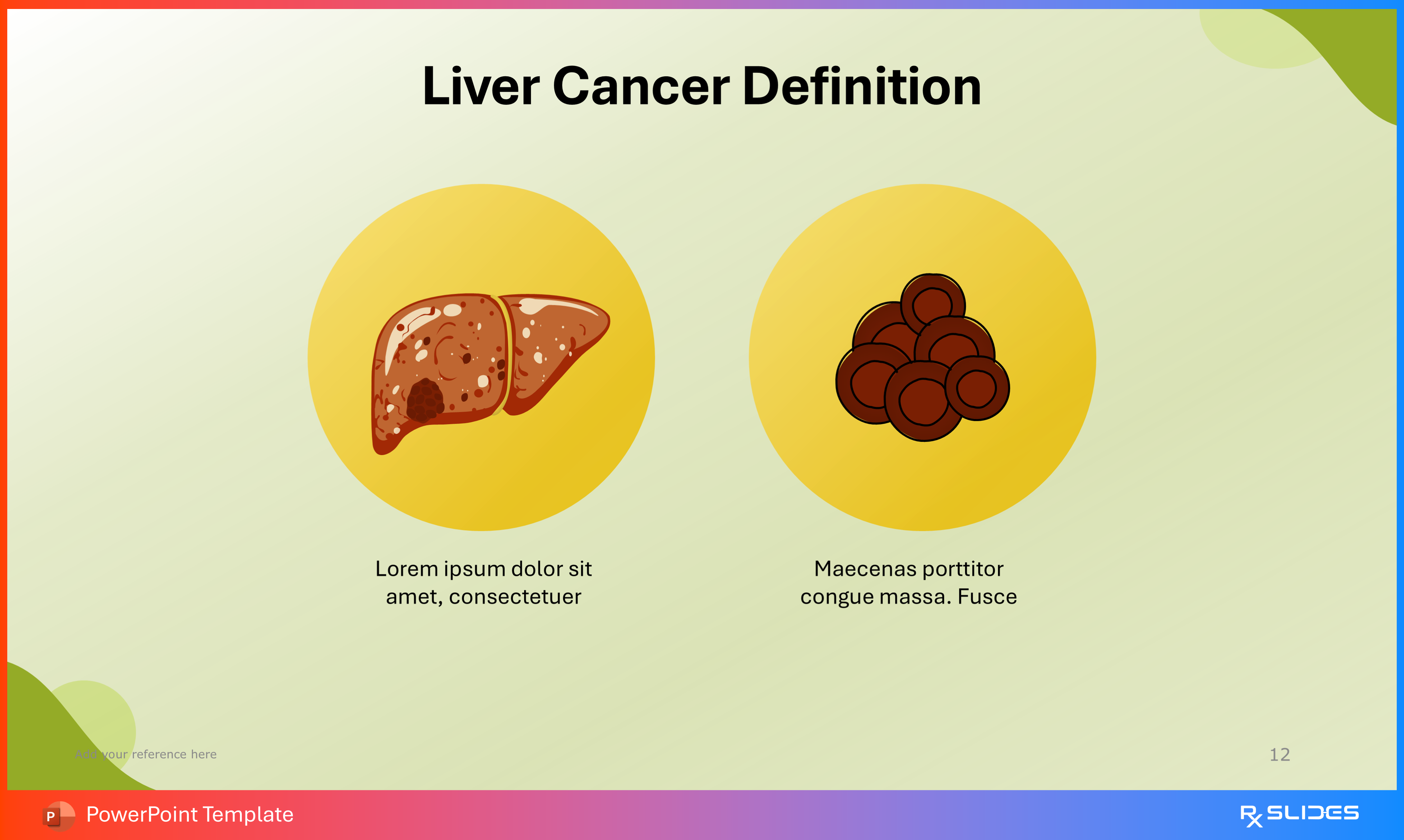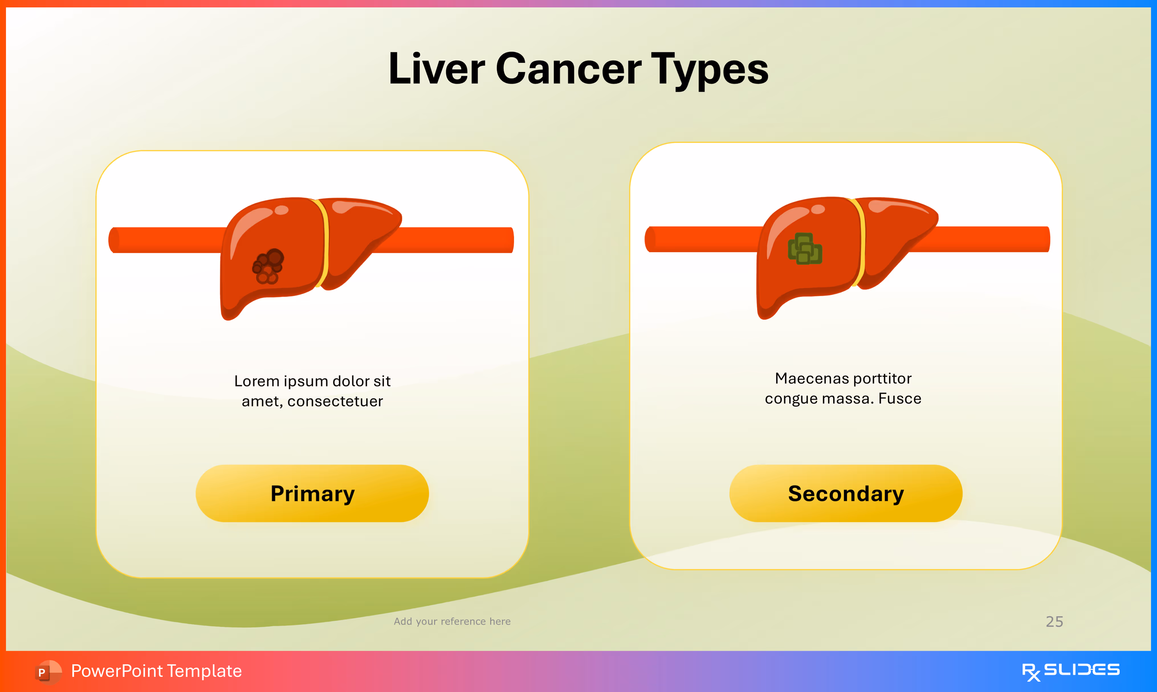 Liver Cancer PowerPoint Template This liver cancer PowerPoint template is a professional, fully editable medical presentation designed for oncologists, hepatologists, and medical educators. This Hepatic Cancer PPT Template has organized slides that explain the anatomy, causes, diagnosis, and treatment, blending accurate science with clear visuals. Ideal for academic lectures, research conferences, or clinical teaching. Key Features Covers the full spectrum: liver anatomy, physiology, epidemiology, pathogenesis, staging, diagnosis, treatment, and follow-up. Professional visuals, including labeled diagrams, infographics, and data charts that enhance audience engagement. The layouts are both editable and adaptable. Works seamlessly with both PowerPoint and Google Slides. Liver Cancer PowerPoint Presentation Template Content Slide 1 - Title Slide Title Slide Clean, medical-themed opening slide with space for presentation title, presenter name, institution, and references. Sets a professional tone for academic or conference sessions. Slide 2 - First Presenter Layout First Presenter Layout Secondary title format allowing alternate logo placement or subtitle lines. Ideal for co-authors or departmental adaptations. Slide 3 - Title Variation Animated Slide Title Variation Animated Slide Third cover option for research seminars or multi-session modules, maintaining consistent brand identity across lectures. Slide 4 - Agenda Agenda Lists main presentation sections—Anatomy, Physiology, Definition, Epidemiology, Risk Factors, Pathogenesis, Diagnosis, Treatment, and Follow-up—to guide audience expectations. Slide 5 - Agenda using liver as bullets Agenda using liver as bullets Uses stylized liver vectors for bullet points, making this layout suitable for adaptation in other hepatic cancer PowerPoint presentations or any liver disease. Slide 6 - Liver Anatomy Section Divider Liver Anatomy Section Divider Transition slide introducing the Anatomy segment with a clean background and strong title emphasis to mark the new section. Slide 7 - Liver Anatomy (Animated Detailed Layout) Liver Anatomy (Animated Detailed Layout) Illustrated diagram labeling key hepatic structures: portal vein, hepatic artery, bile ducts, falciform ligament, diaphragm, and hepatic veins. Supports anatomical orientation before pathology discussion. Slide 8 - Liver Anatomy (Labeled Diagram with Notes) Liver Anatomy (Labeled Diagram with Notes) Expanded visual with editable labels and text boxes for structural annotation—ideal for explaining vascular or biliary pathways. Slide 9 - Liver Physiology Liver Physiology Infographic layout summarizing liver functions: metabolism, detoxification, synthesis, and bile secretion. Editable fields and directional arrows enhance conceptual flow. Slide 10 - Liver Cancer Definition – Section Divider Liver Cancer Definition – Section Divider Marks the start of the Definition and Disease Overview section, maintaining visual continuity and guiding the audience into clinical content. Slide 11 - Liver Cancer Definition Liver Cancer Definition Allows differentiation between primary hepatic malignancies and secondary metastatic lesions. Clean typography and structured text areas enable easy customization to WHO or institutional standards. Slide 12 - Liver Cancer Definition (Animated View) Liver Cancer Definition (Animated View) Animated variant for progressive content reveal. Enhances engagement during lectures explaining disease classification or histologic criteria. Slide 13 - Liver Cancer Epidemiology (Section Divider) Liver Cancer Epidemiology (Section Divider) A visual divider introducing the Epidemiology section, preparing the audience for incidence, prevalence, and survival data. Slide 14 - Liver Cancer Epidemiology & Survival Liver Cancer Epidemiology & Survival Data-driven slide summarizing global and regional incidence, prevalence, and survival rates. Includes editable maps for easy customization. Slide 15 - Liver Cancer Risk Factors (Section Divider) Liver Cancer Risk Factors (Section Divider) Streamlined transitional slide introducing the Risk Factors Part from epidemiologic data to general-level determinants. Slide 16 - Liver Cancer Risk Factors Liver Cancer Risk Factors Introduces the main risk categories contributing to liver cancer, designed for concise overviews in clinical or academic settings. Slide 17 - Risk Factors of Liver Cancer Risk Factors of Liver Cancer Details specific etiologic contributors such as liver diseases, obesity, alcohol use, genetic predisposition, and gender. The clear layout supports quick visual recognition of modifiable vs. non-modifiable risks. Slide 18 - Liver Cancer Risk Factors (Alternate Layout) Liver Cancer Risk Factors (Alternate Layout) Infographic version for hepatic cancer, which you can use in any liver disease presentation. Slide 19 - Risk Factors of Liver Cancer (Alternate Design) Risk Factors of Liver Cancer (Alternate Design) Flexible summary layout for consolidating regional or demographic data before moving to causative mechanisms. Includes editable placeholders for institutional notes. Slide 20 - Liver Cancer Causes (Section Divider) Liver Cancer Causes (Section Divider) A professional divider introduces the Causes and Etiology segment, marking the transition from population-level risks to mechanistic insights. Slide 21 - Liver Cancer Causes Liver Cancer Causes Infographic summarizing principal causes such as viral infections, fatty liver, alcohol, obesity, and medications. Fully editable and visually balanced. Slide 22 – Liver Cancer Pathogenesis (Section Divider) Liver Cancer Pathogenesis (Section Divider) Clean divider marking the transition to the Pathogenesis segment. Features a bold, stylized DNA helix icon set against a modern gradient background. Slide 23 - Liver Cancer Pathogenesis (Cellular/Histologic View) Liver Cancer Pathogenesis (Cellular/Histologic View) Animated visual illustrating cellular transformation and neoplastic 