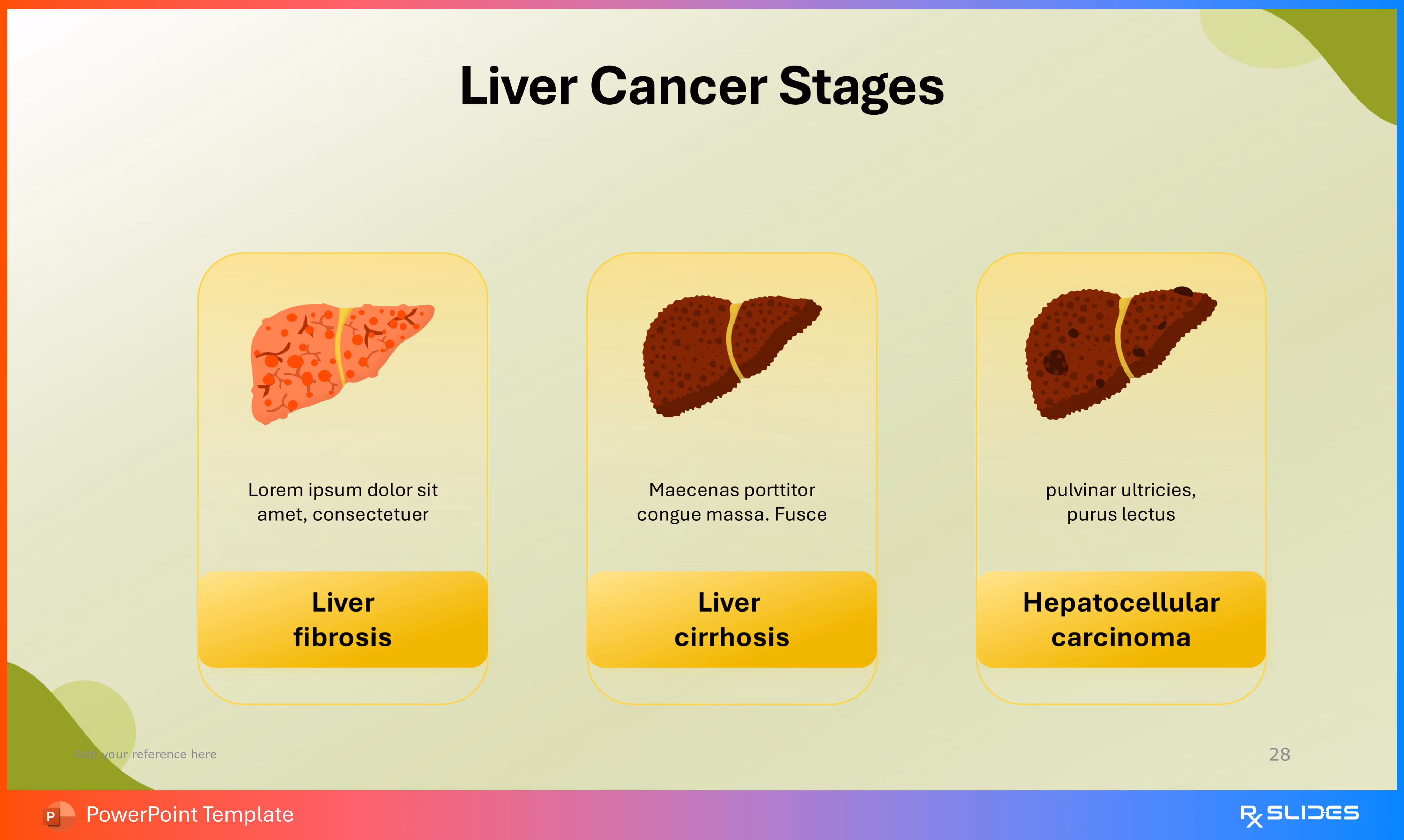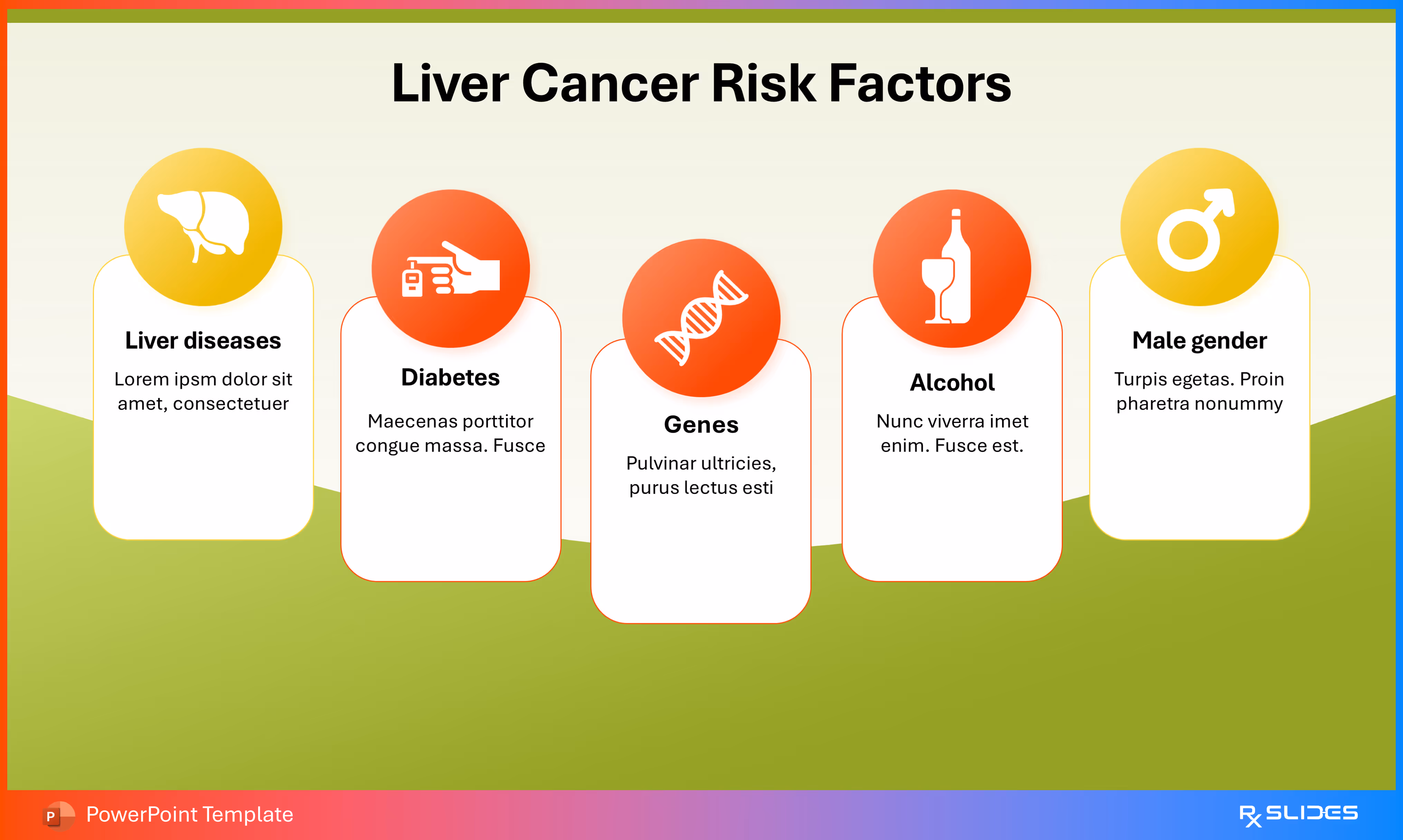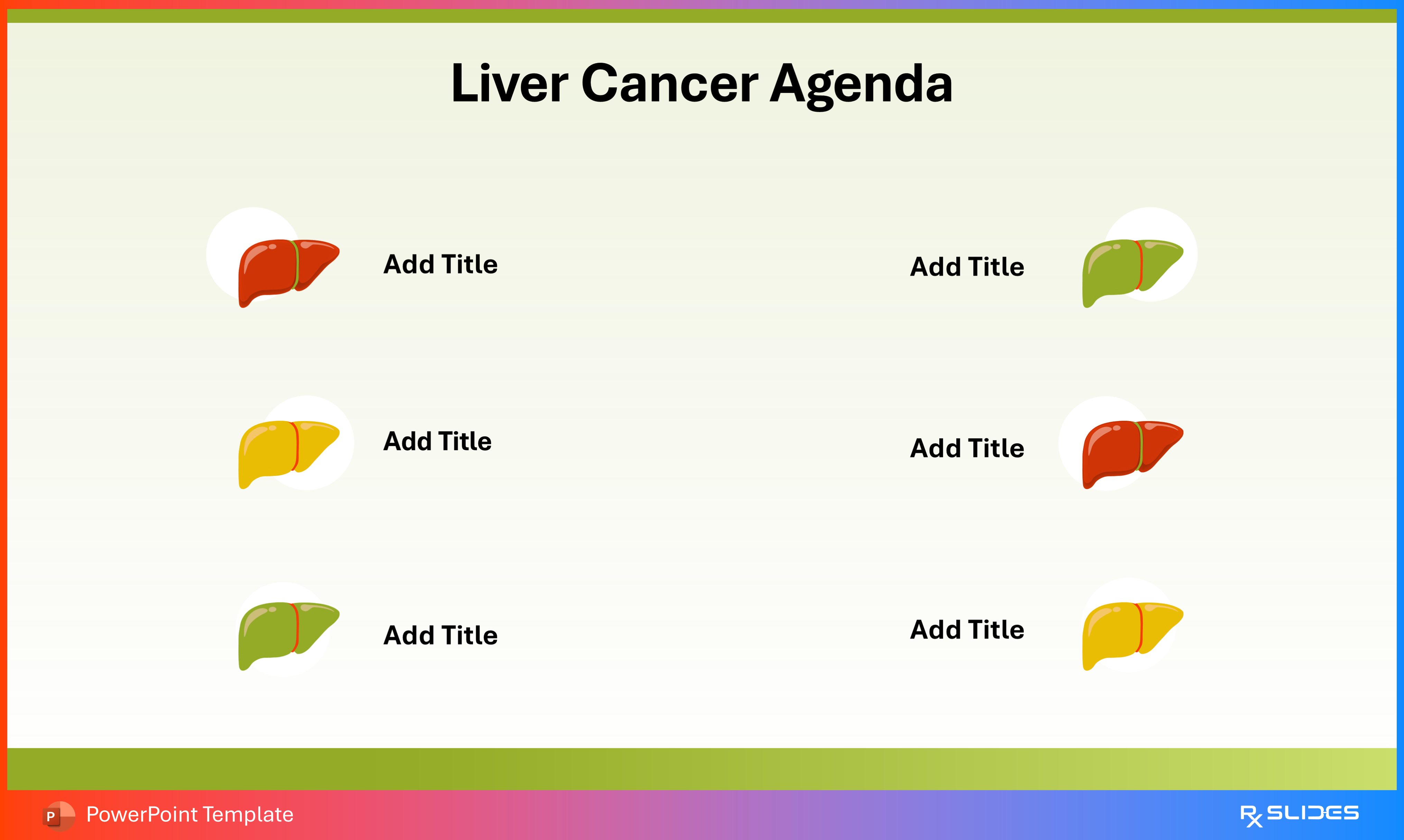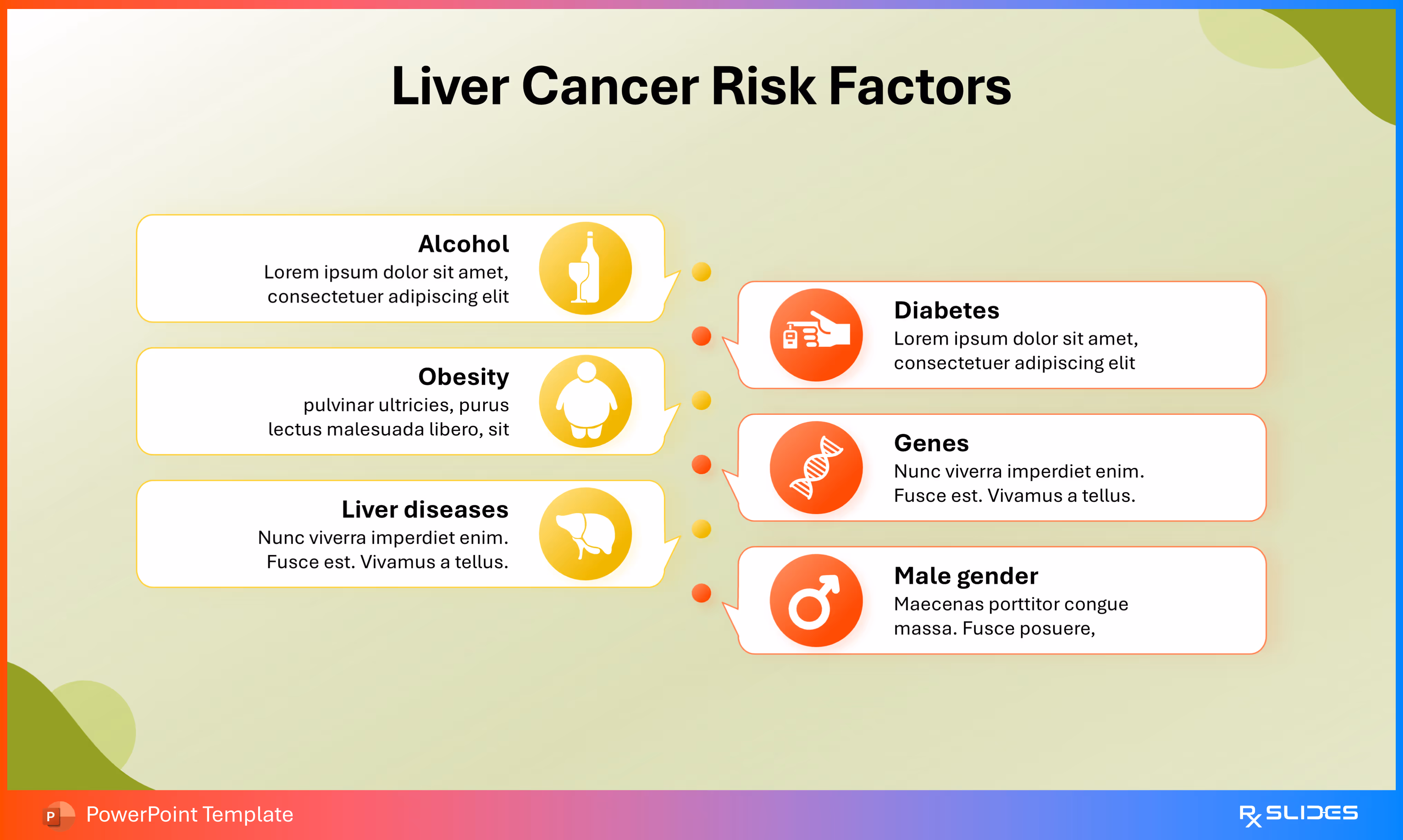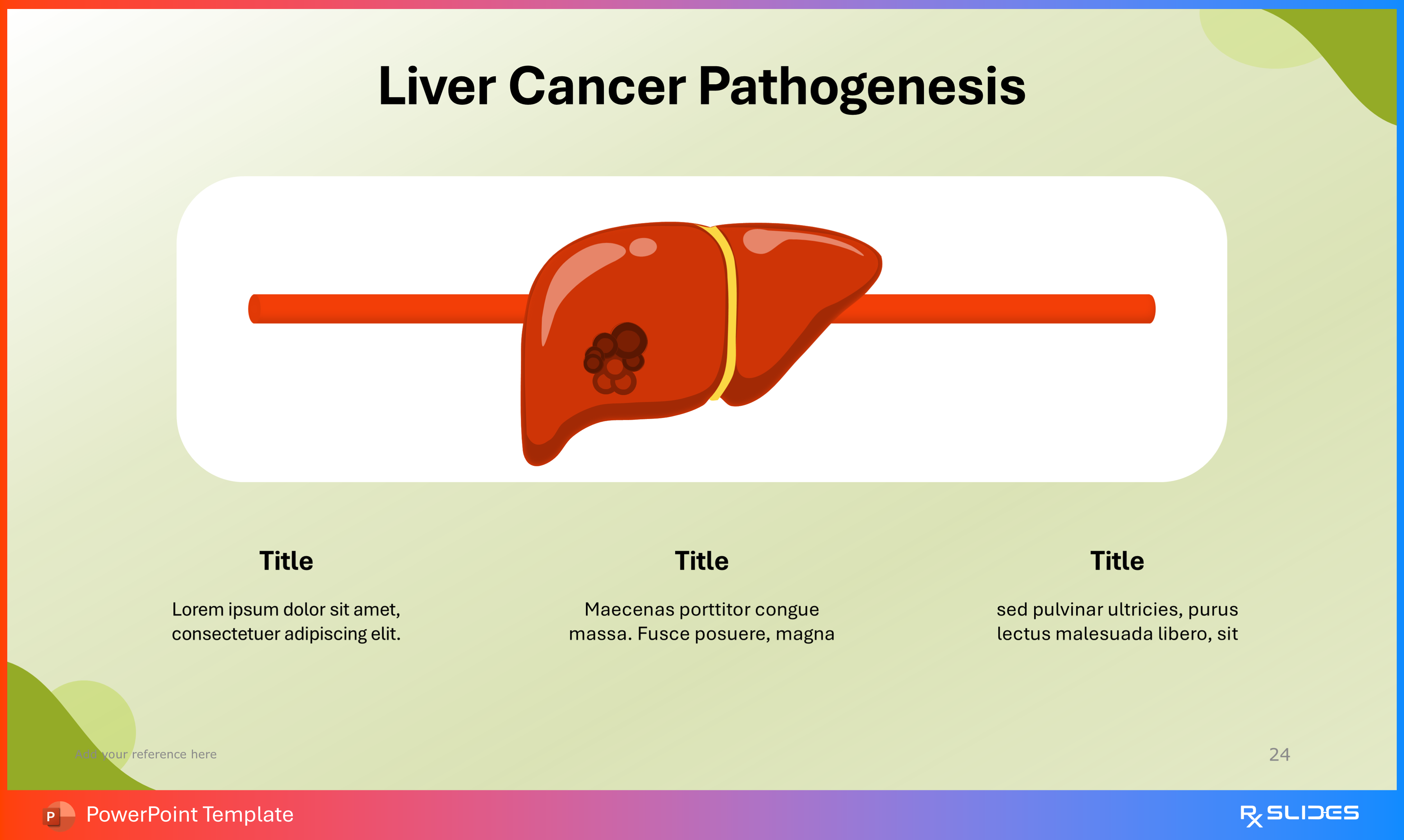 Liver Cancer PowerPoint Template This liver cancer PowerPoint template is a professional, fully editable medical presentation designed for oncologists, hepatologists, and medical educators. This Hepatic Cancer PPT Template has organized slides that explain the anatomy, causes, diagnosis, and treatment, blending accurate science with clear visuals. Ideal for academic lectures, research conferences, or clinical teaching. Key Features Covers the full spectrum: liver anatomy, physiology, epidemiology, pathogenesis, staging, diagnosis, treatment, and follow-up. Professional visuals, including labeled diagrams, infographics, and data charts that enhance audience engagement. The layouts are both editable and adaptable. Works seamlessly with both PowerPoint and Google Slides. Liver Cancer PowerPoint Presentation Template Content Slide 1 - Title Slide Title Slide Clean, medical-themed opening slide with space for presentation title, presenter name, institution, and references. Sets a professional tone for academic or conference sessions. Slide 2 - First Presenter Layout First Presenter Layout Secondary title format allowing alternate logo placement or subtitle lines. Ideal for co-authors or departmental adaptations. Slide 3 - Title Variation Animated Slide Title Variation Animated Slide Third cover option for research seminars or multi-session modules, maintaining consistent brand identity across lectures. Slide 4 - Agenda Agenda Lists main presentation sections—Anatomy, Physiology, Definition, Epidemiology, Risk Factors, Pathogenesis, Diagnosis, Treatment, and Follow-up—to guide audience expectations. Slide 5 - Agenda using liver as bullets Agenda using liver as bullets Uses stylized liver vectors for bullet points, making this layout suitable for adaptation in other hepatic cancer PowerPoint presentations or any liver disease. Slide 6 - Liver Anatomy Section Divider Liver Anatomy Section Divider Transition slide introducing the Anatomy segment with a clean background and strong title emphasis to mark the new section. Slide 7 - Liver Anatomy (Animated Detailed Layout) Liver Anatomy (Animated Detailed Layout) Illustrated diagram labeling key hepatic structures: portal vein, hepatic artery, bile ducts, falciform ligament, diaphragm, and hepatic veins. Supports anatomical orientation before pathology discussion. Slide 8 - Liver Anatomy (Labeled Diagram with Notes) Liver Anatomy (Labeled Diagram with Notes) Expanded visual with editable labels and text boxes for structural annotation—ideal for explaining vascular or biliary pathways. Slide 9 - Liver Physiology Liver Physiology Infographic layout summarizing liver functions: metabolism, detoxification, synthesis, and bile secretion. Editable fields and directional arrows enhance conceptual flow. Slide 10 - Liver Cancer Definition – Section Divider Liver Cancer Definition – Section Divider Marks the start of the Definition and Disease Overview section, maintaining visual continuity and guiding the audience into clinical content. Slide 11 - Liver Cancer Definition Liver Cancer Definition Allows differentiation between primary hepatic malignancies and secondary metastatic lesions. Clean typography and structured text areas enable easy customization to WHO or institutional standards. Slide 12 - Liver Cancer Definition (Animated View) Liver Cancer Definition (Animated View) Animated variant for progressive content reveal. Enhances engagement during lectures explaining disease classification or histologic criteria. Slide 13 - Liver Cancer Epidemiology (Section Divider) Liver Cancer Epidemiology (Section Divider) A visual divider introducing the Epidemiology section, preparing the audience for incidence, prevalence, and survival data. Slide 14 - Liver Cancer Epidemiology & Survival Liver Cancer Epidemiology & Survival Data-driven slide summarizing global and regional incidence, prevalence, and survival rates. Includes editable maps for easy customization. Slide 15 - Liver Cancer Risk Factors (Section Divider) Liver Cancer Risk Factors (Section Divider) Streamlined transitional slide introducing the Risk Factors Part from epidemiologic data to general-level determinants. Slide 16 - Liver Cancer Risk Factors Liver Cancer Risk Factors Introduces the main risk categories contributing to liver cancer, designed for concise overviews in clinical or academic settings. Slide 17 - Risk Factors of Liver Cancer Risk Factors of Liver Cancer Details specific etiologic contributors such as liver diseases, obesity, alcohol use, genetic predisposition, and gender. The clear layout supports quick visual recognition of modifiable vs. non-modifiable risks. Slide 18 - Liver Cancer Risk Factors (Alternate Layout) Liver Cancer Risk Factors (Alternate Layout) Infographic version for hepatic cancer, which you can use in any liver disease presentation. Slide 19 - Risk Factors of Liver Cancer (Alternate Design) Risk Factors of Liver Cancer (Alternate Design) Flexible summary layout for consolidating regional or demographic data before moving to causative mechanisms. Includes editable placeholders for institutional notes. Slide 20 - Liver Cancer Causes (Section Divider) Liver Cancer Causes (Section Divider) A professional divider introduces the Causes and Etiology segment, marking the transition from population-level risks to mechanistic insights. Slide 21 - Liver Cancer Causes Liver Cancer Causes Infographic summarizing principal causes such as viral infections, fatty liver, alcohol, obesity, and medications. Fully editable and visually balanced. Slide 22 – Liver Cancer Pathogenesis (Section Divider) Liver Cancer Pathogenesis (Section Divider) Clean divider marking the transition to the Pathogenesis segment. Features a bold, stylized DNA helix icon set against a modern gradient background. Slide 23 - Liver Cancer Pathogenesis (Cellular/Histologic View) Liver Cancer Pathogenesis (Cellular/Histologic View) Animated visual illustrating cellular transformation and neoplastic 