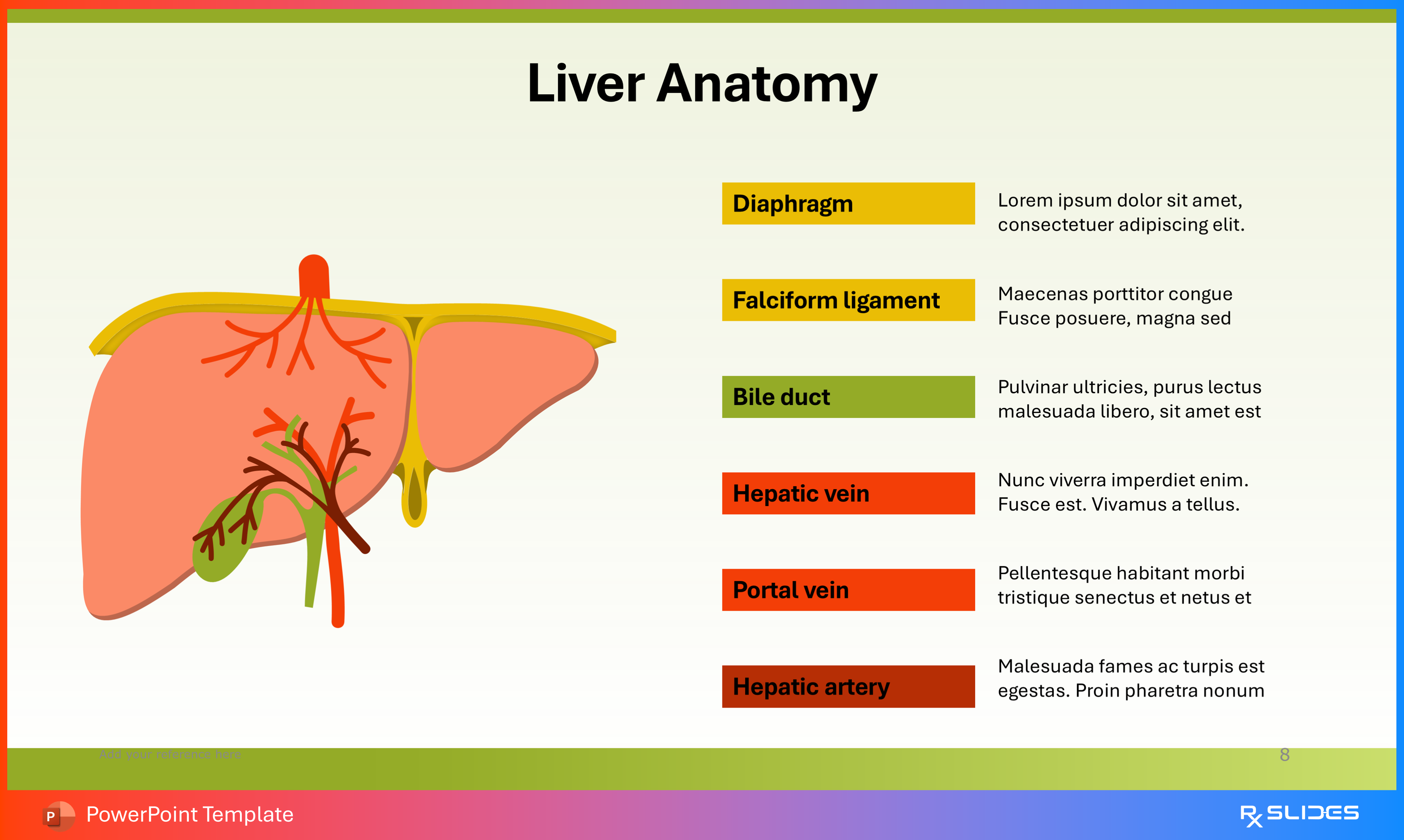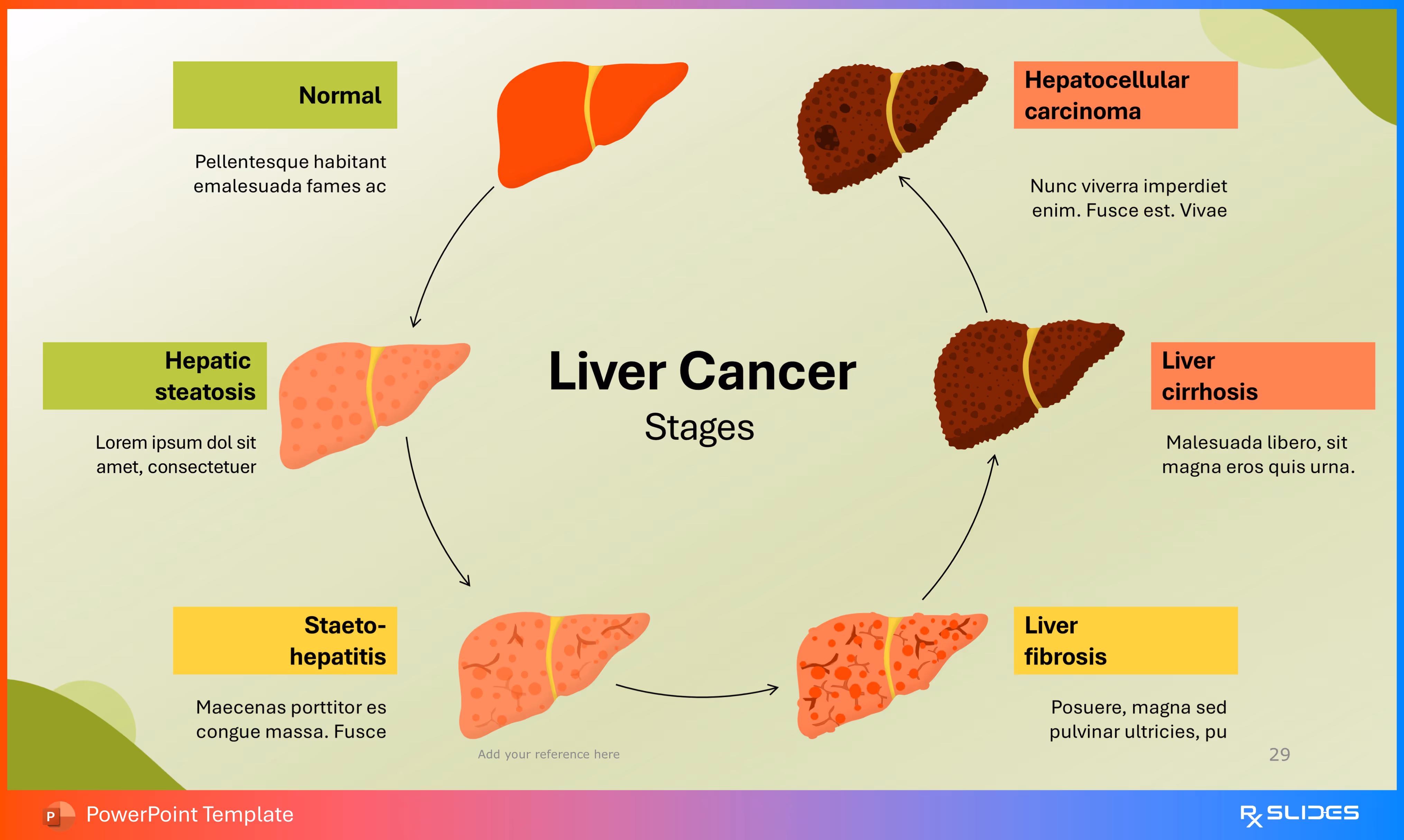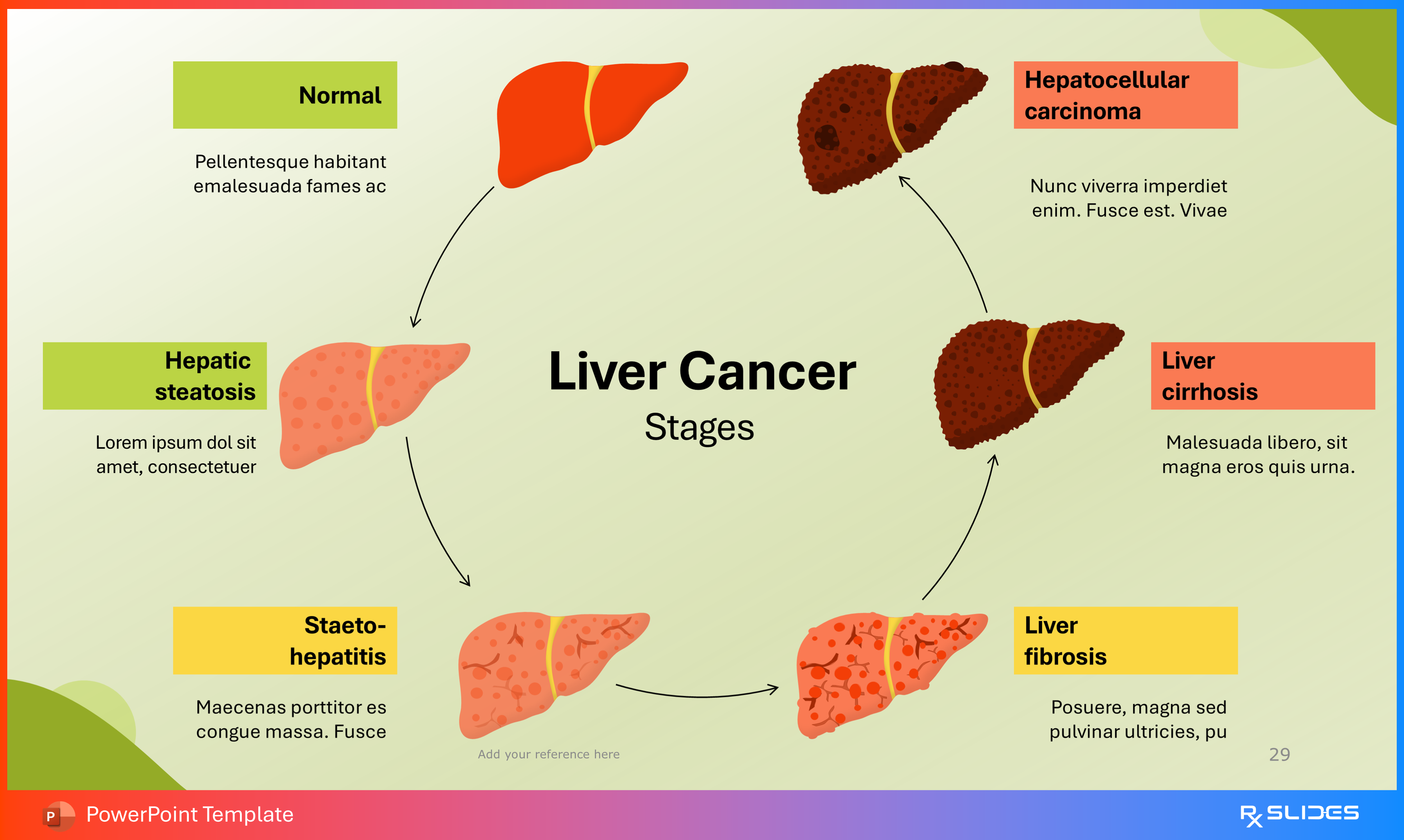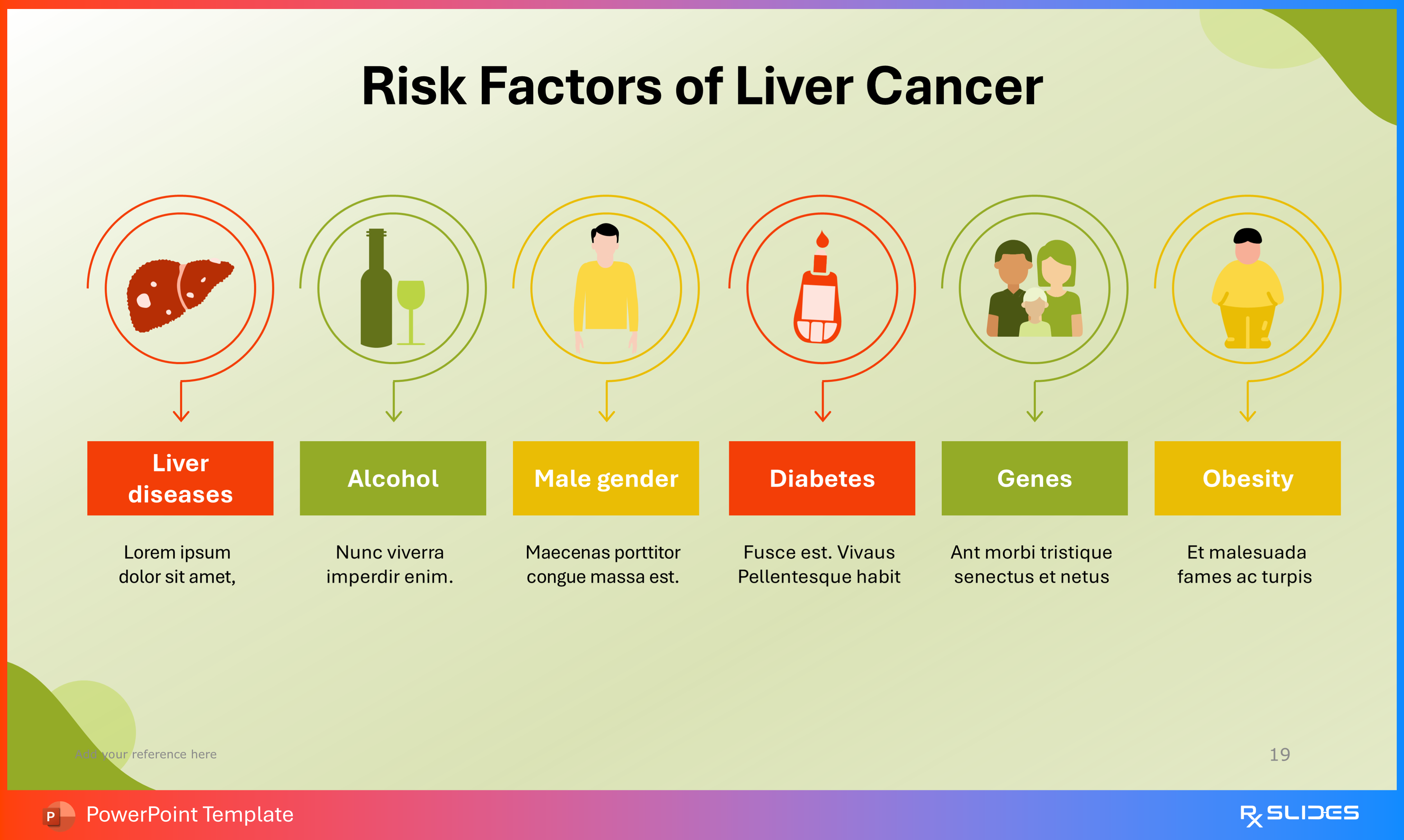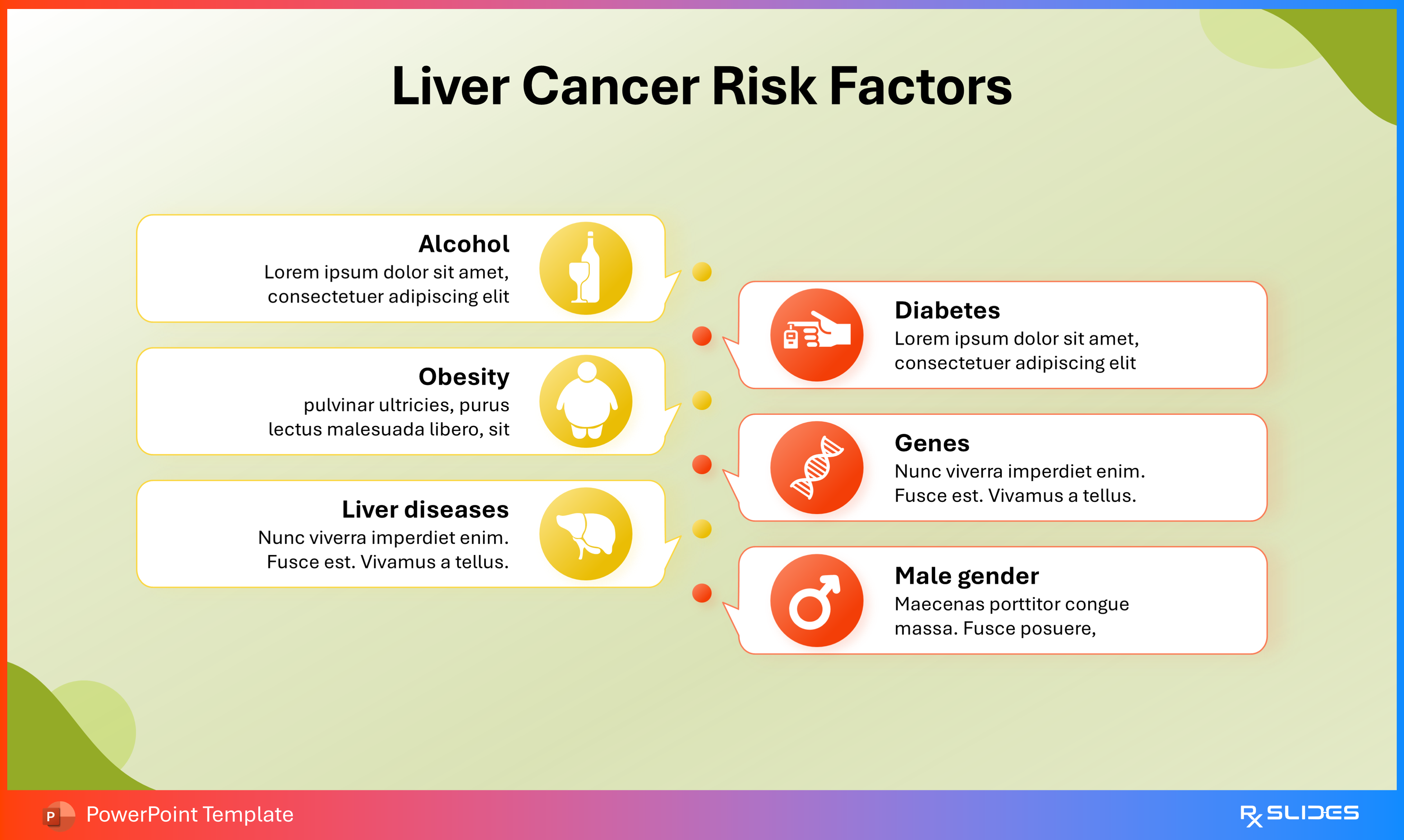 Liver Cancer PowerPoint Template This liver cancer PowerPoint template is a professional, fully editable medical presentation designed for oncologists, hepatologists, and medical educators. This Hepatic Cancer PPT Template has organized slides that explain the anatomy, causes, diagnosis, and treatment, blending accurate science with clear visuals. Ideal for academic lectures, research conferences, or clinical teaching. Key Features Covers the full spectrum: liver anatomy, physiology, epidemiology, pathogenesis, staging, diagnosis, treatment, and follow-up. Professional visuals, including labeled diagrams, infographics, and data charts that enhance audience engagement. The layouts are both editable and adaptable. Works seamlessly with both PowerPoint and Google Slides. Liver Cancer PowerPoint Presentation Template Content Slide 1 - Title Slide Title Slide Clean, medical-themed opening slide with space for presentation title, presenter name, institution, and references. Sets a professional tone for academic or conference sessions. Slide 2 - First Presenter Layout First Presenter Layout Secondary title format allowing alternate logo placement or subtitle lines. Ideal for co-authors or departmental adaptations. Slide 3 - Title Variation Animated Slide Title Variation Animated Slide Third cover option for research seminars or multi-session modules, maintaining consistent brand identity across lectures. Slide 4 - Agenda Agenda Lists main presentation sections—Anatomy, Physiology, Definition, Epidemiology, Risk Factors, Pathogenesis, Diagnosis, Treatment, and Follow-up—to guide audience expectations. Slide 5 - Agenda using liver as bullets Agenda using liver as bullets Uses stylized liver vectors for bullet points, making this layout suitable for adaptation in other hepatic cancer PowerPoint presentations or any liver disease. Slide 6 - Liver Anatomy Section Divider Liver Anatomy Section Divider Transition slide introducing the Anatomy segment with a clean background and strong title emphasis to mark the new section. Slide 7 - Liver Anatomy (Animated Detailed Layout) Liver Anatomy (Animated Detailed Layout) Illustrated diagram labeling key hepatic structures: portal vein, hepatic artery, bile ducts, falciform ligament, diaphragm, and hepatic veins. Supports anatomical orientation before pathology discussion. Slide 8 - Liver Anatomy (Labeled Diagram with Notes) Liver Anatomy (Labeled Diagram with Notes) Expanded visual with editable labels and text boxes for structural annotation—ideal for explaining vascular or biliary pathways. Slide 9 - Liver Physiology Liver Physiology Infographic layout summarizing liver functions: metabolism, detoxification, synthesis, and bile secretion. Editable fields and directional arrows enhance conceptual flow. Slide 10 - Liver Cancer Definition – Section Divider Liver Cancer Definition – Section Divider Marks the start of the Definition and Disease Overview section, maintaining visual continuity and guiding the audience into clinical content. Slide 11 - Liver Cancer Definition Liver Cancer Definition Allows differentiation between primary hepatic malignancies and secondary metastatic lesions. Clean typography and structured text areas enable easy customization to WHO or institutional standards. Slide 12 - Liver Cancer Definition (Animated View) Liver Cancer Definition (Animated View) Animated variant for progressive content reveal. Enhances engagement during lectures explaining disease classification or histologic criteria. Slide 13 - Liver Cancer Epidemiology (Section Divider) Liver Cancer Epidemiology (Section Divider) A visual divider introducing the Epidemiology section, preparing the audience for incidence, prevalence, and survival data. Slide 14 - Liver Cancer Epidemiology & Survival Liver Cancer Epidemiology & Survival Data-driven slide summarizing global and regional incidence, prevalence, and survival rates. Includes editable maps for easy customization. Slide 15 - Liver Cancer Risk Factors (Section Divider) Liver Cancer Risk Factors (Section Divider) Streamlined transitional slide introducing the Risk Factors Part from epidemiologic data to general-level determinants. Slide 16 - Liver Cancer Risk Factors Liver Cancer Risk Factors Introduces the main risk categories contributing to liver cancer, designed for concise overviews in clinical or academic settings. Slide 17 - Risk Factors of Liver Cancer Risk Factors of Liver Cancer Details specific etiologic contributors such as liver diseases, obesity, alcohol use, genetic predisposition, and gender. The clear layout supports quick visual recognition of modifiable vs. non-modifiable risks. Slide 18 - Liver Cancer Risk Factors (Alternate Layout) Liver Cancer Risk Factors (Alternate Layout) Infographic version for hepatic cancer, which you can use in any liver disease presentation. Slide 19 - Risk Factors of Liver Cancer (Alternate Design) Risk Factors of Liver Cancer (Alternate Design) Flexible summary layout for consolidating regional or demographic data before moving to causative mechanisms. Includes editable placeholders for institutional notes. Slide 20 - Liver Cancer Causes (Section Divider) Liver Cancer Causes (Section Divider) A professional divider introduces the Causes and Etiology segment, marking the transition from population-level risks to mechanistic insights. Slide 21 - Liver Cancer Causes Liver Cancer Causes Infographic summarizing principal causes such as viral infections, fatty liver, alcohol, obesity, and medications. Fully editable and visually balanced. Slide 22 – Liver Cancer Pathogenesis (Section Divider) Liver Cancer Pathogenesis (Section Divider) Clean divider marking the transition to the Pathogenesis segment. Features a bold, stylized DNA helix icon set against a modern gradient background. Slide 23 - Liver Cancer Pathogenesis (Cellular/Histologic View) Liver Cancer Pathogenesis (Cellular/Histologic View) Animated visual illustrating cellular transformation and neoplastic 