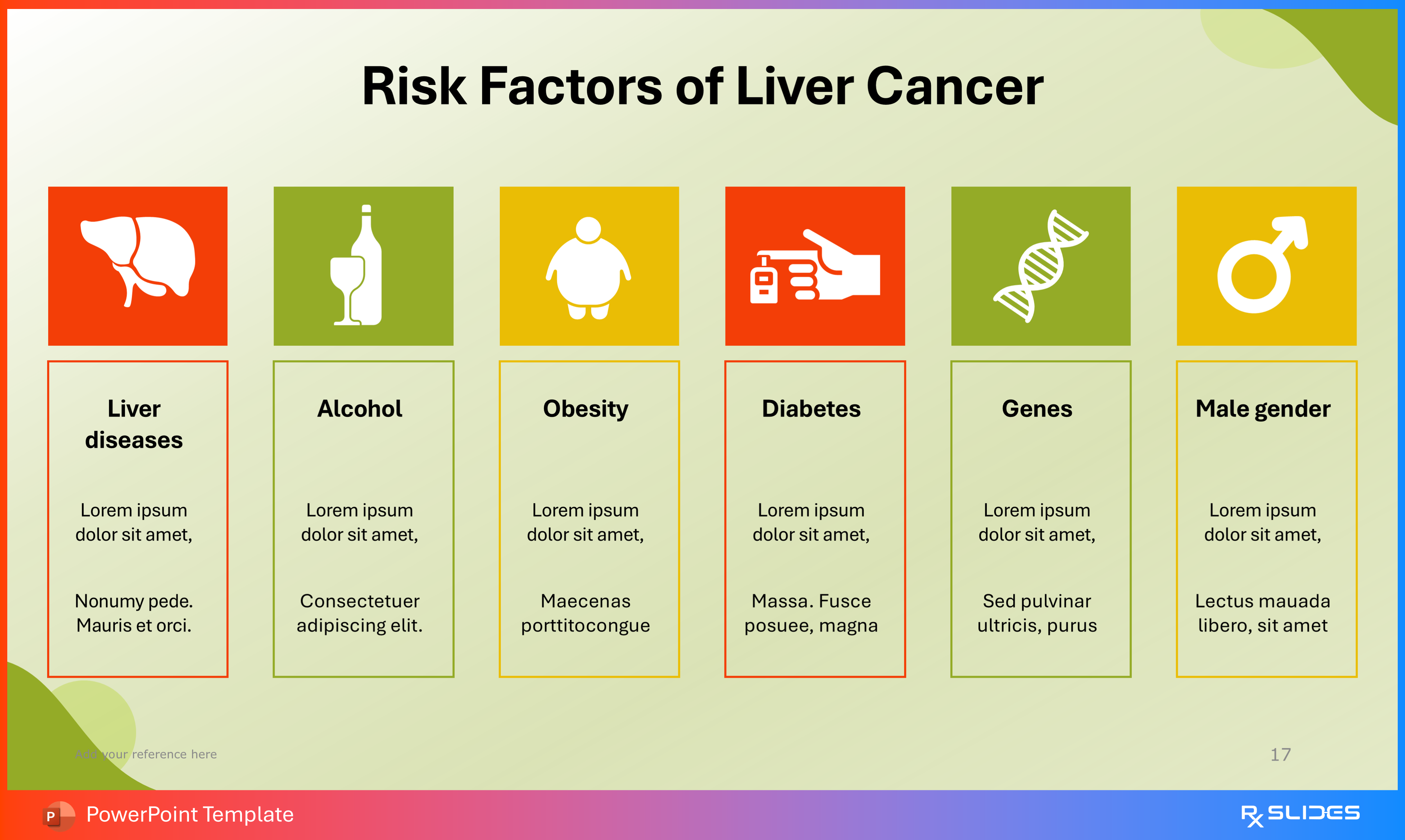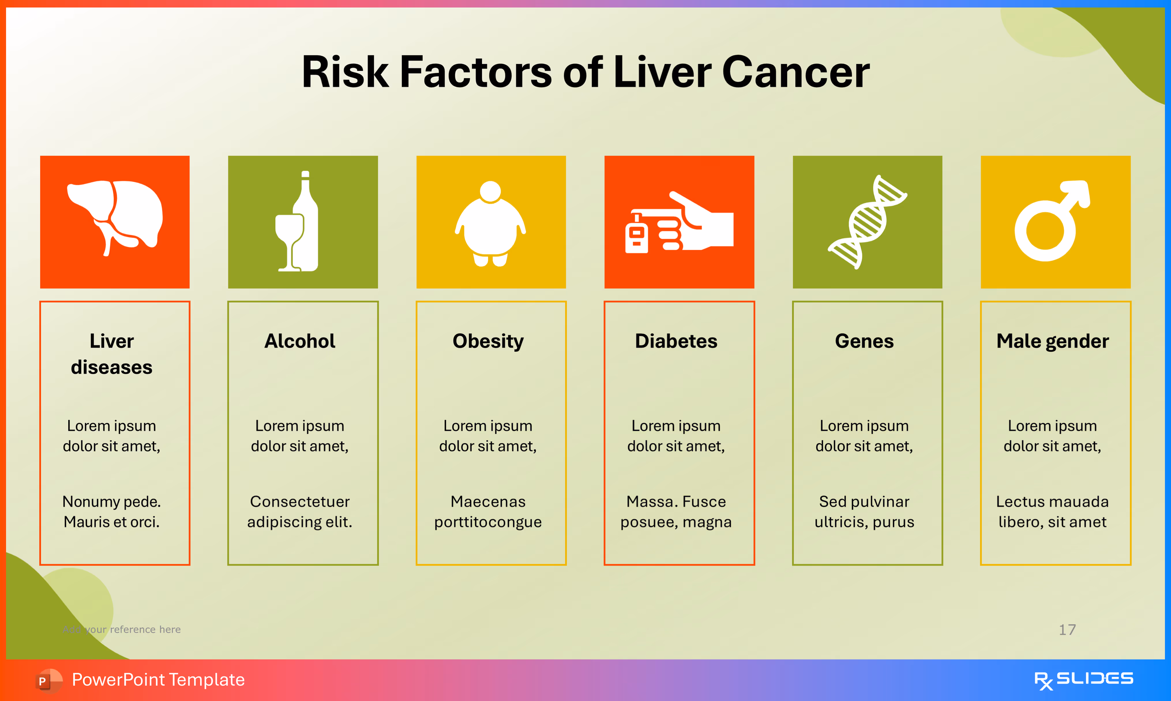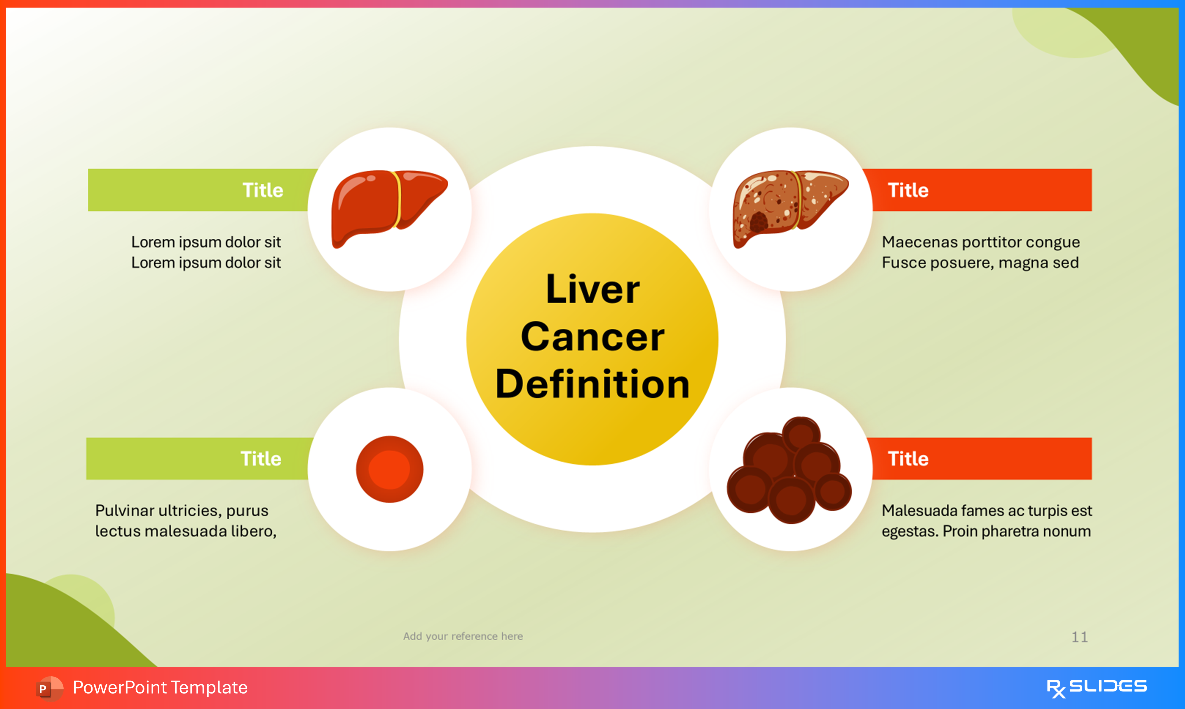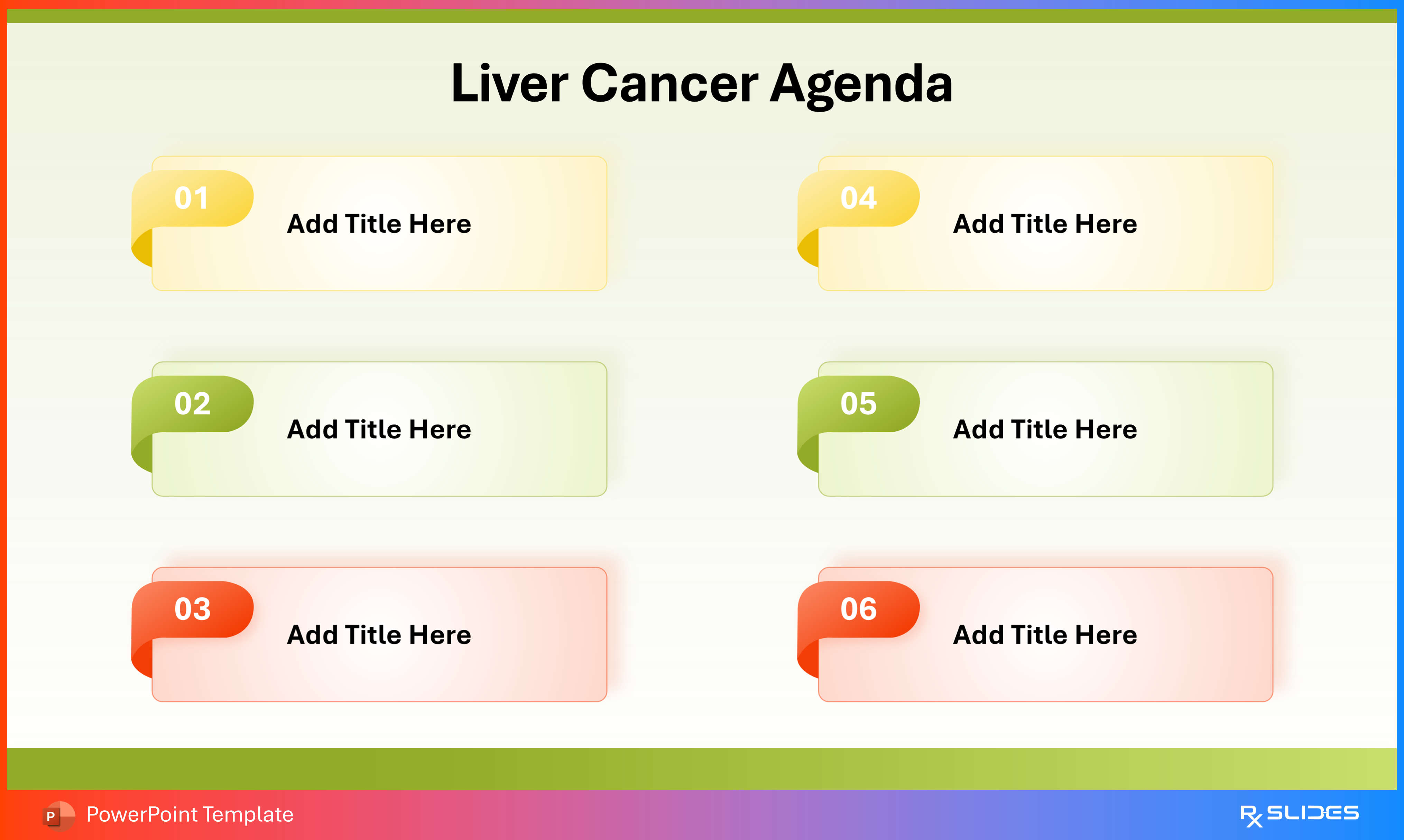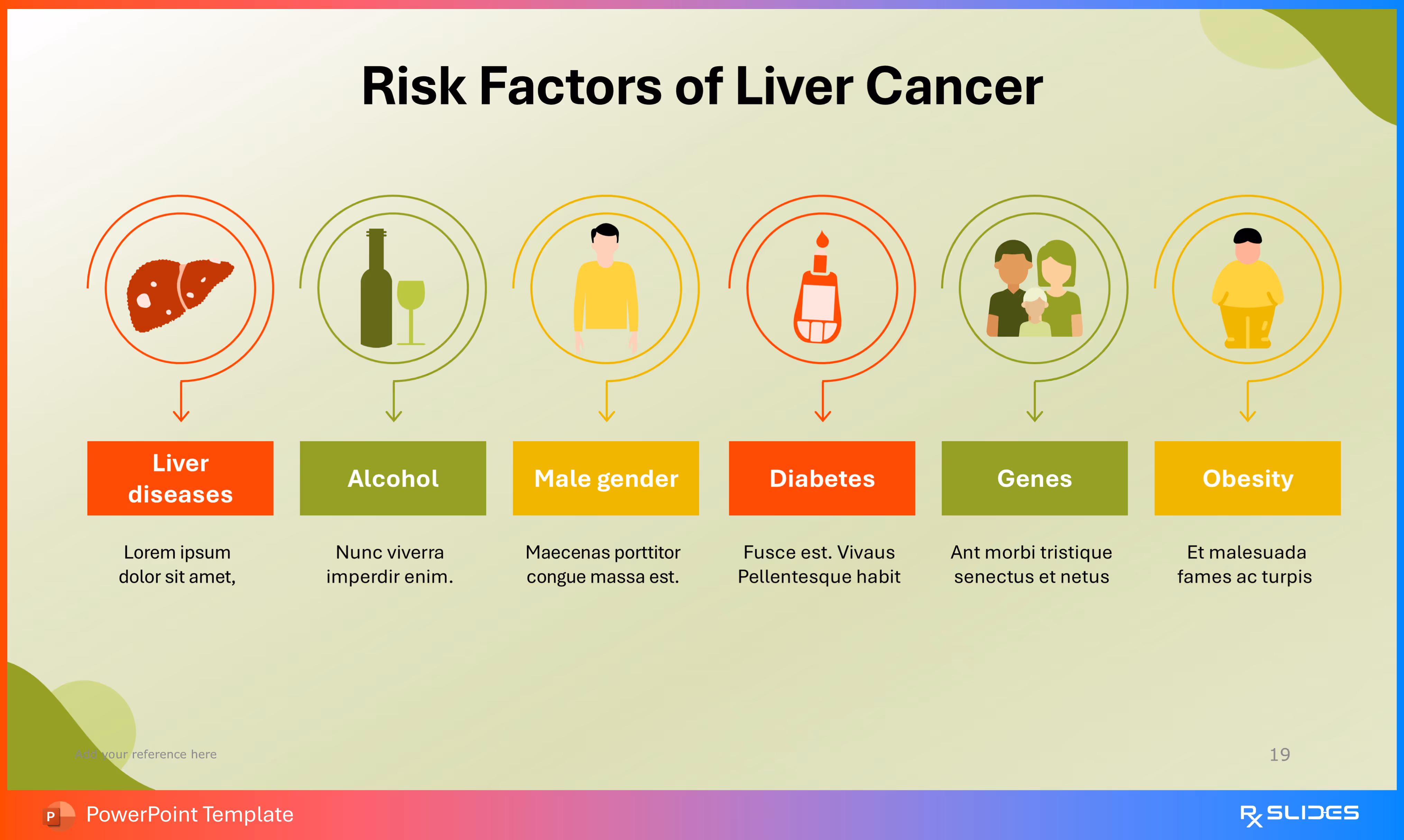 Liver Cancer PowerPoint Template This liver cancer PowerPoint template is a professional, fully editable medical presentation designed for oncologists, hepatologists, and medical educators. This Hepatic Cancer PPT Template has organized slides that explain the anatomy, causes, diagnosis, and treatment, blending accurate science with clear visuals. Ideal for academic lectures, research conferences, or clinical teaching. Key Features Covers the full spectrum: liver anatomy, physiology, epidemiology, pathogenesis, staging, diagnosis, treatment, and follow-up. Professional visuals, including labeled diagrams, infographics, and data charts that enhance audience engagement. The layouts are both editable and adaptable. Works seamlessly with both PowerPoint and Google Slides. Liver Cancer PowerPoint Presentation Template Content Slide 1 - Title Slide Title Slide Clean, medical-themed opening slide with space for presentation title, presenter name, institution, and references. Sets a professional tone for academic or conference sessions. Slide 2 - First Presenter Layout First Presenter Layout Secondary title format allowing alternate logo placement or subtitle lines. Ideal for co-authors or departmental adaptations. Slide 3 - Title Variation Animated Slide Title Variation Animated Slide Third cover option for research seminars or multi-session modules, maintaining consistent brand identity across lectures. Slide 4 - Agenda Agenda Lists main presentation sections—Anatomy, Physiology, Definition, Epidemiology, Risk Factors, Pathogenesis, Diagnosis, Treatment, and Follow-up—to guide audience expectations. Slide 5 - Agenda using liver as bullets Agenda using liver as bullets Uses stylized liver vectors for bullet points, making this layout suitable for adaptation in other hepatic cancer PowerPoint presentations or any liver disease. Slide 6 - Liver Anatomy Section Divider Liver Anatomy Section Divider Transition slide introducing the Anatomy segment with a clean background and strong title emphasis to mark the new section. Slide 7 - Liver Anatomy (Animated Detailed Layout) Liver Anatomy (Animated Detailed Layout) Illustrated diagram labeling key hepatic structures: portal vein, hepatic artery, bile ducts, falciform ligament, diaphragm, and hepatic veins. Supports anatomical orientation before pathology discussion. Slide 8 - Liver Anatomy (Labeled Diagram with Notes) Liver Anatomy (Labeled Diagram with Notes) Expanded visual with editable labels and text boxes for structural annotation—ideal for explaining vascular or biliary pathways. Slide 9 - Liver Physiology Liver Physiology Infographic layout summarizing liver functions: metabolism, detoxification, synthesis, and bile secretion. Editable fields and directional arrows enhance conceptual flow. Slide 10 - Liver Cancer Definition – Section Divider Liver Cancer Definition – Section Divider Marks the start of the Definition and Disease Overview section, maintaining visual continuity and guiding the audience into clinical content. Slide 11 - Liver Cancer Definition Liver Cancer Definition Allows differentiation between primary hepatic malignancies and secondary metastatic lesions. Clean typography and structured text areas enable easy customization to WHO or institutional standards. Slide 12 - Liver Cancer Definition (Animated View) Liver Cancer Definition (Animated View) Animated variant for progressive content reveal. Enhances engagement during lectures explaining disease classification or histologic criteria. Slide 13 - Liver Cancer Epidemiology (Section Divider) Liver Cancer Epidemiology (Section Divider) A visual divider introducing the Epidemiology section, preparing the audience for incidence, prevalence, and survival data. Slide 14 - Liver Cancer Epidemiology & Survival Liver Cancer Epidemiology & Survival Data-driven slide summarizing global and regional incidence, prevalence, and survival rates. Includes editable maps for easy customization. Slide 15 - Liver Cancer Risk Factors (Section Divider) Liver Cancer Risk Factors (Section Divider) Streamlined transitional slide introducing the Risk Factors Part from epidemiologic data to general-level determinants. Slide 16 - Liver Cancer Risk Factors Liver Cancer Risk Factors Introduces the main risk categories contributing to liver cancer, designed for concise overviews in clinical or academic settings. Slide 17 - Risk Factors of Liver Cancer Risk Factors of Liver Cancer Details specific etiologic contributors such as liver diseases, obesity, alcohol use, genetic predisposition, and gender. The clear layout supports quick visual recognition of modifiable vs. non-modifiable risks. Slide 18 - Liver Cancer Risk Factors (Alternate Layout) Liver Cancer Risk Factors (Alternate Layout) Infographic version for hepatic cancer, which you can use in any liver disease presentation. Slide 19 - Risk Factors of Liver Cancer (Alternate Design) Risk Factors of Liver Cancer (Alternate Design) Flexible summary layout for consolidating regional or demographic data before moving to causative mechanisms. Includes editable placeholders for institutional notes. Slide 20 - Liver Cancer Causes (Section Divider) Liver Cancer Causes (Section Divider) A professional divider introduces the Causes and Etiology segment, marking the transition from population-level risks to mechanistic insights. Slide 21 - Liver Cancer Causes Liver Cancer Causes Infographic summarizing principal causes such as viral infections, fatty liver, alcohol, obesity, and medications. Fully editable and visually balanced. Slide 22 – Liver Cancer Pathogenesis (Section Divider) Liver Cancer Pathogenesis (Section Divider) Clean divider marking the transition to the Pathogenesis segment. Features a bold, stylized DNA helix icon set against a modern gradient background. Slide 23 - Liver Cancer Pathogenesis (Cellular/Histologic View) Liver Cancer Pathogenesis (Cellular/Histologic View) Animated visual illustrating cellular transformation and neoplastic 