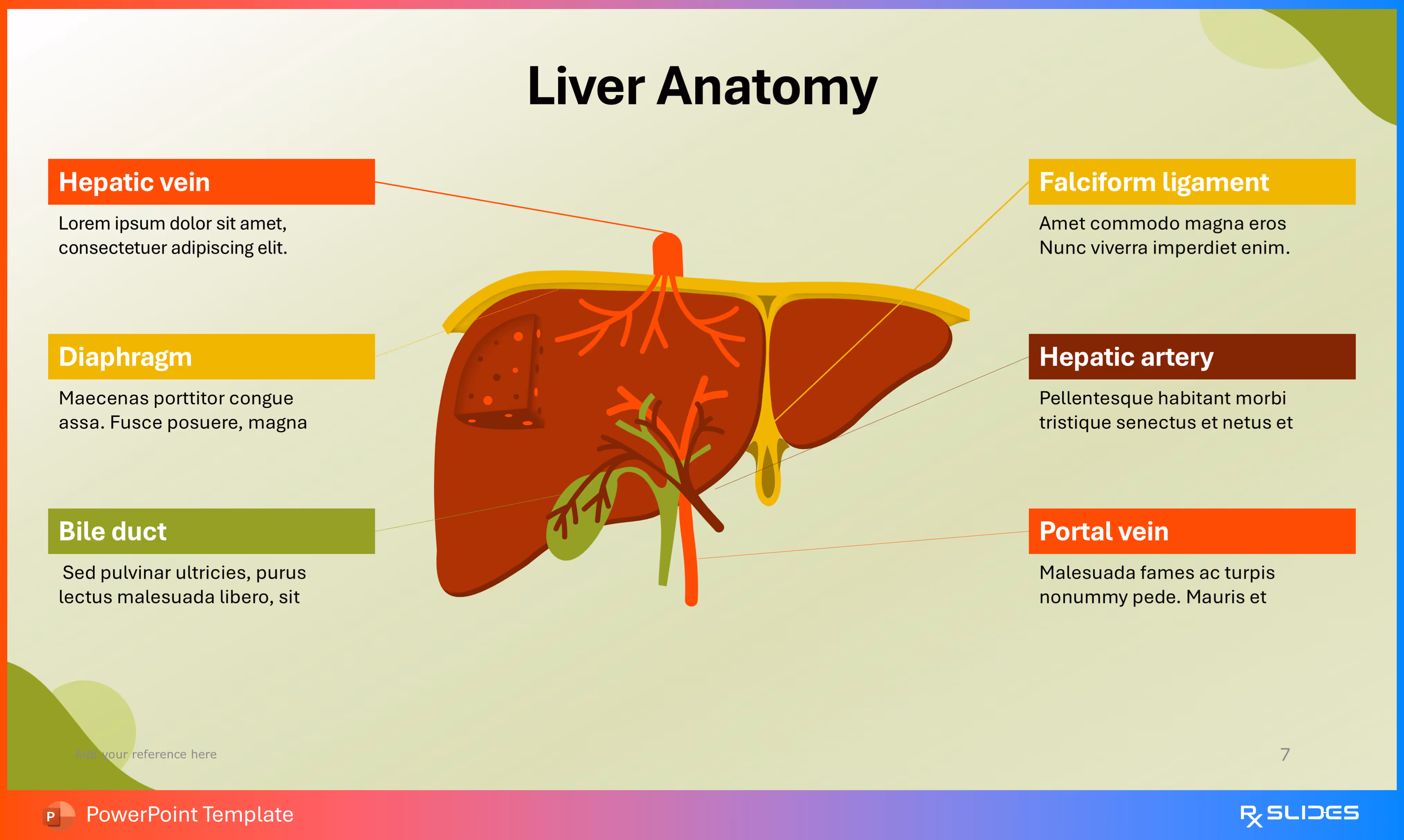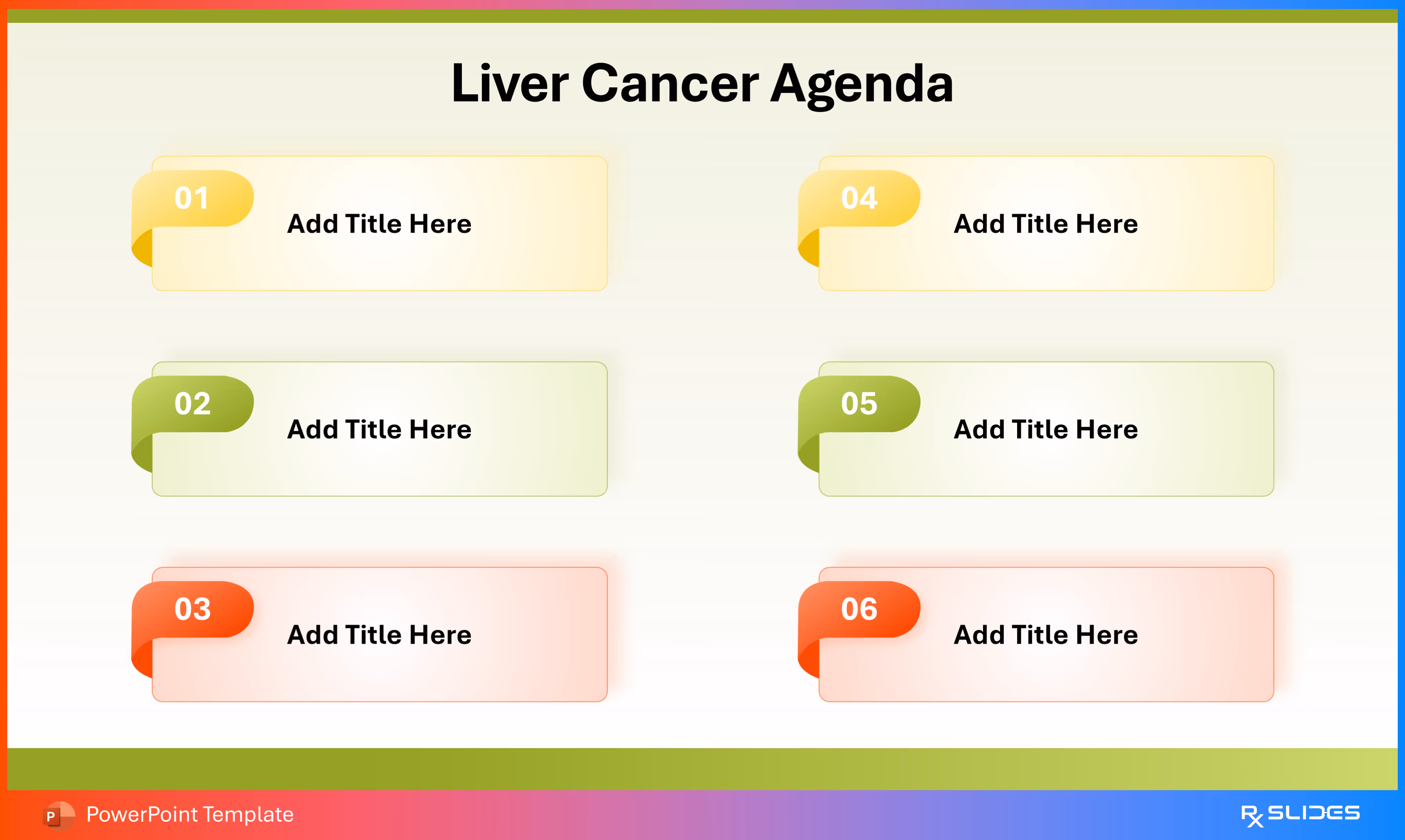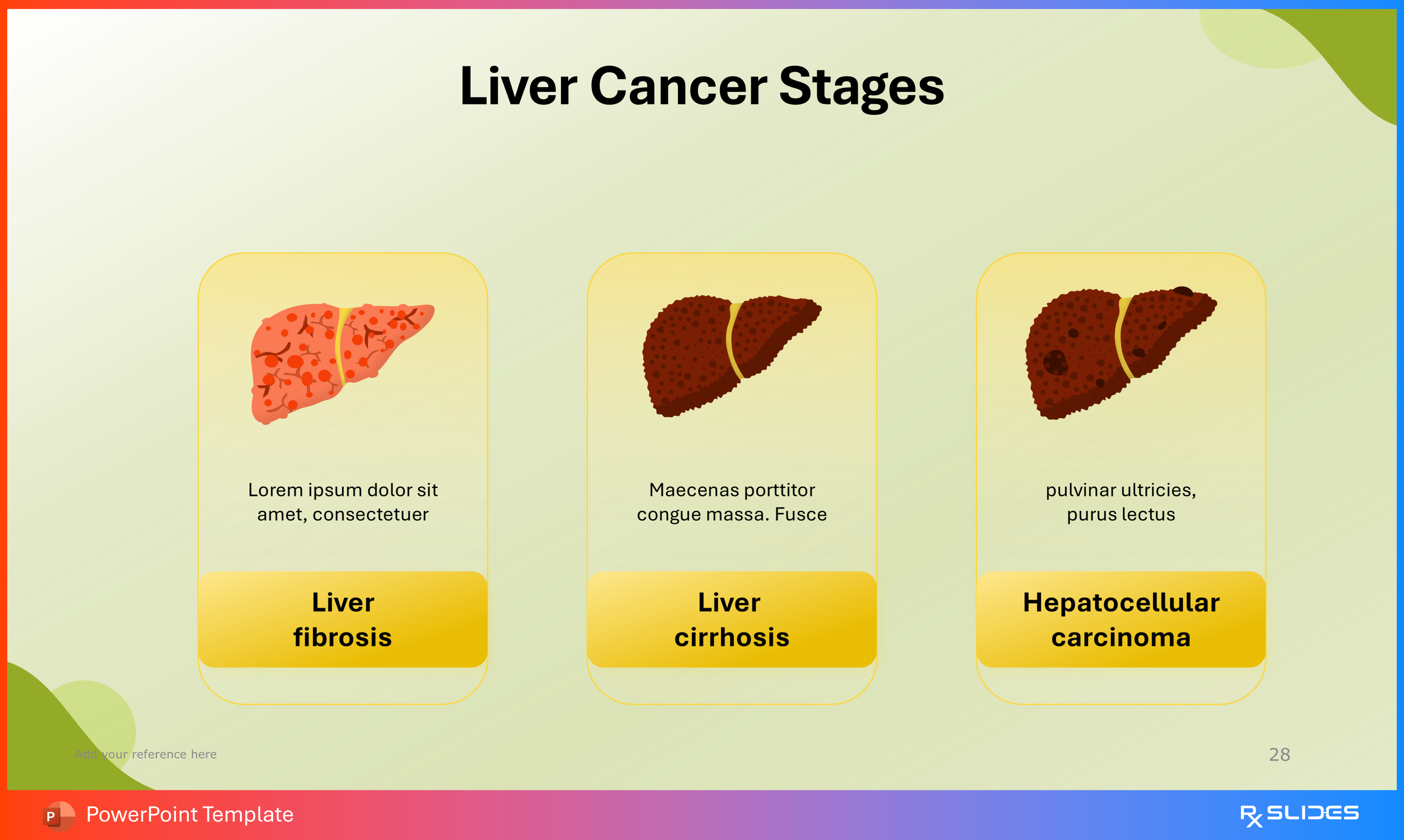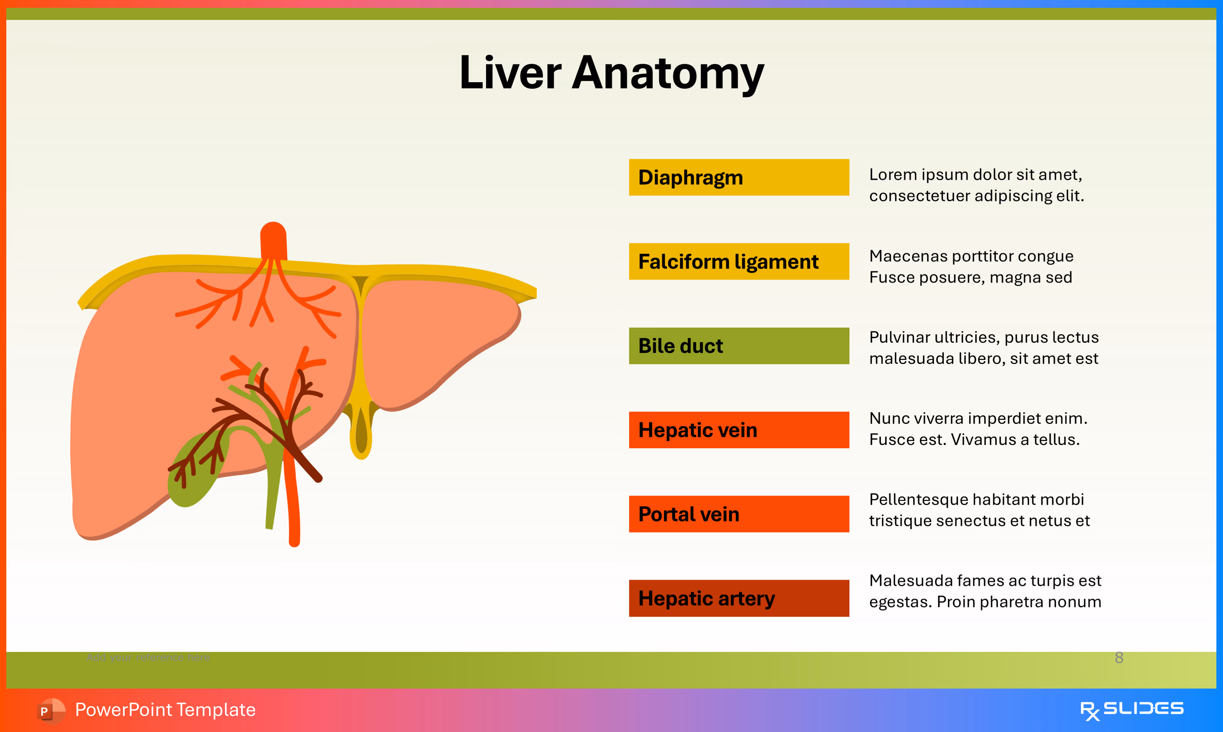 Liver Cancer PowerPoint Template This liver cancer PowerPoint template is a professional, fully editable medical presentation designed for oncologists, hepatologists, and medical educators. This Hepatic Cancer PPT Template has organized slides that explain the anatomy, causes, diagnosis, and treatment, blending accurate science with clear visuals. Ideal for academic lectures, research conferences, or clinical teaching. Key Features Covers the full spectrum: liver anatomy, physiology, epidemiology, pathogenesis, staging, diagnosis, treatment, and follow-up. Professional visuals, including labeled diagrams, infographics, and data charts that enhance audience engagement. The layouts are both editable and adaptable. Works seamlessly with both PowerPoint and Google Slides. Liver Cancer PowerPoint Presentation Template Content Slide 1 - Title Slide Title Slide Clean, medical-themed opening slide with space for presentation title, presenter name, institution, and references. Sets a professional tone for academic or conference sessions. Slide 2 - First Presenter Layout First Presenter Layout Secondary title format allowing alternate logo placement or subtitle lines. Ideal for co-authors or departmental adaptations. Slide 3 - Title Variation Animated Slide Title Variation Animated Slide Third cover option for research seminars or multi-session modules, maintaining consistent brand identity across lectures. Slide 4 - Agenda Agenda Lists main presentation sections—Anatomy, Physiology, Definition, Epidemiology, Risk Factors, Pathogenesis, Diagnosis, Treatment, and Follow-up—to guide audience expectations. Slide 5 - Agenda using liver as bullets Agenda using liver as bullets Uses stylized liver vectors for bullet points, making this layout suitable for adaptation in other hepatic cancer PowerPoint presentations or any liver disease. Slide 6 - Liver Anatomy Section Divider Liver Anatomy Section Divider Transition slide introducing the Anatomy segment with a clean background and strong title emphasis to mark the new section. Slide 7 - Liver Anatomy (Animated Detailed Layout) Liver Anatomy (Animated Detailed Layout) Illustrated diagram labeling key hepatic structures: portal vein, hepatic artery, bile ducts, falciform ligament, diaphragm, and hepatic veins. Supports anatomical orientation before pathology discussion. Slide 8 - Liver Anatomy (Labeled Diagram with Notes) Liver Anatomy (Labeled Diagram with Notes) Expanded visual with editable labels and text boxes for structural annotation—ideal for explaining vascular or biliary pathways. Slide 9 - Liver Physiology Liver Physiology Infographic layout summarizing liver functions: metabolism, detoxification, synthesis, and bile secretion. Editable fields and directional arrows enhance conceptual flow. Slide 10 - Liver Cancer Definition – Section Divider Liver Cancer Definition – Section Divider Marks the start of the Definition and Disease Overview section, maintaining visual continuity and guiding the audience into clinical content. Slide 11 - Liver Cancer Definition Liver Cancer Definition Allows differentiation between primary hepatic malignancies and secondary metastatic lesions. Clean typography and structured text areas enable easy customization to WHO or institutional standards. Slide 12 - Liver Cancer Definition (Animated View) Liver Cancer Definition (Animated View) Animated variant for progressive content reveal. Enhances engagement during lectures explaining disease classification or histologic criteria. Slide 13 - Liver Cancer Epidemiology (Section Divider) Liver Cancer Epidemiology (Section Divider) A visual divider introducing the Epidemiology section, preparing the audience for incidence, prevalence, and survival data. Slide 14 - Liver Cancer Epidemiology & Survival Liver Cancer Epidemiology & Survival Data-driven slide summarizing global and regional incidence, prevalence, and survival rates. Includes editable maps for easy customization. Slide 15 - Liver Cancer Risk Factors (Section Divider) Liver Cancer Risk Factors (Section Divider) Streamlined transitional slide introducing the Risk Factors Part from epidemiologic data to general-level determinants. Slide 16 - Liver Cancer Risk Factors Liver Cancer Risk Factors Introduces the main risk categories contributing to liver cancer, designed for concise overviews in clinical or academic settings. Slide 17 - Risk Factors of Liver Cancer Risk Factors of Liver Cancer Details specific etiologic contributors such as liver diseases, obesity, alcohol use, genetic predisposition, and gender. The clear layout supports quick visual recognition of modifiable vs. non-modifiable risks. Slide 18 - Liver Cancer Risk Factors (Alternate Layout) Liver Cancer Risk Factors (Alternate Layout) Infographic version for hepatic cancer, which you can use in any liver disease presentation. Slide 19 - Risk Factors of Liver Cancer (Alternate Design) Risk Factors of Liver Cancer (Alternate Design) Flexible summary layout for consolidating regional or demographic data before moving to causative mechanisms. Includes editable placeholders for institutional notes. Slide 20 - Liver Cancer Causes (Section Divider) Liver Cancer Causes (Section Divider) A professional divider introduces the Causes and Etiology segment, marking the transition from population-level risks to mechanistic insights. Slide 21 - Liver Cancer Causes Liver Cancer Causes Infographic summarizing principal causes such as viral infections, fatty liver, alcohol, obesity, and medications. Fully editable and visually balanced. Slide 22 – Liver Cancer Pathogenesis (Section Divider) Liver Cancer Pathogenesis (Section Divider) Clean divider marking the transition to the Pathogenesis segment. Features a bold, stylized DNA helix icon set against a modern gradient background. Slide 23 - Liver Cancer Pathogenesis (Cellular/Histologic View) Liver Cancer Pathogenesis (Cellular/Histologic View) Animated visual illustrating cellular transformation and neoplastic 