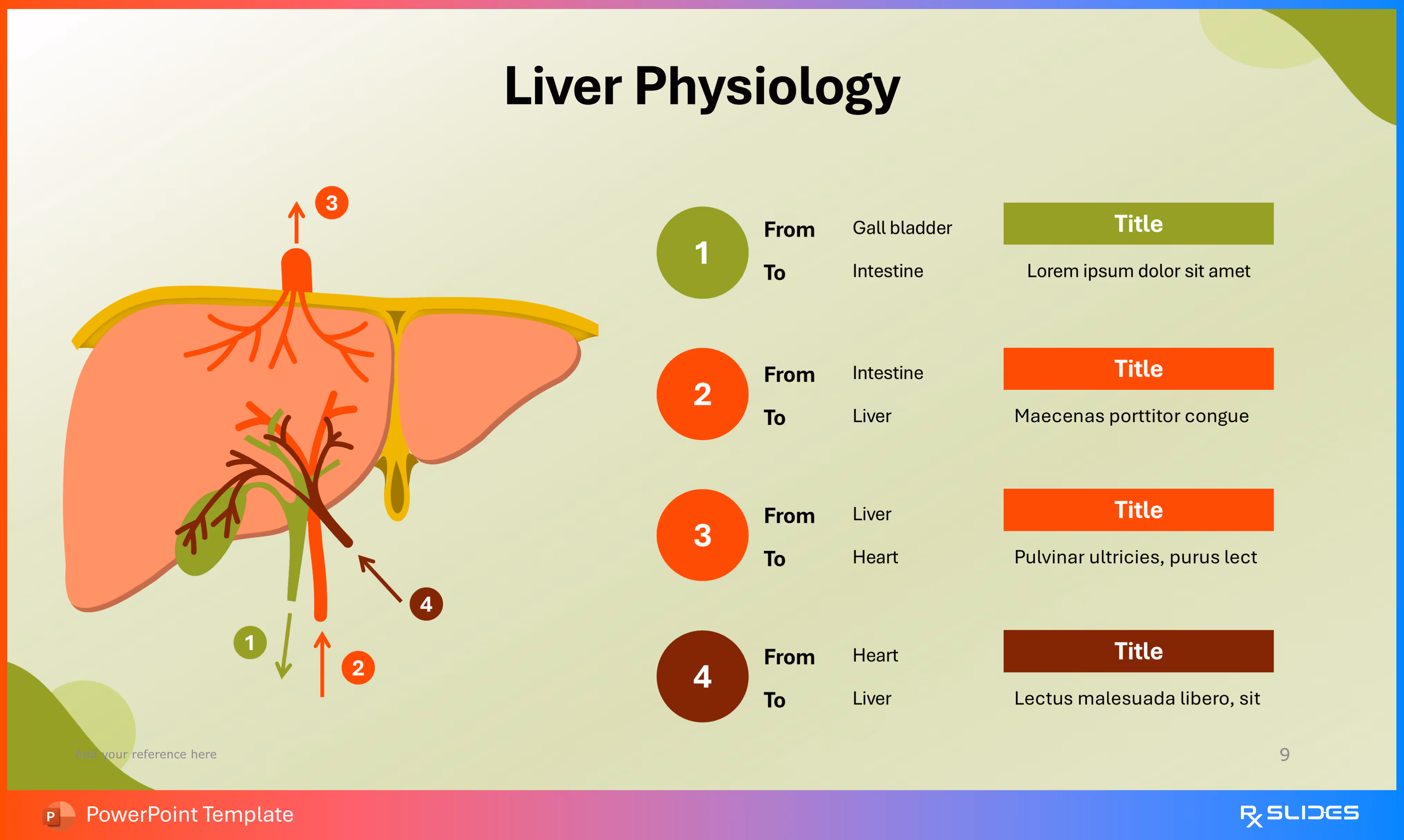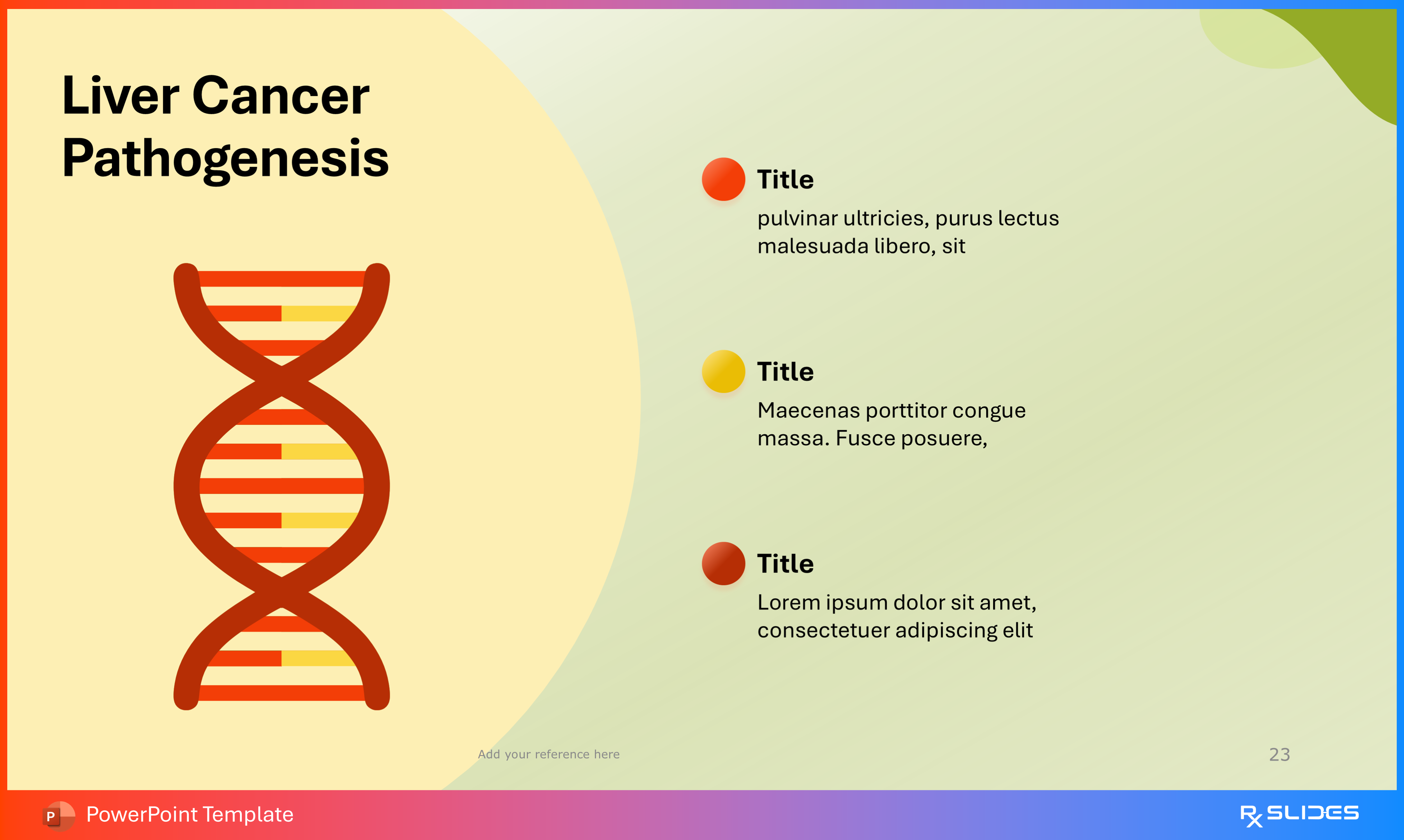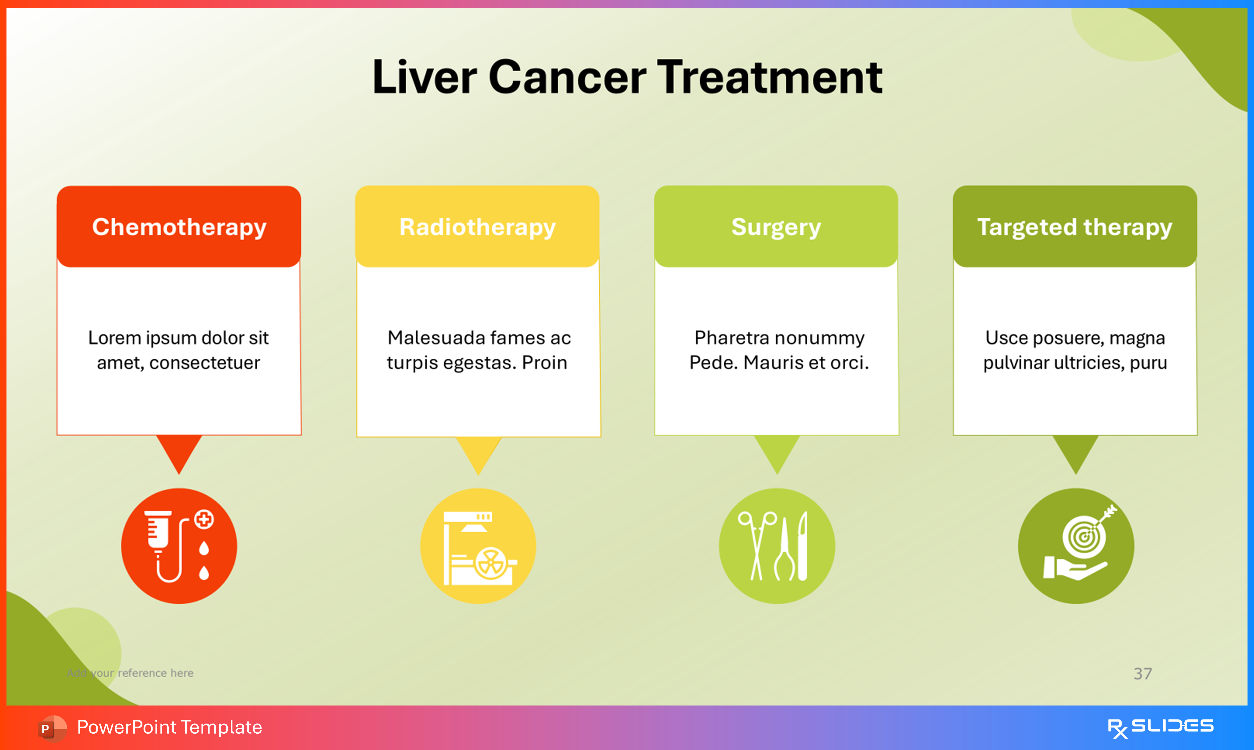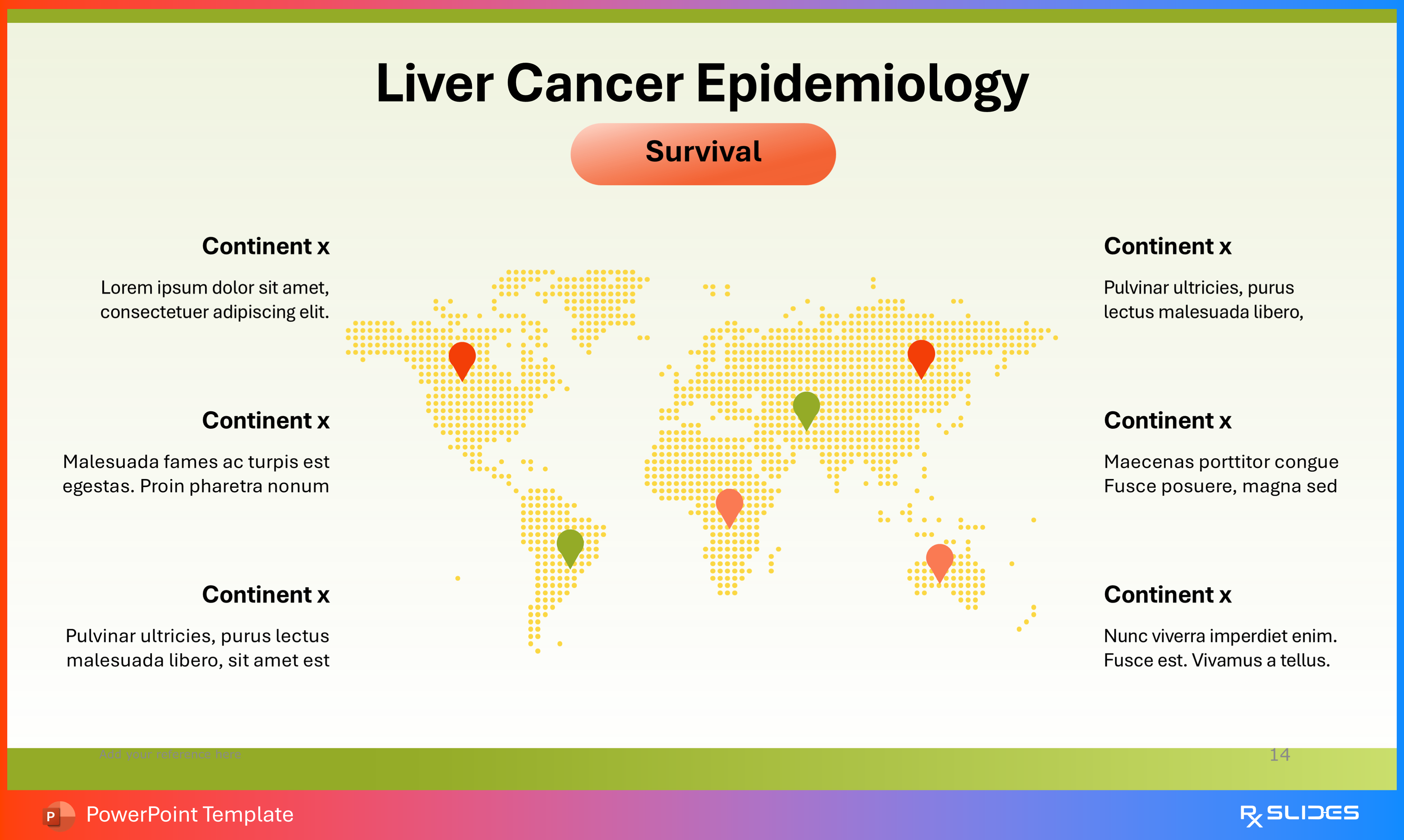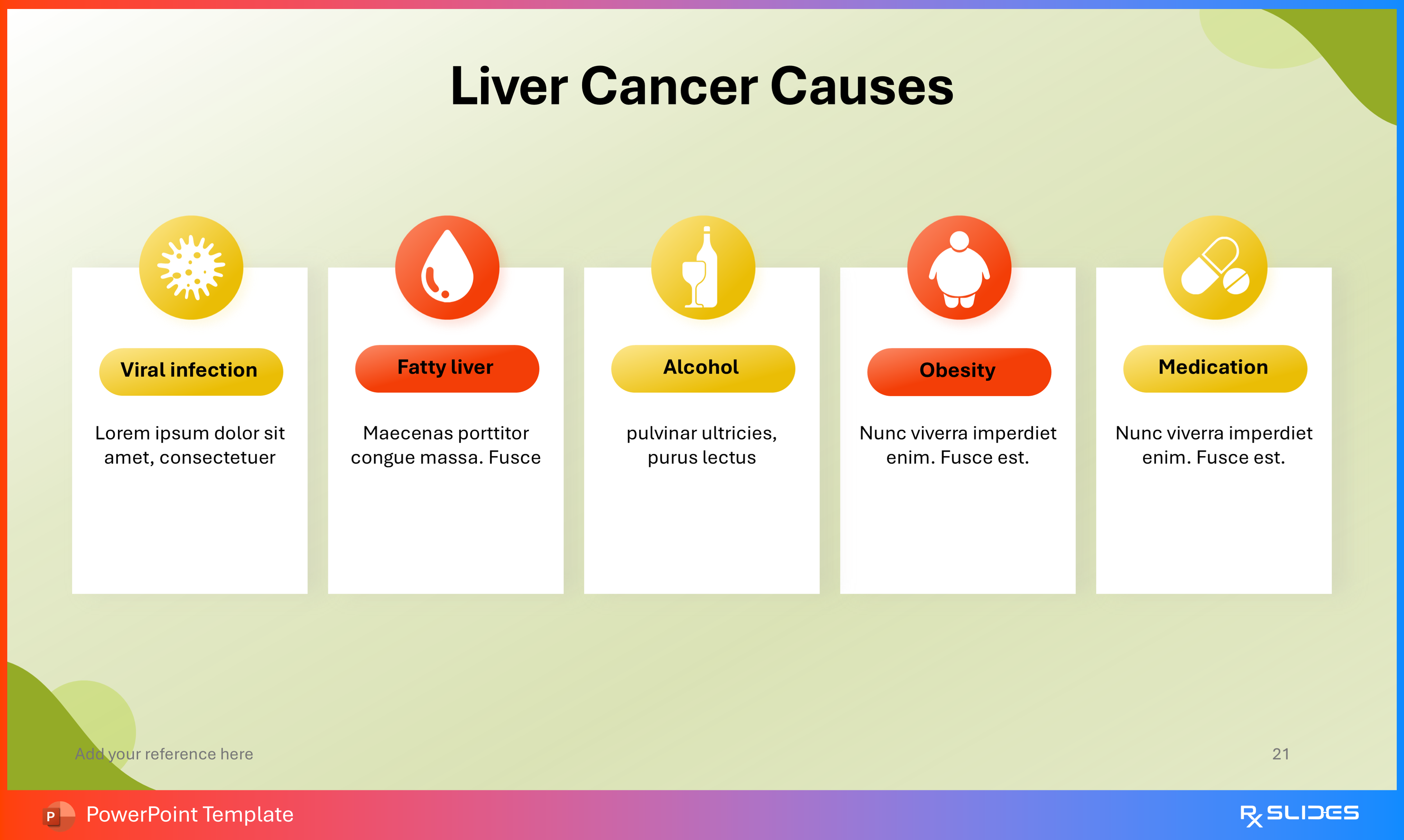 Liver Cancer PowerPoint Template This liver cancer PowerPoint template is a professional, fully editable medical presentation designed for oncologists, hepatologists, and medical educators. This Hepatic Cancer PPT Template has organized slides that explain the anatomy, causes, diagnosis, and treatment, blending accurate science with clear visuals. Ideal for academic lectures, research conferences, or clinical teaching. Key Features Covers the full spectrum: liver anatomy, physiology, epidemiology, pathogenesis, staging, diagnosis, treatment, and follow-up. Professional visuals, including labeled diagrams, infographics, and data charts that enhance audience engagement. The layouts are both editable and adaptable. Works seamlessly with both PowerPoint and Google Slides. Liver Cancer PowerPoint Presentation Template Content Slide 1 - Title Slide Title Slide Clean, medical-themed opening slide with space for presentation title, presenter name, institution, and references. Sets a professional tone for academic or conference sessions. Slide 2 - First Presenter Layout First Presenter Layout Secondary title format allowing alternate logo placement or subtitle lines. Ideal for co-authors or departmental adaptations. Slide 3 - Title Variation Animated Slide Title Variation Animated Slide Third cover option for research seminars or multi-session modules, maintaining consistent brand identity across lectures. Slide 4 - Agenda Agenda Lists main presentation sections—Anatomy, Physiology, Definition, Epidemiology, Risk Factors, Pathogenesis, Diagnosis, Treatment, and Follow-up—to guide audience expectations. Slide 5 - Agenda using liver as bullets Agenda using liver as bullets Uses stylized liver vectors for bullet points, making this layout suitable for adaptation in other hepatic cancer PowerPoint presentations or any liver disease. Slide 6 - Liver Anatomy Section Divider Liver Anatomy Section Divider Transition slide introducing the Anatomy segment with a clean background and strong title emphasis to mark the new section. Slide 7 - Liver Anatomy (Animated Detailed Layout) Liver Anatomy (Animated Detailed Layout) Illustrated diagram labeling key hepatic structures: portal vein, hepatic artery, bile ducts, falciform ligament, diaphragm, and hepatic veins. Supports anatomical orientation before pathology discussion. Slide 8 - Liver Anatomy (Labeled Diagram with Notes) Liver Anatomy (Labeled Diagram with Notes) Expanded visual with editable labels and text boxes for structural annotation—ideal for explaining vascular or biliary pathways. Slide 9 - Liver Physiology Liver Physiology Infographic layout summarizing liver functions: metabolism, detoxification, synthesis, and bile secretion. Editable fields and directional arrows enhance conceptual flow. Slide 10 - Liver Cancer Definition – Section Divider Liver Cancer Definition – Section Divider Marks the start of the Definition and Disease Overview section, maintaining visual continuity and guiding the audience into clinical content. Slide 11 - Liver Cancer Definition Liver Cancer Definition Allows differentiation between primary hepatic malignancies and secondary metastatic lesions. Clean typography and structured text areas enable easy customization to WHO or institutional standards. Slide 12 - Liver Cancer Definition (Animated View) Liver Cancer Definition (Animated View) Animated variant for progressive content reveal. Enhances engagement during lectures explaining disease classification or histologic criteria. Slide 13 - Liver Cancer Epidemiology (Section Divider) Liver Cancer Epidemiology (Section Divider) A visual divider introducing the Epidemiology section, preparing the audience for incidence, prevalence, and survival data. Slide 14 - Liver Cancer Epidemiology & Survival Liver Cancer Epidemiology & Survival Data-driven slide summarizing global and regional incidence, prevalence, and survival rates. Includes editable maps for easy customization. Slide 15 - Liver Cancer Risk Factors (Section Divider) Liver Cancer Risk Factors (Section Divider) Streamlined transitional slide introducing the Risk Factors Part from epidemiologic data to general-level determinants. Slide 16 - Liver Cancer Risk Factors Liver Cancer Risk Factors Introduces the main risk categories contributing to liver cancer, designed for concise overviews in clinical or academic settings. Slide 17 - Risk Factors of Liver Cancer Risk Factors of Liver Cancer Details specific etiologic contributors such as liver diseases, obesity, alcohol use, genetic predisposition, and gender. The clear layout supports quick visual recognition of modifiable vs. non-modifiable risks. Slide 18 - Liver Cancer Risk Factors (Alternate Layout) Liver Cancer Risk Factors (Alternate Layout) Infographic version for hepatic cancer, which you can use in any liver disease presentation. Slide 19 - Risk Factors of Liver Cancer (Alternate Design) Risk Factors of Liver Cancer (Alternate Design) Flexible summary layout for consolidating regional or demographic data before moving to causative mechanisms. Includes editable placeholders for institutional notes. Slide 20 - Liver Cancer Causes (Section Divider) Liver Cancer Causes (Section Divider) A professional divider introduces the Causes and Etiology segment, marking the transition from population-level risks to mechanistic insights. Slide 21 - Liver Cancer Causes Liver Cancer Causes Infographic summarizing principal causes such as viral infections, fatty liver, alcohol, obesity, and medications. Fully editable and visually balanced. Slide 22 – Liver Cancer Pathogenesis (Section Divider) Liver Cancer Pathogenesis (Section Divider) Clean divider marking the transition to the Pathogenesis segment. Features a bold, stylized DNA helix icon set against a modern gradient background. Slide 23 - Liver Cancer Pathogenesis (Cellular/Histologic View) Liver Cancer Pathogenesis (Cellular/Histologic View) Animated visual illustrating cellular transformation and neoplastic 