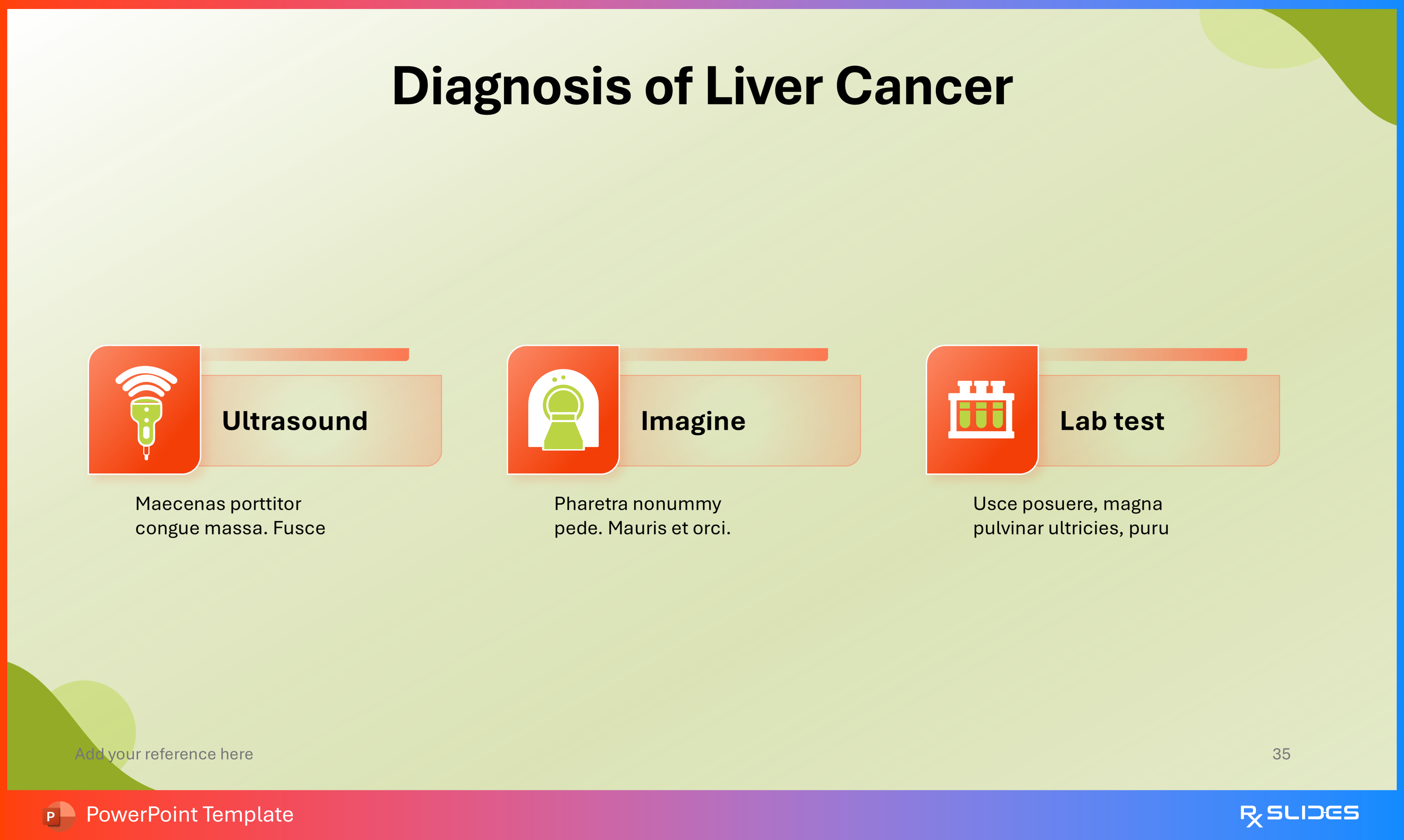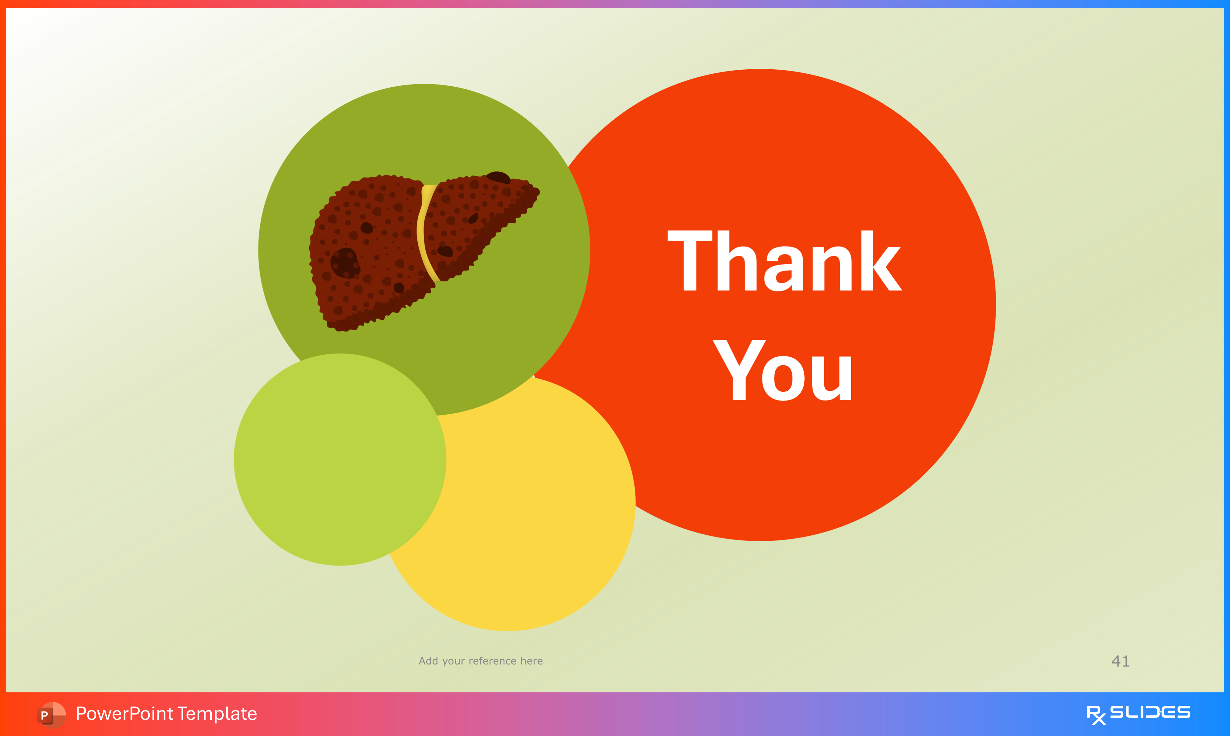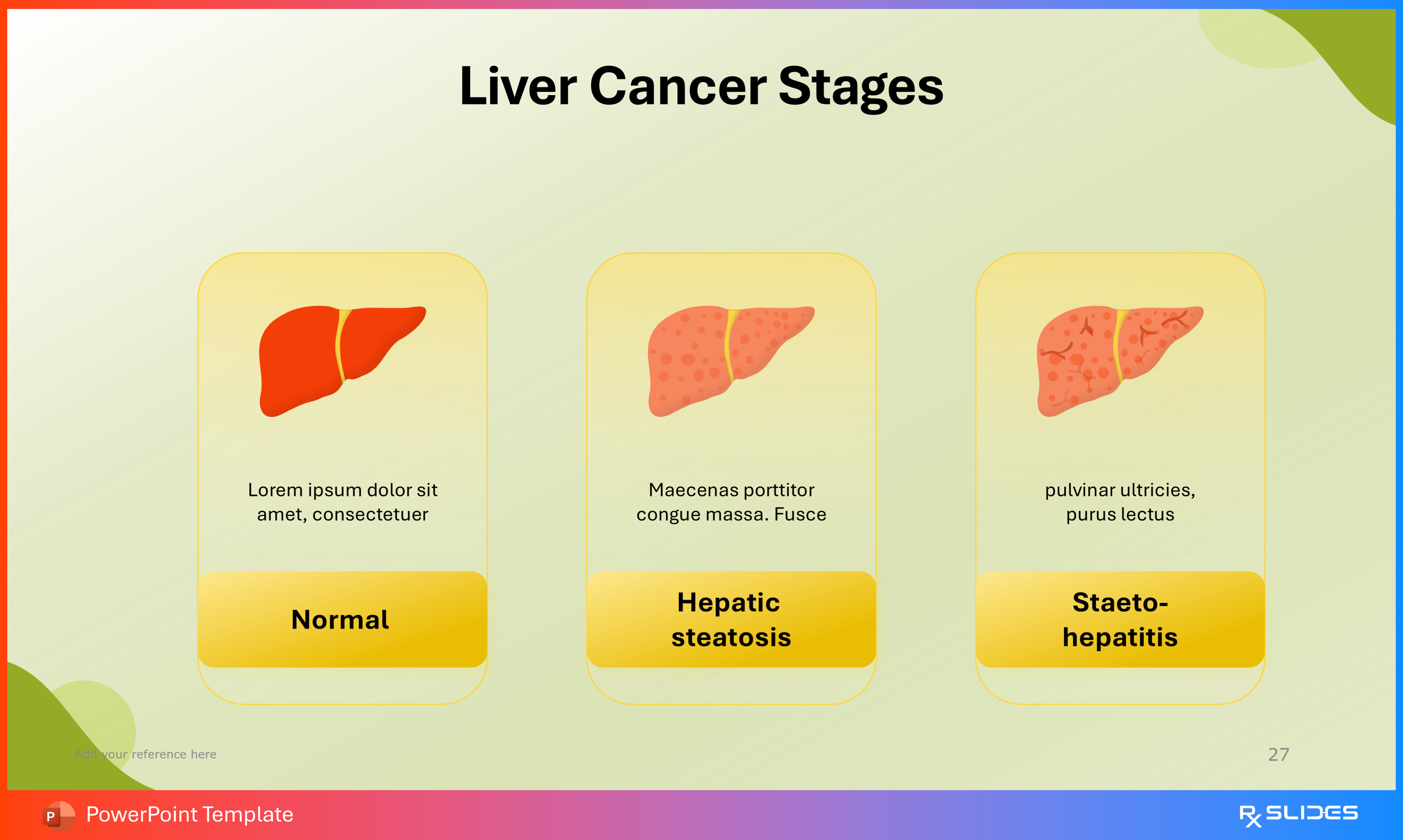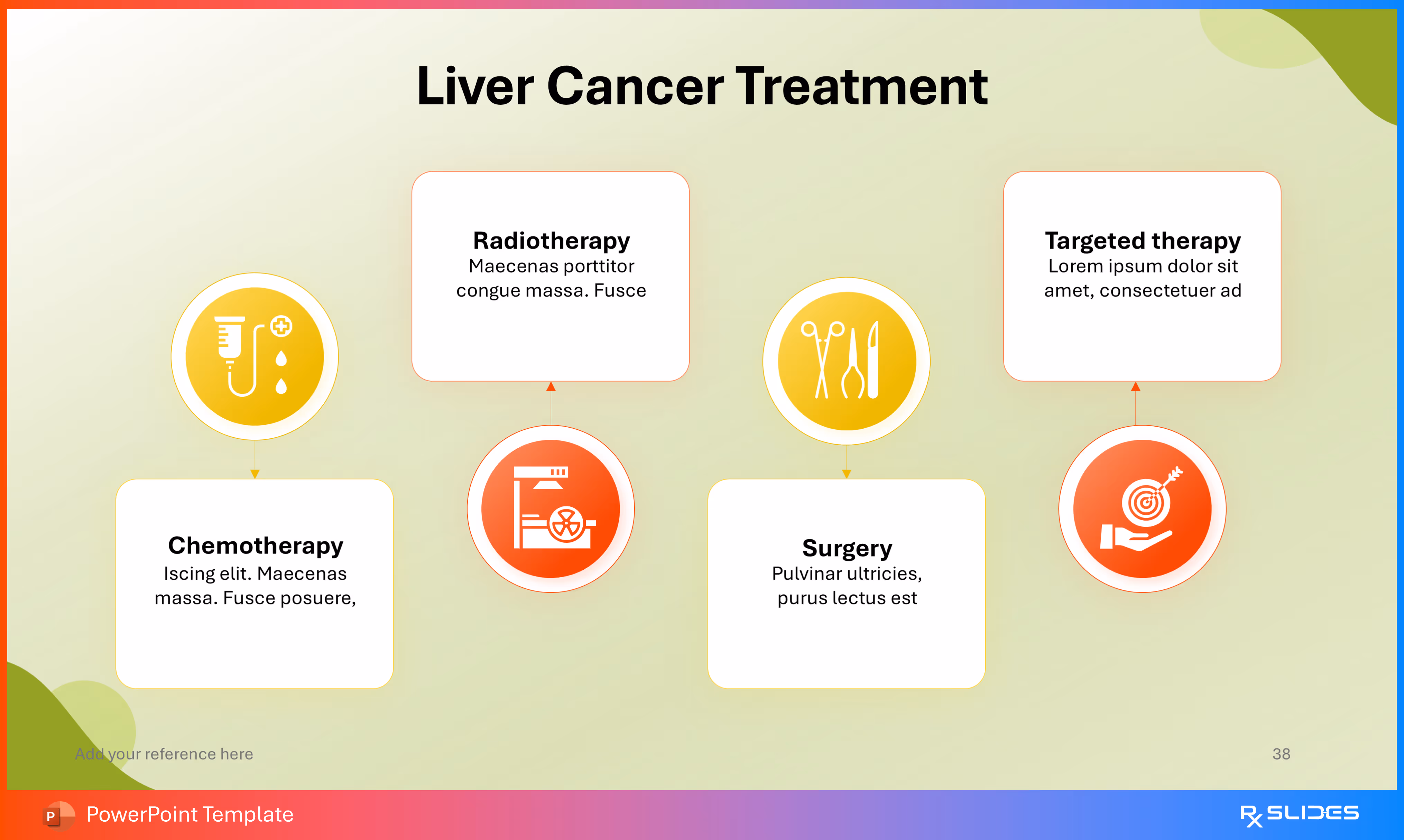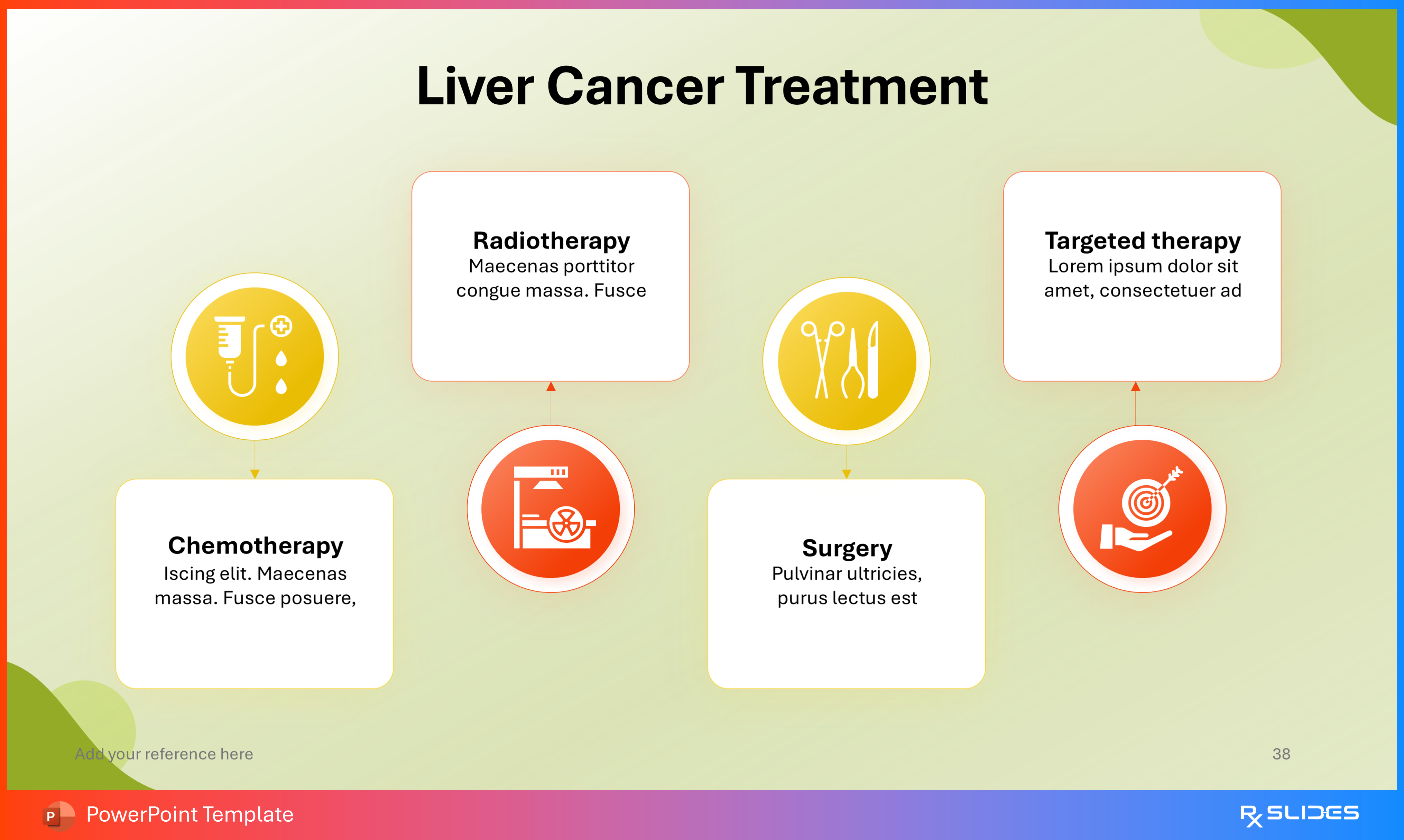 Liver Cancer PowerPoint Template This liver cancer PowerPoint template is a professional, fully editable medical presentation designed for oncologists, hepatologists, and medical educators. This Hepatic Cancer PPT Template has organized slides that explain the anatomy, causes, diagnosis, and treatment, blending accurate science with clear visuals. Ideal for academic lectures, research conferences, or clinical teaching. Key Features Covers the full spectrum: liver anatomy, physiology, epidemiology, pathogenesis, staging, diagnosis, treatment, and follow-up. Professional visuals, including labeled diagrams, infographics, and data charts that enhance audience engagement. The layouts are both editable and adaptable. Works seamlessly with both PowerPoint and Google Slides. Liver Cancer PowerPoint Presentation Template Content Slide 1 - Title Slide Title Slide Clean, medical-themed opening slide with space for presentation title, presenter name, institution, and references. Sets a professional tone for academic or conference sessions. Slide 2 - First Presenter Layout First Presenter Layout Secondary title format allowing alternate logo placement or subtitle lines. Ideal for co-authors or departmental adaptations. Slide 3 - Title Variation Animated Slide Title Variation Animated Slide Third cover option for research seminars or multi-session modules, maintaining consistent brand identity across lectures. Slide 4 - Agenda Agenda Lists main presentation sections—Anatomy, Physiology, Definition, Epidemiology, Risk Factors, Pathogenesis, Diagnosis, Treatment, and Follow-up—to guide audience expectations. Slide 5 - Agenda using liver as bullets Agenda using liver as bullets Uses stylized liver vectors for bullet points, making this layout suitable for adaptation in other hepatic cancer PowerPoint presentations or any liver disease. Slide 6 - Liver Anatomy Section Divider Liver Anatomy Section Divider Transition slide introducing the Anatomy segment with a clean background and strong title emphasis to mark the new section. Slide 7 - Liver Anatomy (Animated Detailed Layout) Liver Anatomy (Animated Detailed Layout) Illustrated diagram labeling key hepatic structures: portal vein, hepatic artery, bile ducts, falciform ligament, diaphragm, and hepatic veins. Supports anatomical orientation before pathology discussion. Slide 8 - Liver Anatomy (Labeled Diagram with Notes) Liver Anatomy (Labeled Diagram with Notes) Expanded visual with editable labels and text boxes for structural annotation—ideal for explaining vascular or biliary pathways. Slide 9 - Liver Physiology Liver Physiology Infographic layout summarizing liver functions: metabolism, detoxification, synthesis, and bile secretion. Editable fields and directional arrows enhance conceptual flow. Slide 10 - Liver Cancer Definition – Section Divider Liver Cancer Definition – Section Divider Marks the start of the Definition and Disease Overview section, maintaining visual continuity and guiding the audience into clinical content. Slide 11 - Liver Cancer Definition Liver Cancer Definition Allows differentiation between primary hepatic malignancies and secondary metastatic lesions. Clean typography and structured text areas enable easy customization to WHO or institutional standards. Slide 12 - Liver Cancer Definition (Animated View) Liver Cancer Definition (Animated View) Animated variant for progressive content reveal. Enhances engagement during lectures explaining disease classification or histologic criteria. Slide 13 - Liver Cancer Epidemiology (Section Divider) Liver Cancer Epidemiology (Section Divider) A visual divider introducing the Epidemiology section, preparing the audience for incidence, prevalence, and survival data. Slide 14 - Liver Cancer Epidemiology & Survival Liver Cancer Epidemiology & Survival Data-driven slide summarizing global and regional incidence, prevalence, and survival rates. Includes editable maps for easy customization. Slide 15 - Liver Cancer Risk Factors (Section Divider) Liver Cancer Risk Factors (Section Divider) Streamlined transitional slide introducing the Risk Factors Part from epidemiologic data to general-level determinants. Slide 16 - Liver Cancer Risk Factors Liver Cancer Risk Factors Introduces the main risk categories contributing to liver cancer, designed for concise overviews in clinical or academic settings. Slide 17 - Risk Factors of Liver Cancer Risk Factors of Liver Cancer Details specific etiologic contributors such as liver diseases, obesity, alcohol use, genetic predisposition, and gender. The clear layout supports quick visual recognition of modifiable vs. non-modifiable risks. Slide 18 - Liver Cancer Risk Factors (Alternate Layout) Liver Cancer Risk Factors (Alternate Layout) Infographic version for hepatic cancer, which you can use in any liver disease presentation. Slide 19 - Risk Factors of Liver Cancer (Alternate Design) Risk Factors of Liver Cancer (Alternate Design) Flexible summary layout for consolidating regional or demographic data before moving to causative mechanisms. Includes editable placeholders for institutional notes. Slide 20 - Liver Cancer Causes (Section Divider) Liver Cancer Causes (Section Divider) A professional divider introduces the Causes and Etiology segment, marking the transition from population-level risks to mechanistic insights. Slide 21 - Liver Cancer Causes Liver Cancer Causes Infographic summarizing principal causes such as viral infections, fatty liver, alcohol, obesity, and medications. Fully editable and visually balanced. Slide 22 – Liver Cancer Pathogenesis (Section Divider) Liver Cancer Pathogenesis (Section Divider) Clean divider marking the transition to the Pathogenesis segment. Features a bold, stylized DNA helix icon set against a modern gradient background. Slide 23 - Liver Cancer Pathogenesis (Cellular/Histologic View) Liver Cancer Pathogenesis (Cellular/Histologic View) Animated visual illustrating cellular transformation and neoplastic 