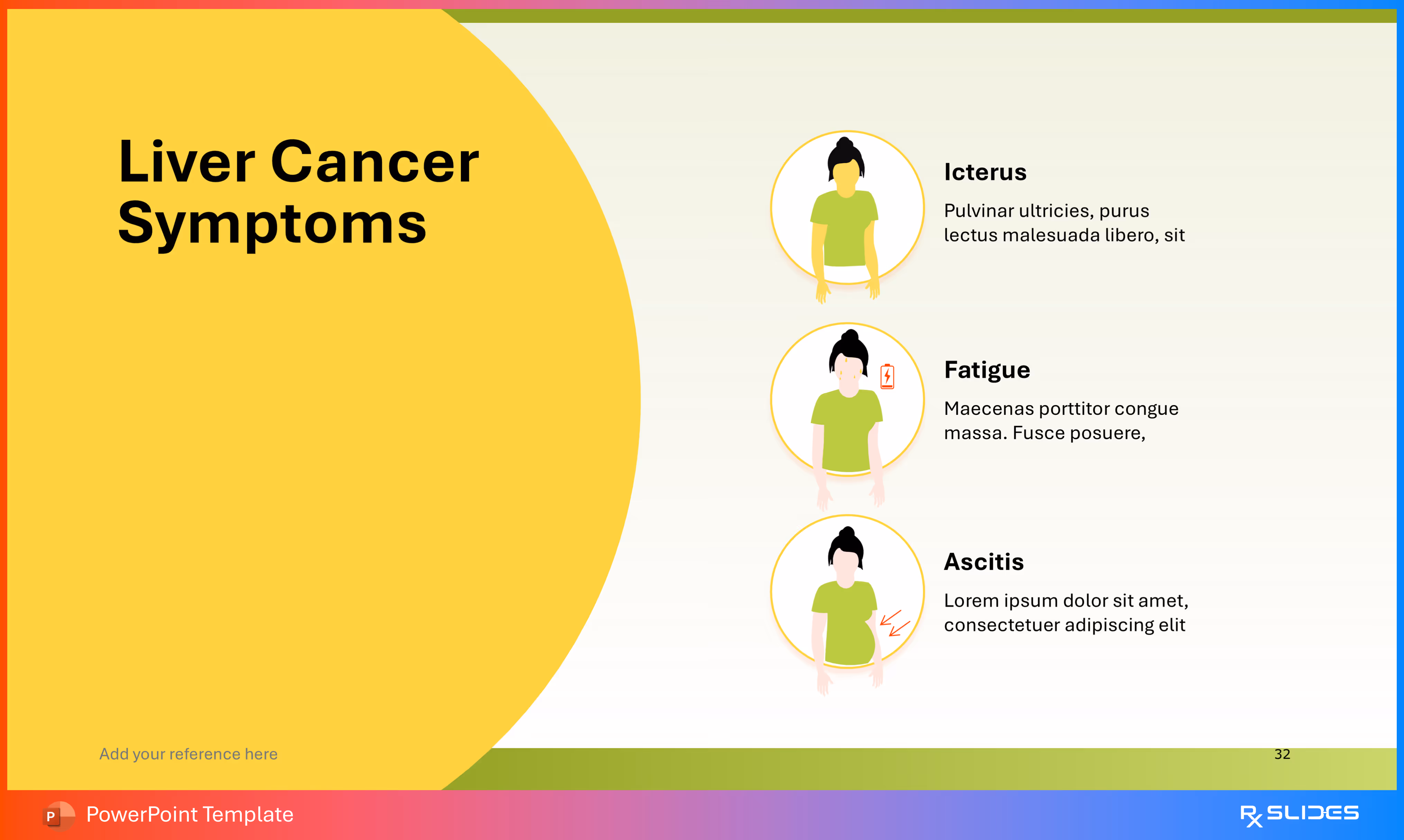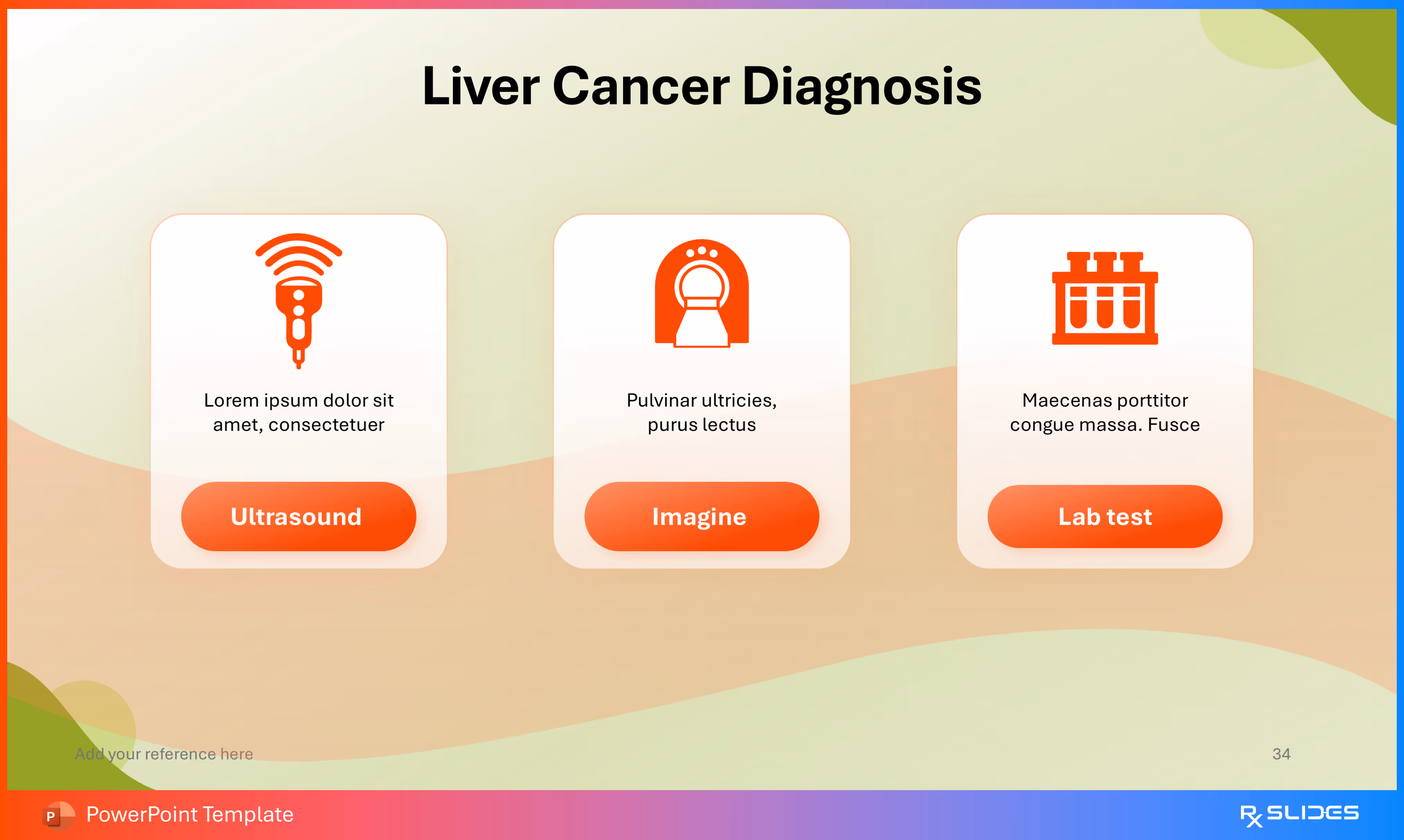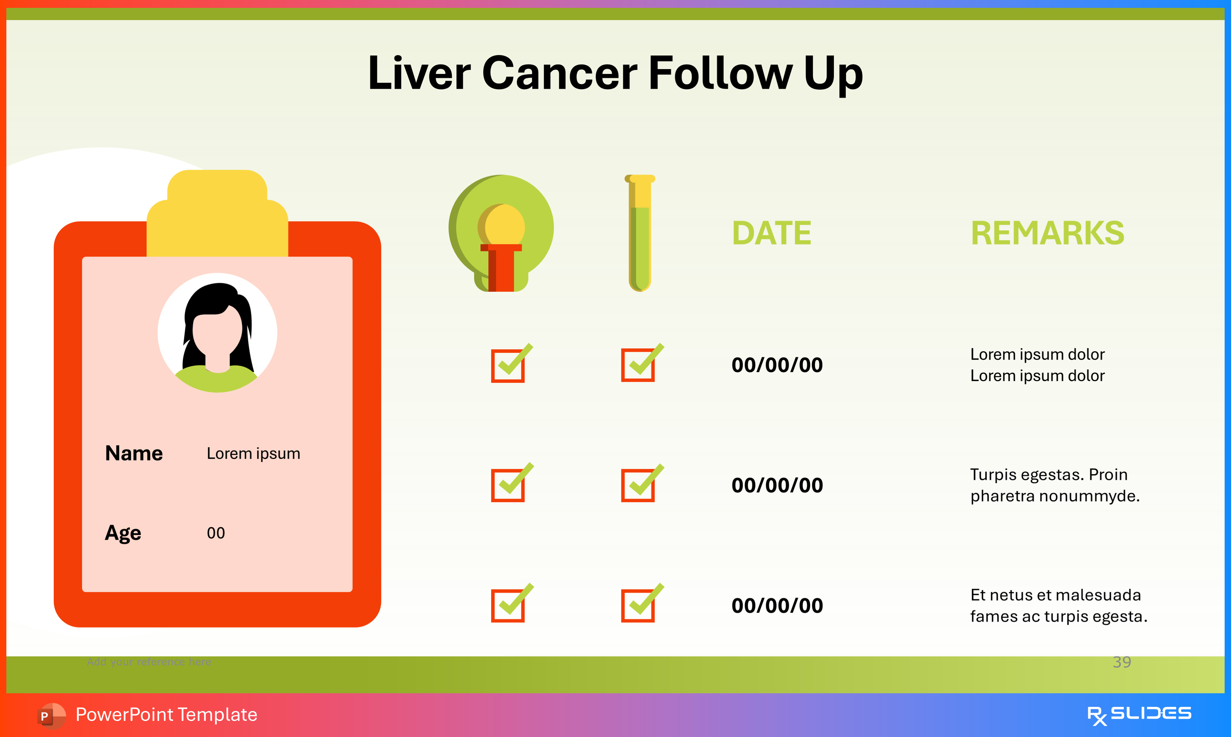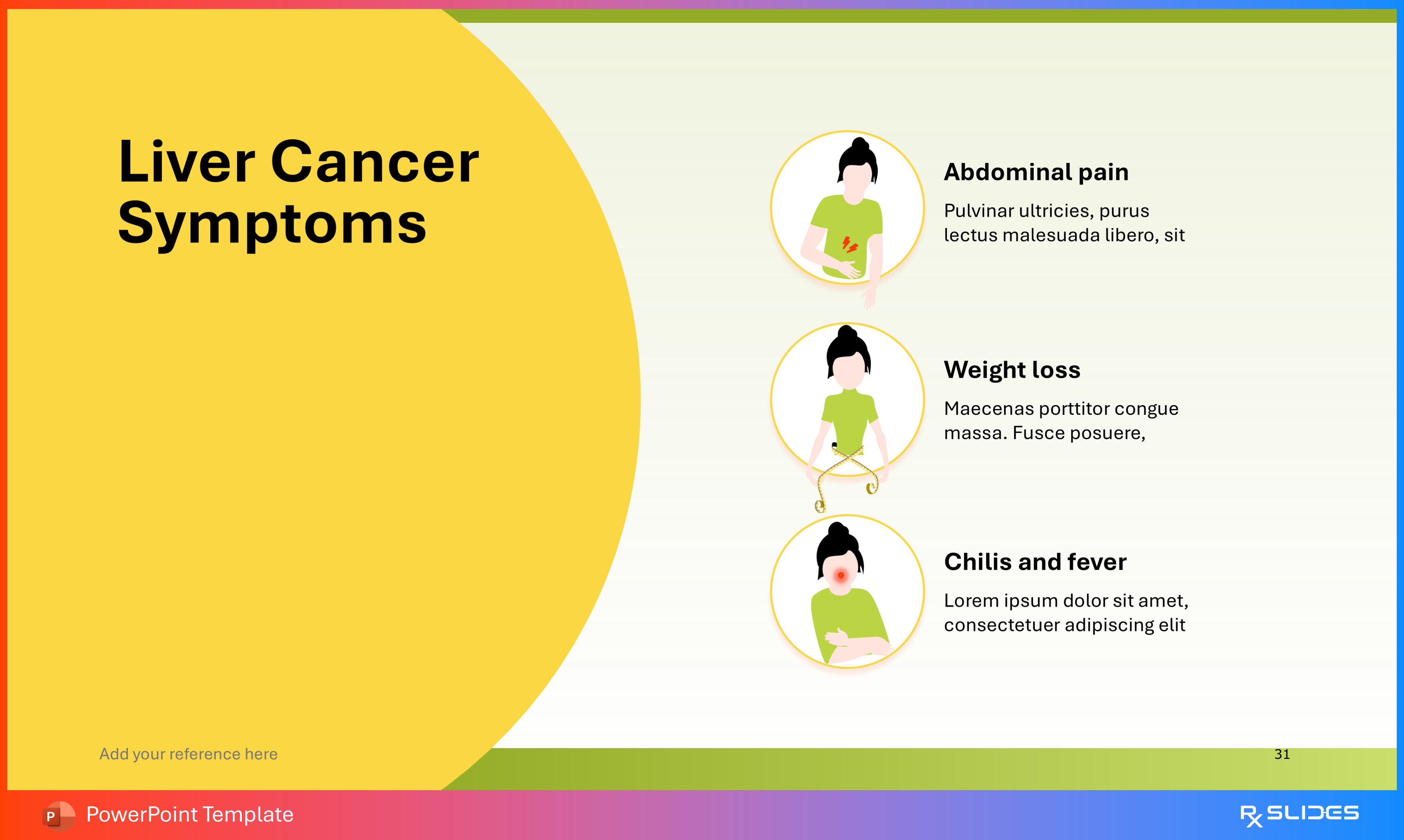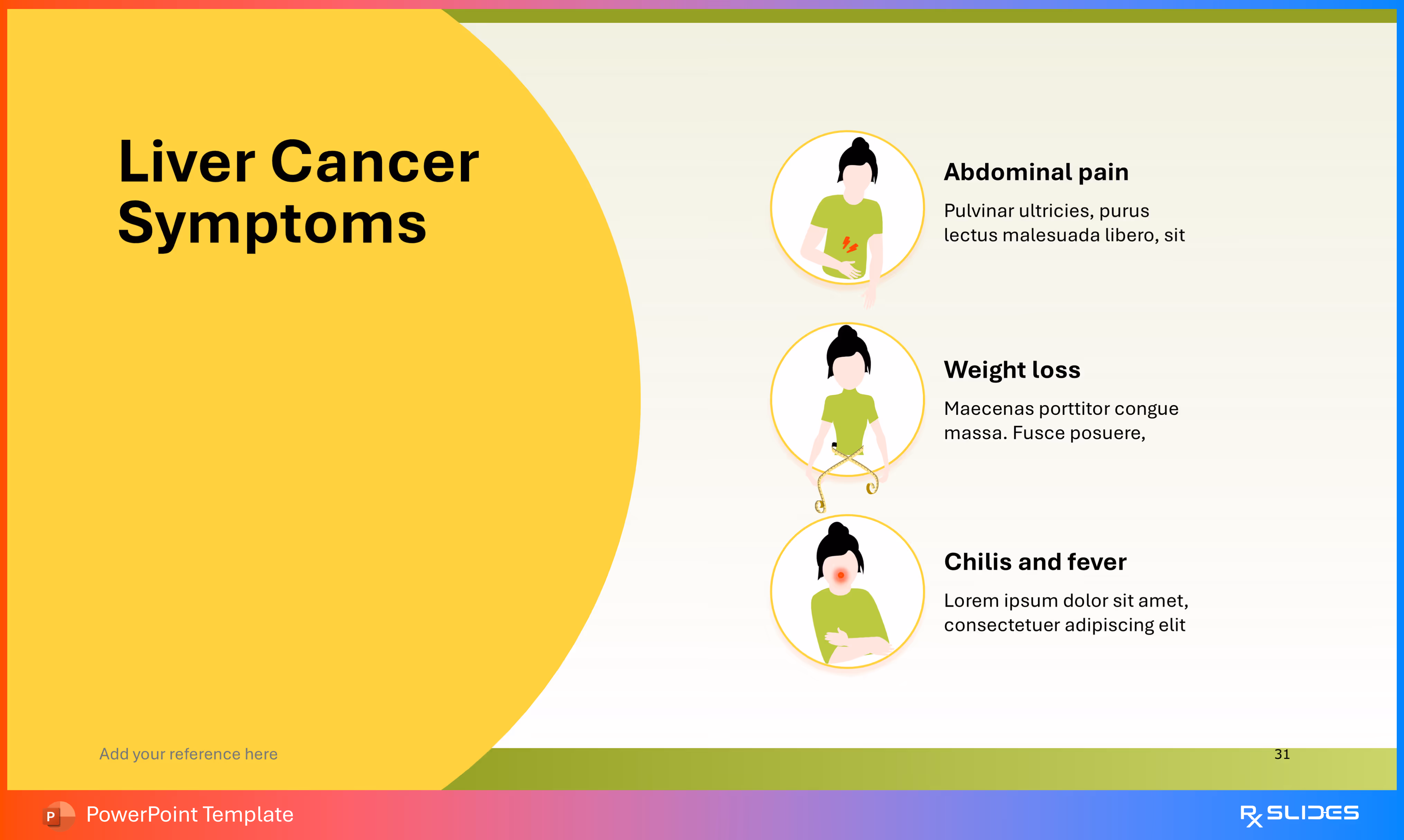 Liver Cancer PowerPoint Template This liver cancer PowerPoint template is a professional, fully editable medical presentation designed for oncologists, hepatologists, and medical educators. This Hepatic Cancer PPT Template has organized slides that explain the anatomy, causes, diagnosis, and treatment, blending accurate science with clear visuals. Ideal for academic lectures, research conferences, or clinical teaching. Key Features Covers the full spectrum: liver anatomy, physiology, epidemiology, pathogenesis, staging, diagnosis, treatment, and follow-up. Professional visuals, including labeled diagrams, infographics, and data charts that enhance audience engagement. The layouts are both editable and adaptable. Works seamlessly with both PowerPoint and Google Slides. Liver Cancer PowerPoint Presentation Template Content Slide 1 - Title Slide Title Slide Clean, medical-themed opening slide with space for presentation title, presenter name, institution, and references. Sets a professional tone for academic or conference sessions. Slide 2 - First Presenter Layout First Presenter Layout Secondary title format allowing alternate logo placement or subtitle lines. Ideal for co-authors or departmental adaptations. Slide 3 - Title Variation Animated Slide Title Variation Animated Slide Third cover option for research seminars or multi-session modules, maintaining consistent brand identity across lectures. Slide 4 - Agenda Agenda Lists main presentation sections—Anatomy, Physiology, Definition, Epidemiology, Risk Factors, Pathogenesis, Diagnosis, Treatment, and Follow-up—to guide audience expectations. Slide 5 - Agenda using liver as bullets Agenda using liver as bullets Uses stylized liver vectors for bullet points, making this layout suitable for adaptation in other hepatic cancer PowerPoint presentations or any liver disease. Slide 6 - Liver Anatomy Section Divider Liver Anatomy Section Divider Transition slide introducing the Anatomy segment with a clean background and strong title emphasis to mark the new section. Slide 7 - Liver Anatomy (Animated Detailed Layout) Liver Anatomy (Animated Detailed Layout) Illustrated diagram labeling key hepatic structures: portal vein, hepatic artery, bile ducts, falciform ligament, diaphragm, and hepatic veins. Supports anatomical orientation before pathology discussion. Slide 8 - Liver Anatomy (Labeled Diagram with Notes) Liver Anatomy (Labeled Diagram with Notes) Expanded visual with editable labels and text boxes for structural annotation—ideal for explaining vascular or biliary pathways. Slide 9 - Liver Physiology Liver Physiology Infographic layout summarizing liver functions: metabolism, detoxification, synthesis, and bile secretion. Editable fields and directional arrows enhance conceptual flow. Slide 10 - Liver Cancer Definition – Section Divider Liver Cancer Definition – Section Divider Marks the start of the Definition and Disease Overview section, maintaining visual continuity and guiding the audience into clinical content. Slide 11 - Liver Cancer Definition Liver Cancer Definition Allows differentiation between primary hepatic malignancies and secondary metastatic lesions. Clean typography and structured text areas enable easy customization to WHO or institutional standards. Slide 12 - Liver Cancer Definition (Animated View) Liver Cancer Definition (Animated View) Animated variant for progressive content reveal. Enhances engagement during lectures explaining disease classification or histologic criteria. Slide 13 - Liver Cancer Epidemiology (Section Divider) Liver Cancer Epidemiology (Section Divider) A visual divider introducing the Epidemiology section, preparing the audience for incidence, prevalence, and survival data. Slide 14 - Liver Cancer Epidemiology & Survival Liver Cancer Epidemiology & Survival Data-driven slide summarizing global and regional incidence, prevalence, and survival rates. Includes editable maps for easy customization. Slide 15 - Liver Cancer Risk Factors (Section Divider) Liver Cancer Risk Factors (Section Divider) Streamlined transitional slide introducing the Risk Factors Part from epidemiologic data to general-level determinants. Slide 16 - Liver Cancer Risk Factors Liver Cancer Risk Factors Introduces the main risk categories contributing to liver cancer, designed for concise overviews in clinical or academic settings. Slide 17 - Risk Factors of Liver Cancer Risk Factors of Liver Cancer Details specific etiologic contributors such as liver diseases, obesity, alcohol use, genetic predisposition, and gender. The clear layout supports quick visual recognition of modifiable vs. non-modifiable risks. Slide 18 - Liver Cancer Risk Factors (Alternate Layout) Liver Cancer Risk Factors (Alternate Layout) Infographic version for hepatic cancer, which you can use in any liver disease presentation. Slide 19 - Risk Factors of Liver Cancer (Alternate Design) Risk Factors of Liver Cancer (Alternate Design) Flexible summary layout for consolidating regional or demographic data before moving to causative mechanisms. Includes editable placeholders for institutional notes. Slide 20 - Liver Cancer Causes (Section Divider) Liver Cancer Causes (Section Divider) A professional divider introduces the Causes and Etiology segment, marking the transition from population-level risks to mechanistic insights. Slide 21 - Liver Cancer Causes Liver Cancer Causes Infographic summarizing principal causes such as viral infections, fatty liver, alcohol, obesity, and medications. Fully editable and visually balanced. Slide 22 – Liver Cancer Pathogenesis (Section Divider) Liver Cancer Pathogenesis (Section Divider) Clean divider marking the transition to the Pathogenesis segment. Features a bold, stylized DNA helix icon set against a modern gradient background. Slide 23 - Liver Cancer Pathogenesis (Cellular/Histologic View) Liver Cancer Pathogenesis (Cellular/Histologic View) Animated visual illustrating cellular transformation and neoplastic 