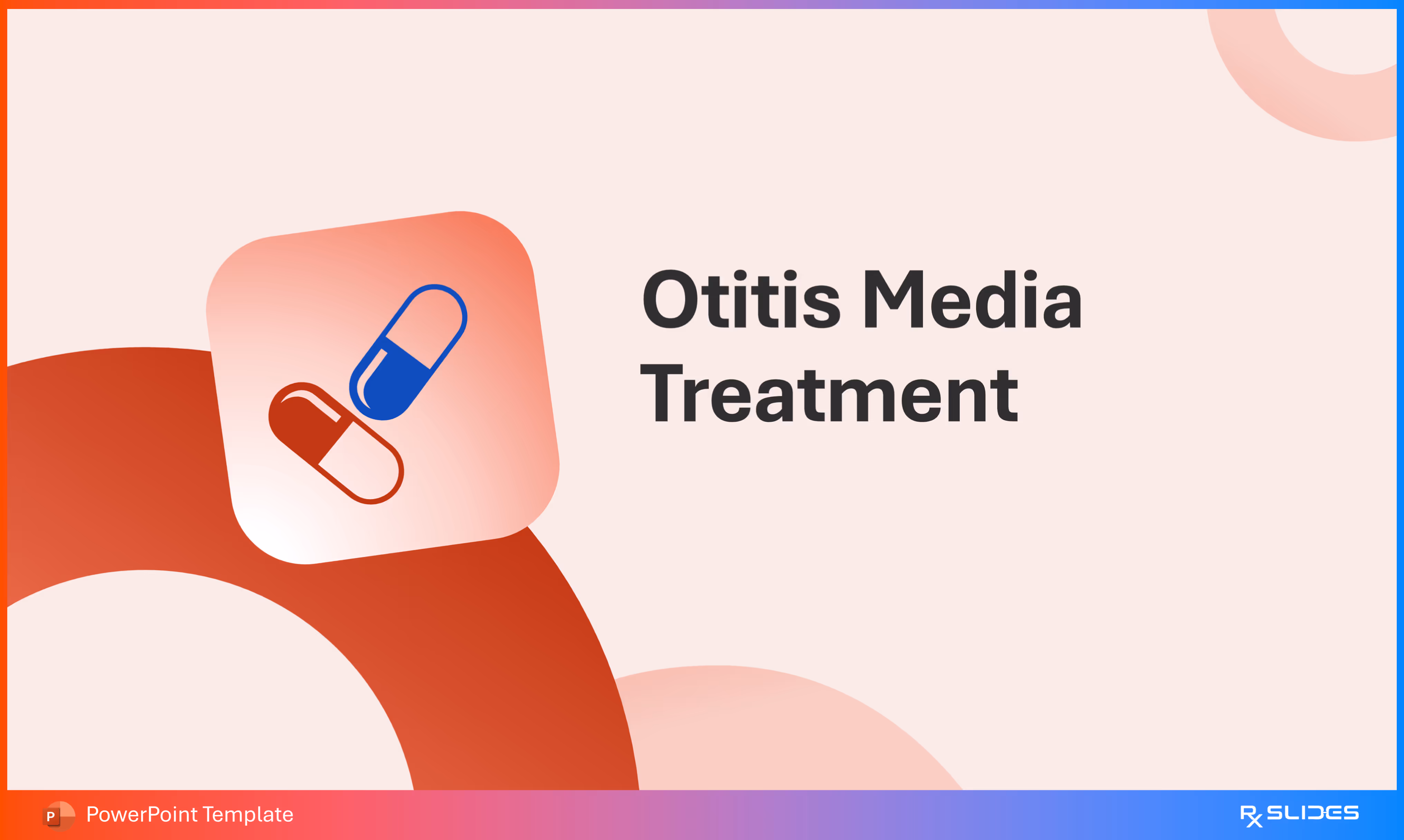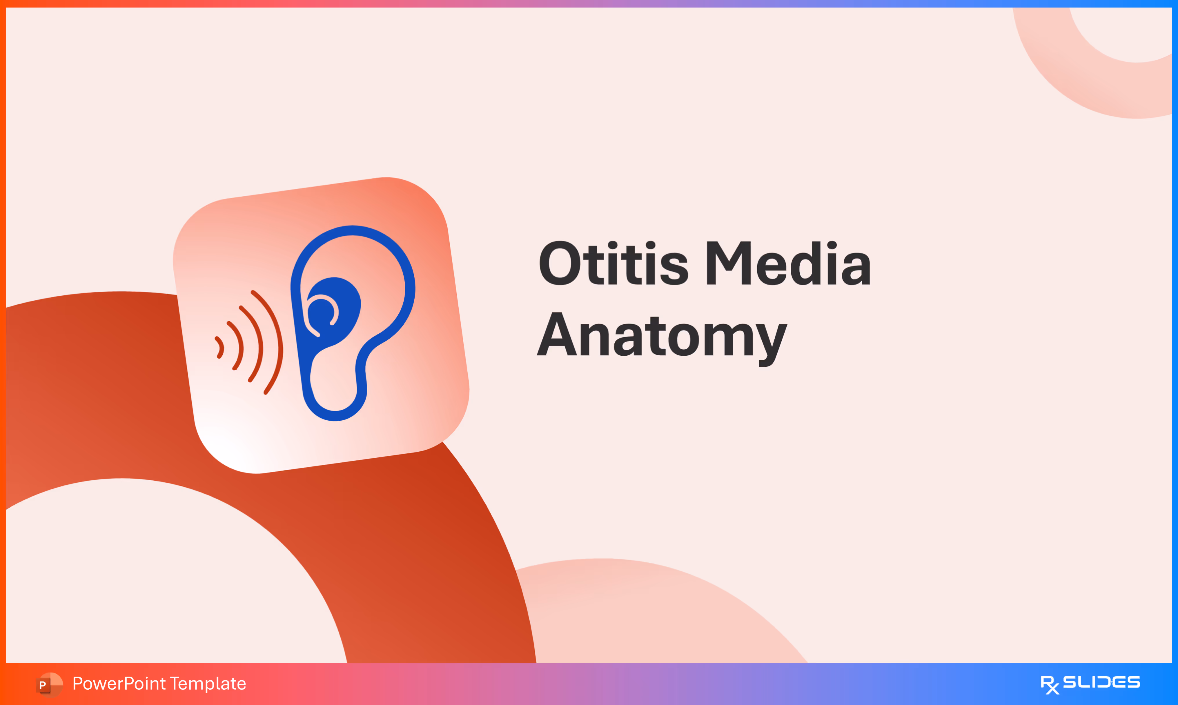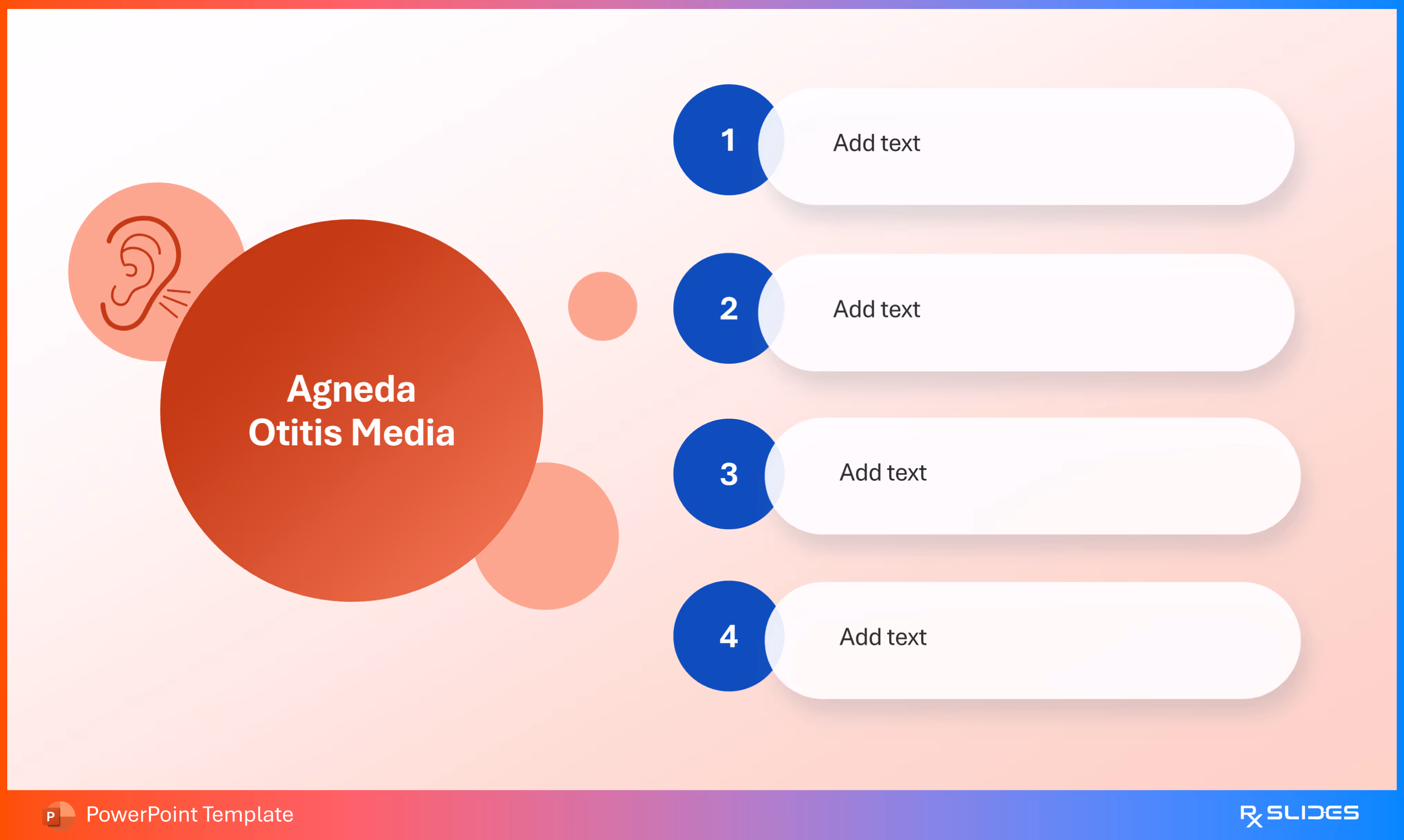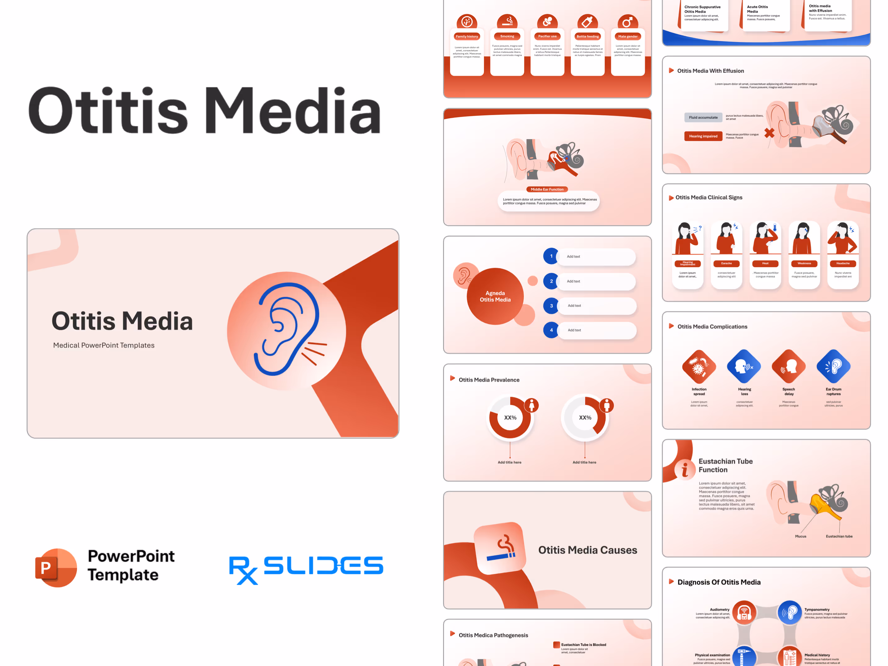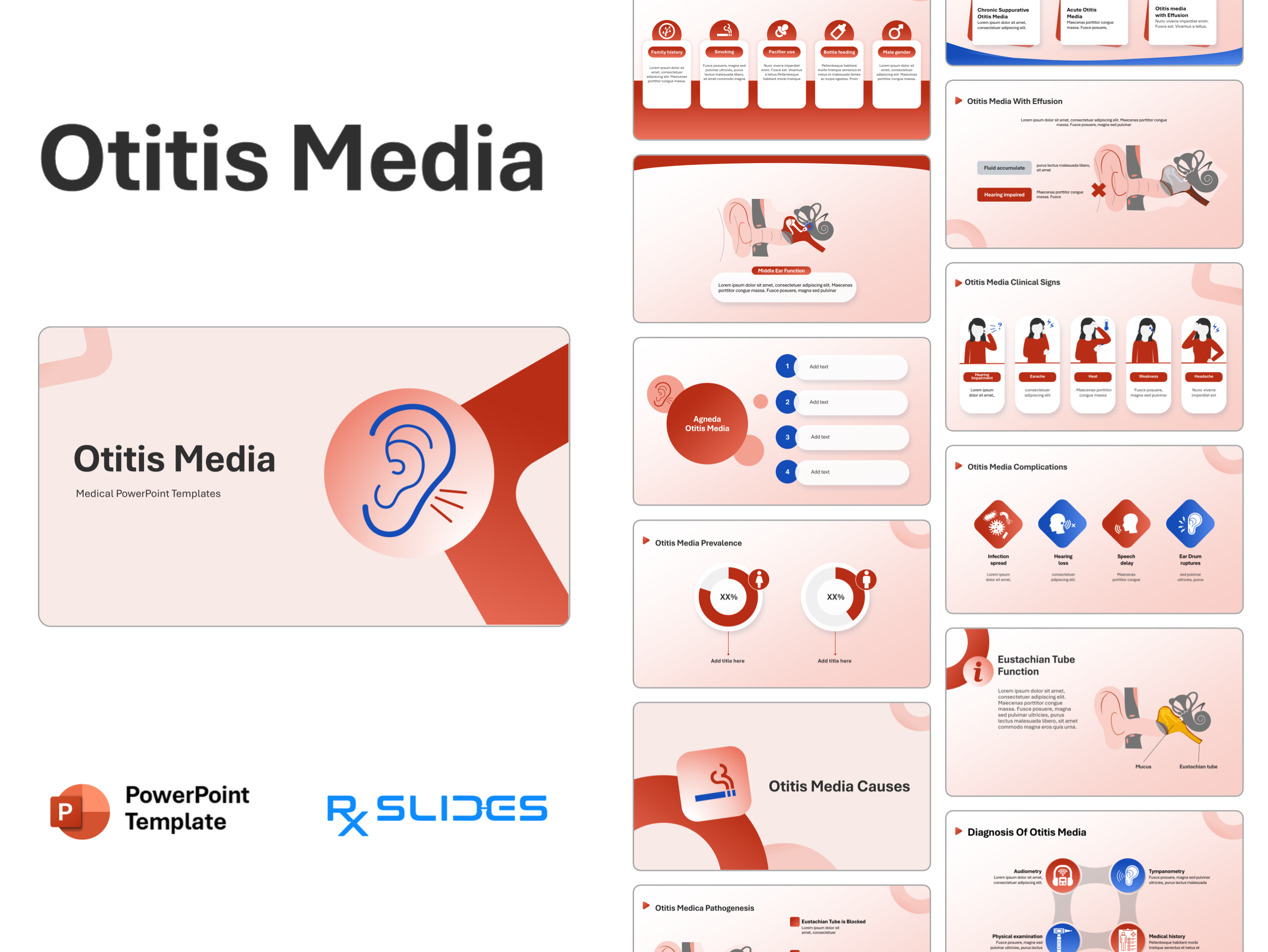 The design features a large central red circle displaying the title "Agneda Otitis Media" with a small ear icon to the left.