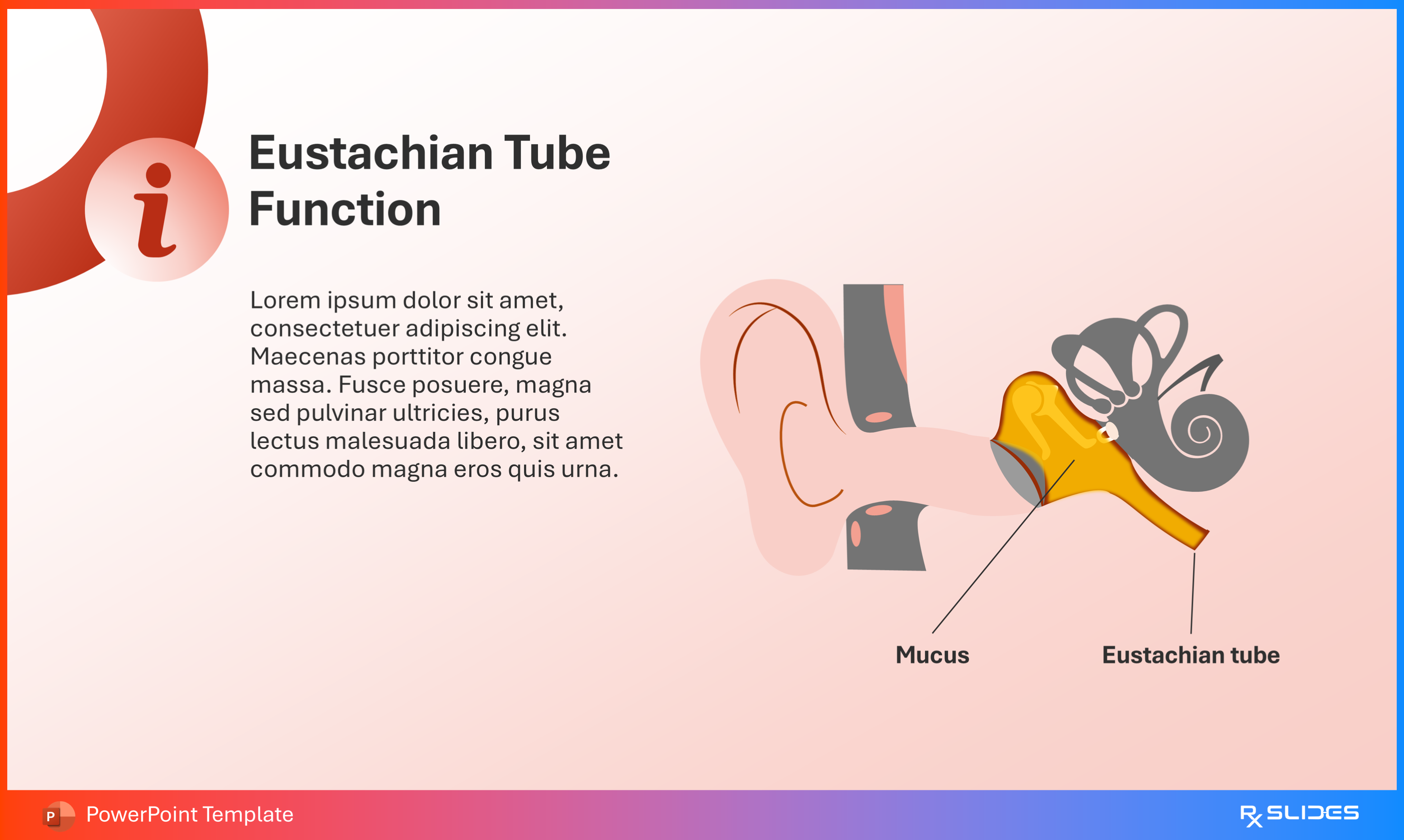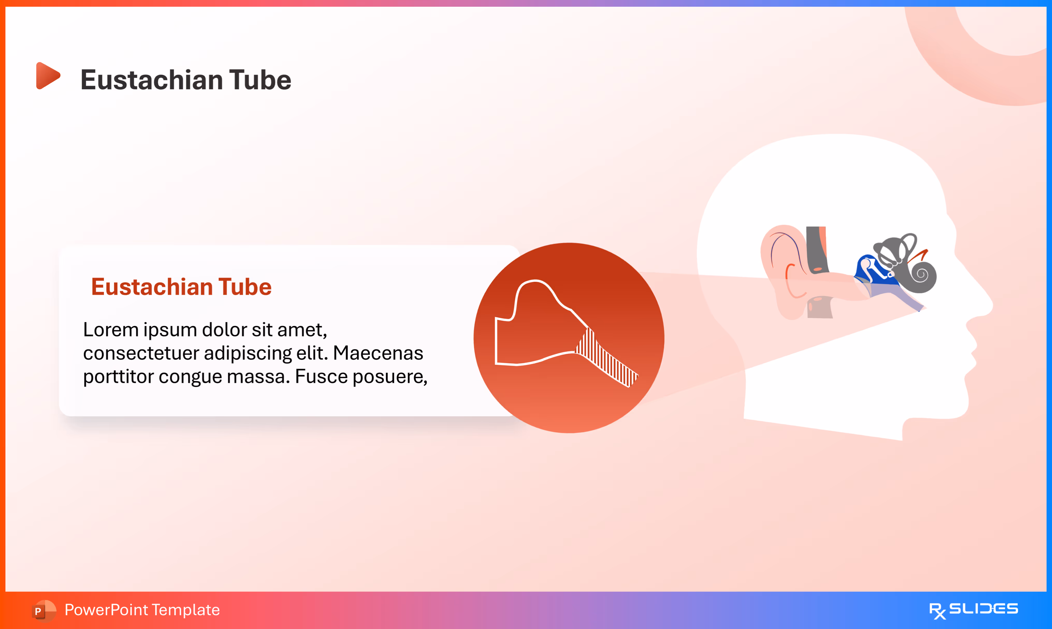 The slide features a cross-section illustration highlighting the Eustachian Tube and its connection to the middle ear.