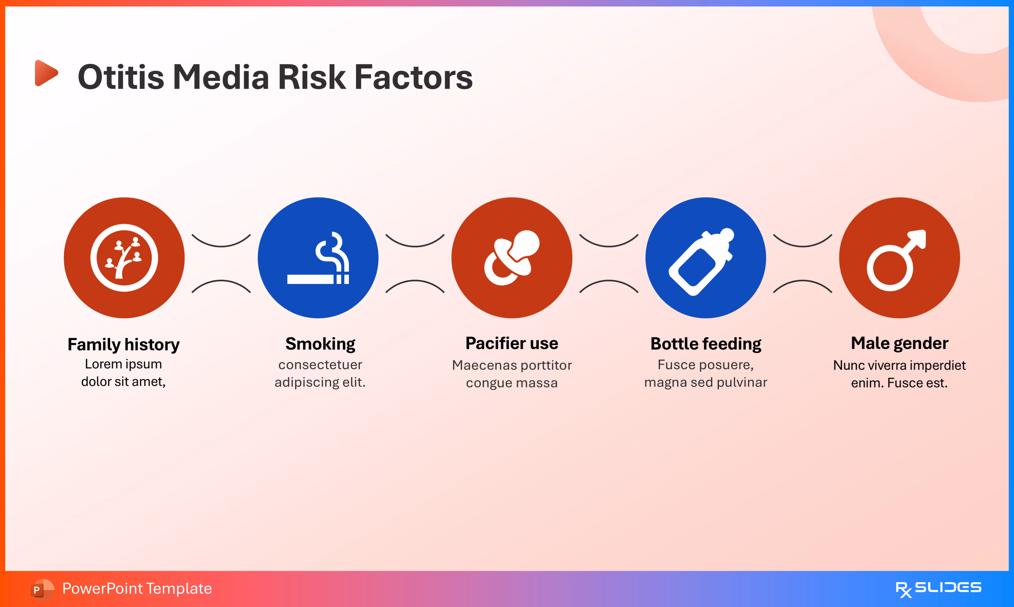 The design uses a flow chart of five alternating red and blue circular icons connected by curved lines, showing the progression or relationship between risk factors: Family history, Smoking, Pacifier use, Bottle feeding, and Male gender.