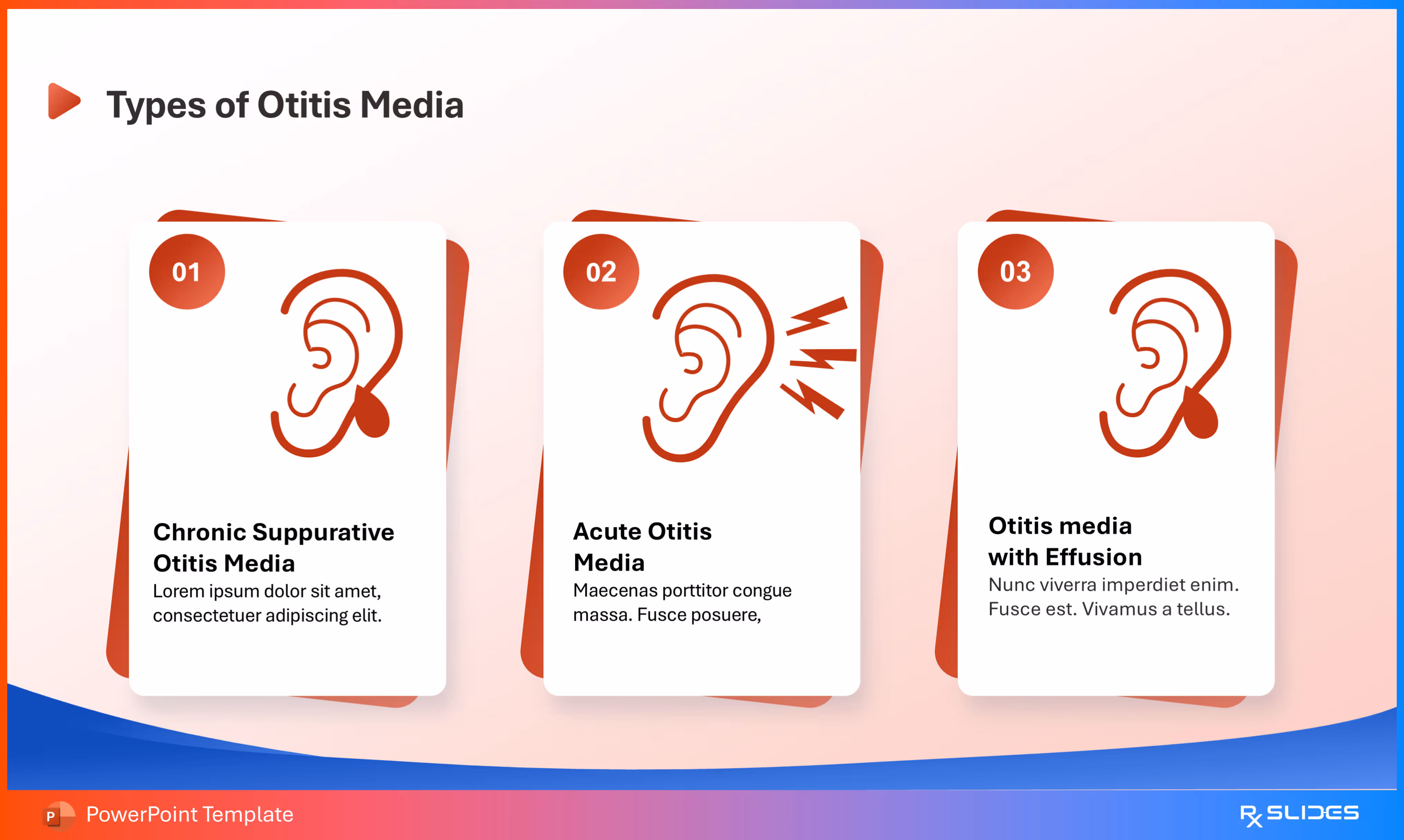 The design uses three vertical cards, numbered 01, 02, and 03, each containing a relevant ear icon and a description of the type: Chronic Suppurative Otitis Media, Acute Otitis Media, and Otitis media with Effusion.