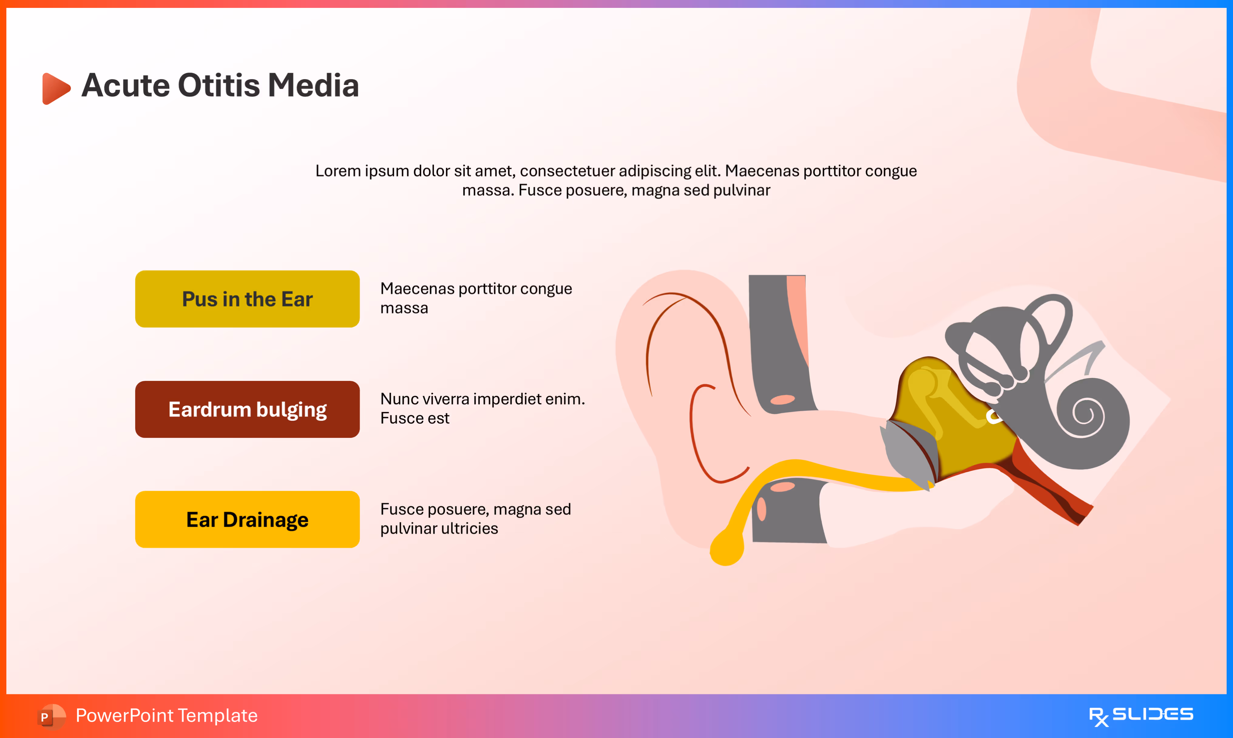 Three key clinical features are highlighted in vertical, colorful boxes on the left: Pus in the Ear, Eardrum bulging, and Ear Drainage.