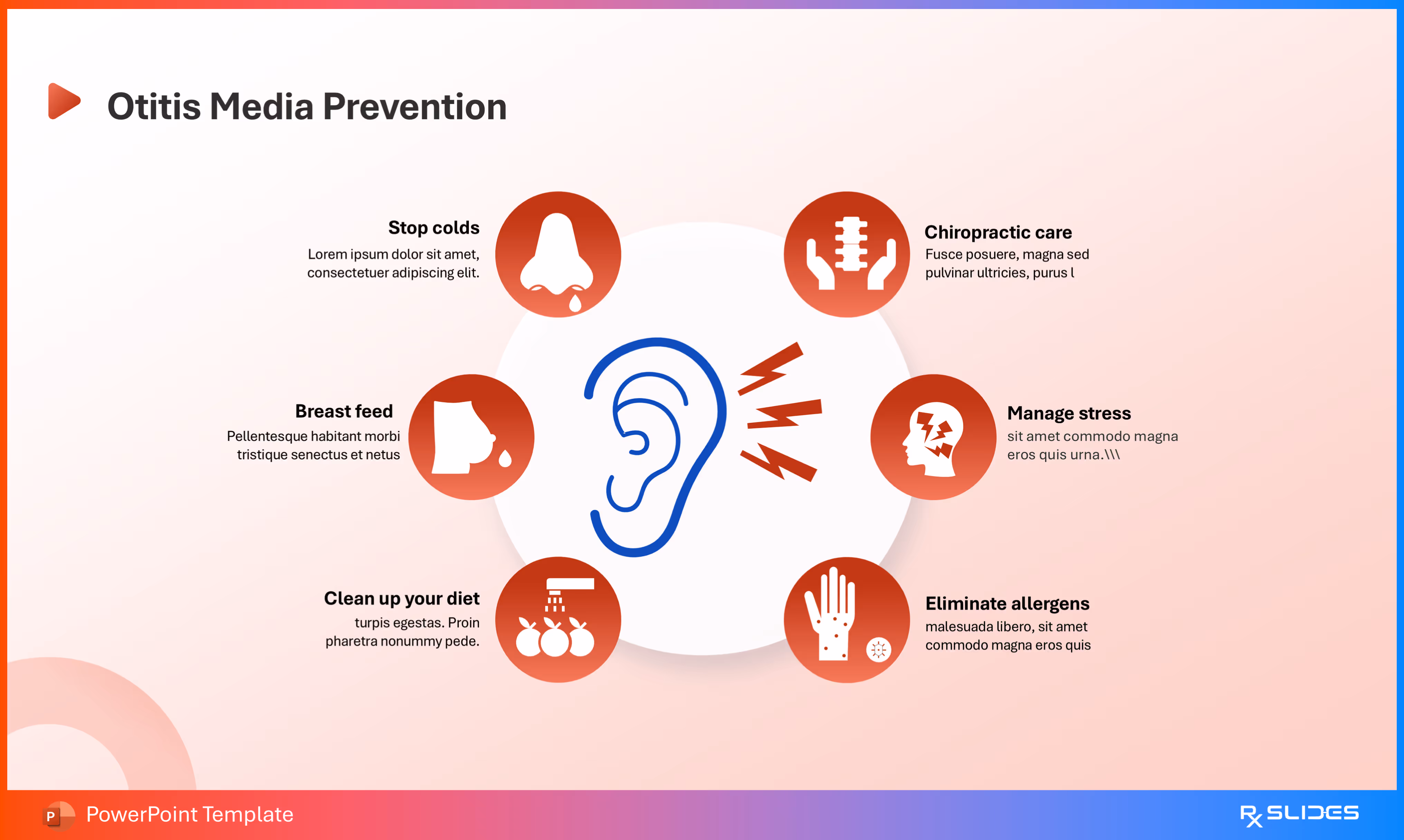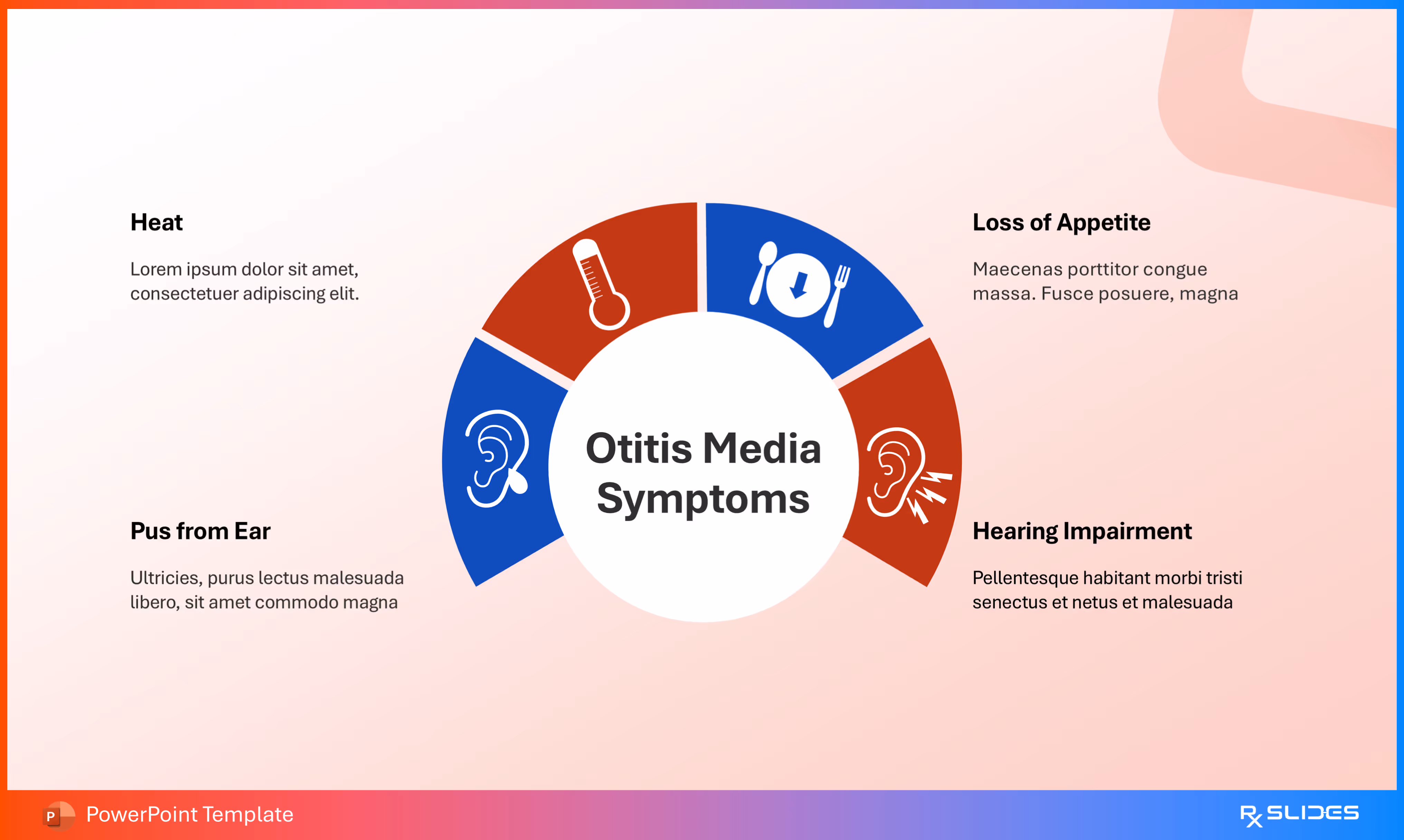 The design uses a semi-circular arrangement of five content blocks surrounding a central title circle, creating an engaging visual flow: Heat, Loss of Appetite, Hearing Impairment, Pus from Ear, and a fifth point located at the top center with a thermometer icon.
