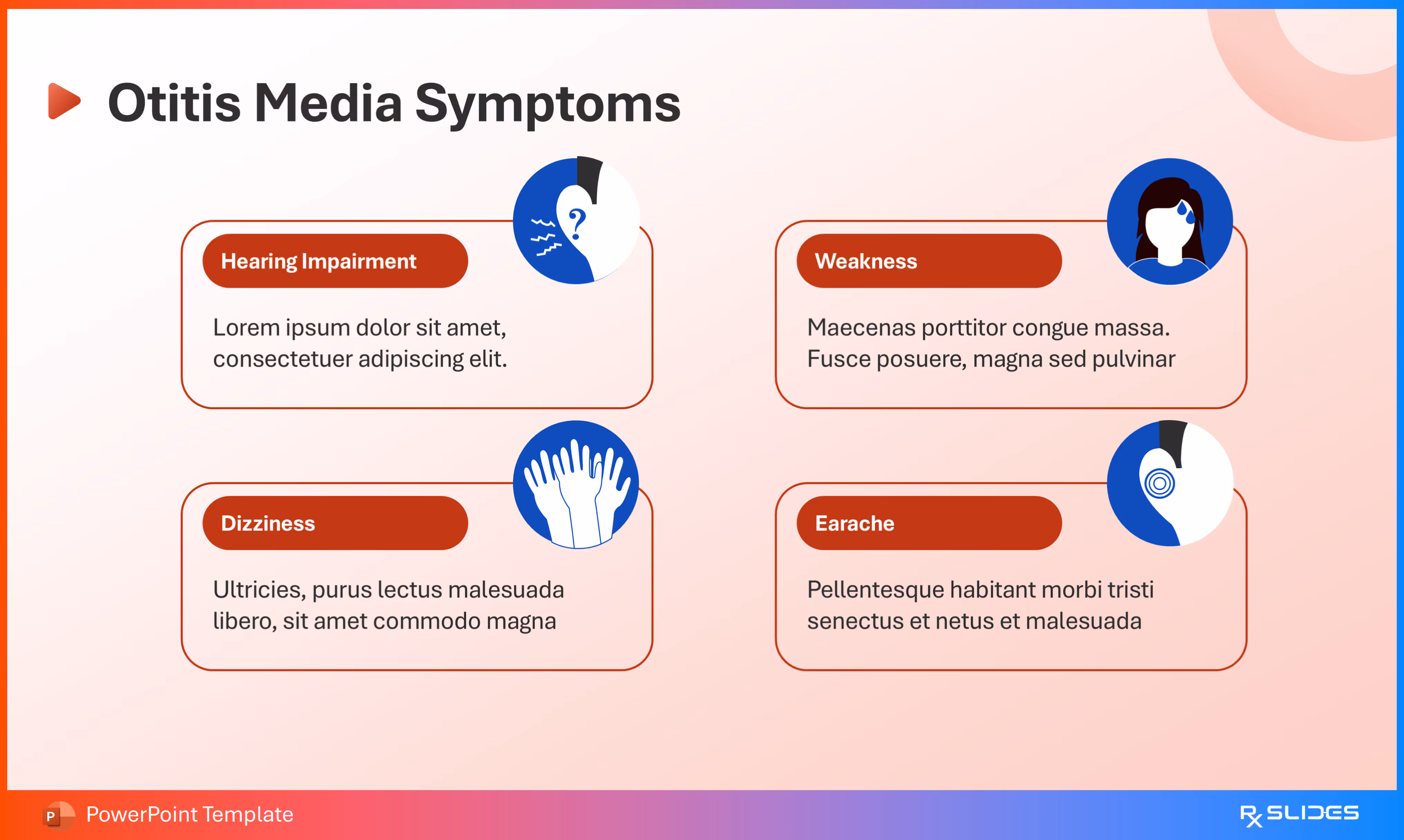 The design uses a layout with four distinct content boxes, each containing an icon and a space for description: Hearing Impairment, Weakness, Dizziness, and Earache.
