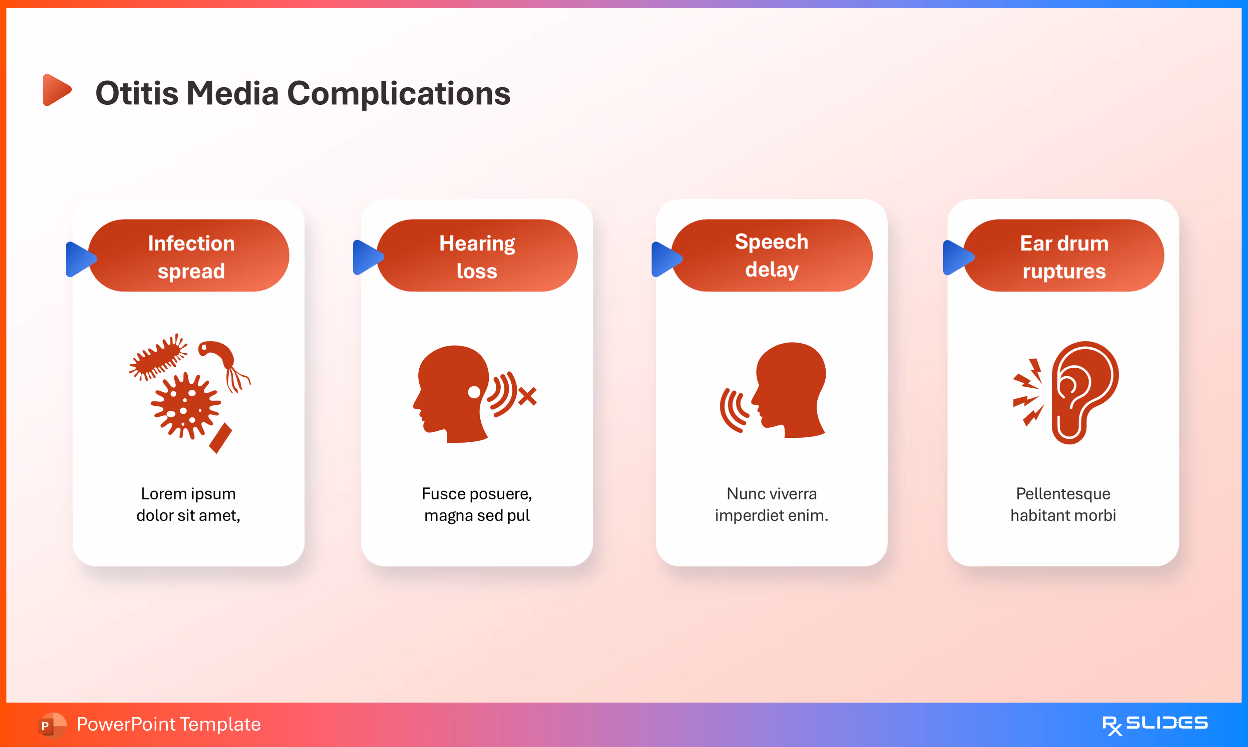 The design uses a row of four diamond-shaped icons in contrasting red and blue, each with a brief description beneath: Infection spread, Hearing loss, Speech delay, and Ear Drum ruptures.