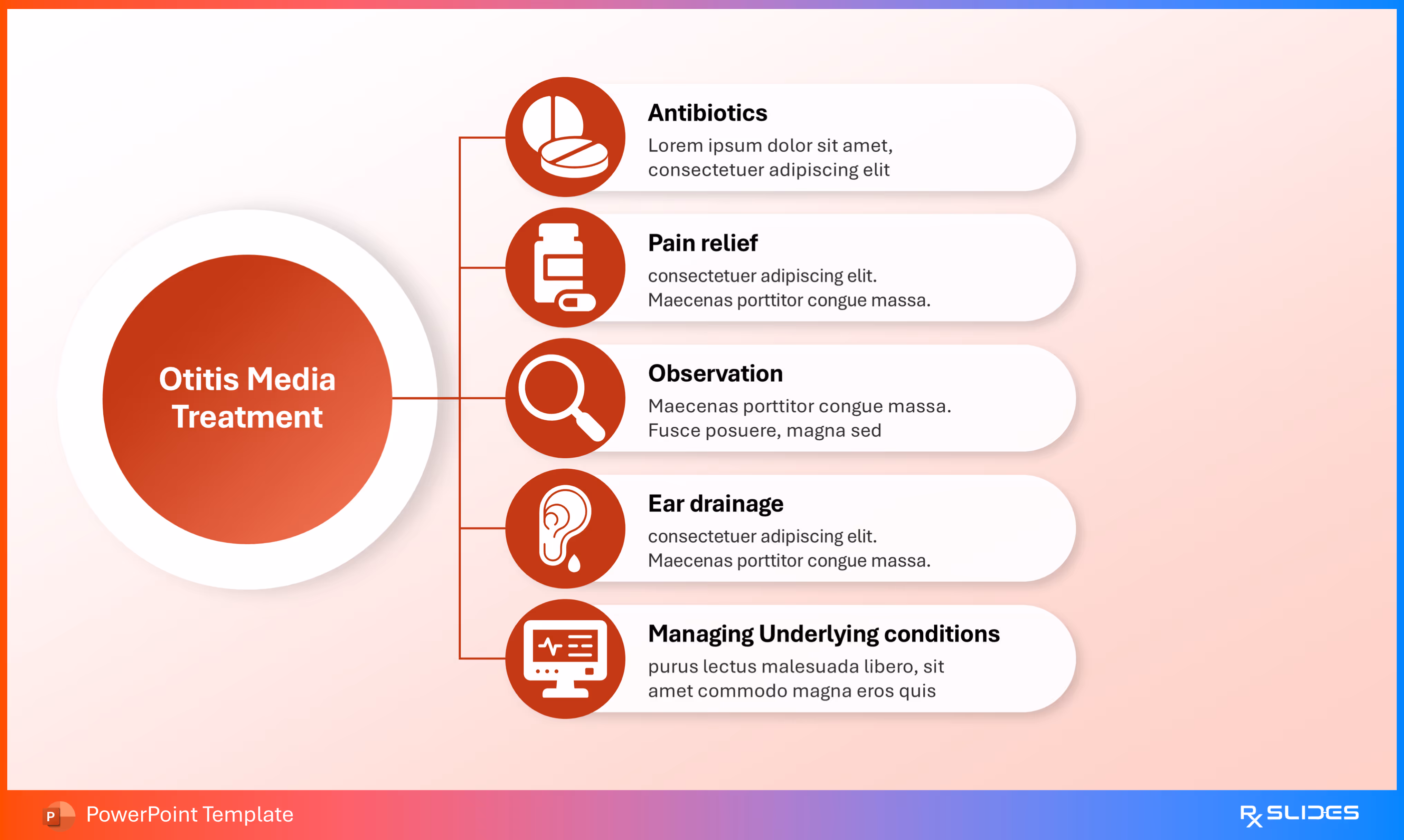The design uses a visual list, where a central red circle containing the title is connected to five vertical cards, each describing a treatment method: Antibiotics, Pain relief, Observation, Ear drainage, and Managing Underlying conditions.